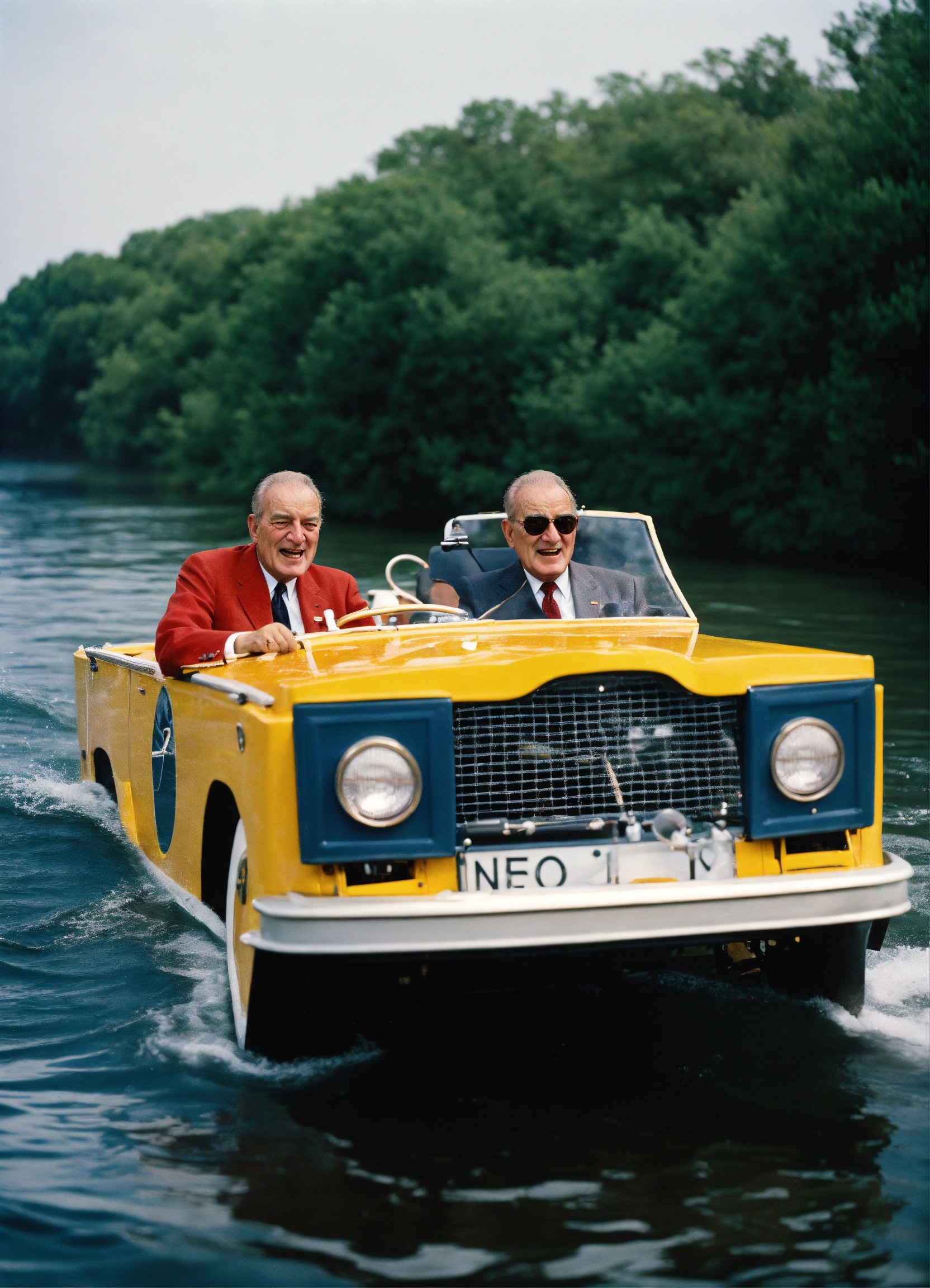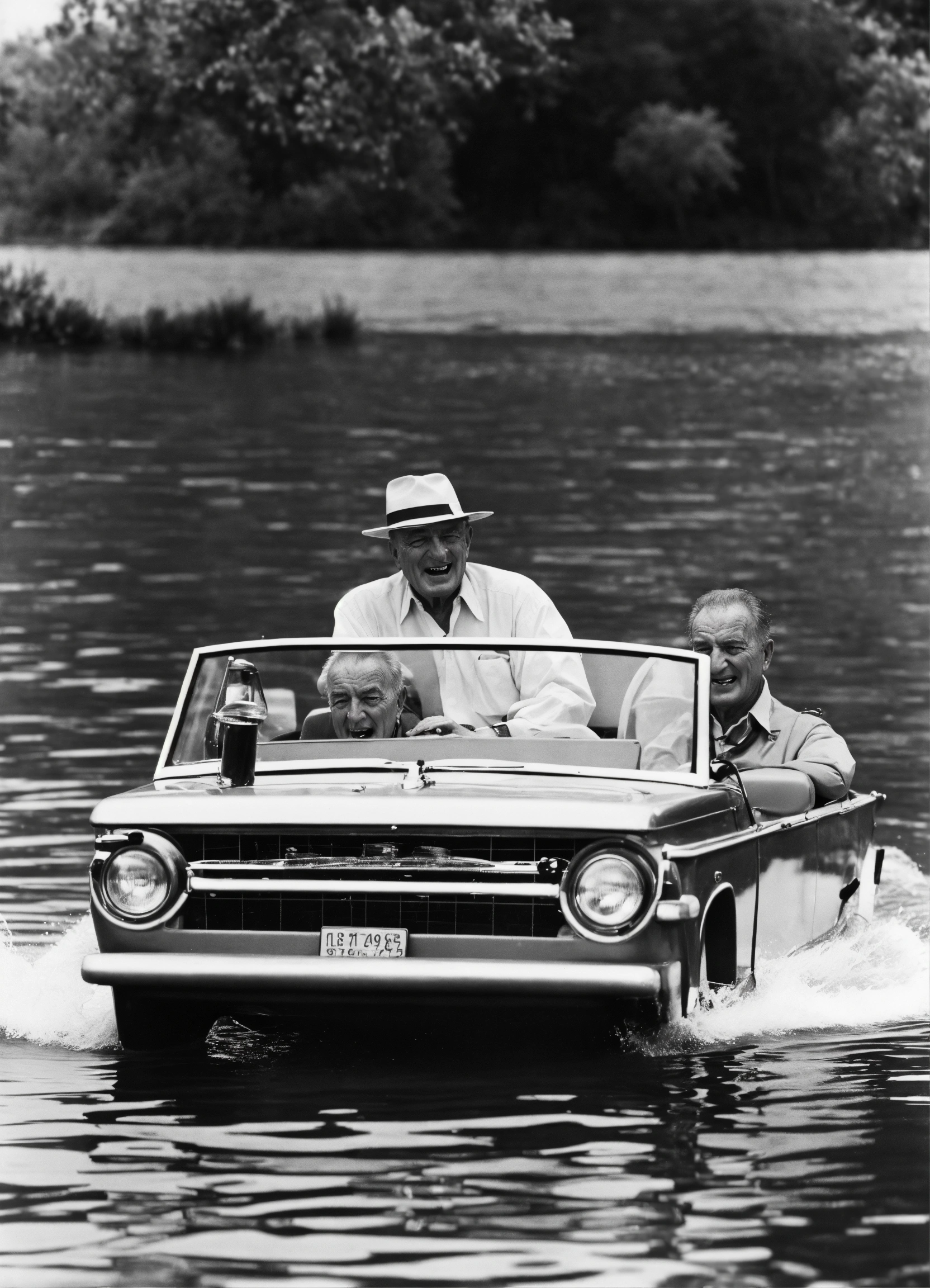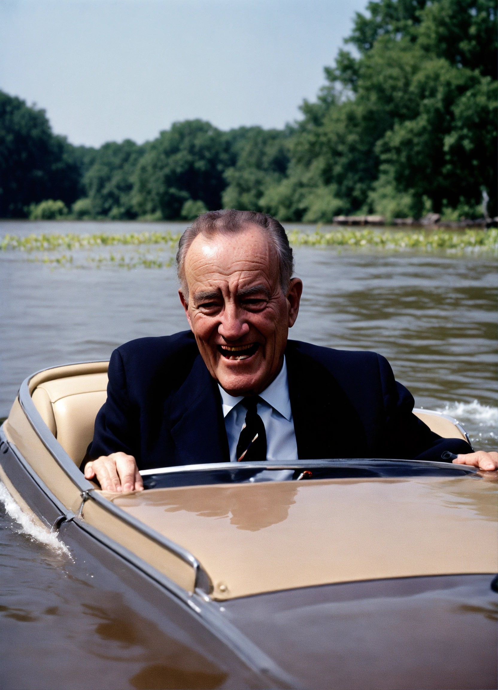 President lyndon b johnson in an amphibious car in water with laughter on his face, include a passenger in the car who has a freaked out look on his face