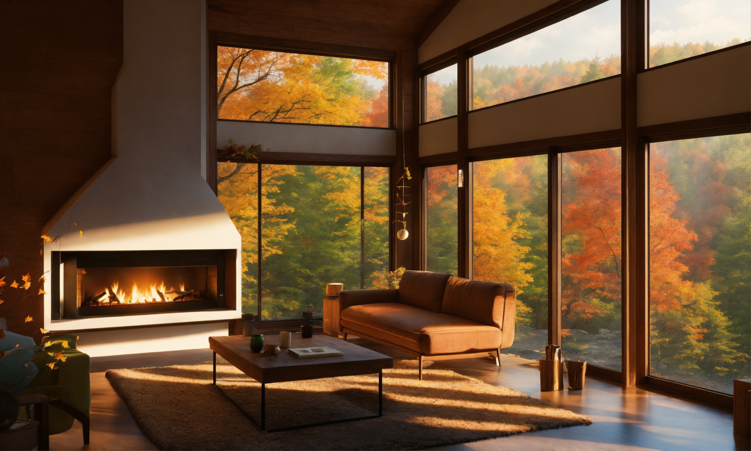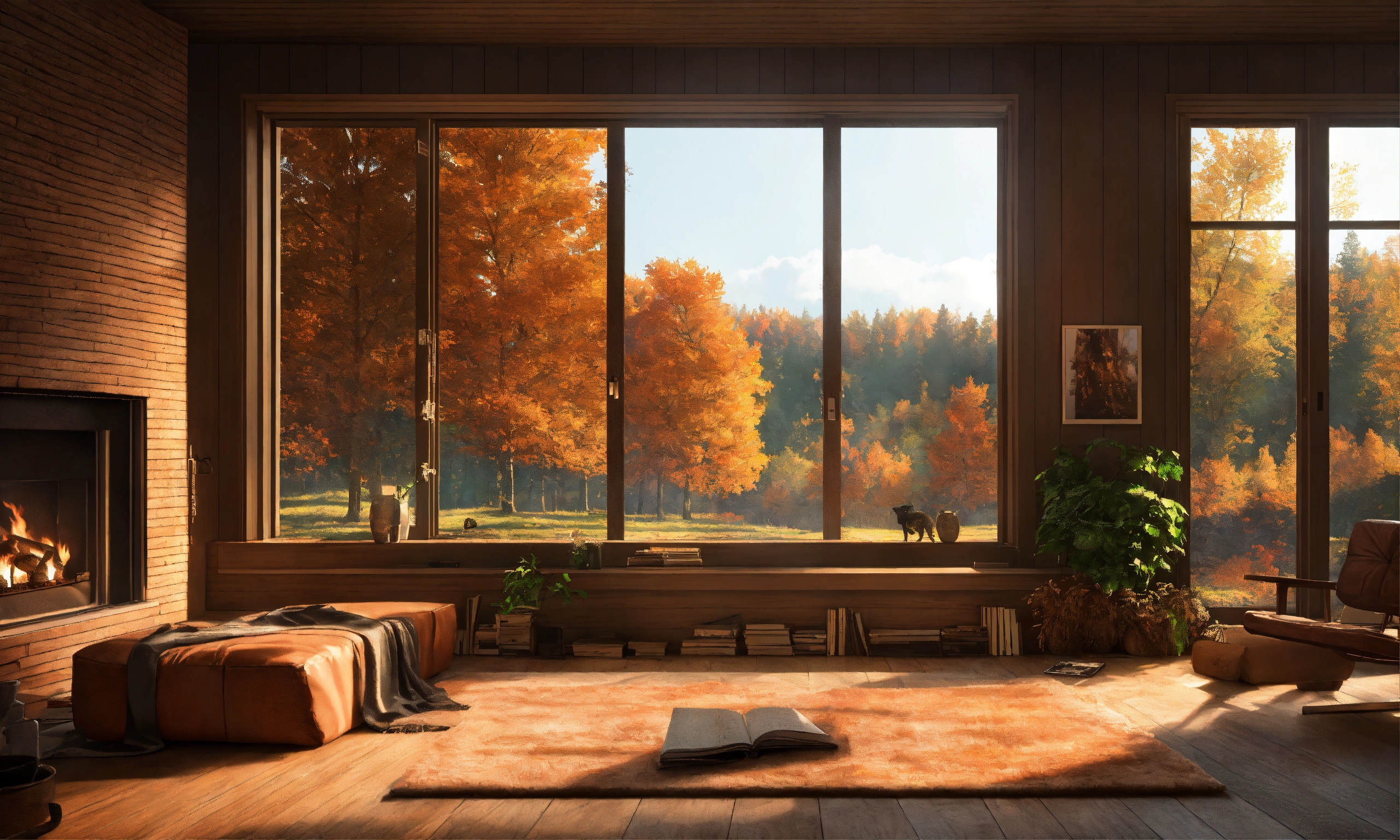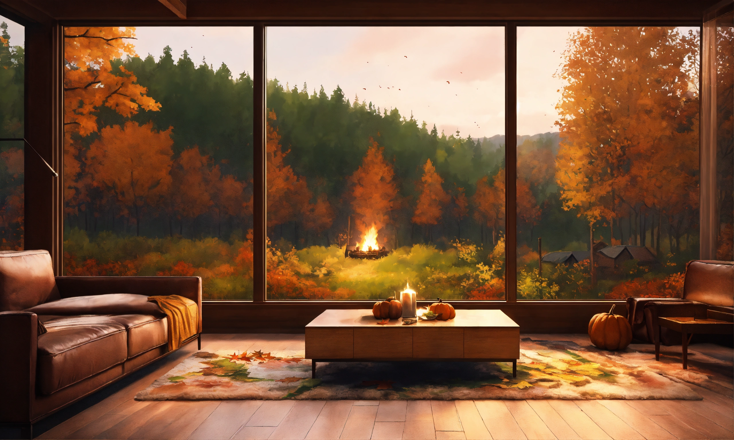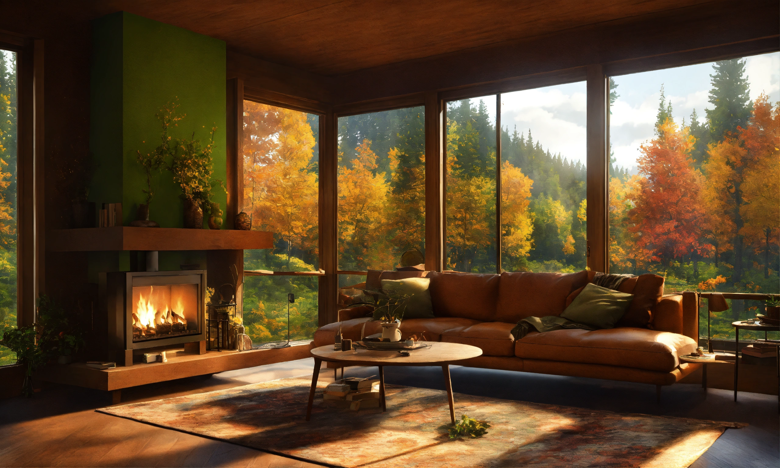 Anime nordic forrest house minimalistic living room with fireplace, big centered window with view over forrest, big open living room, fireplace in the middle, dark brown wooden living room, green color tints in the room, fall season, fall lofi artwork, fall view, fall leaves