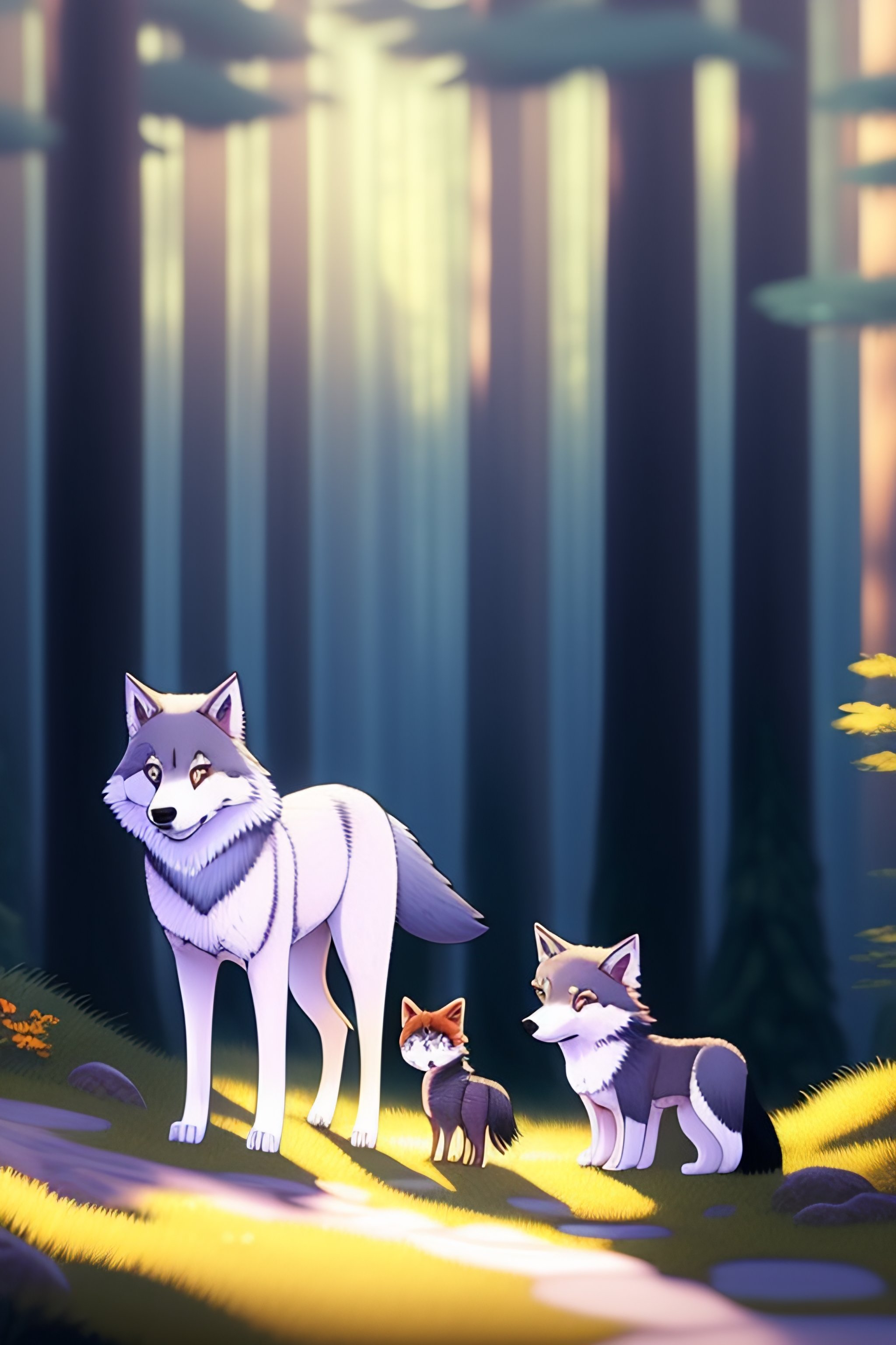 Wide shot. a children book illustration about 3 little wolves and an adult wolf with soft fur and fluffy tails. the first little wolf was black, the second was grey and the third white. in a forest. with background by greg rutkowski makoto shinkai kyoto animation.
