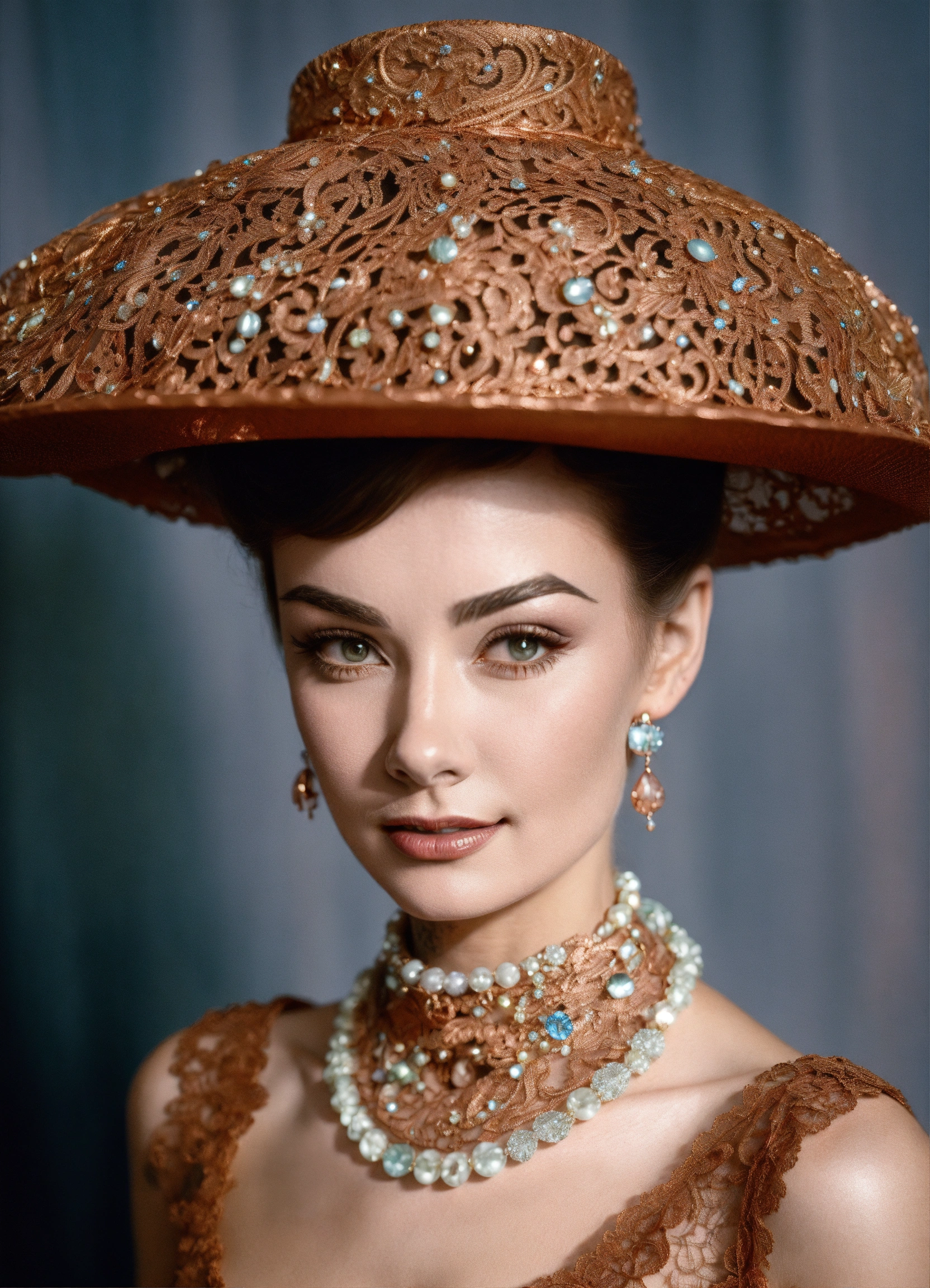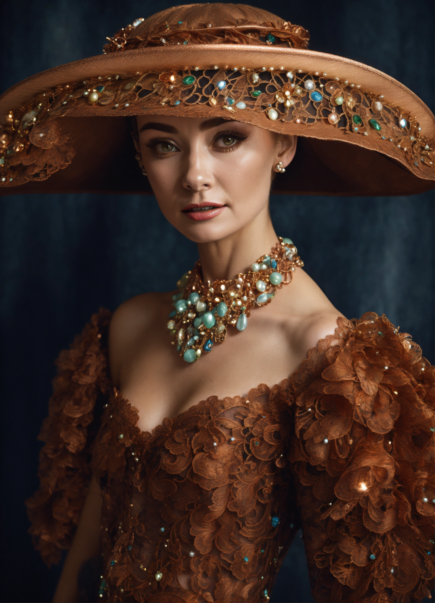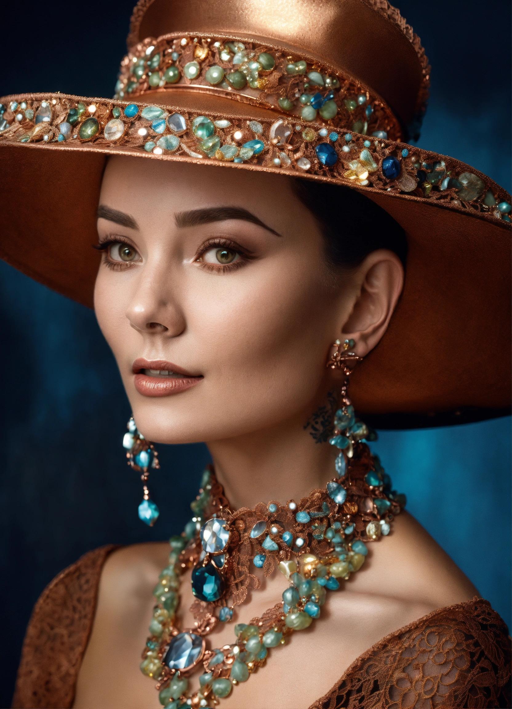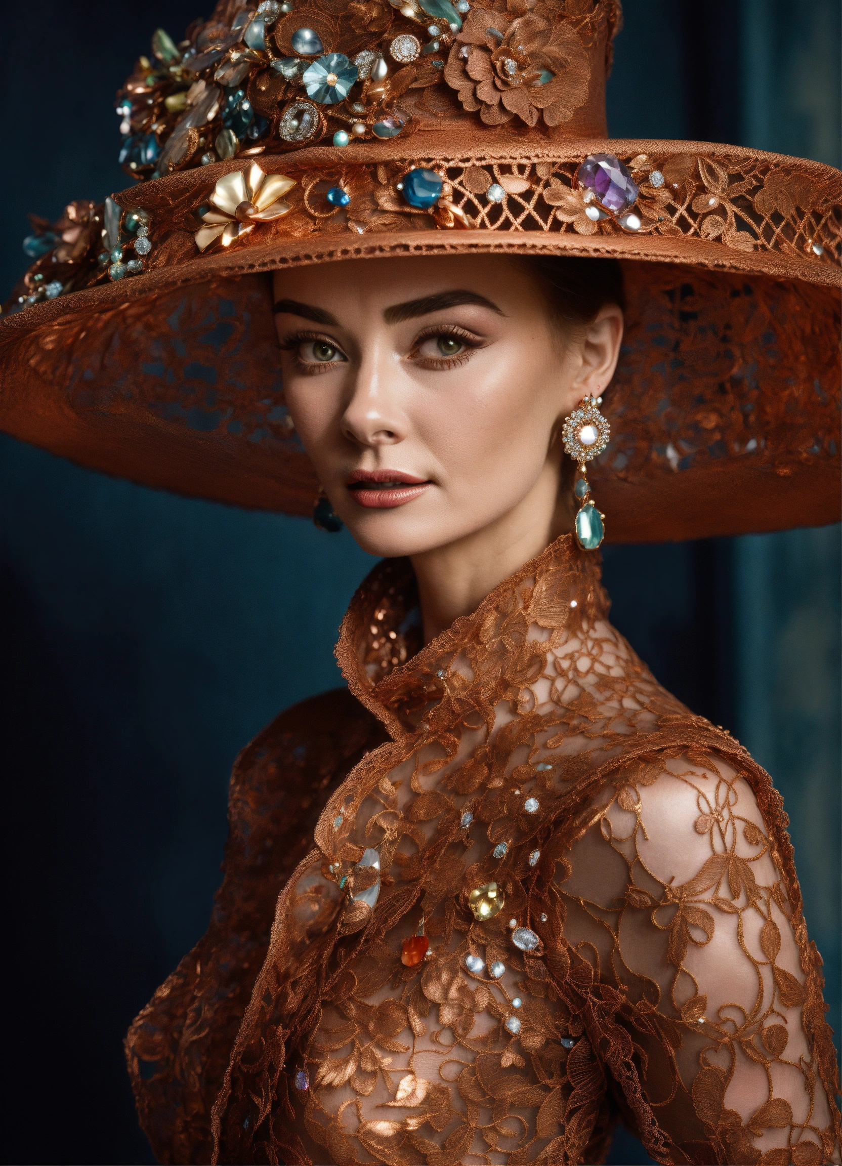 A woman wearing luxurious copper tatted lace hat audrey hepburn style with wide brim decorated with precious stones and crystals in the style of liam sharp, dutch tradition, webcam, gail simone, mark seliger