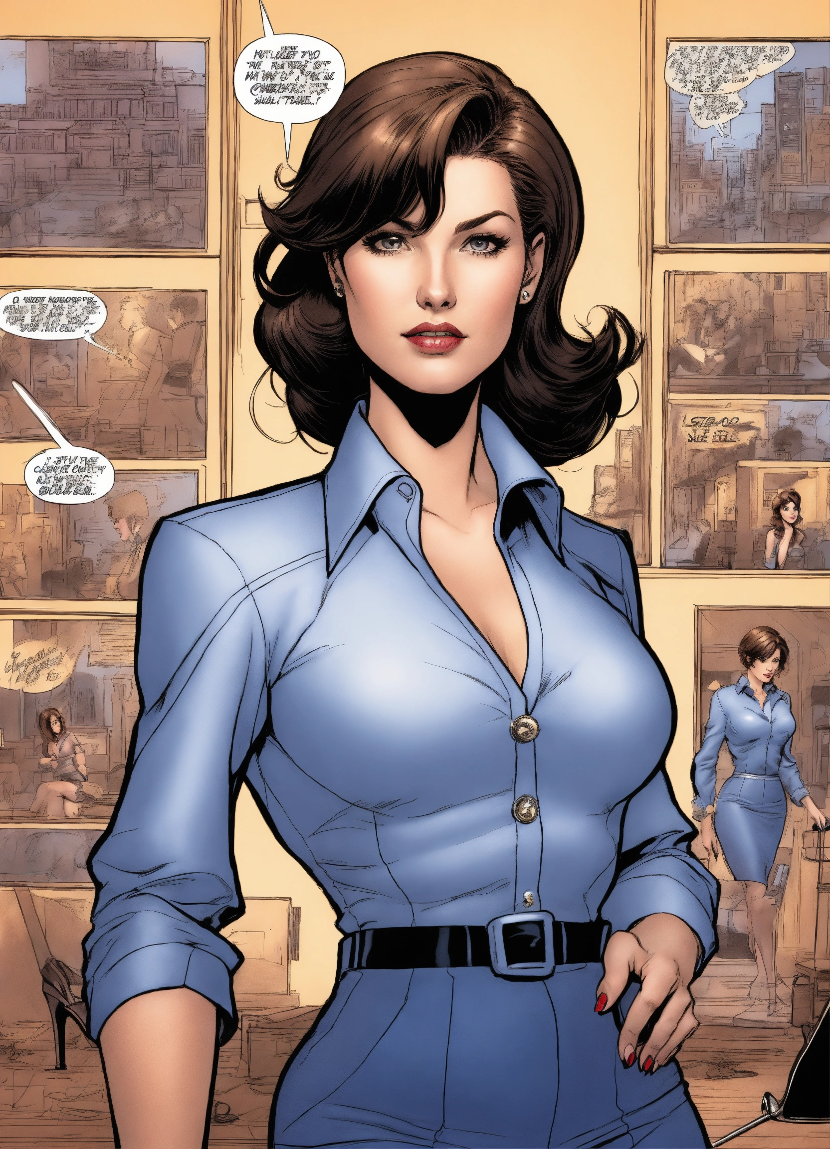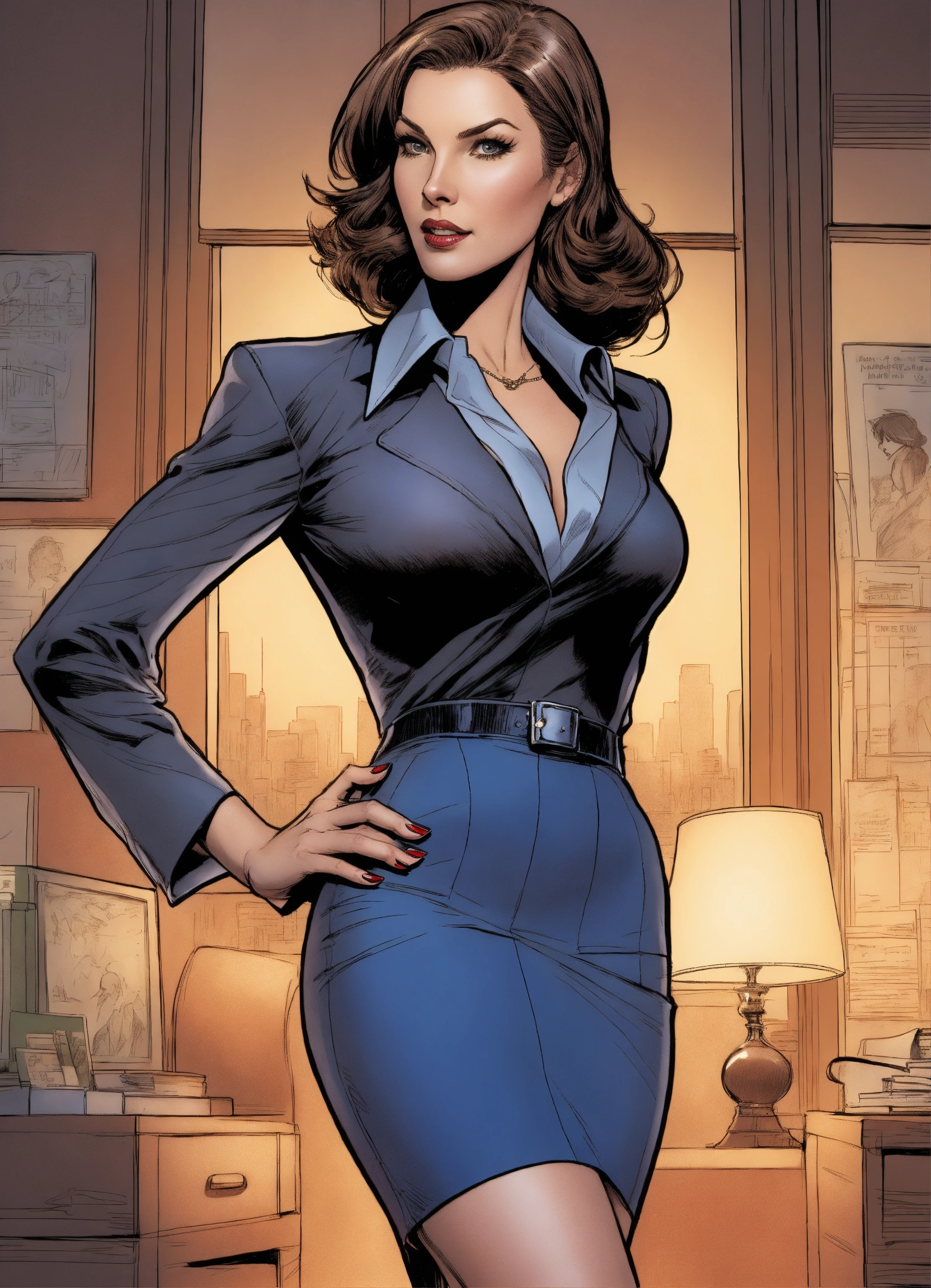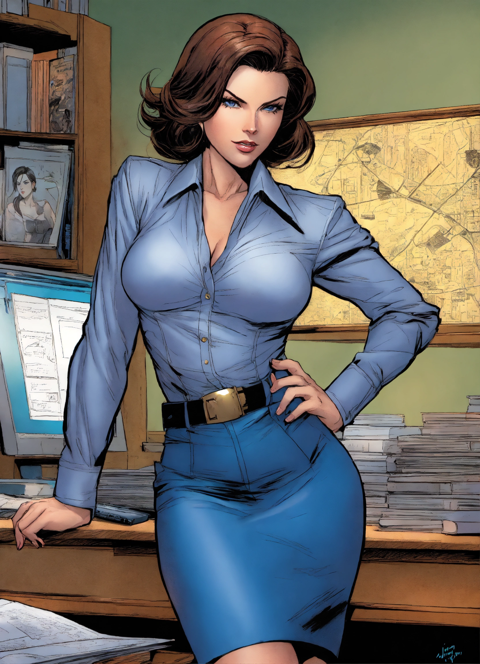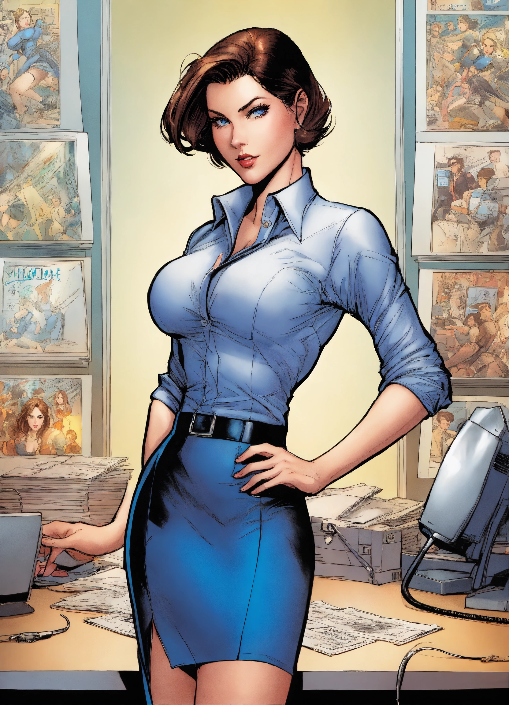 Older jill valentine as lois lane as a secretary, wearing a pencil skirt and stiletto high heels, art by jim lee, art by j. scott campbell, short brunette bob hair