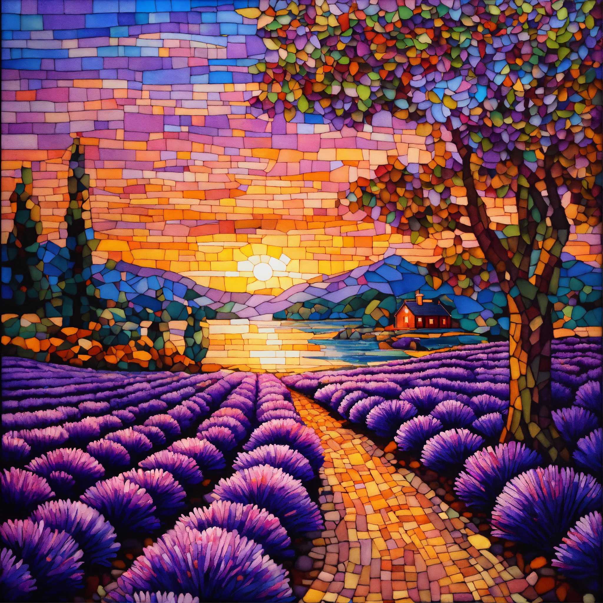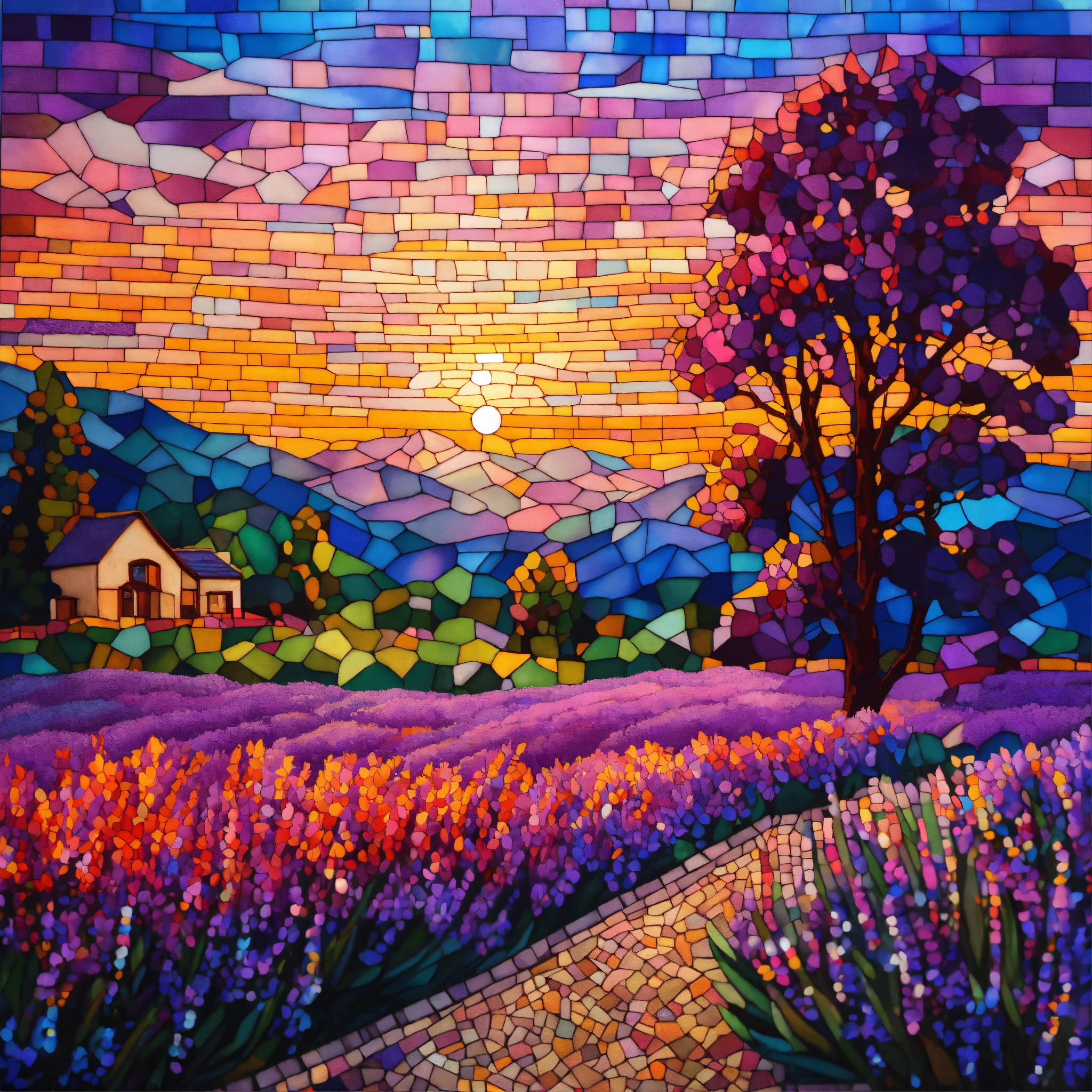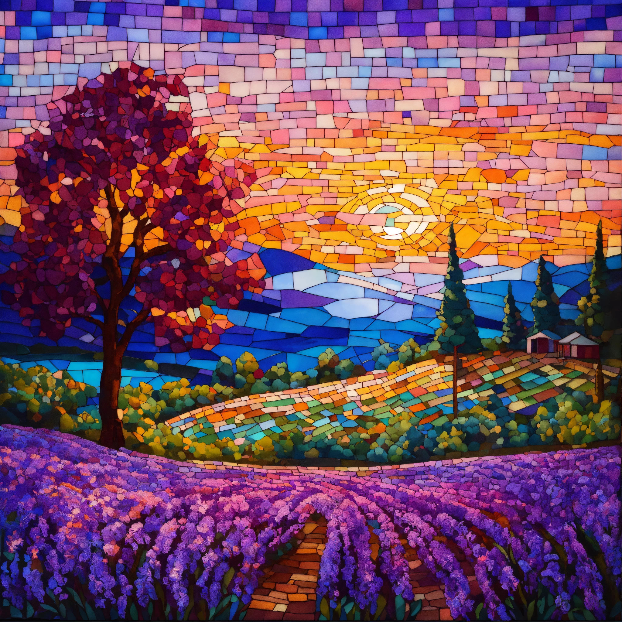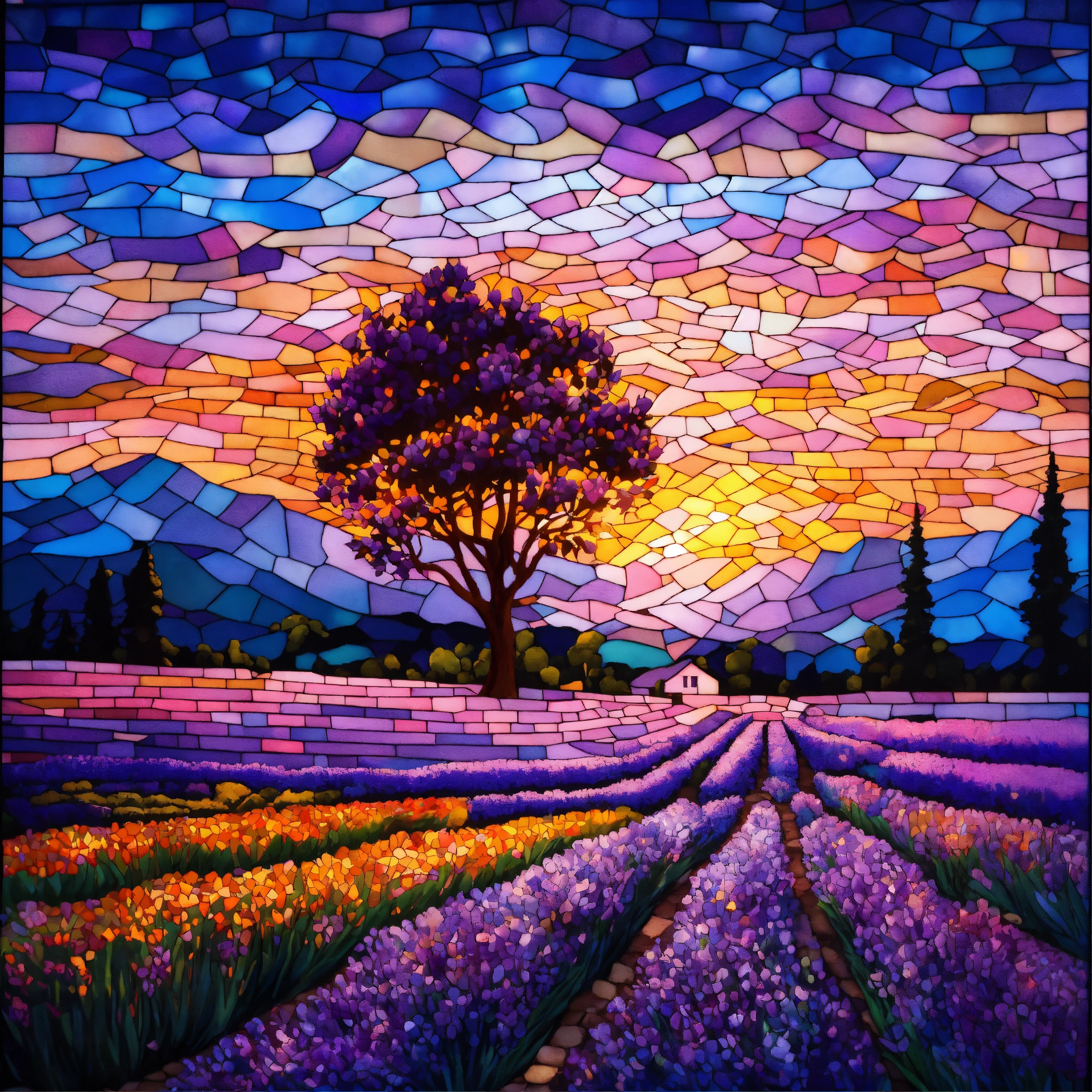 Stained glass window mosaic of field of lavender, vibrant colors, ultra sharp detail, trees, ultra blue lake, glitter, stars, stardust, hyper realistic, well rendered, detailed, electric pink, orange and yellow sunrise sky in style of thomas kinkade
