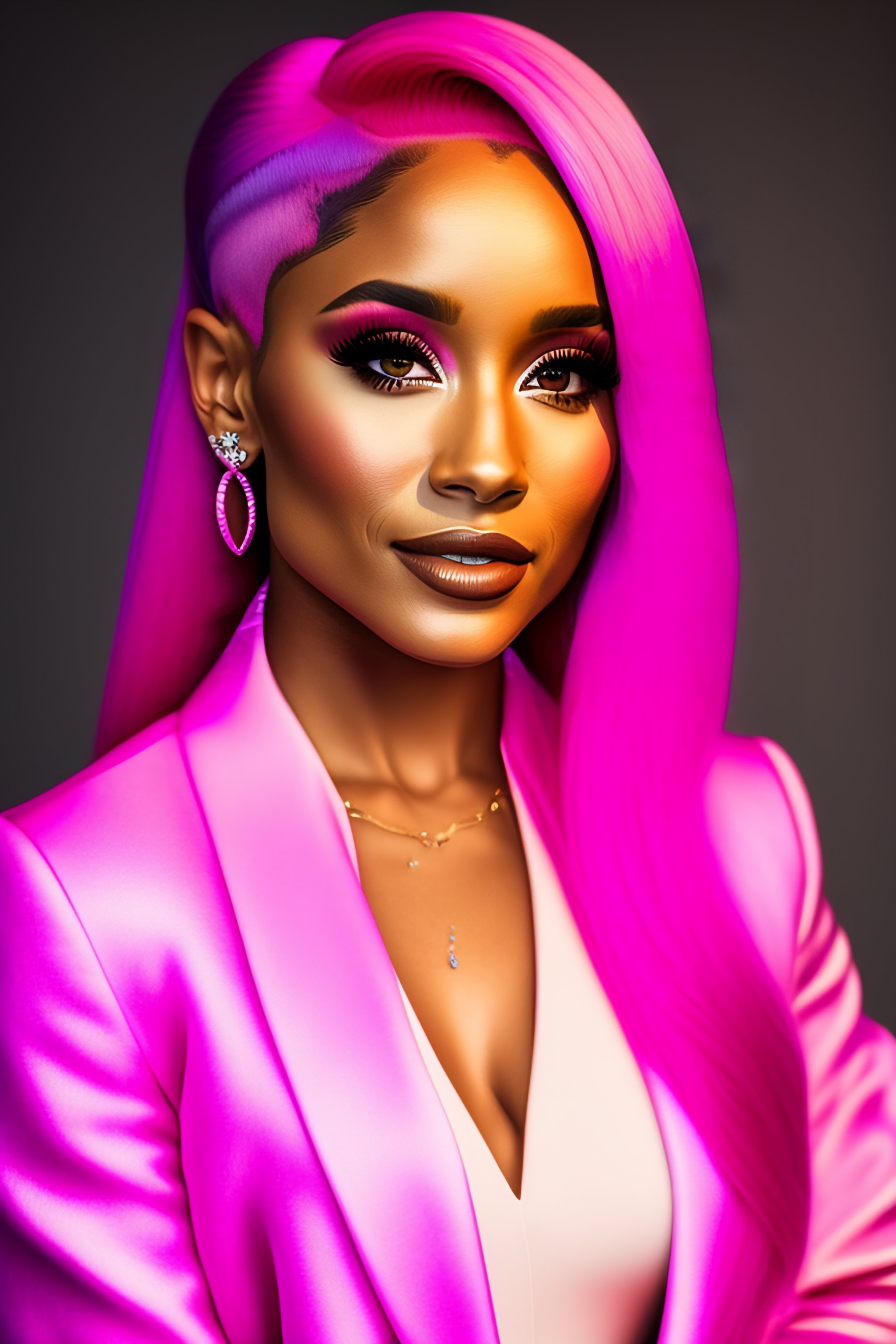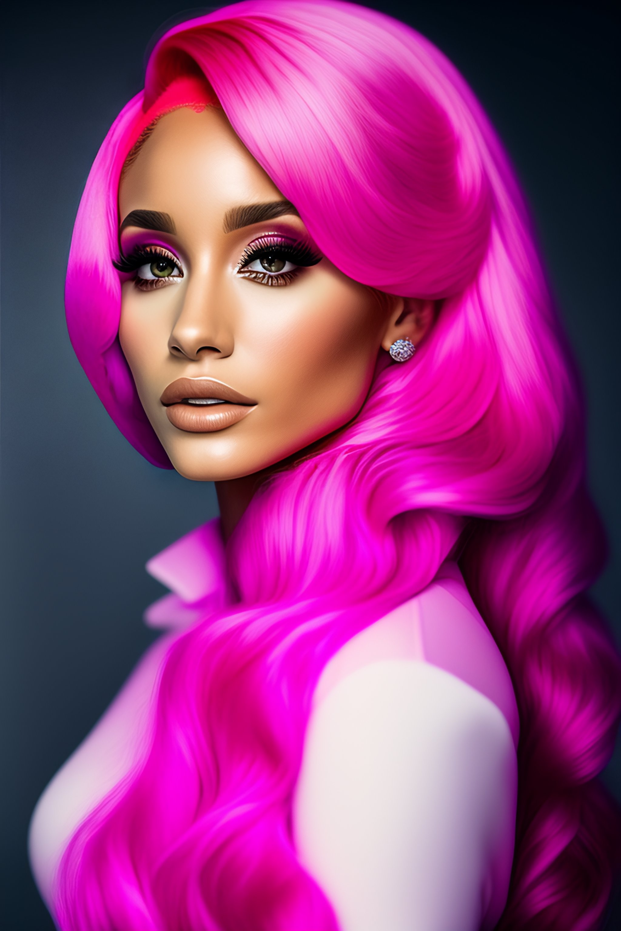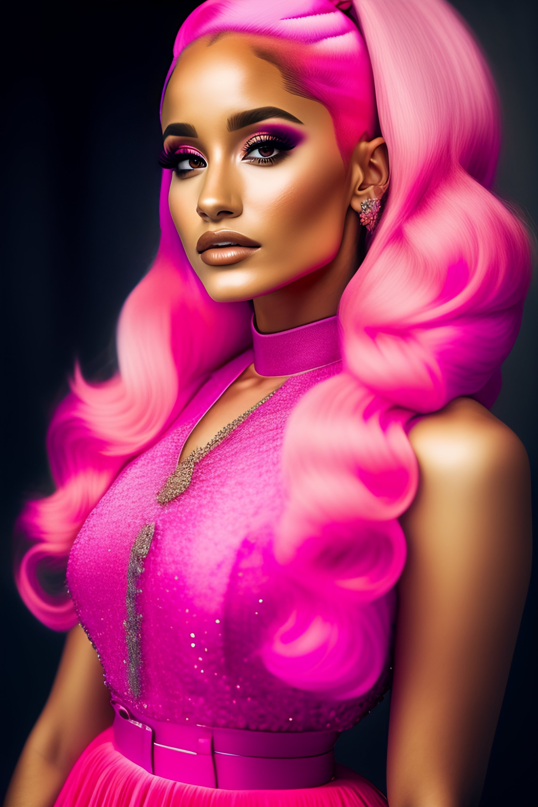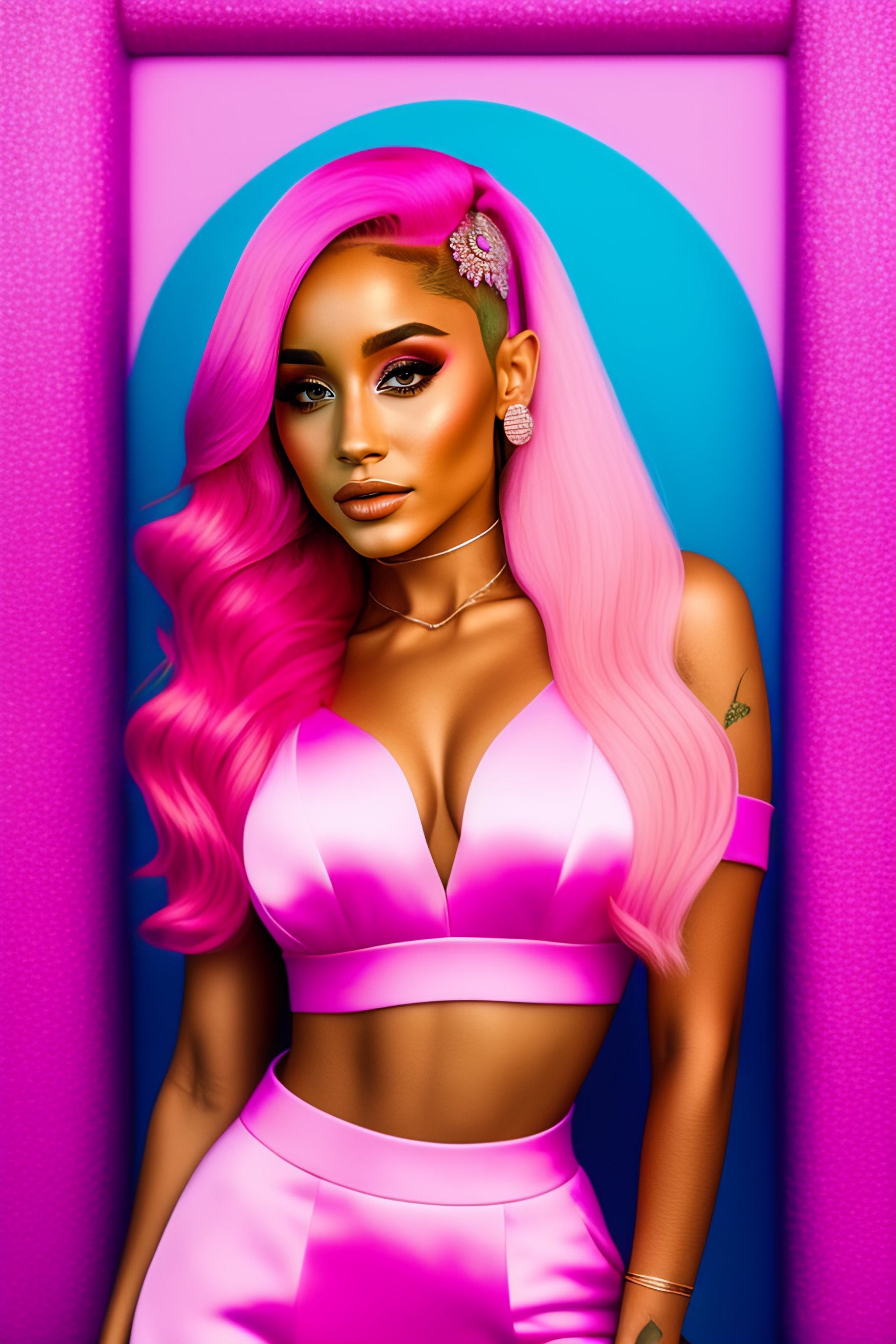 Photo of a beautiful ariana grande with pink hair in pink clothes, medium shot, intricate, elegant, highly detailed