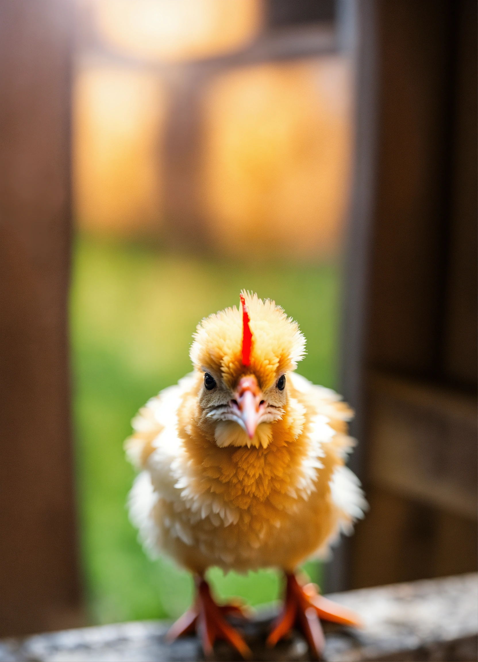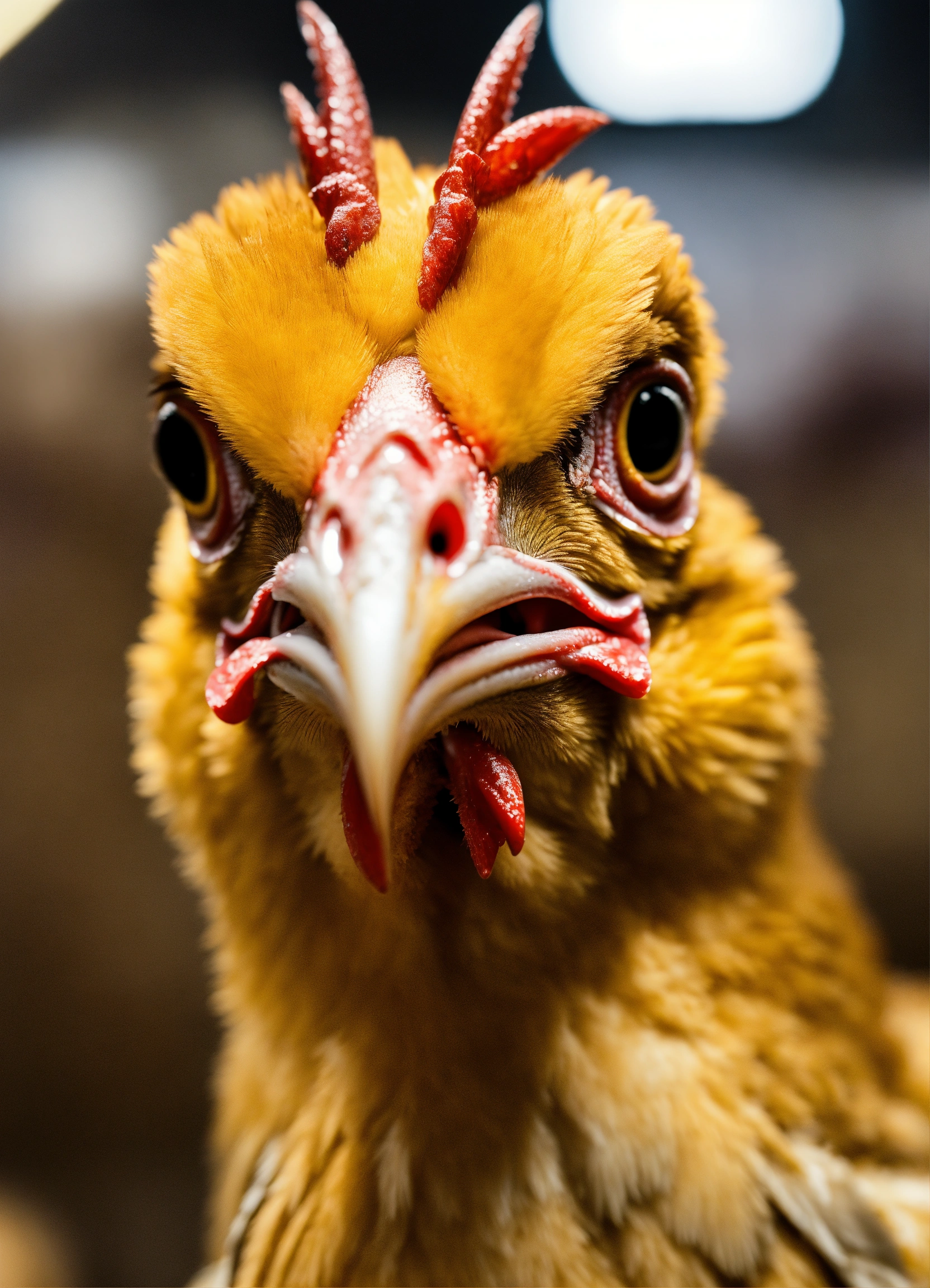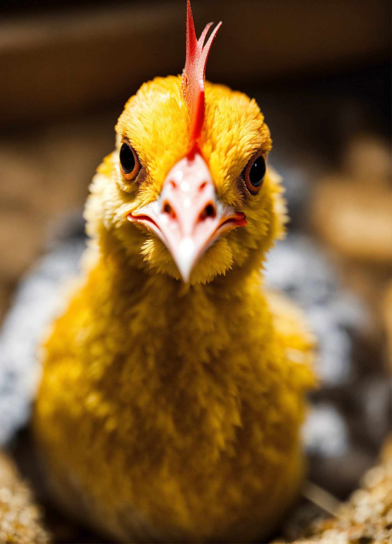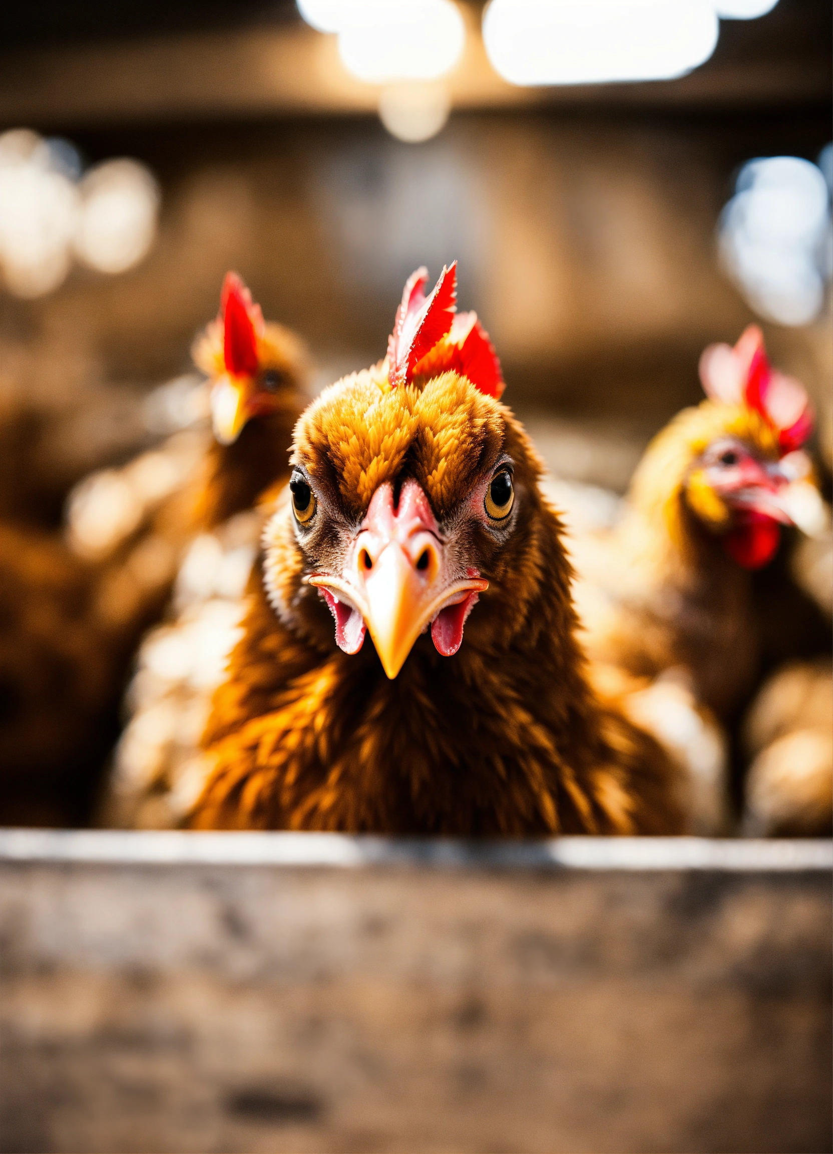 Photo of a small chicken head looking into the camera in a large stable, high amount of blurred background