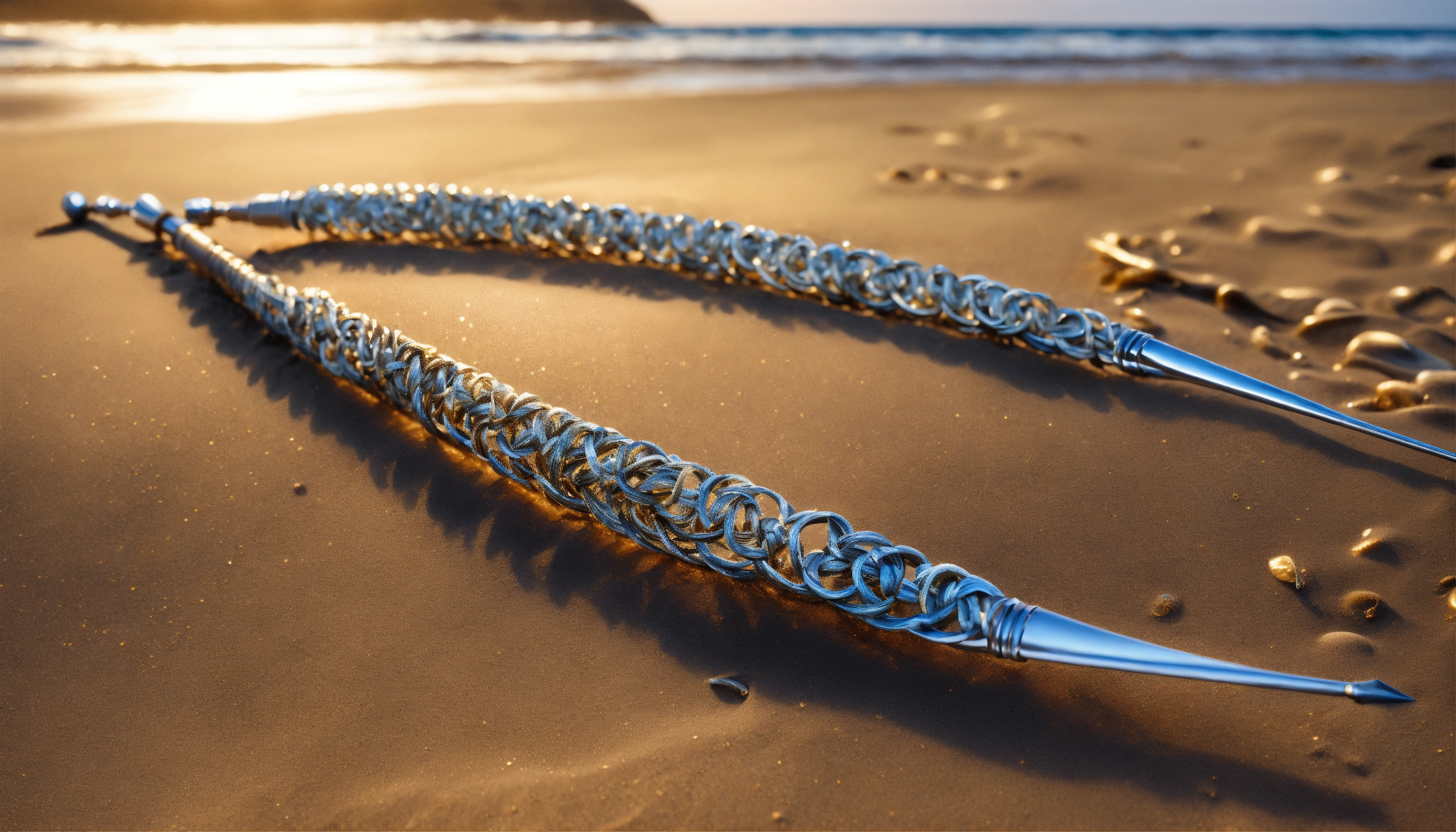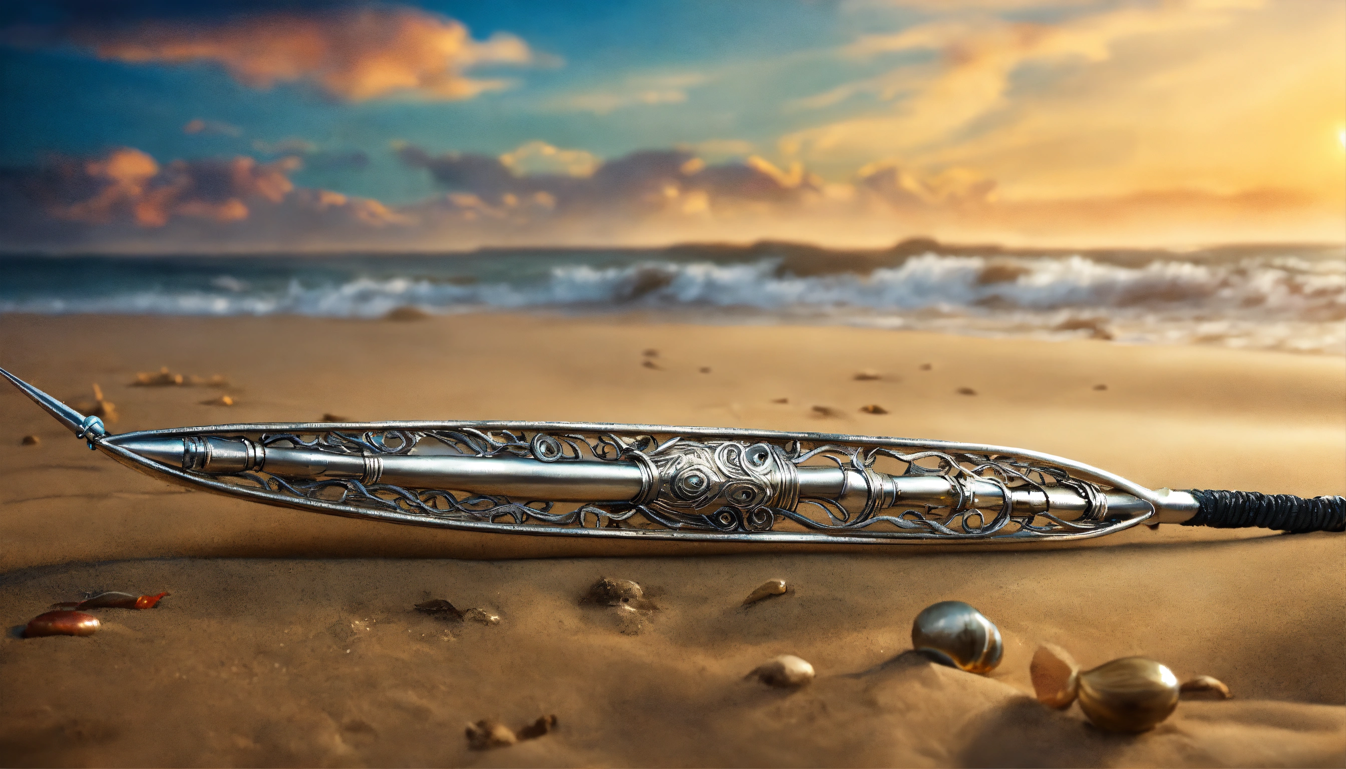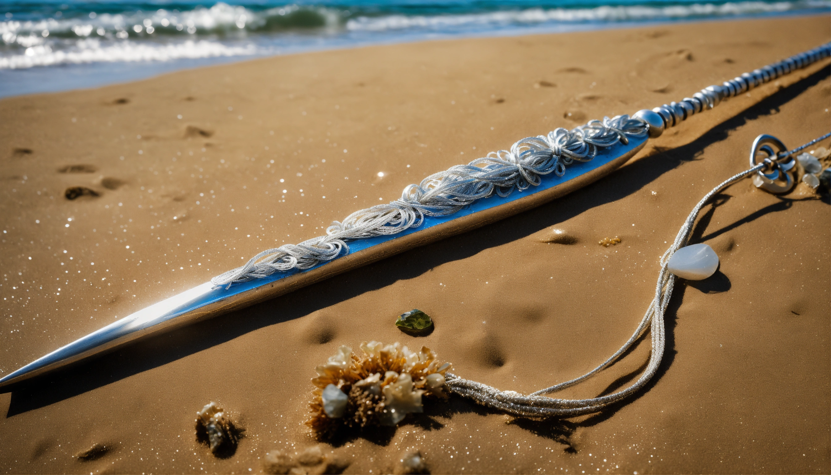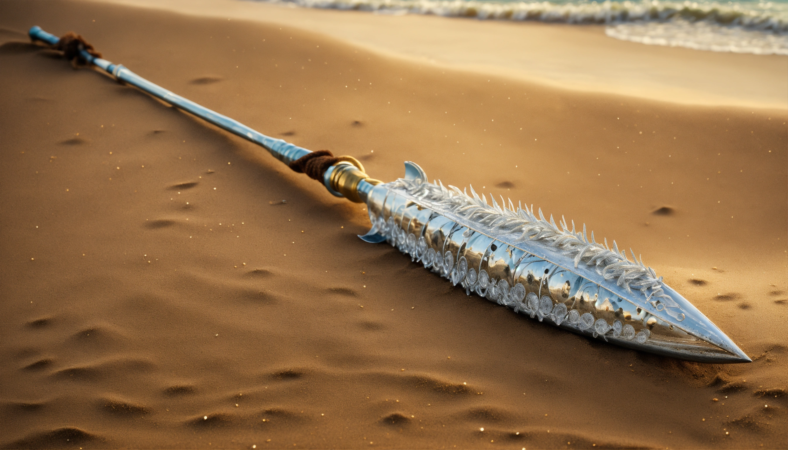 8k, picture of a narrow and delicate toothed fishing spear with barbs made of lunar-silver, highly ornamented, at the bottom there is an eyelet to which a twenty meter long tow line made of braided seaweed is attached, very detailed, ultra realistic, lays on the beach in the sand, fantasy