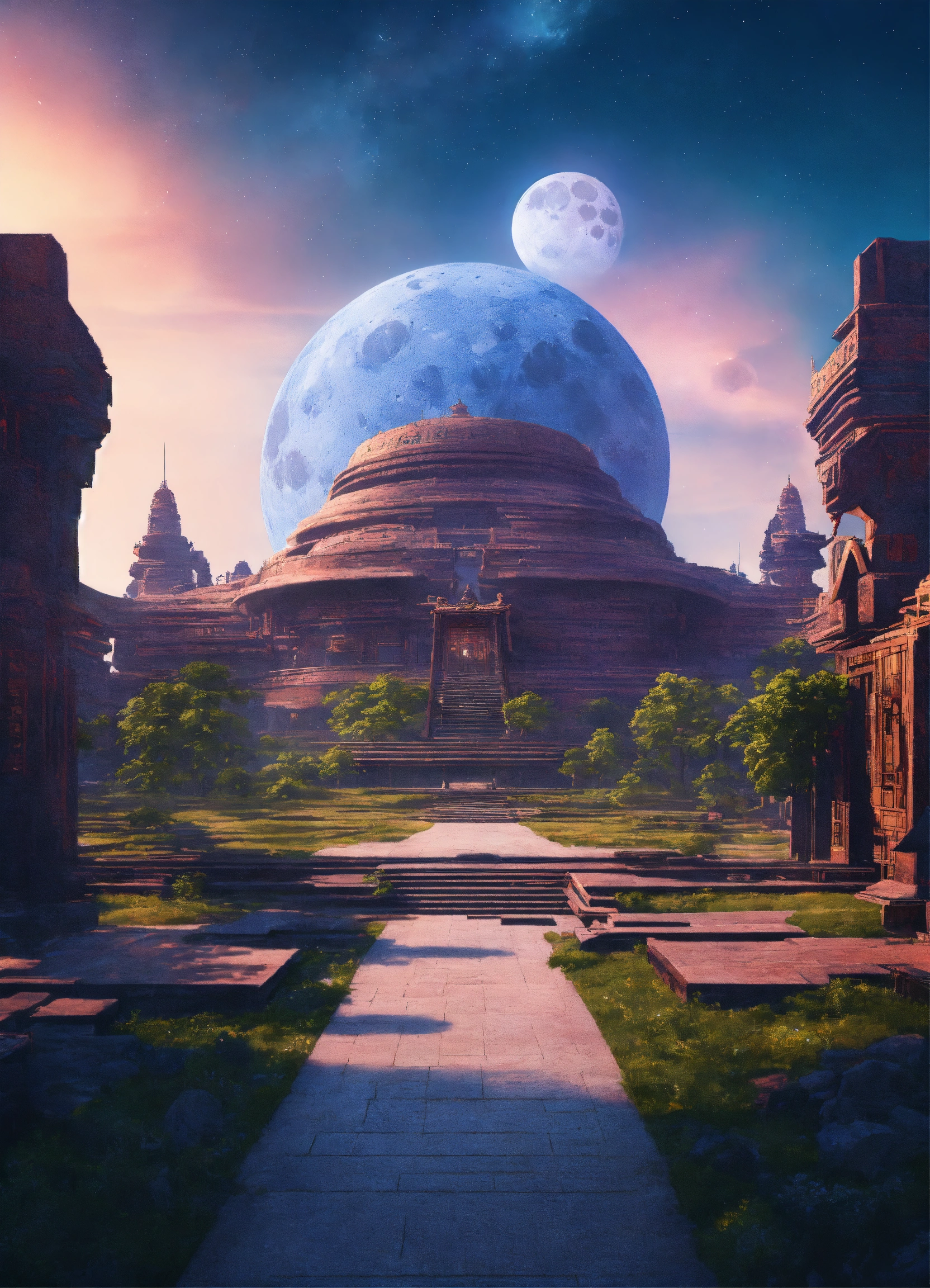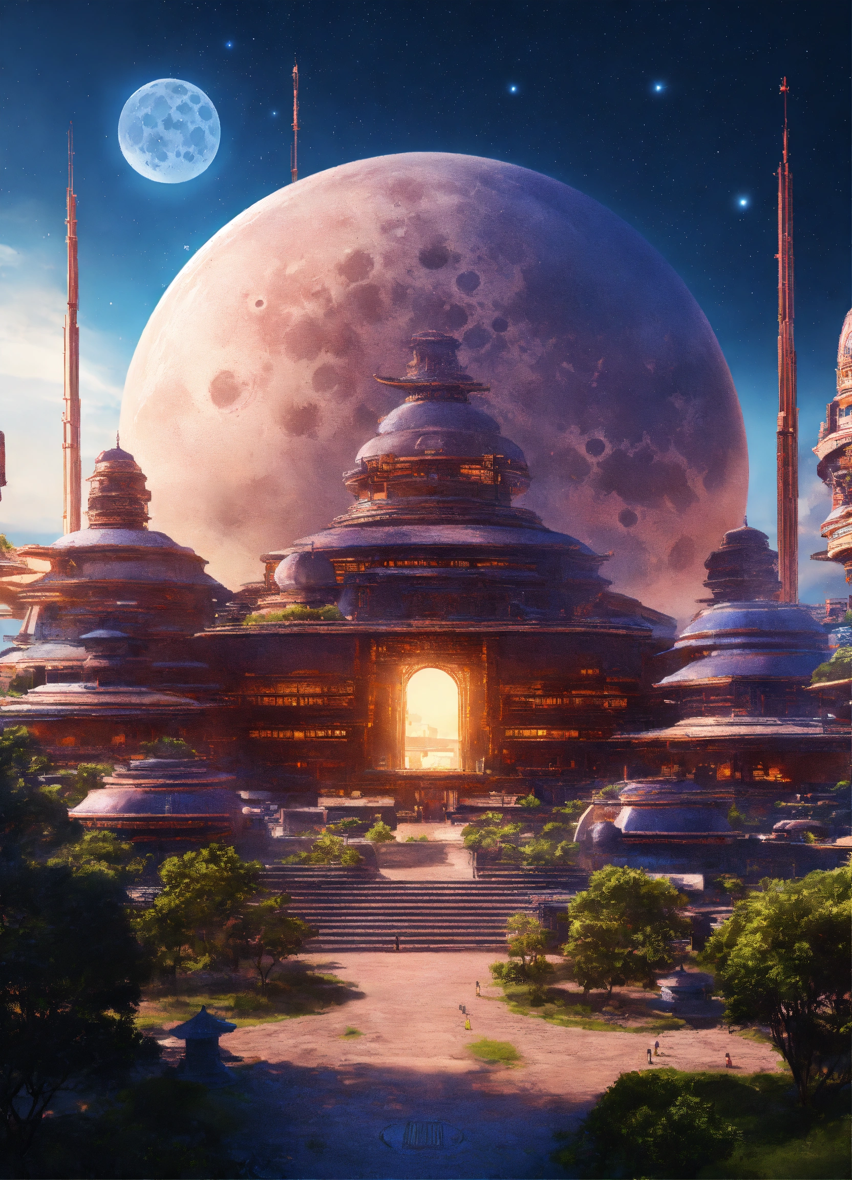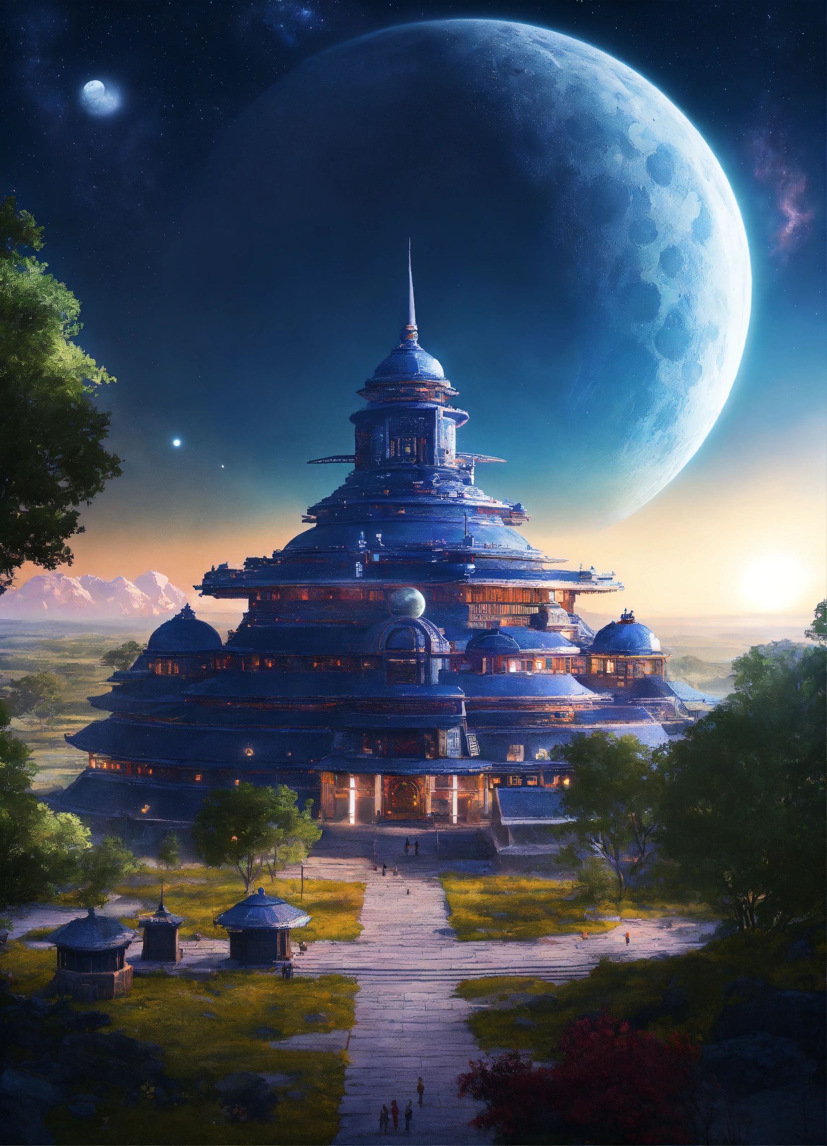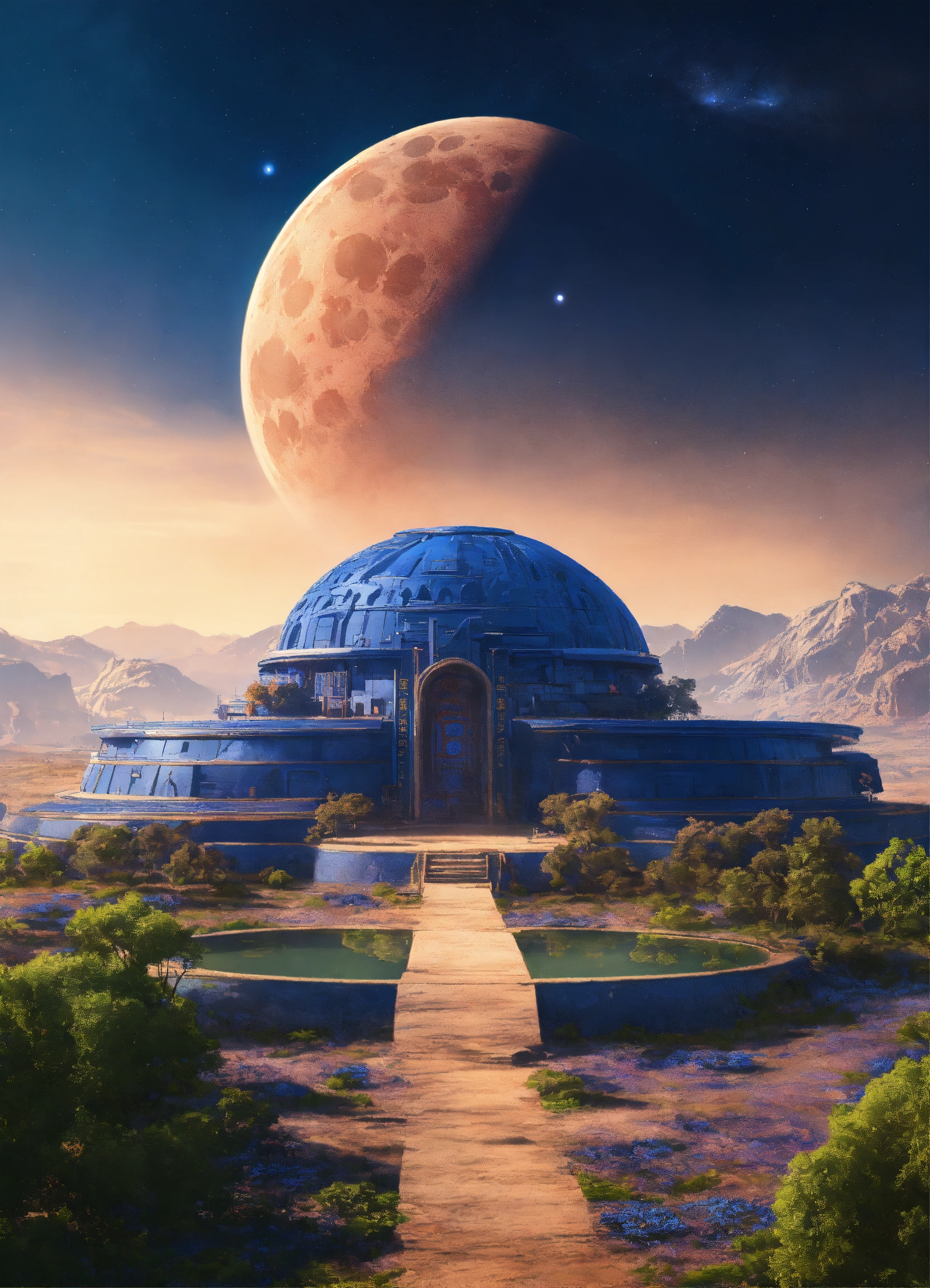 Distant view of a large round indigo temple in the center of a futuristic community, extraterrestrial landscape, planet sirius, the moon and stars can be seen in the sky even during the day