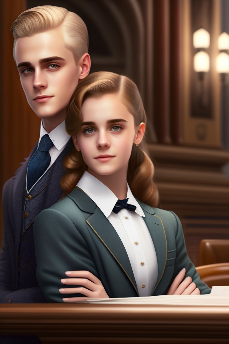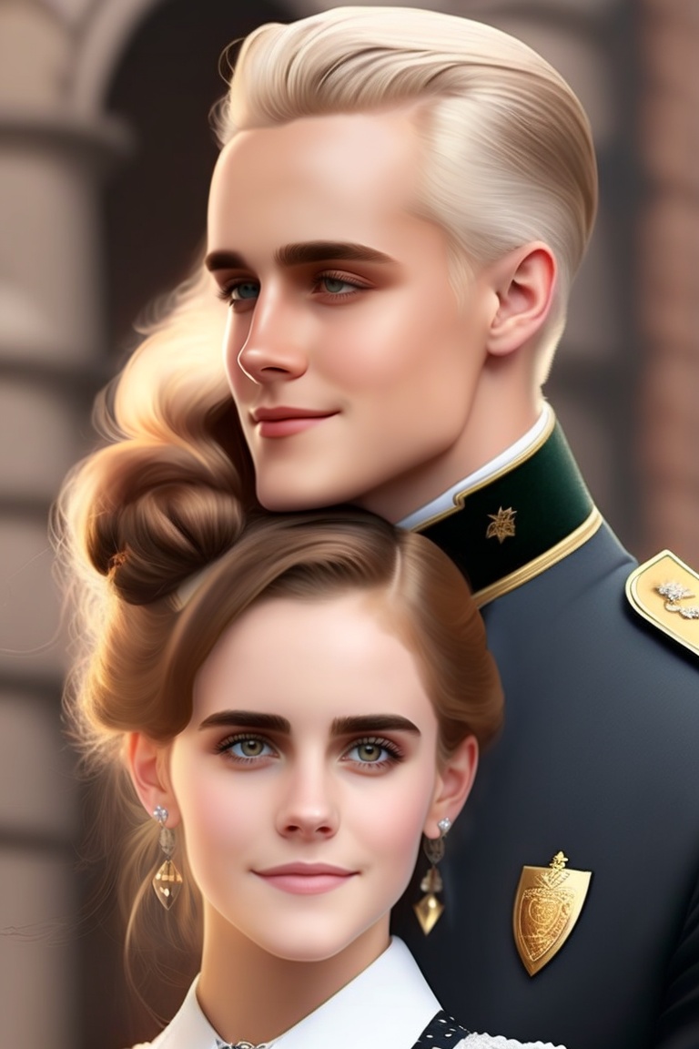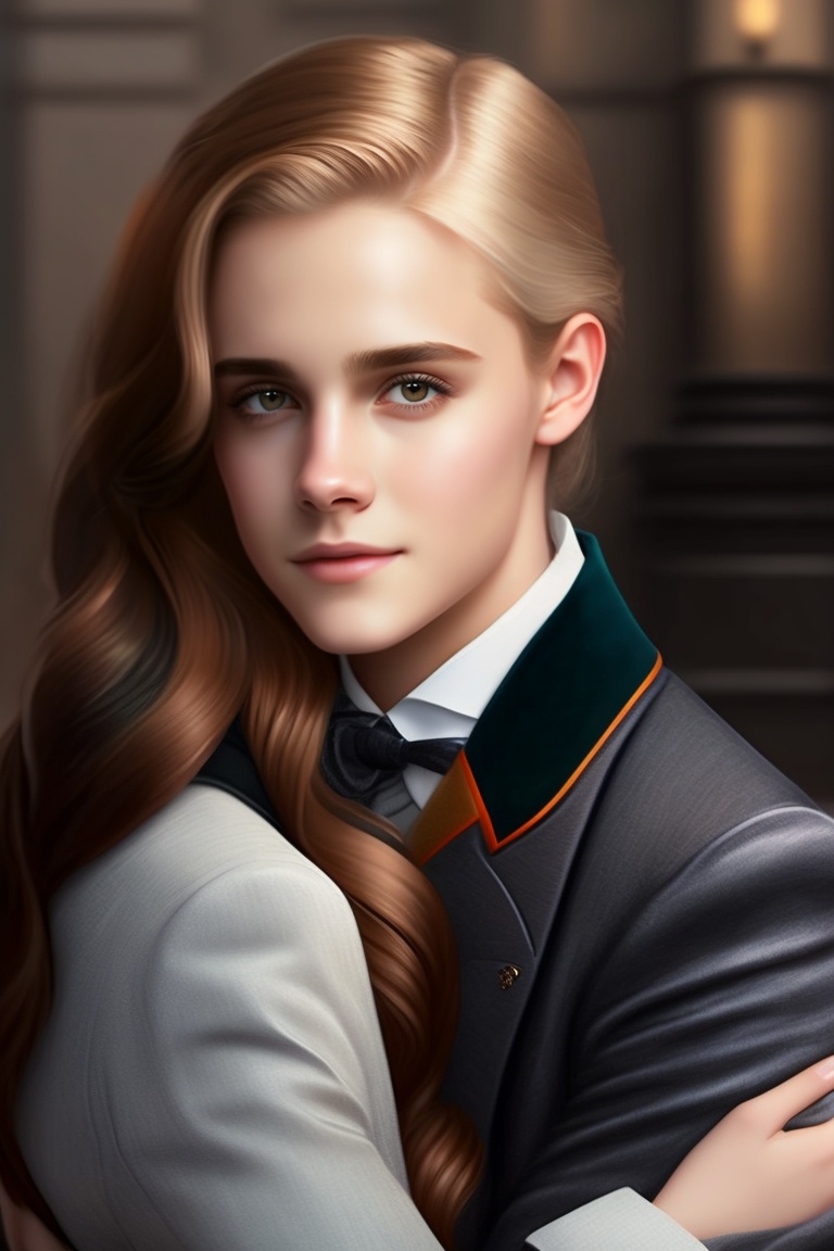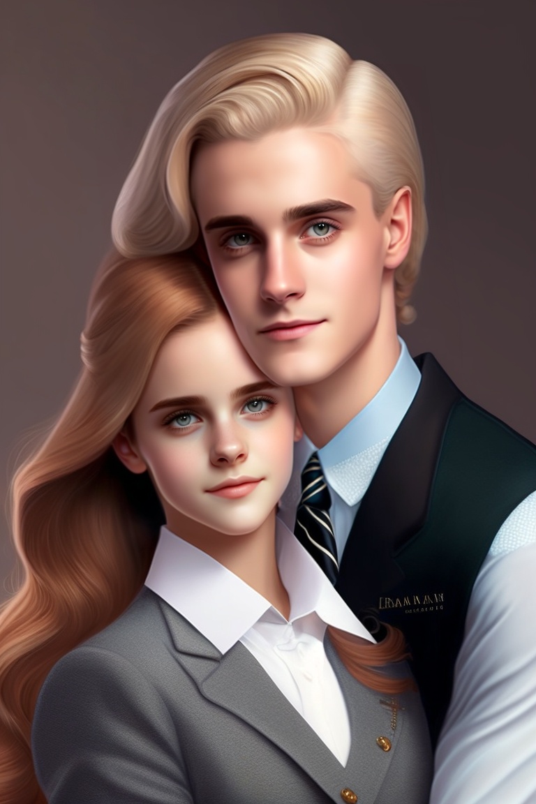 Hogwarts style, beautiful girl emma watson with long curly brown hair hugs a man draco malfoy, draco malfoy has white short slicked back hair, dressed in school uniform, romantic