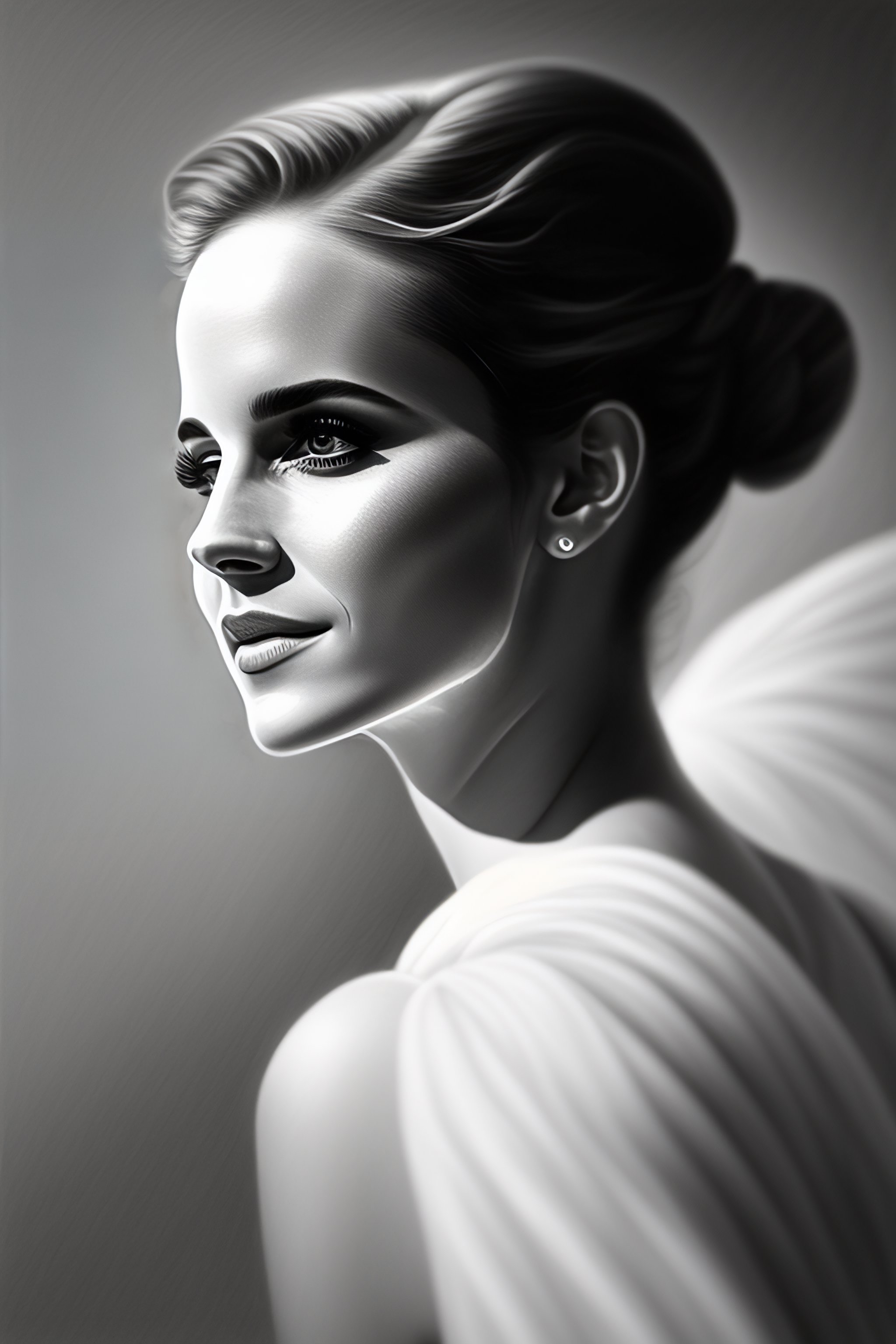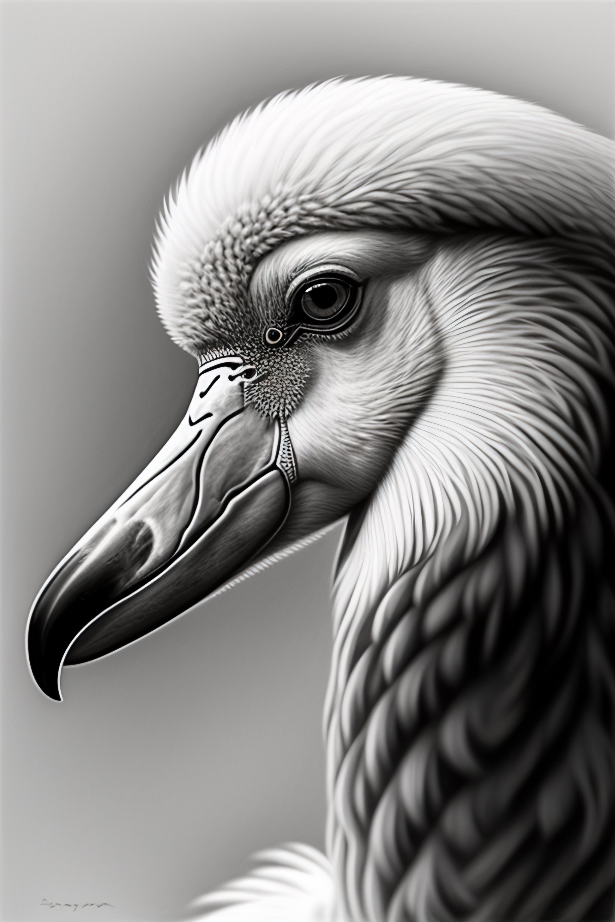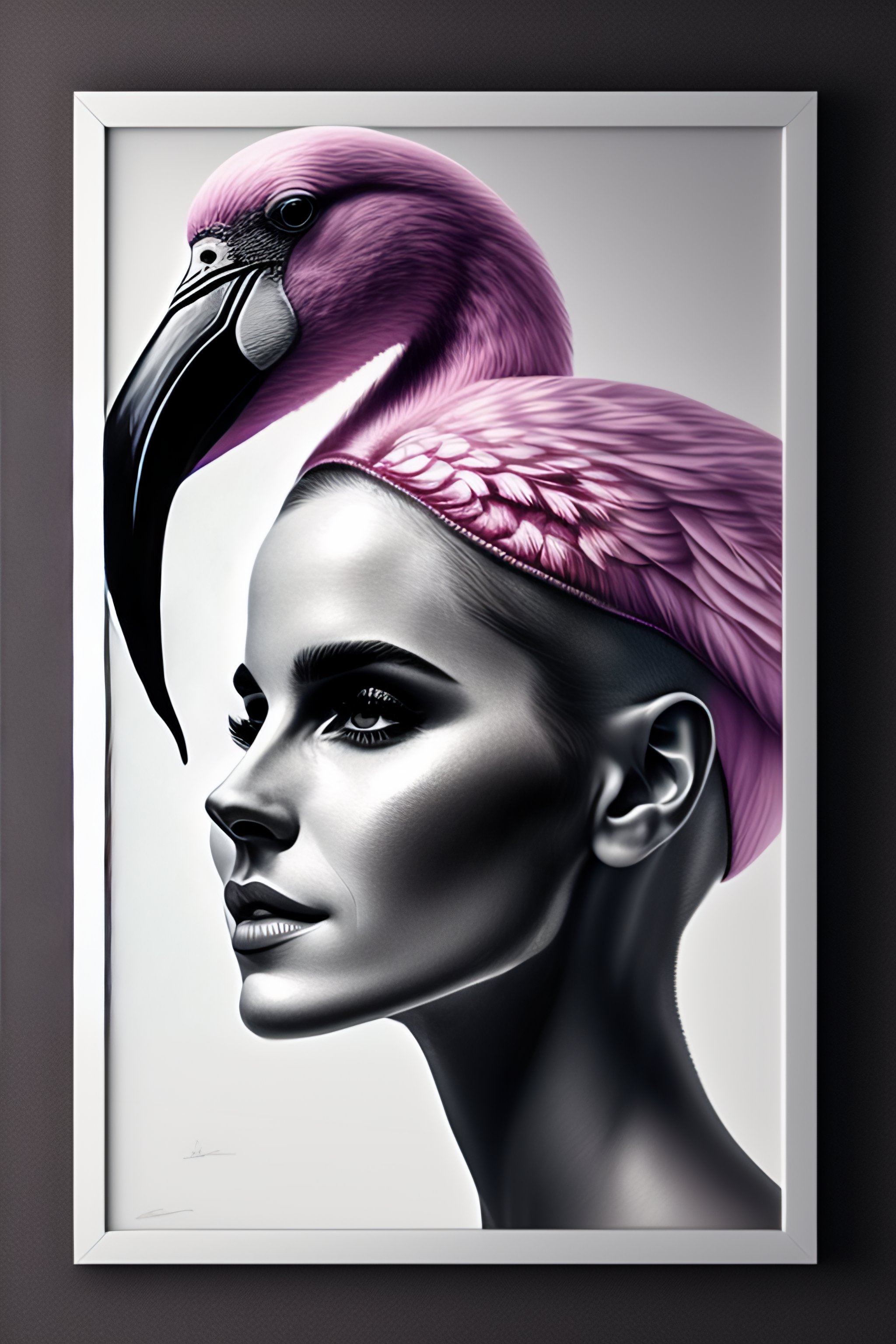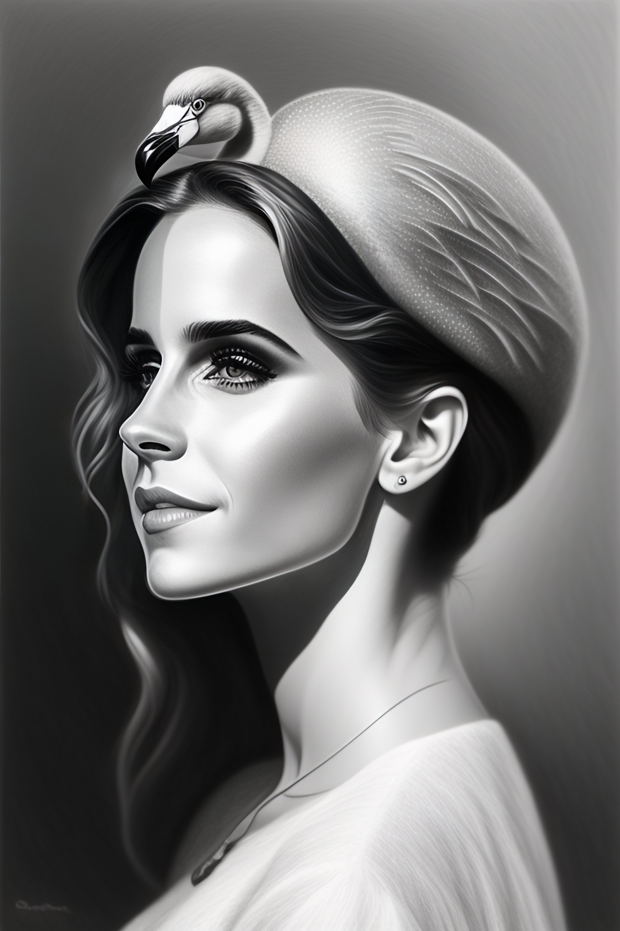 Pencil drawing of a flamingo flying over emma watson's bald head