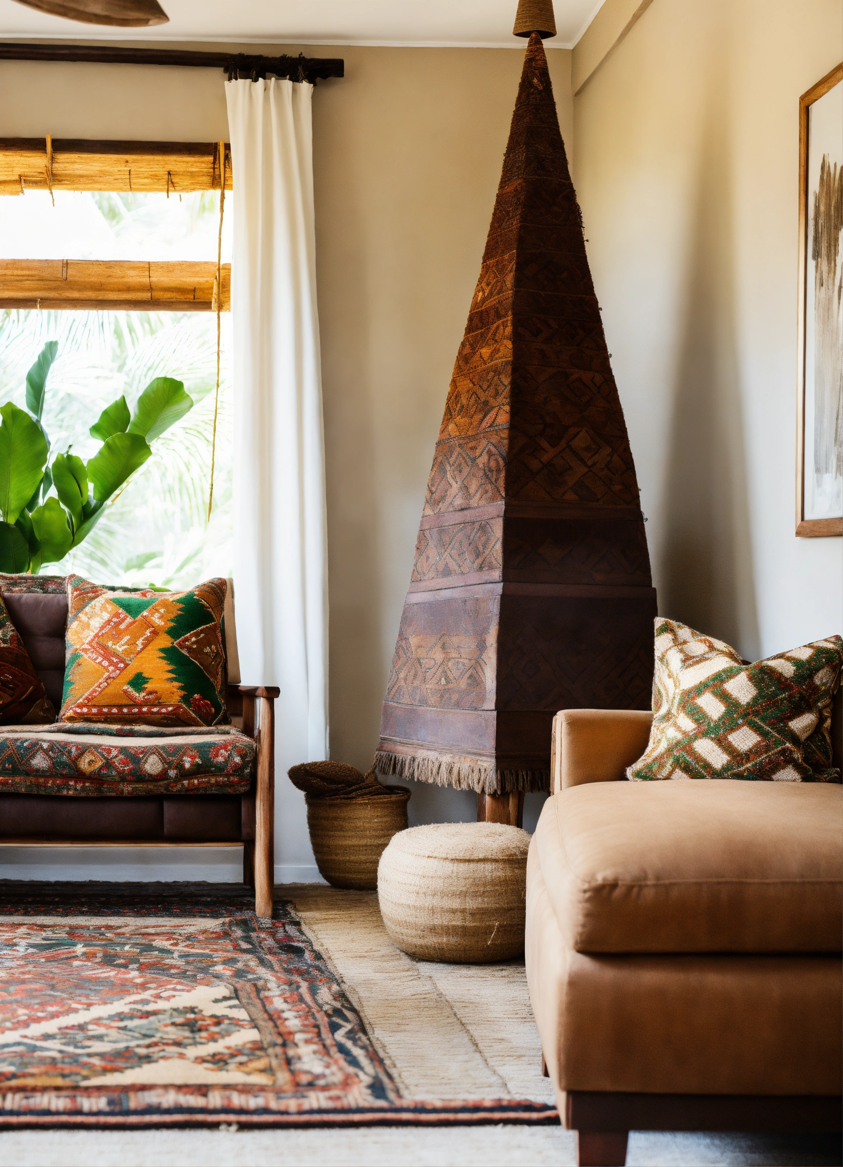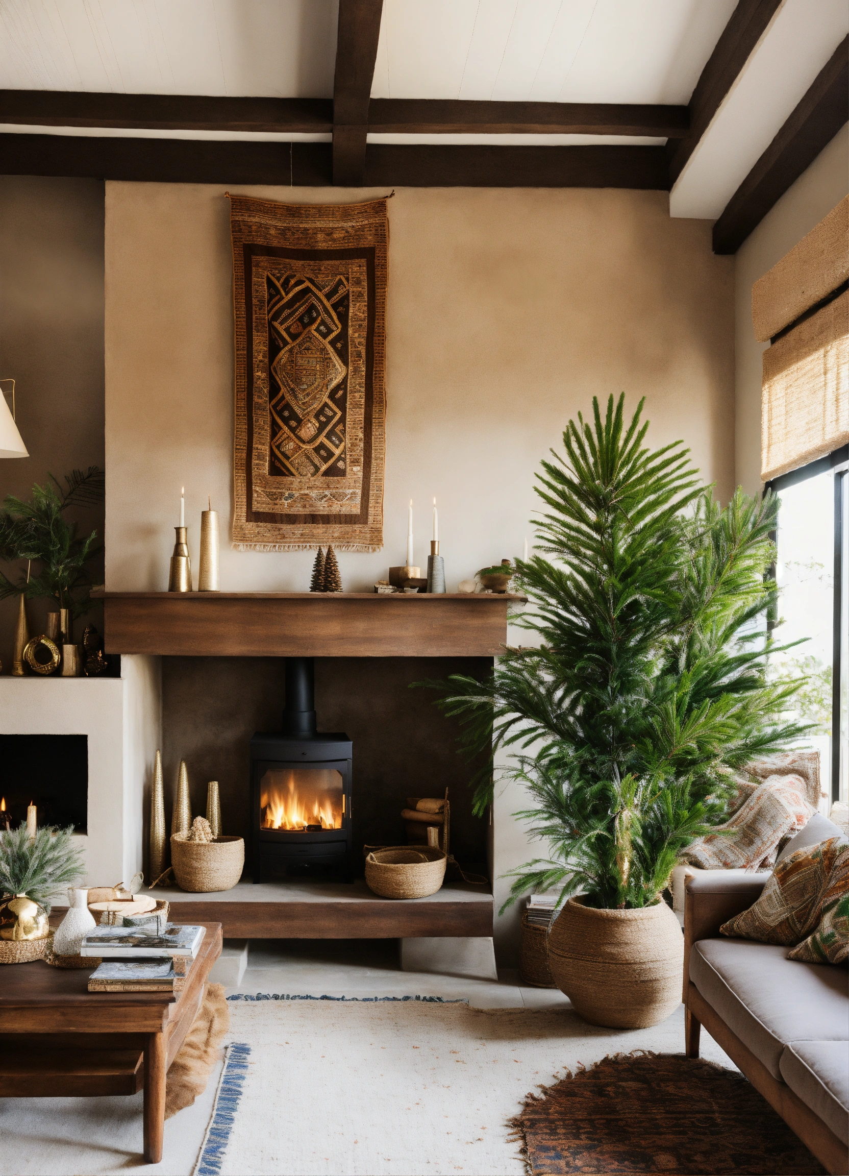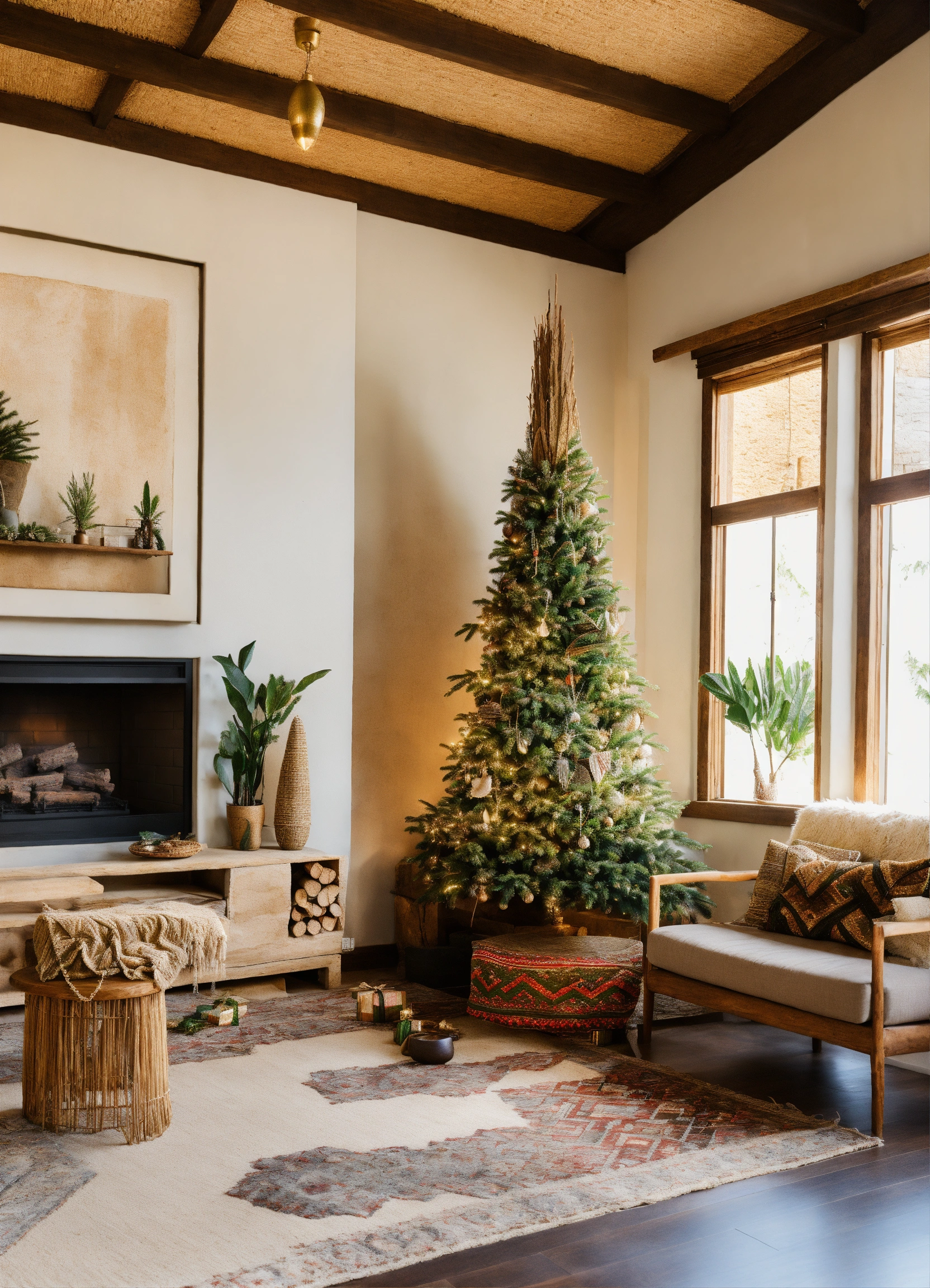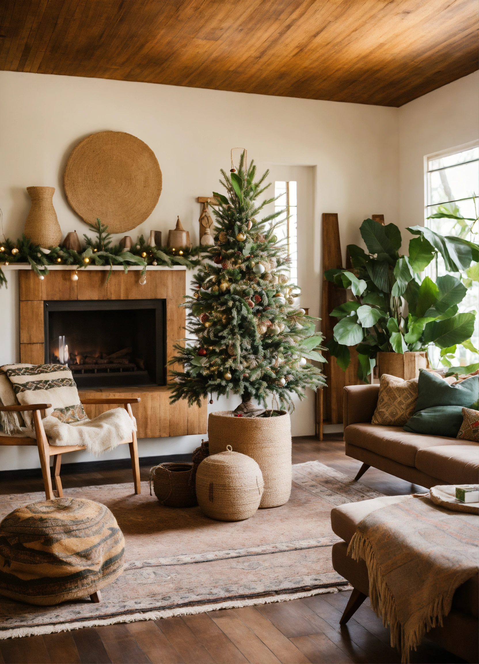 African minimalist boho christmas tree in the middle of an african minimalist living room, wood furniture, natural light, earthy tones, fireplace, ethnic decor, lush greenery, kuba fabric, palm trees