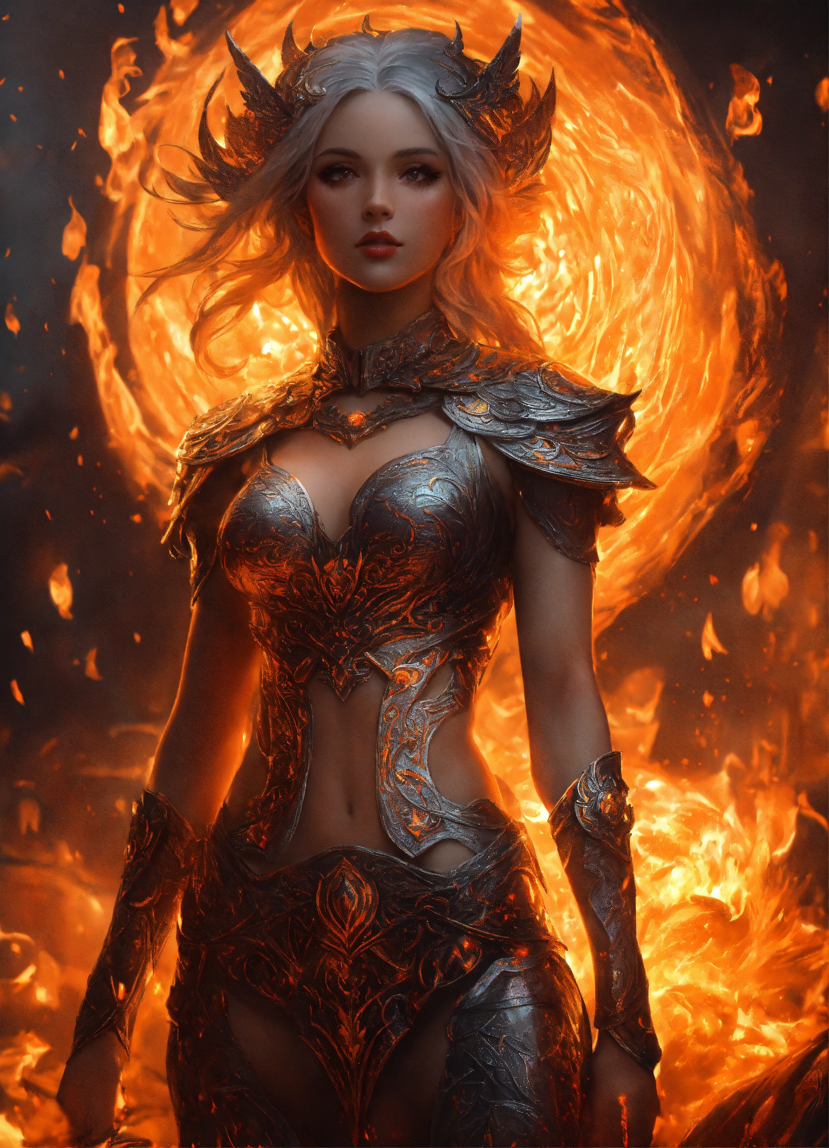 A fantasy female standing in the fire, in the style of dark silver and light orange, playfully intricate, slawomir maniak, dark and intricate, catcore, high definition, meticulously detailed