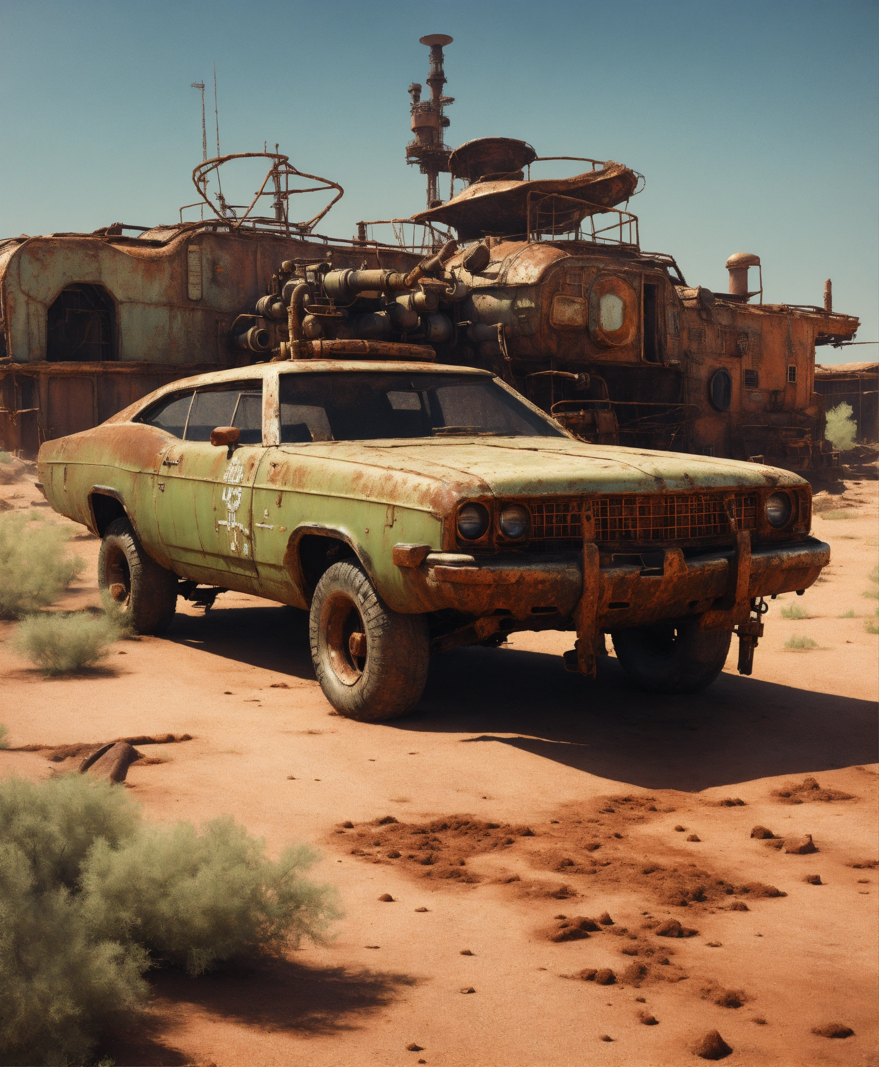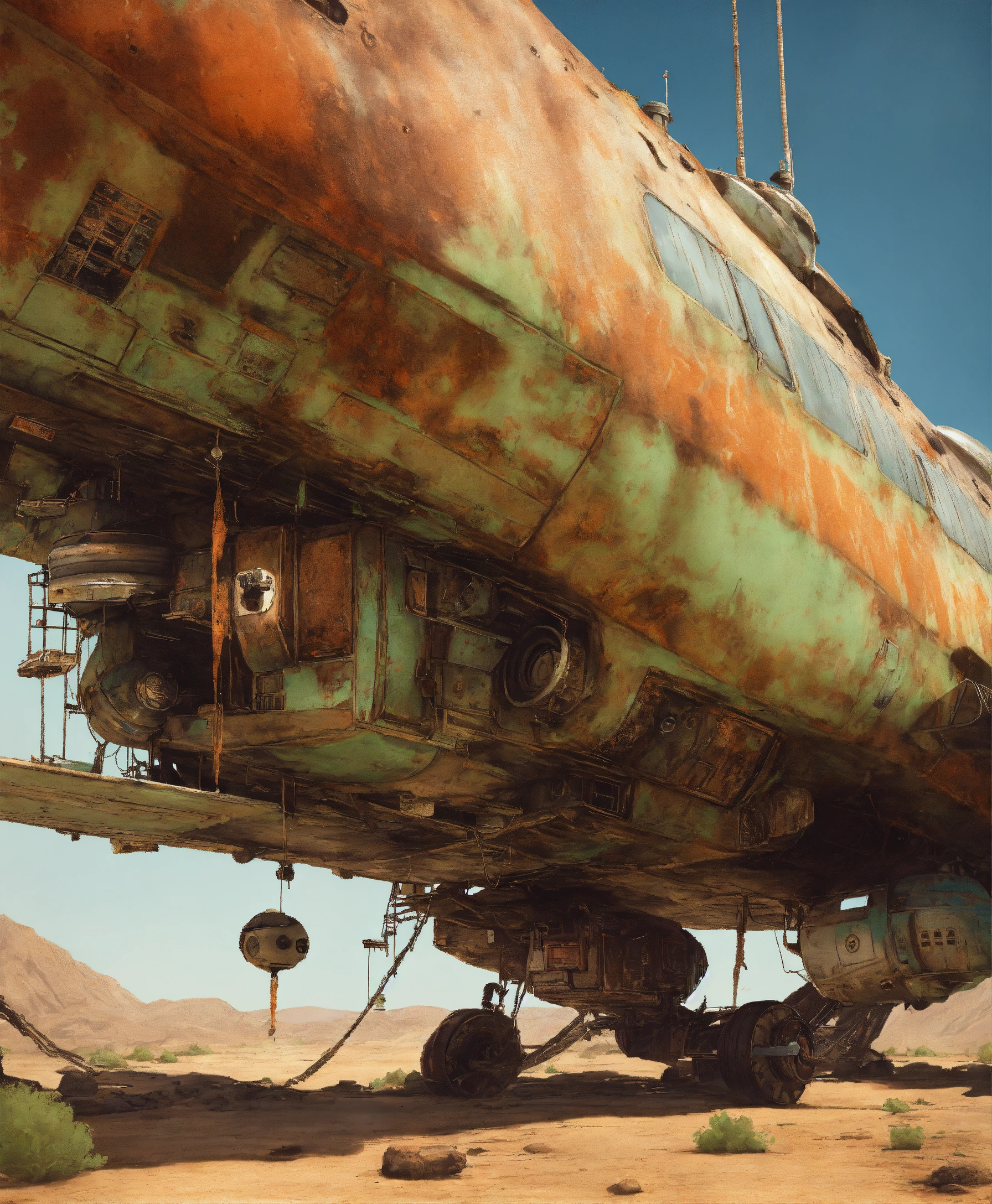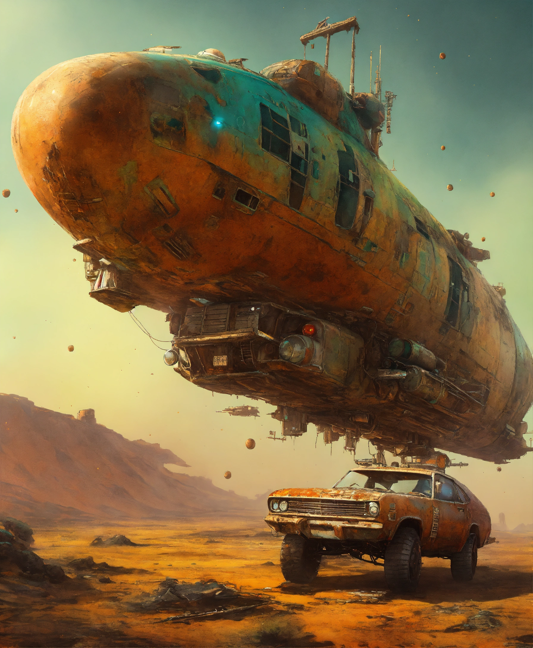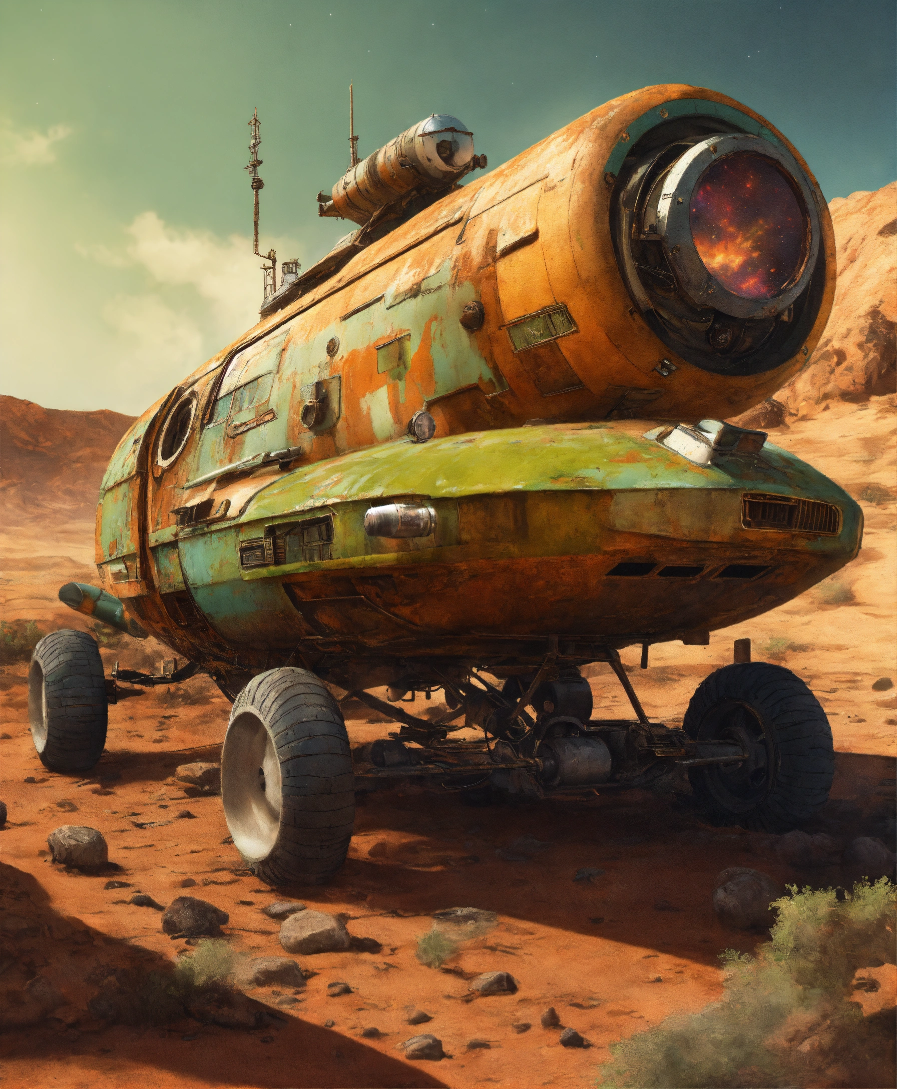 An astro cruiser in a toxic wasteland, natural rust and grime detail, rustic charm, flying in the space