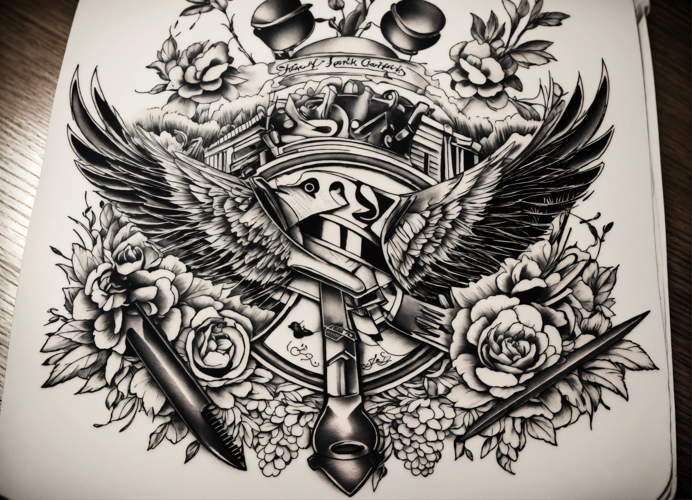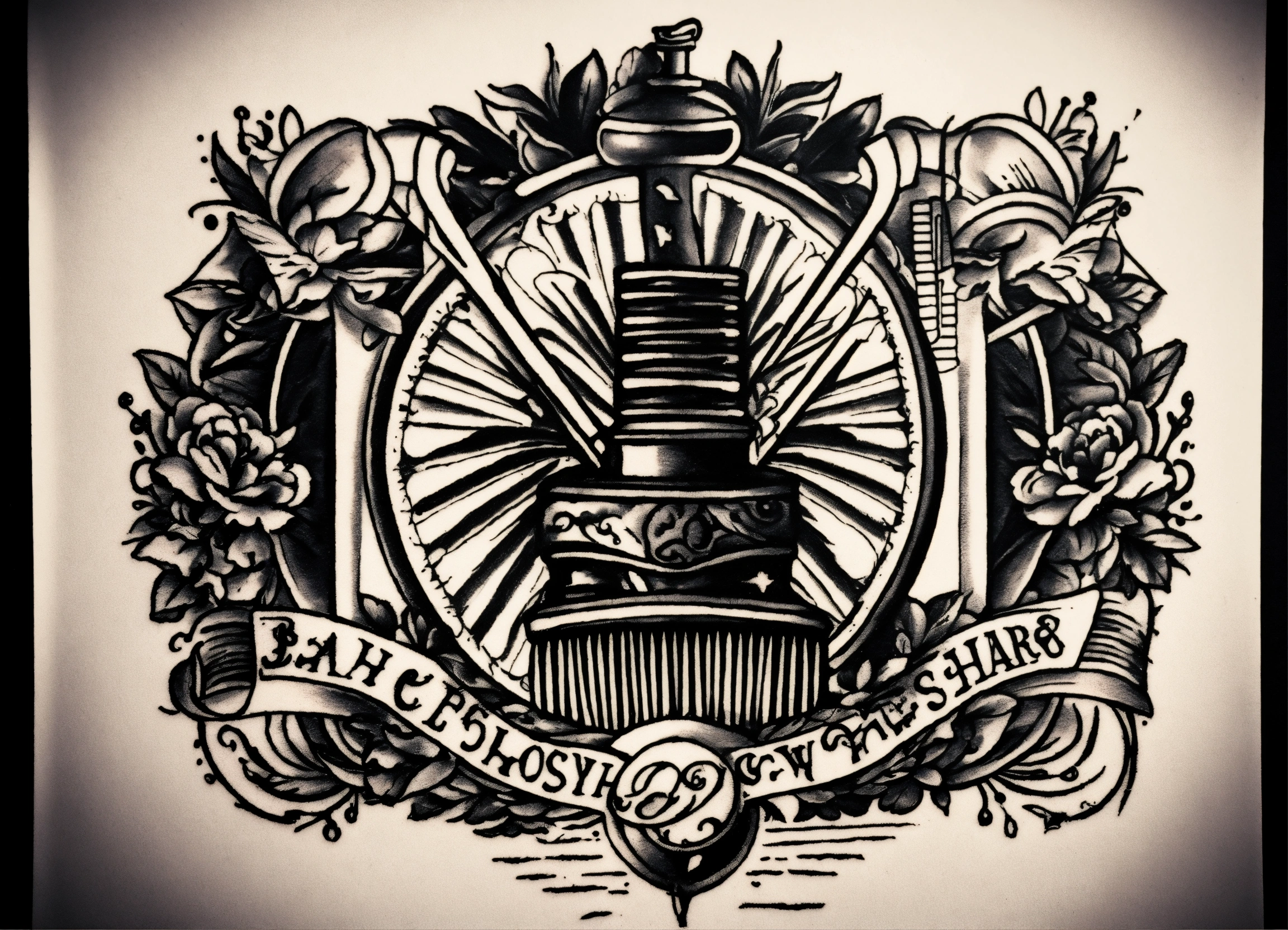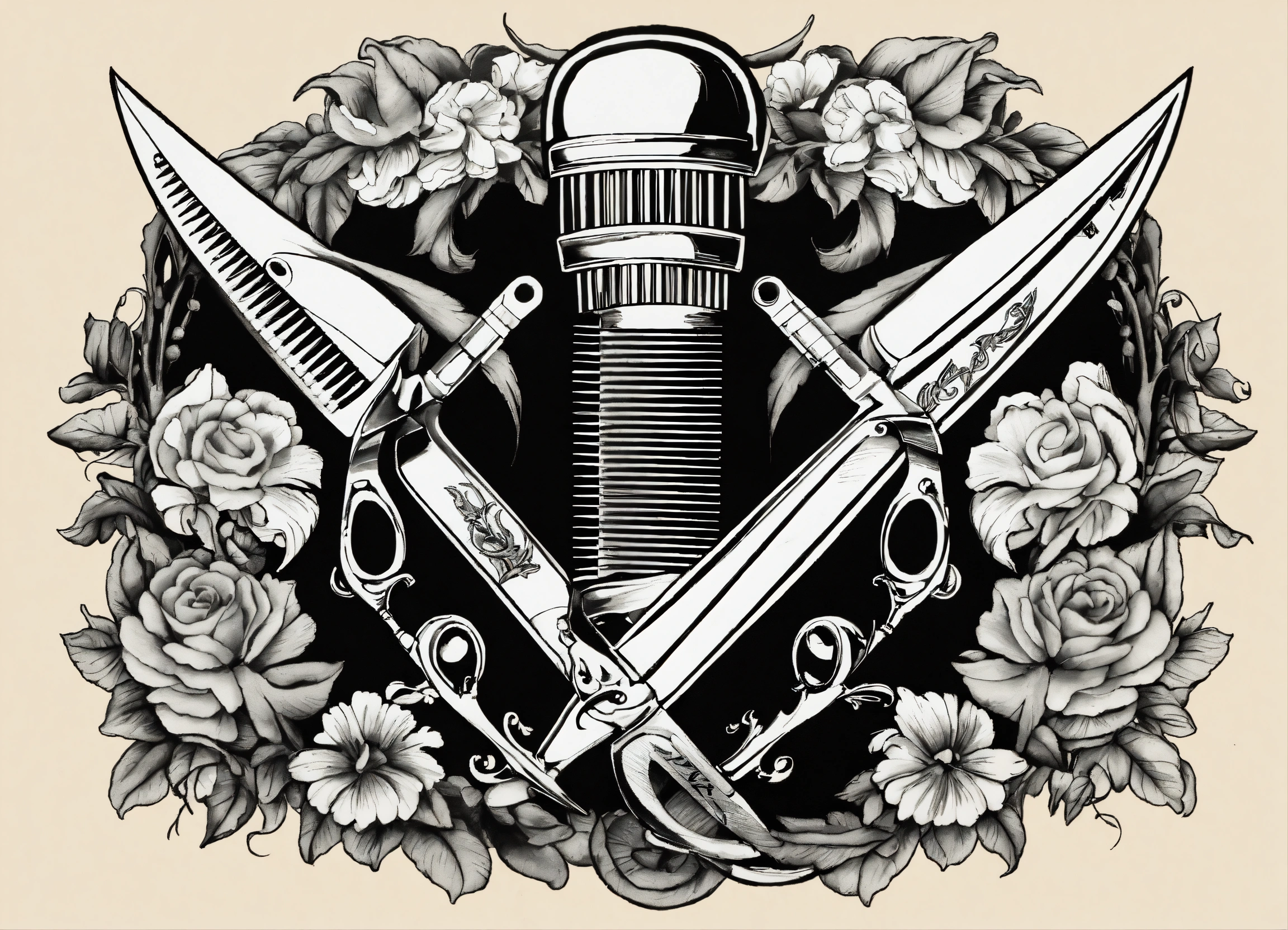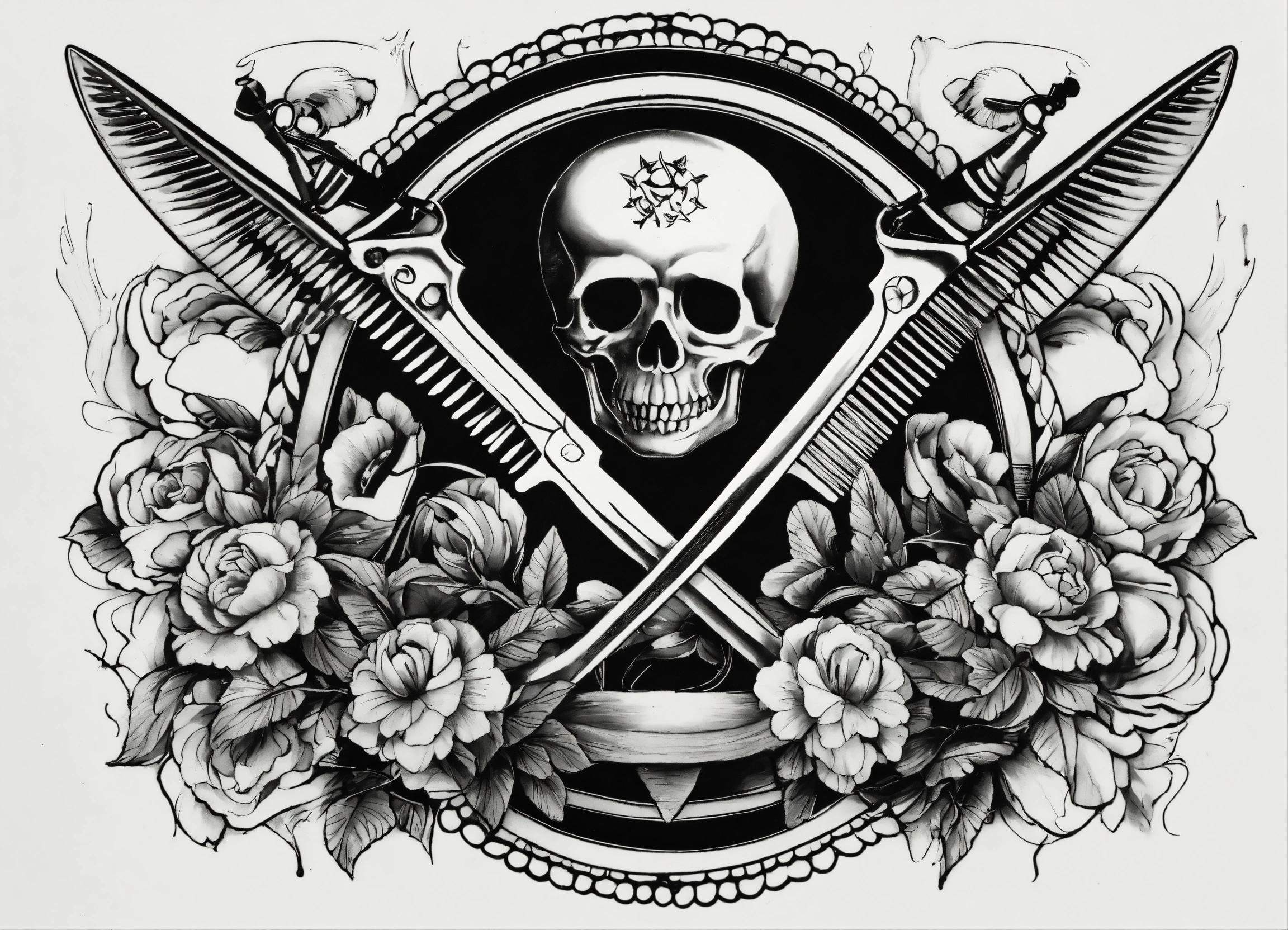 Black and white, comb and shears flash tattoo, white background, traditional style, sailor jerry style