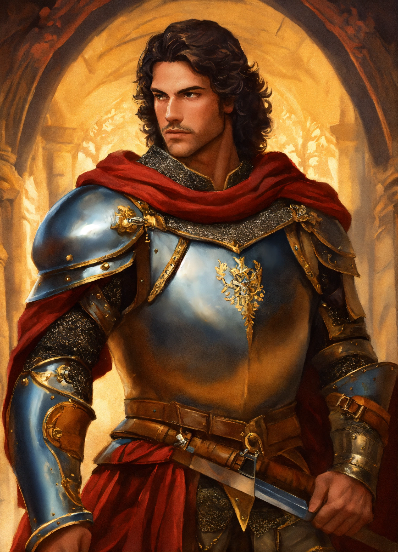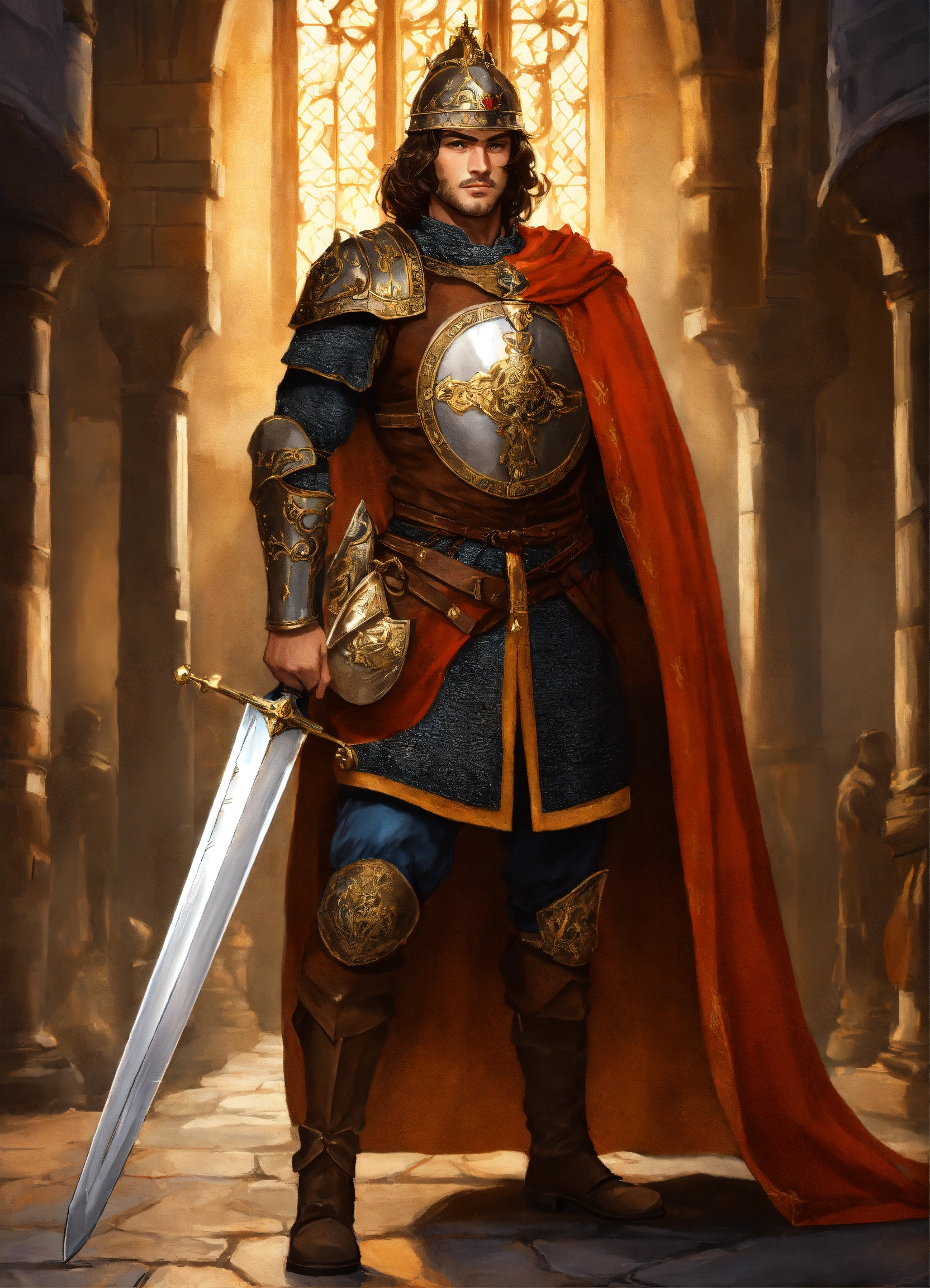Muscular heavy-set prince in medieval fancy clothes under a decoreated breastplate holding a longsword and a helmet