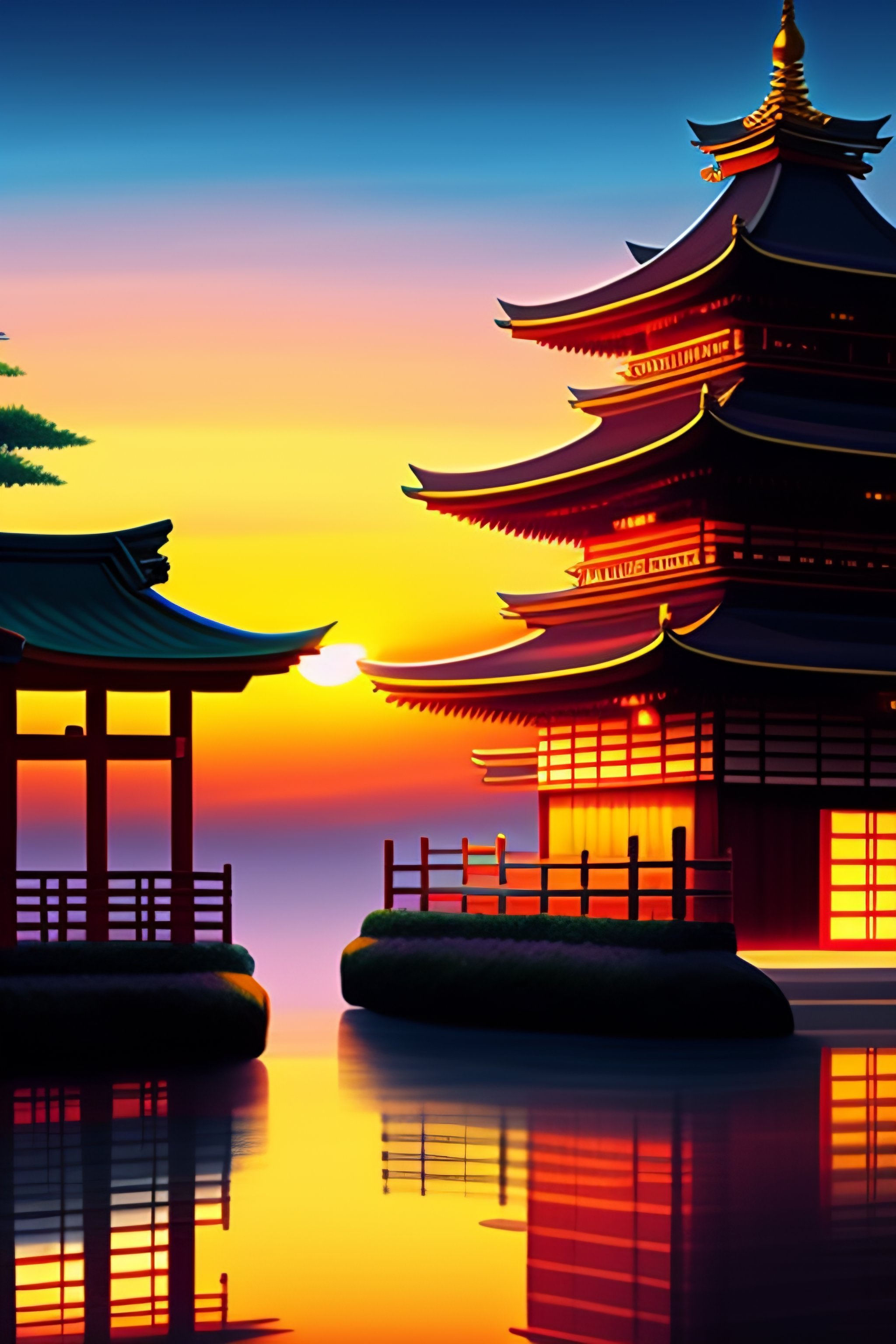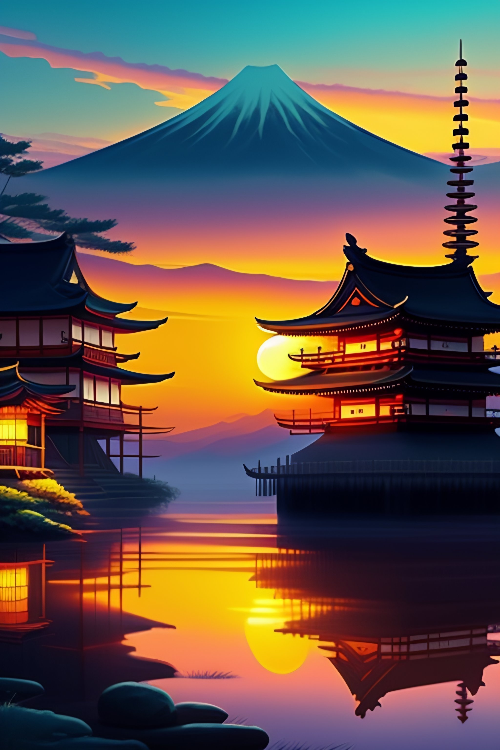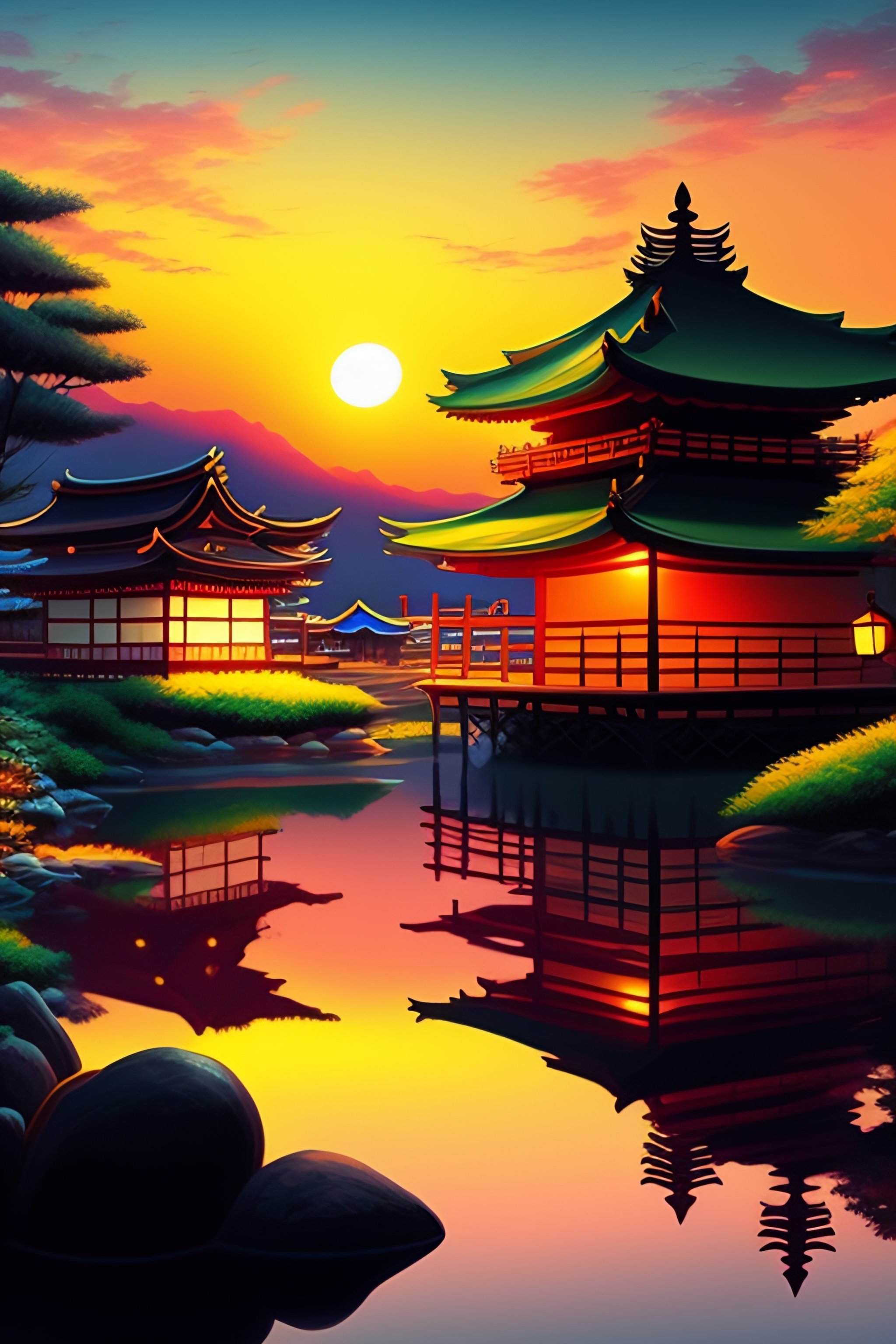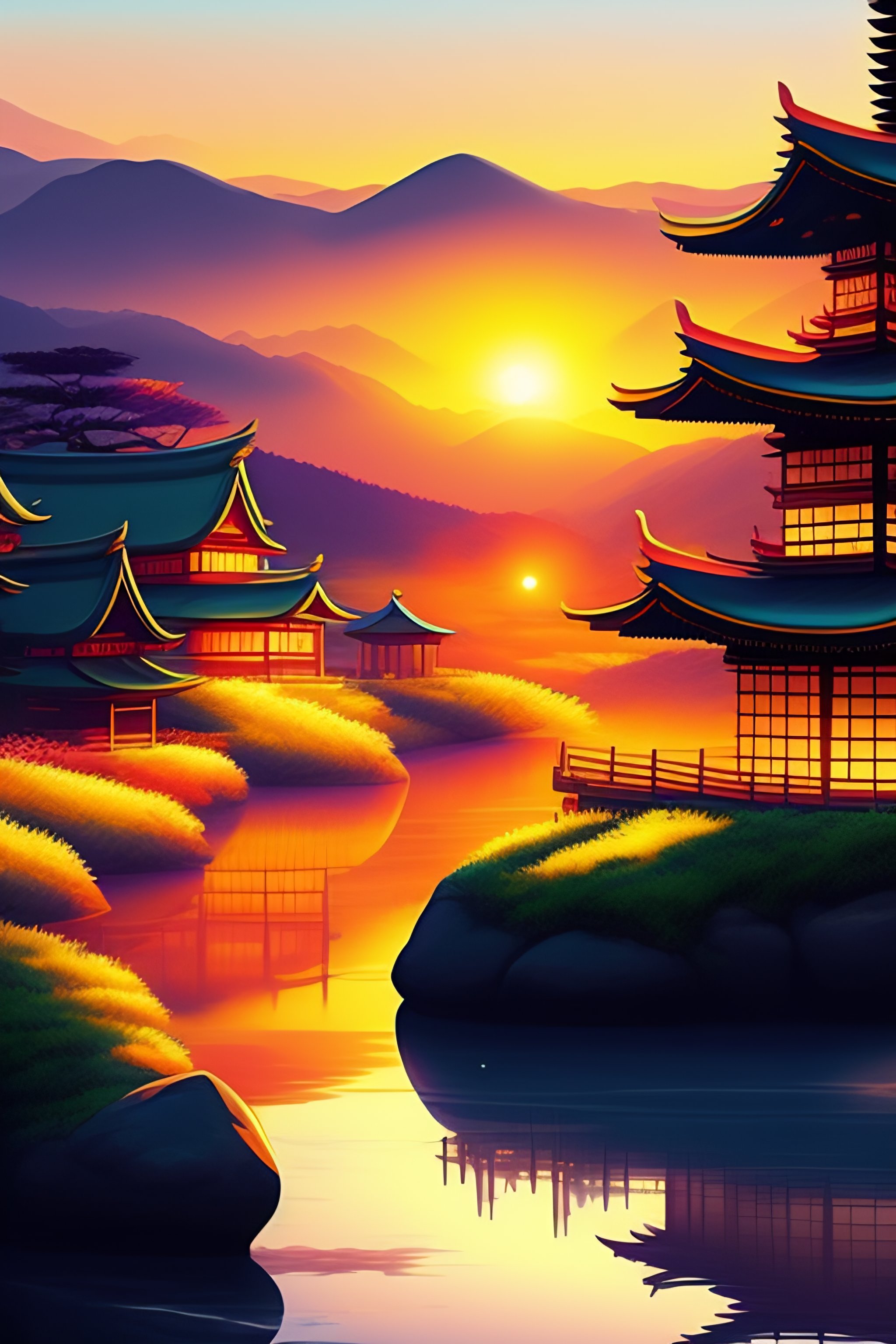 Anime japanese village art sunset