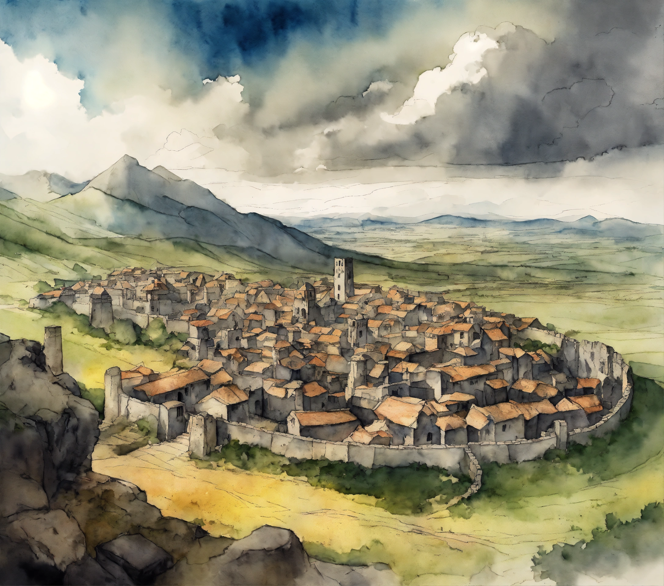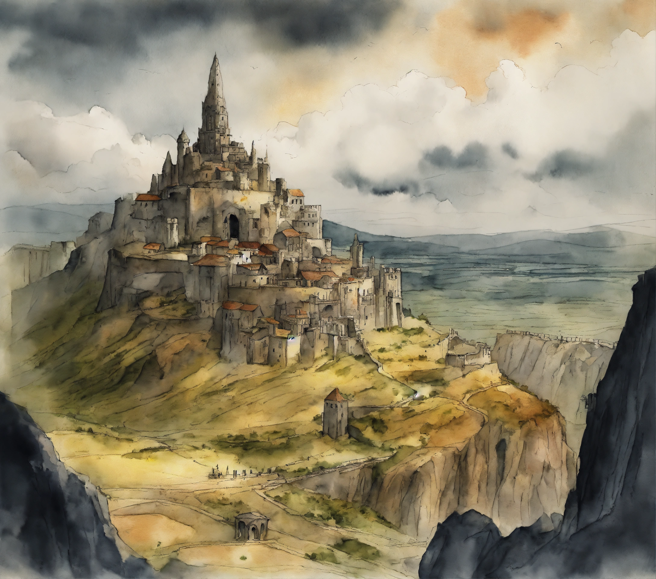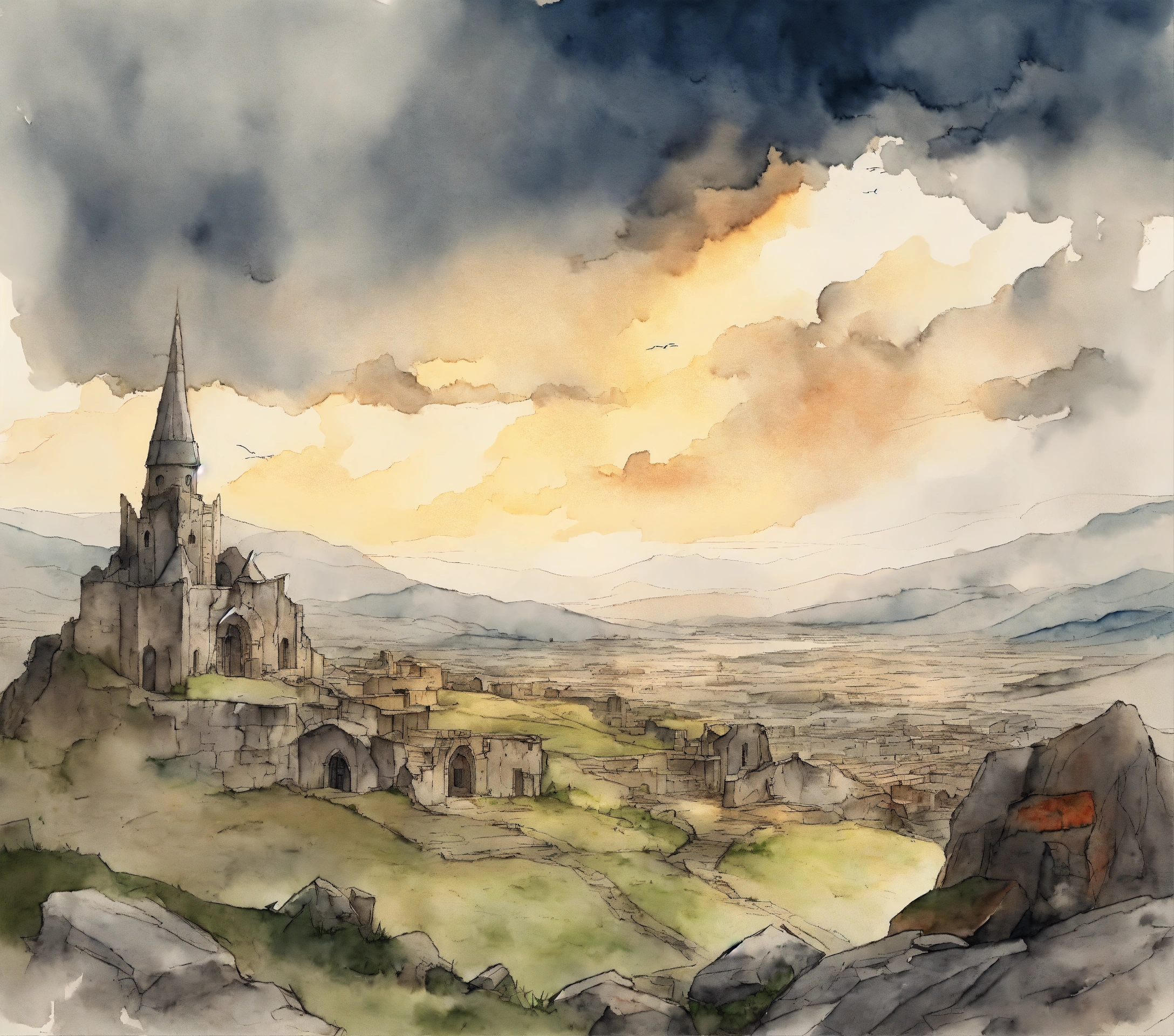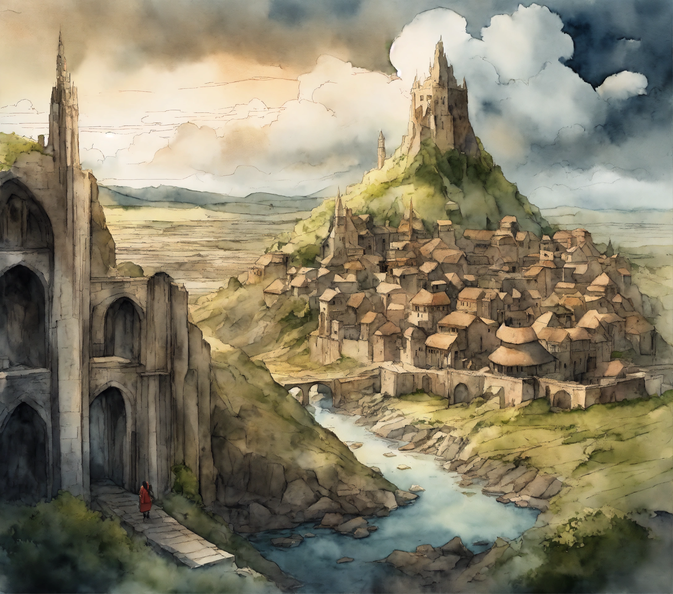 The ruined city of tharbad from lotr in vagabond manga drawing art style, watercolor, with grey clouds the background
