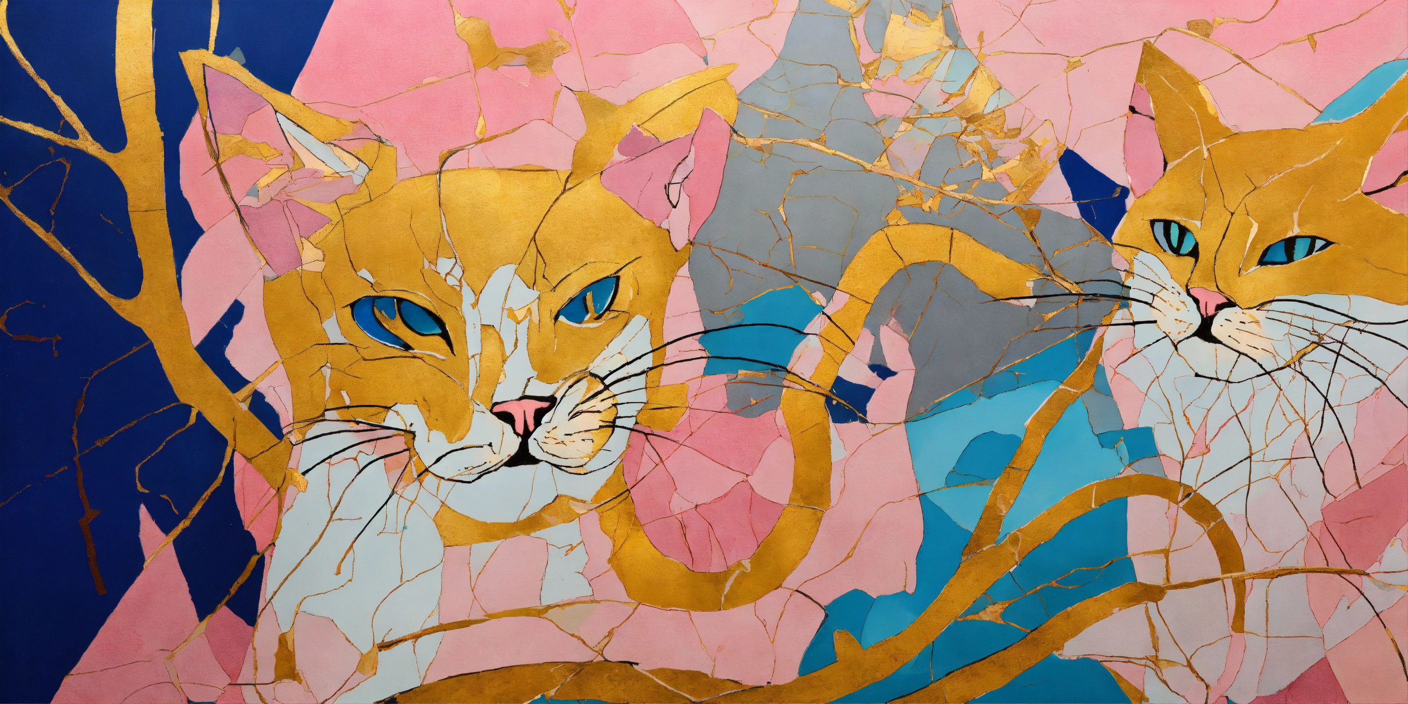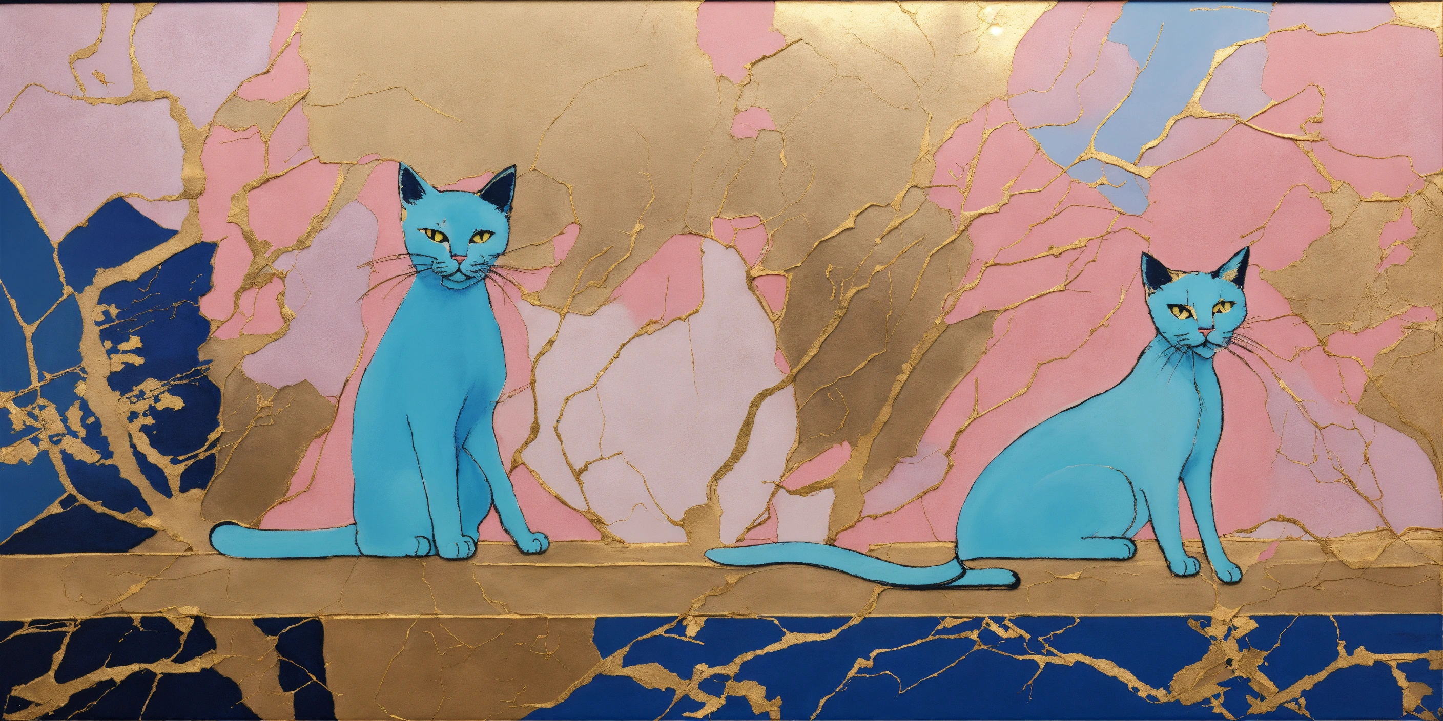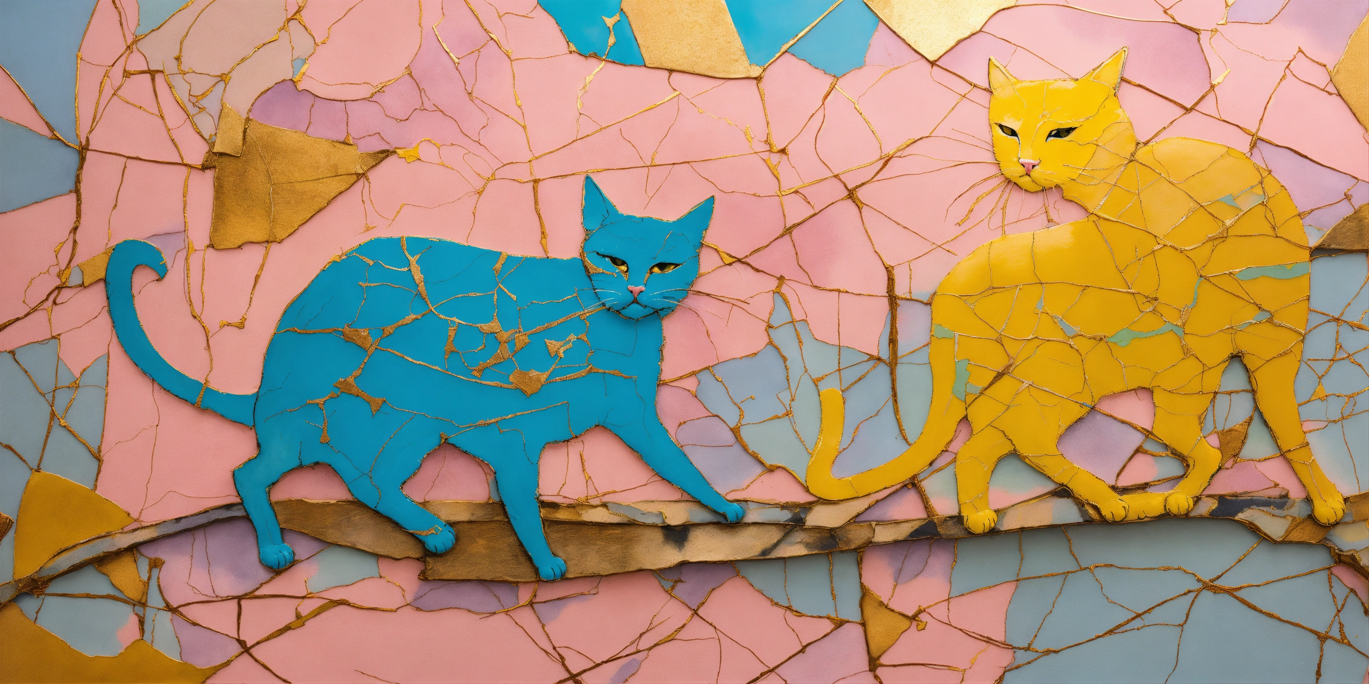 Kintsugi art with neo expressionism using pastel colors only and ink cats