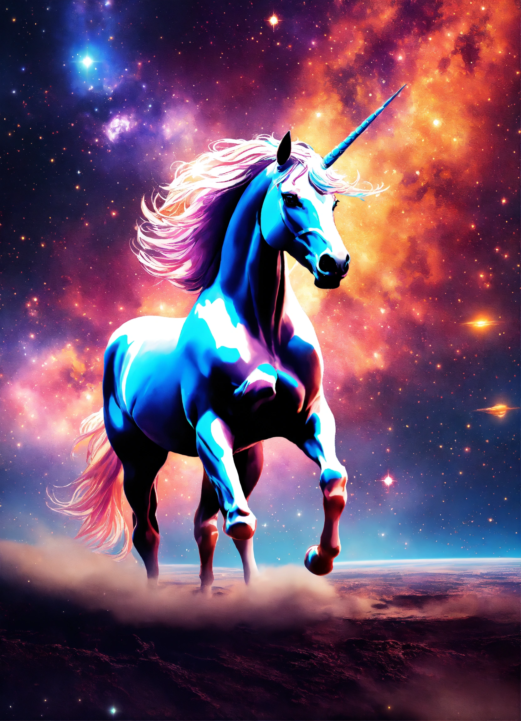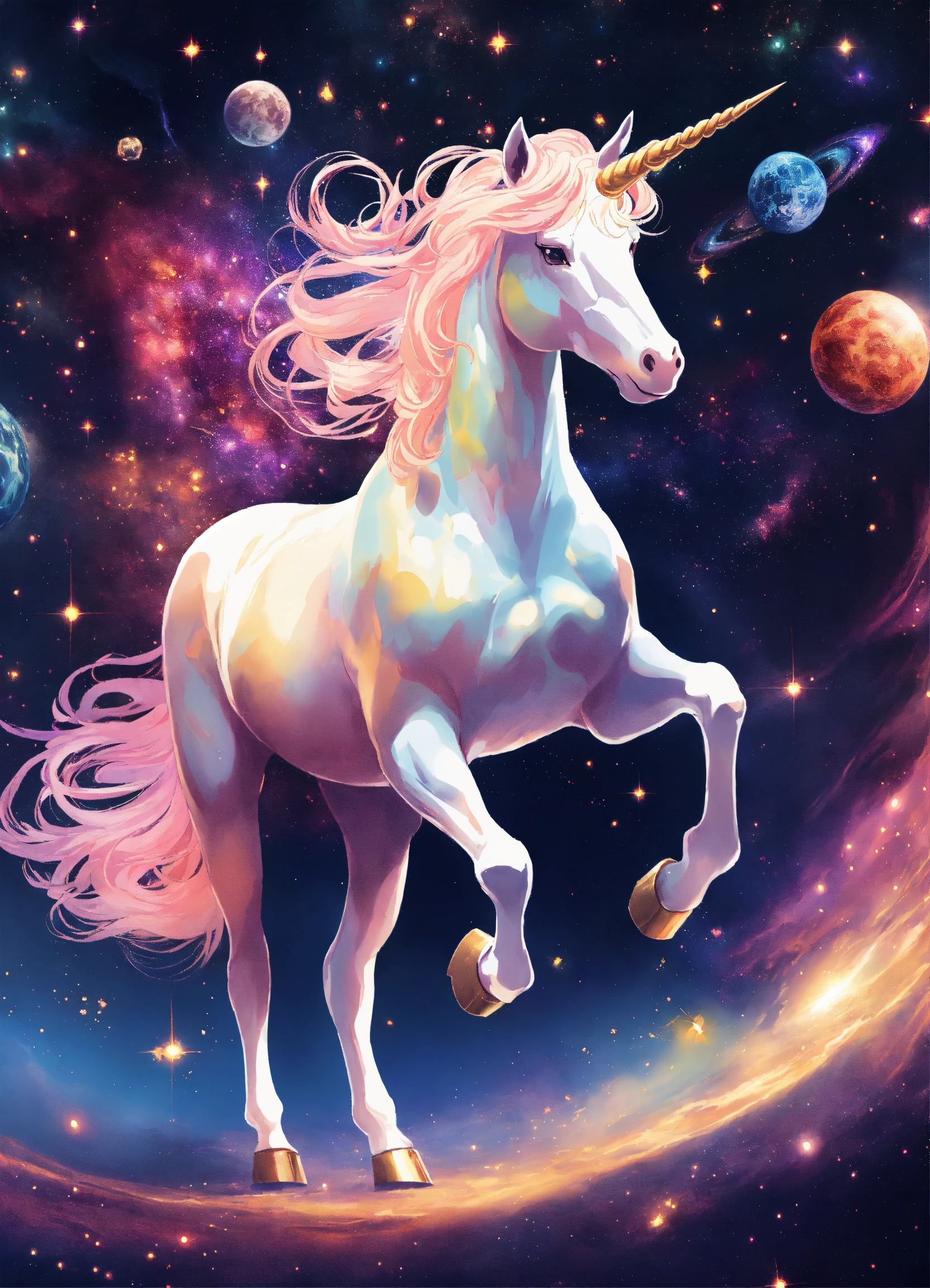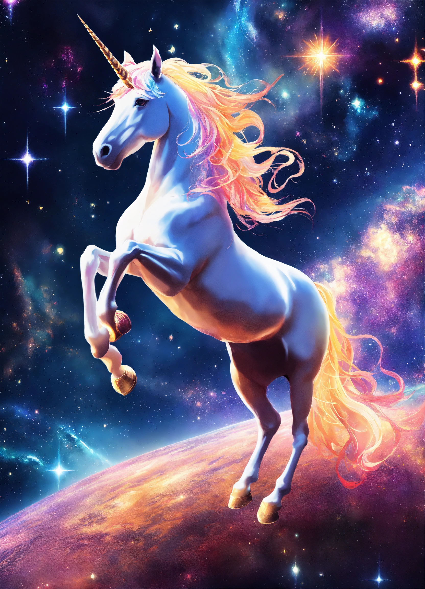 Embark on a cosmic journey with this extraordinary wallpaper. a unicorn with radiant, starry patterns embarks on an interstellar adventure, surrounded by swirling galaxies and nebulae. it's a breathtaking blend of fantasy and science.