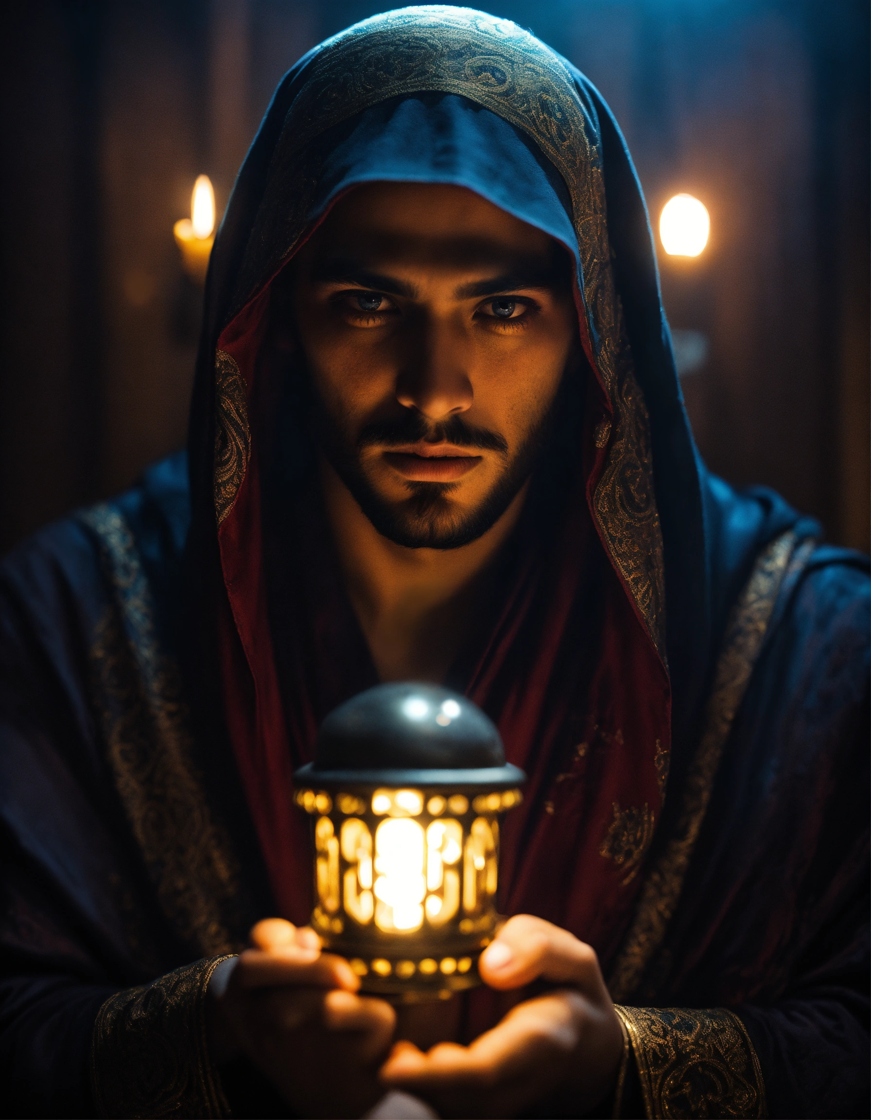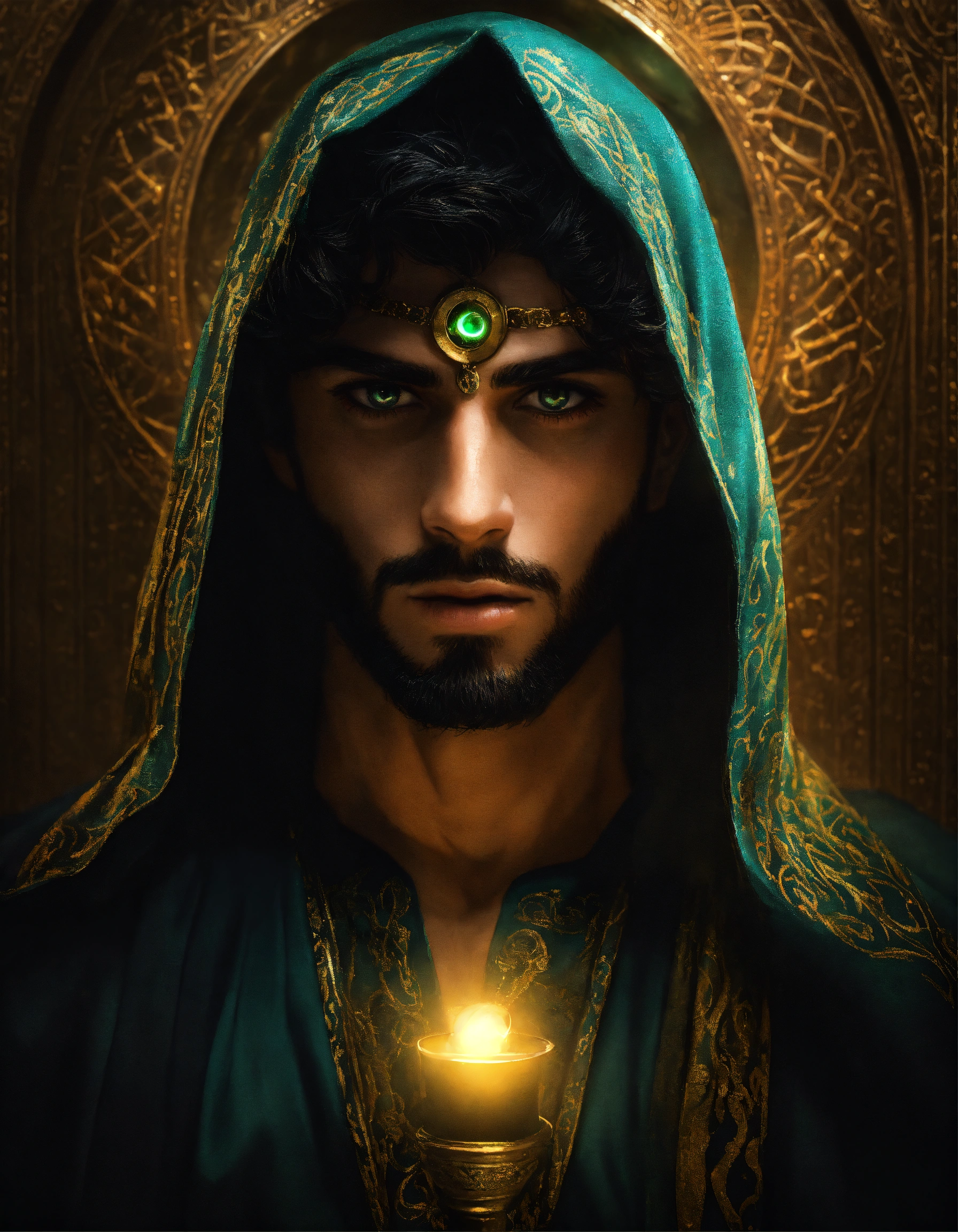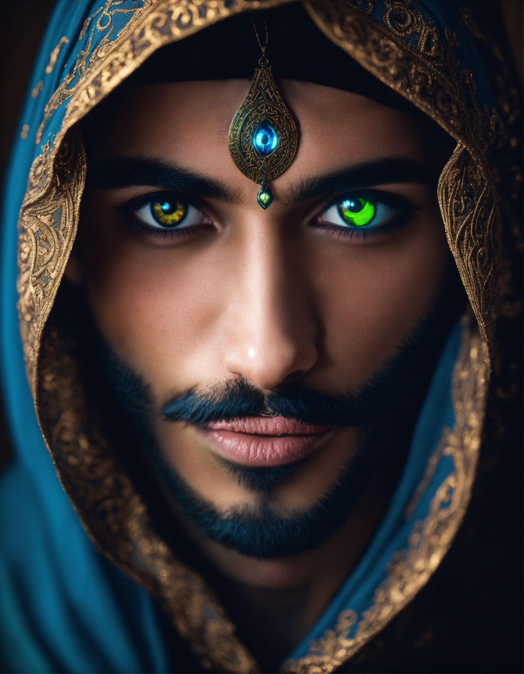 Dramatic headshot of a young handsome wicked arabic sorcerer with glowing hypnotic eyes, mysterious, enigmatic