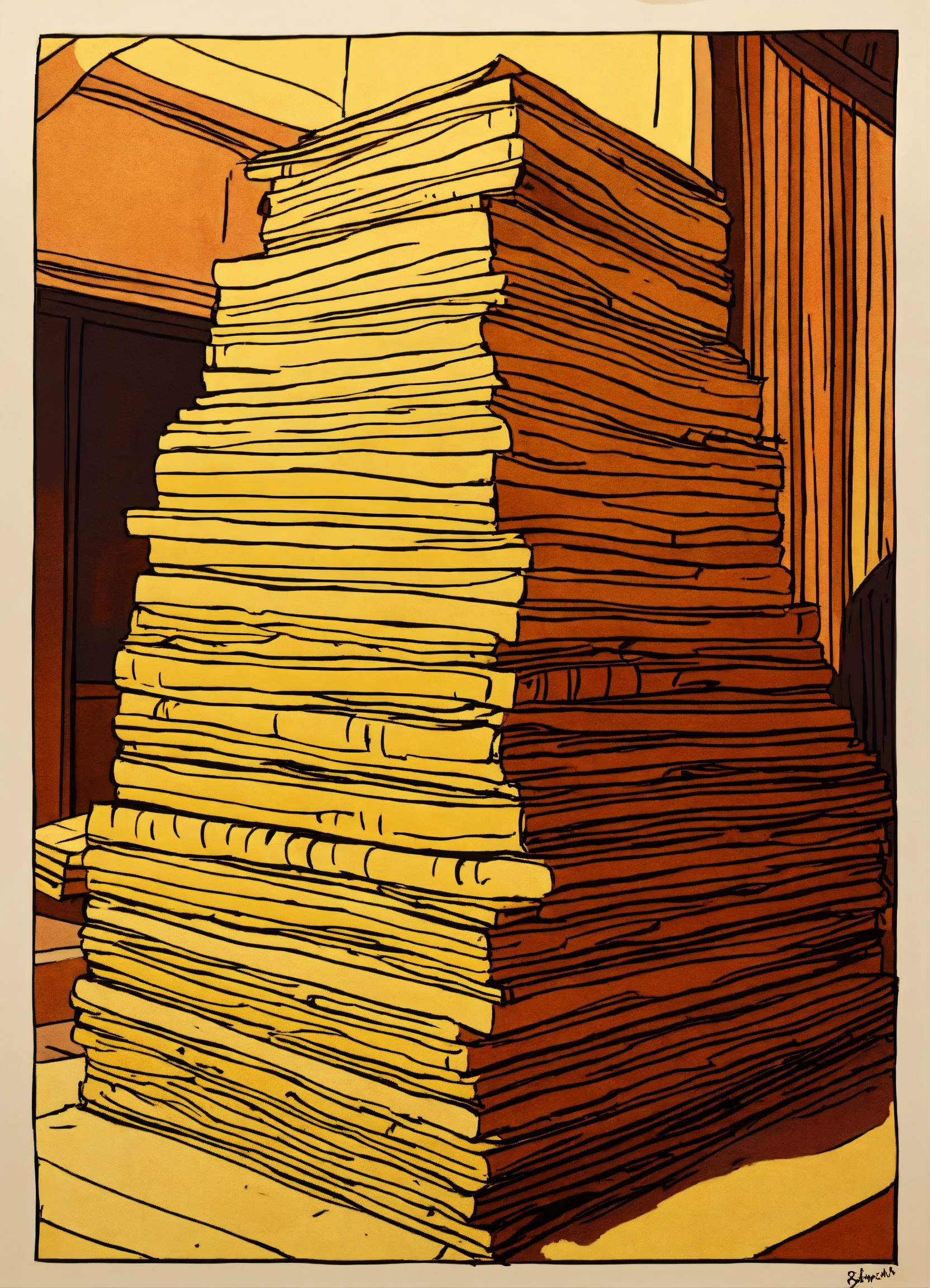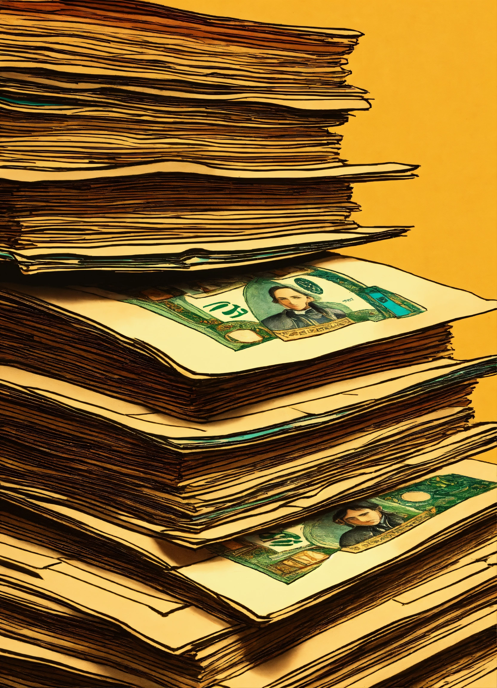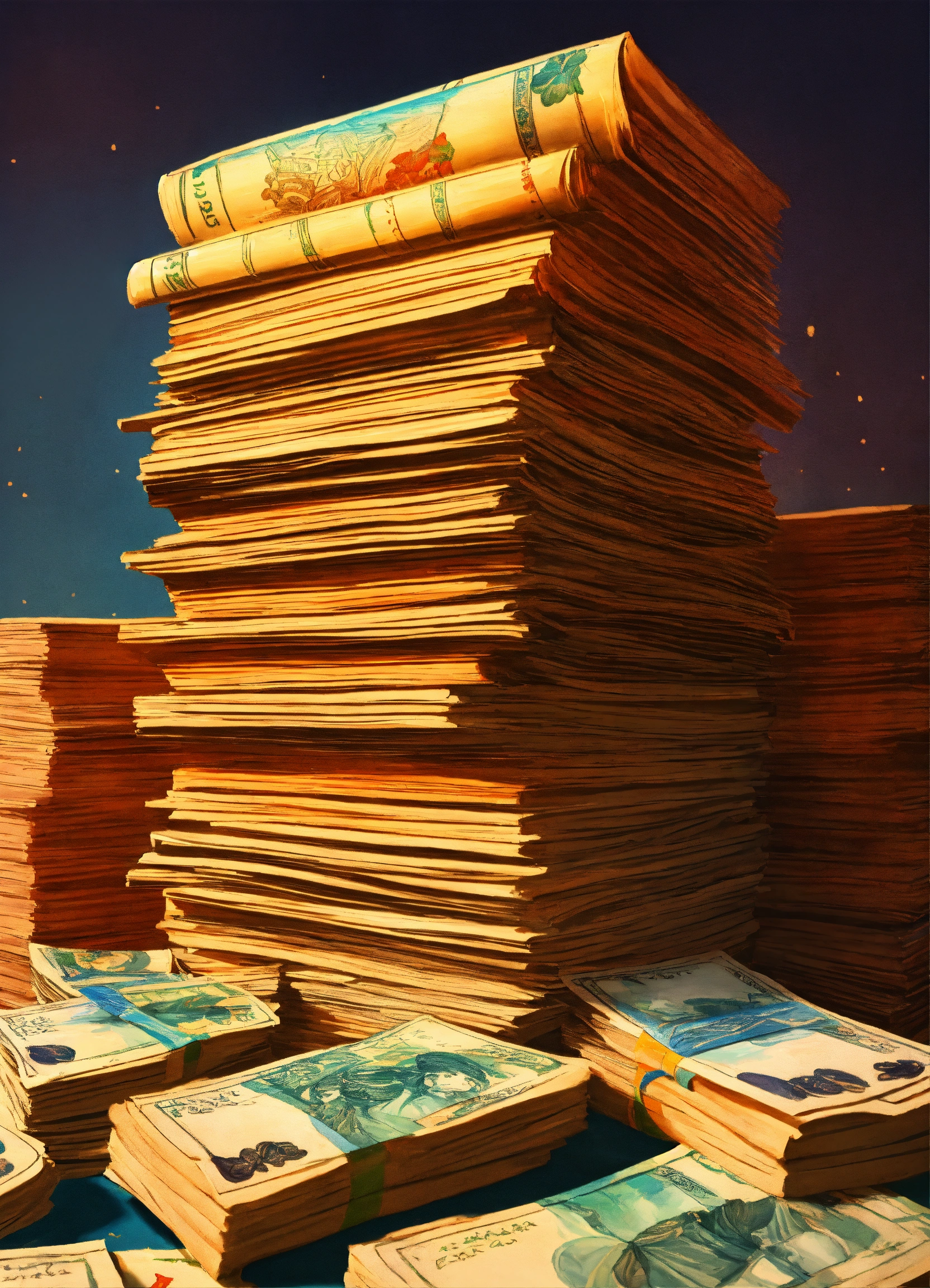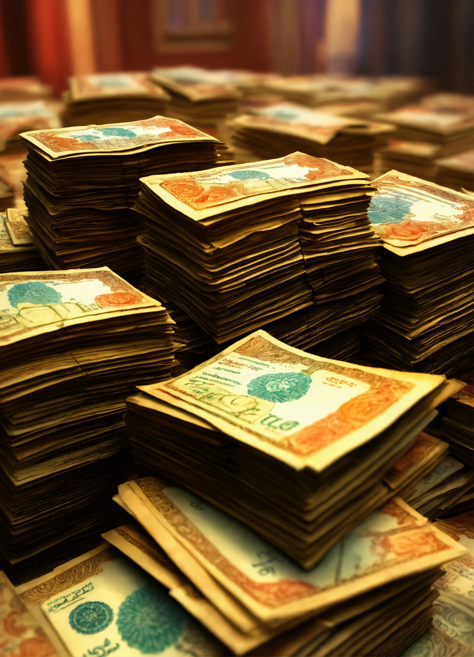 A hand drawn painting of many stacks of indian notes stacked on a royal table, 8k, sharp, detailed, vibrant, vivid