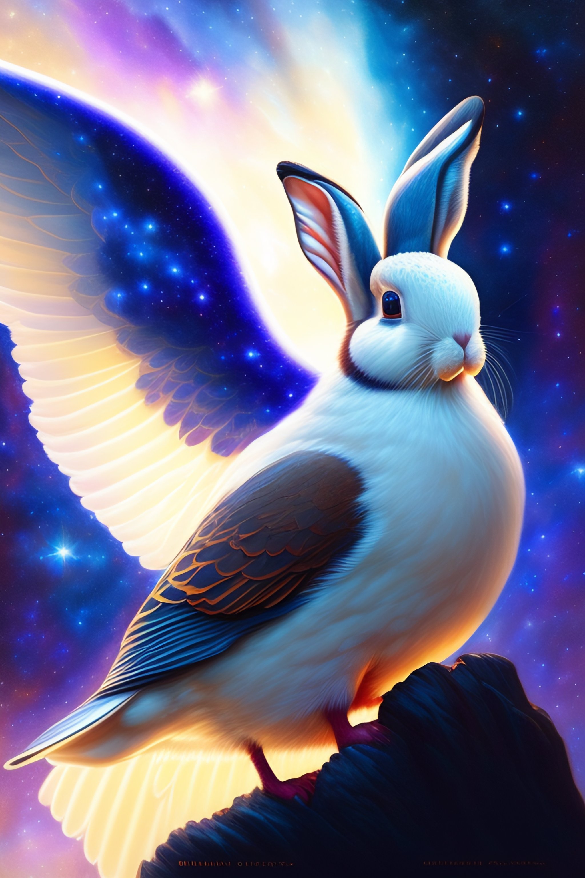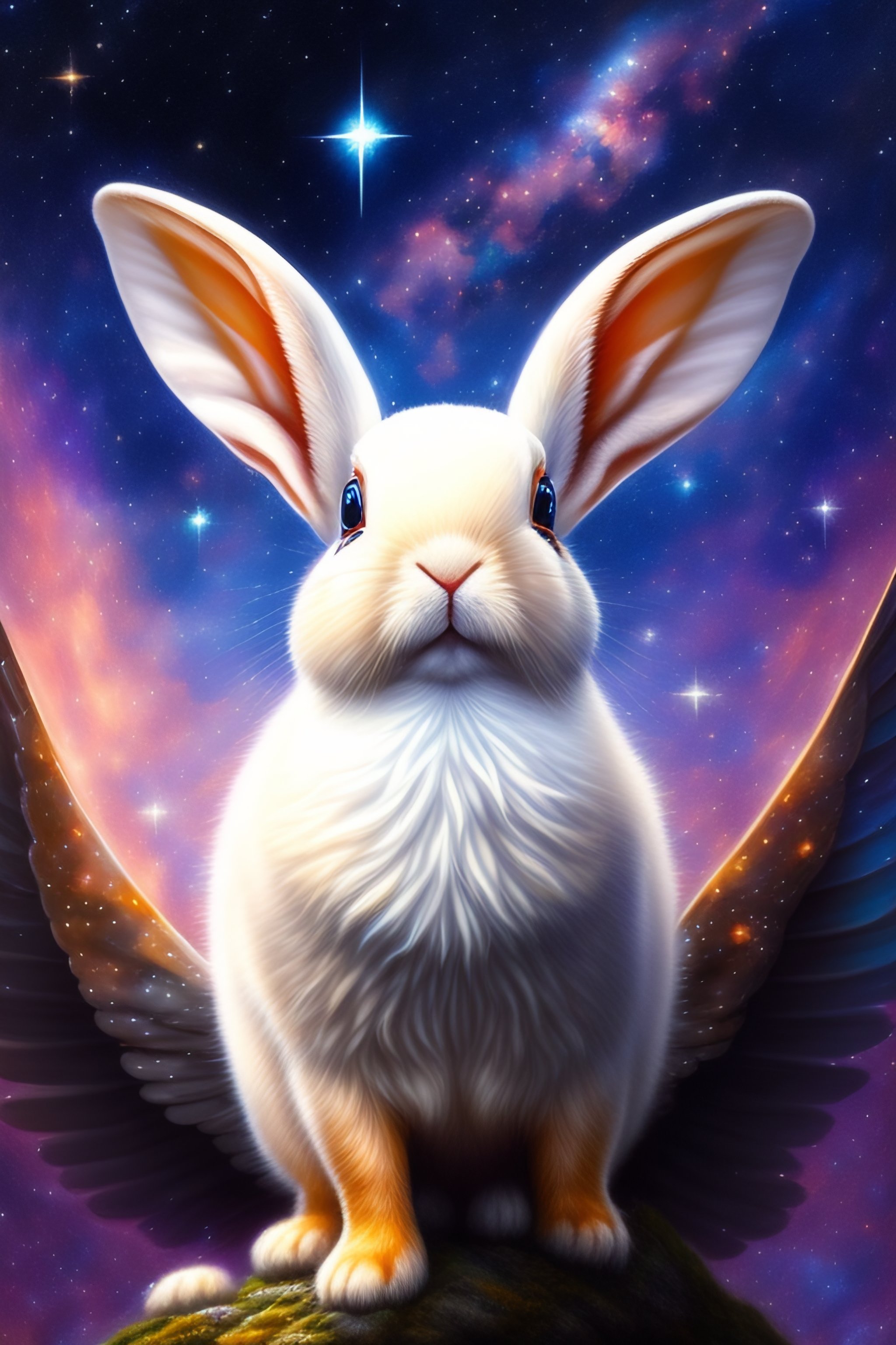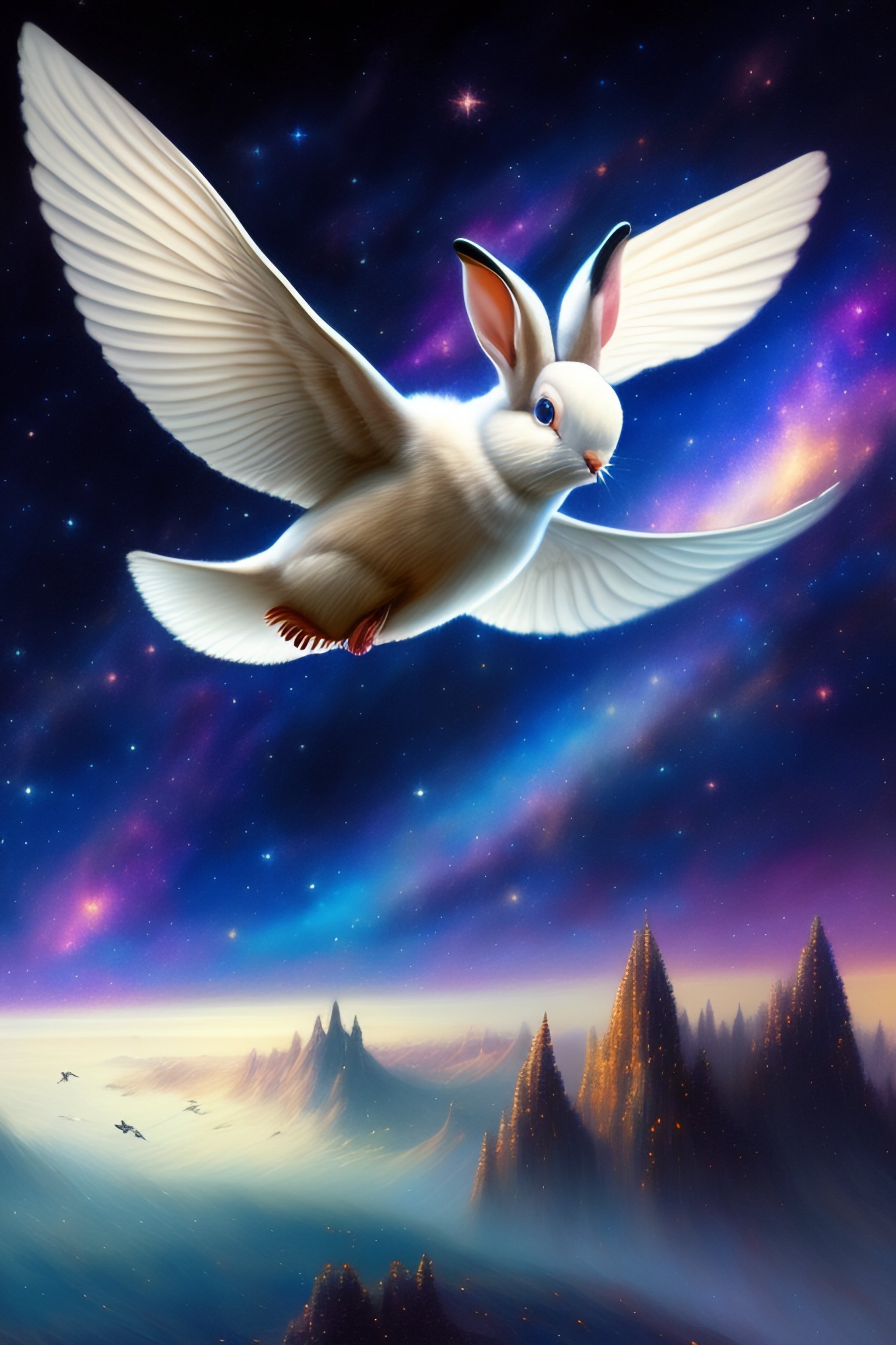 Https://lexica.art/prompt/c57faafd-37d8-4f63-9f86-51ae7f0c9c5ebrown https://www.birdspot.co.uk/wp-content/uploads/2022/06/white-dove.jpg https://www.innovationnewsnetwork.com/wp-content/uploads/2021/02/primordial-galaxy-696x392.jpg flying dwarf bunny rabbit with wings white nose holding stars in paws as a fantasy art by donato giancola and james gurney, digital art, trending on artstation, forest background, galaxy sky