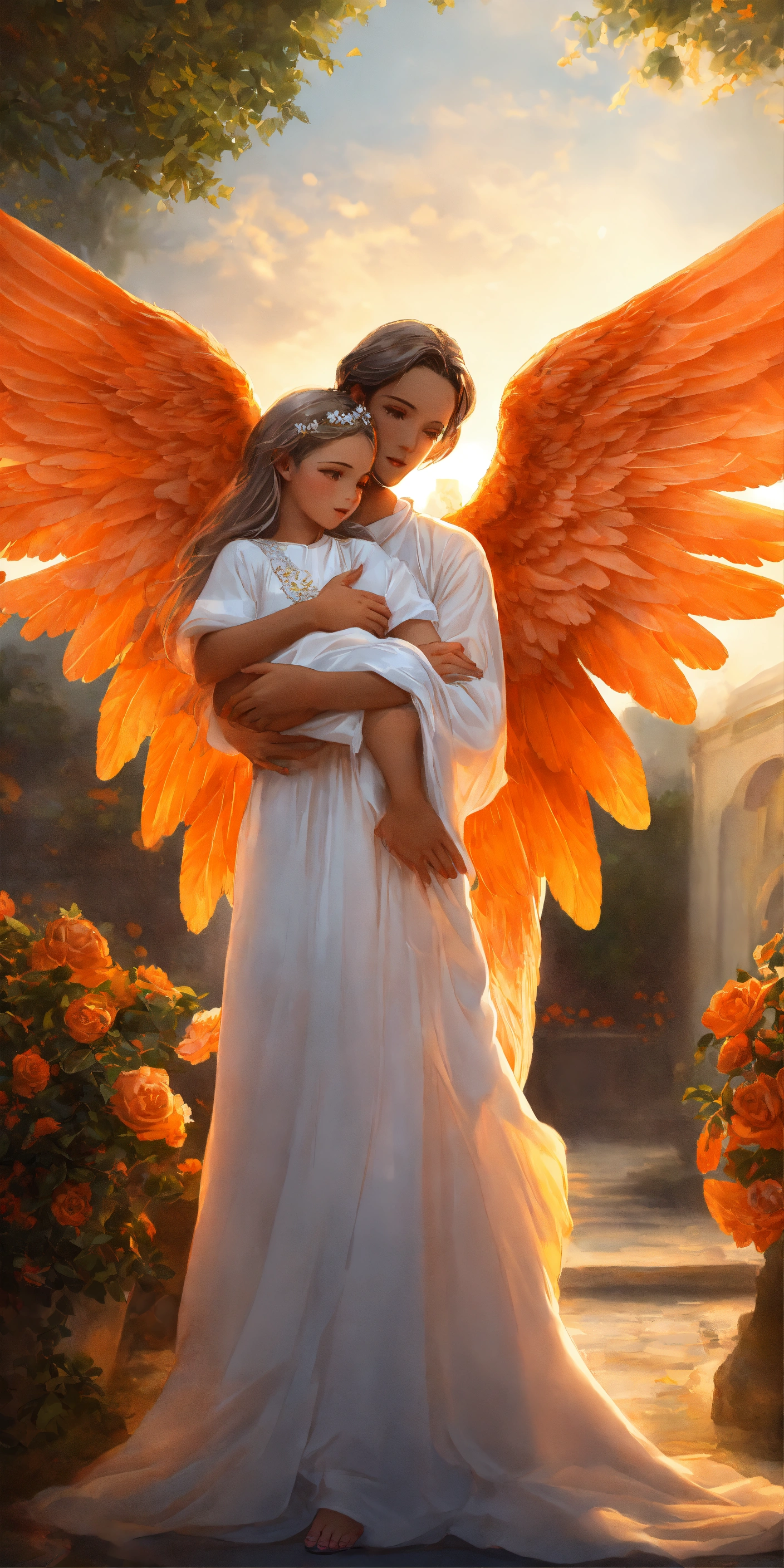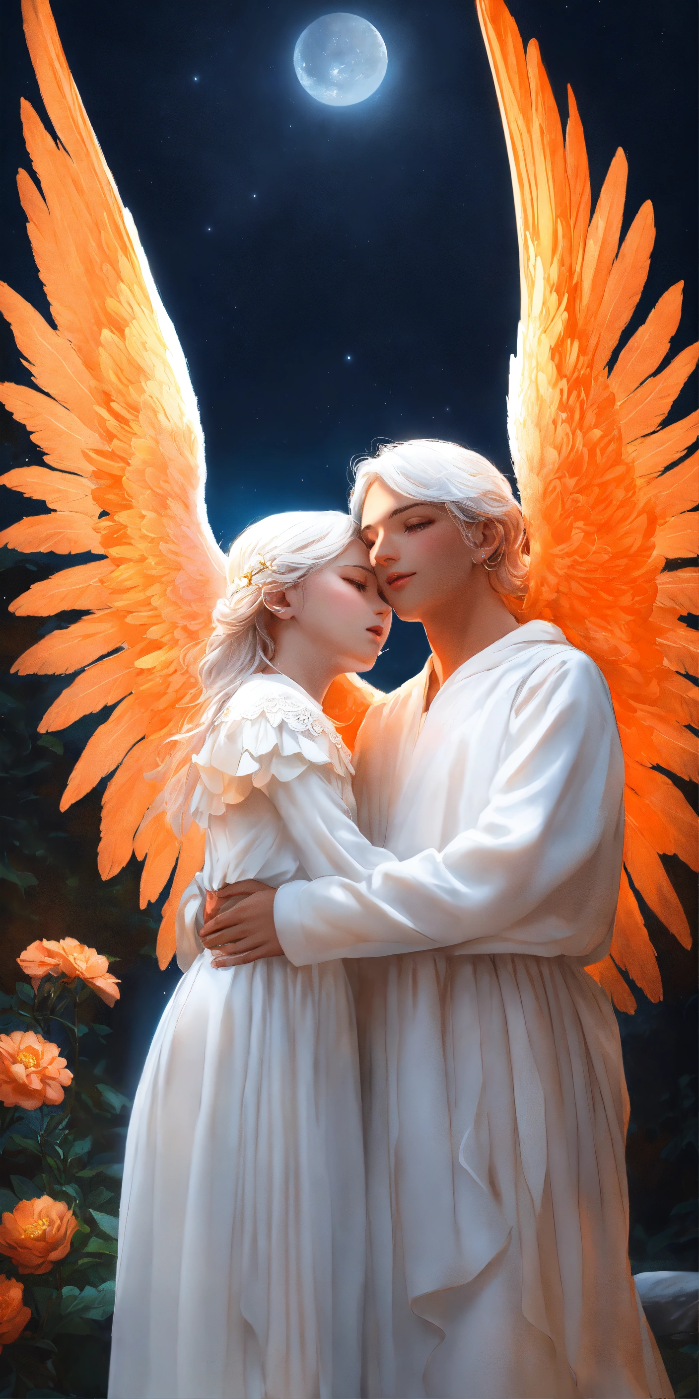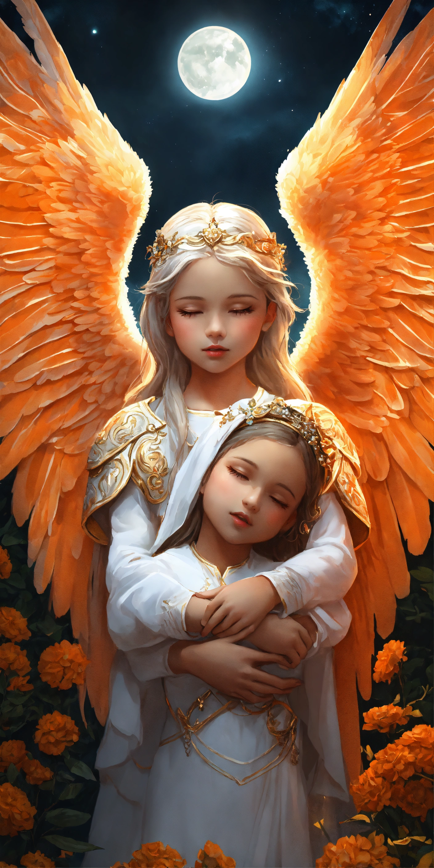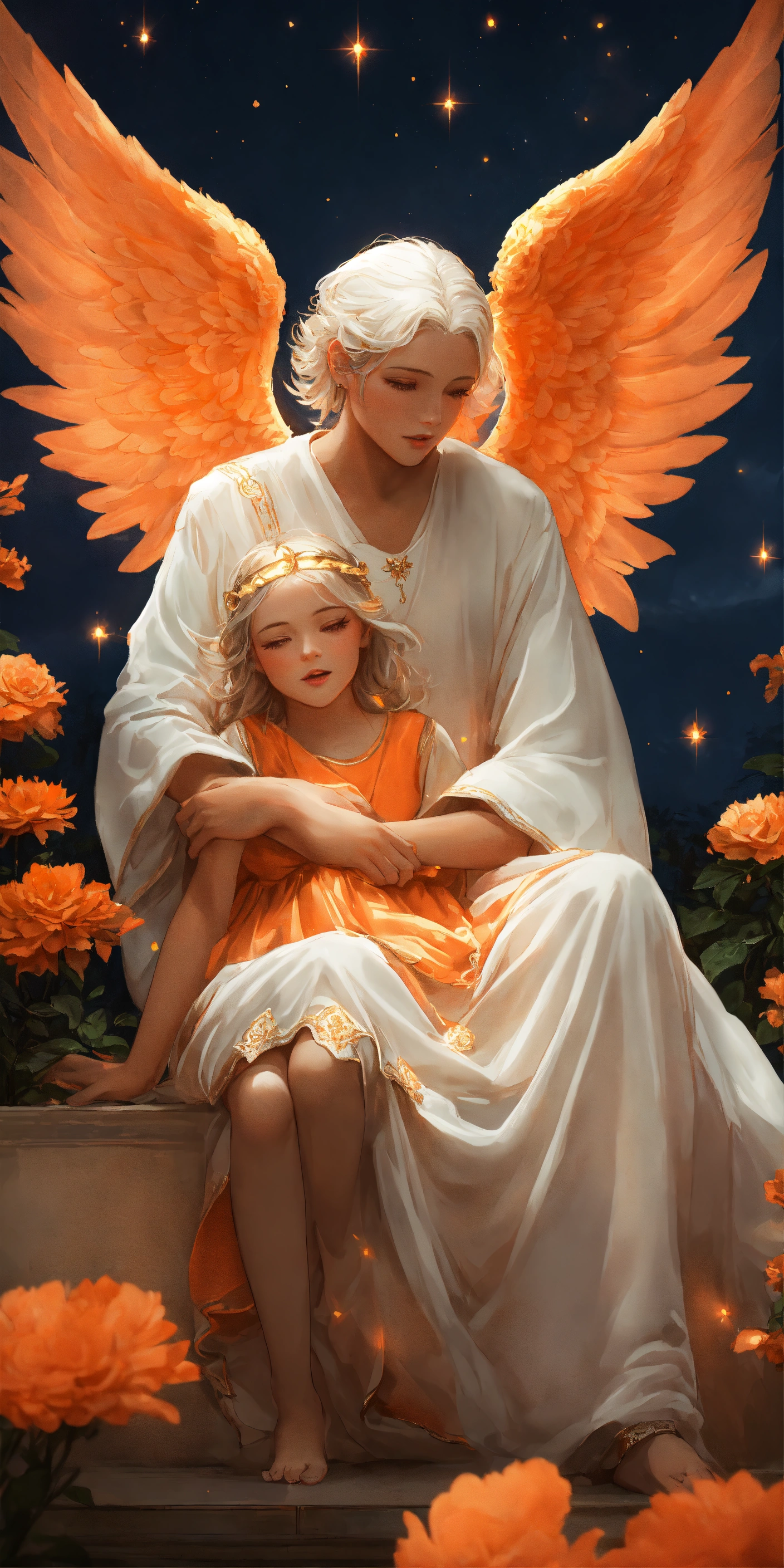 2 guardian angels, one is a boy and the other angel is a 7-year-old girl with detailed and luminous orange angel wings. 1 30-year-old male angel hugging a 7-year-old girl angel. the two male and female angels have large, uniform luminous orange wings. their faces beautiful and detailed. very clear eyes that open with a deep and penetrating look. detailed and defined white hair. white tunic-type dresses with many orange details. they are in a garden with beautiful orange flowers and detailed with a night sky. hyper-detailed, hyper-realistic illustration. realism. masterpiece. digital art, hd, high quality, high definition. 8k.
