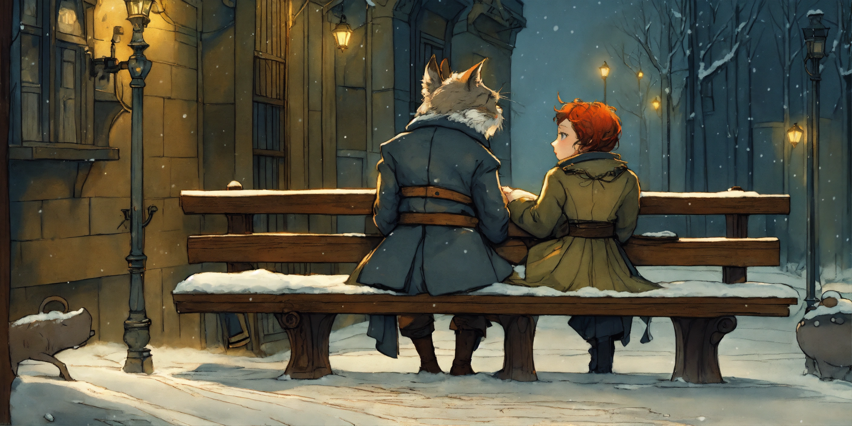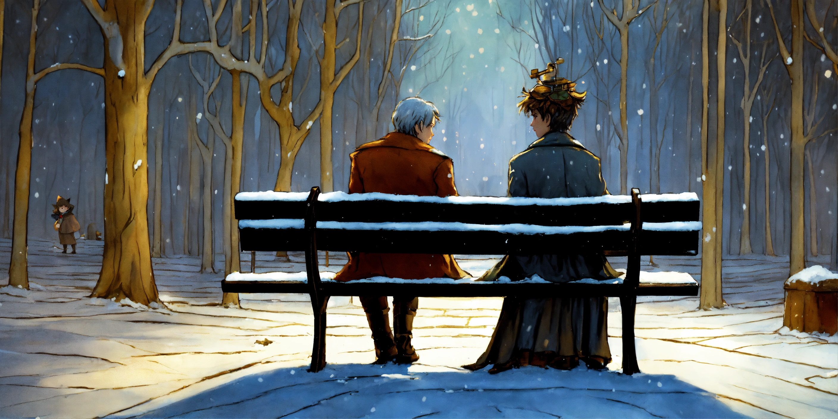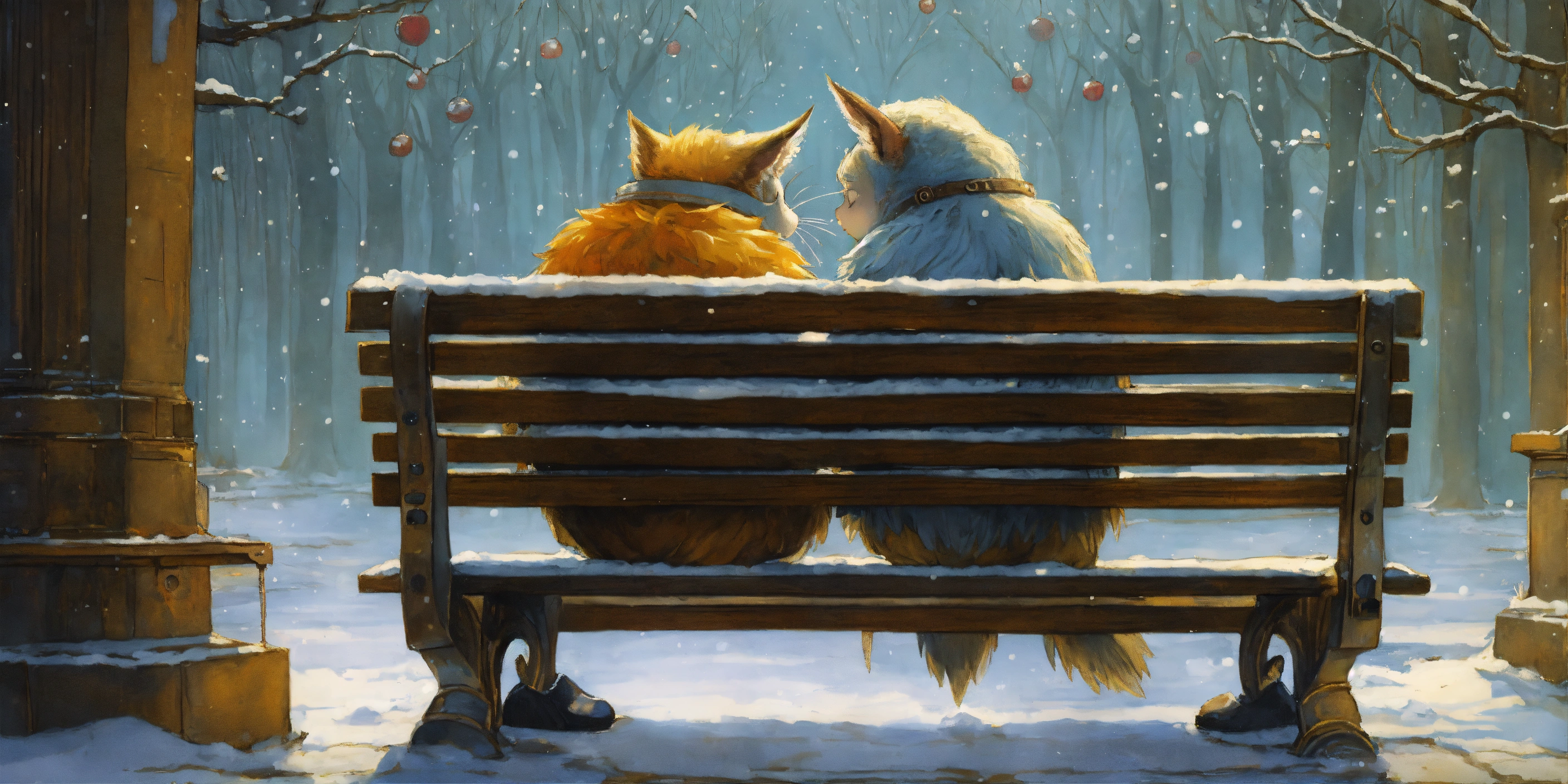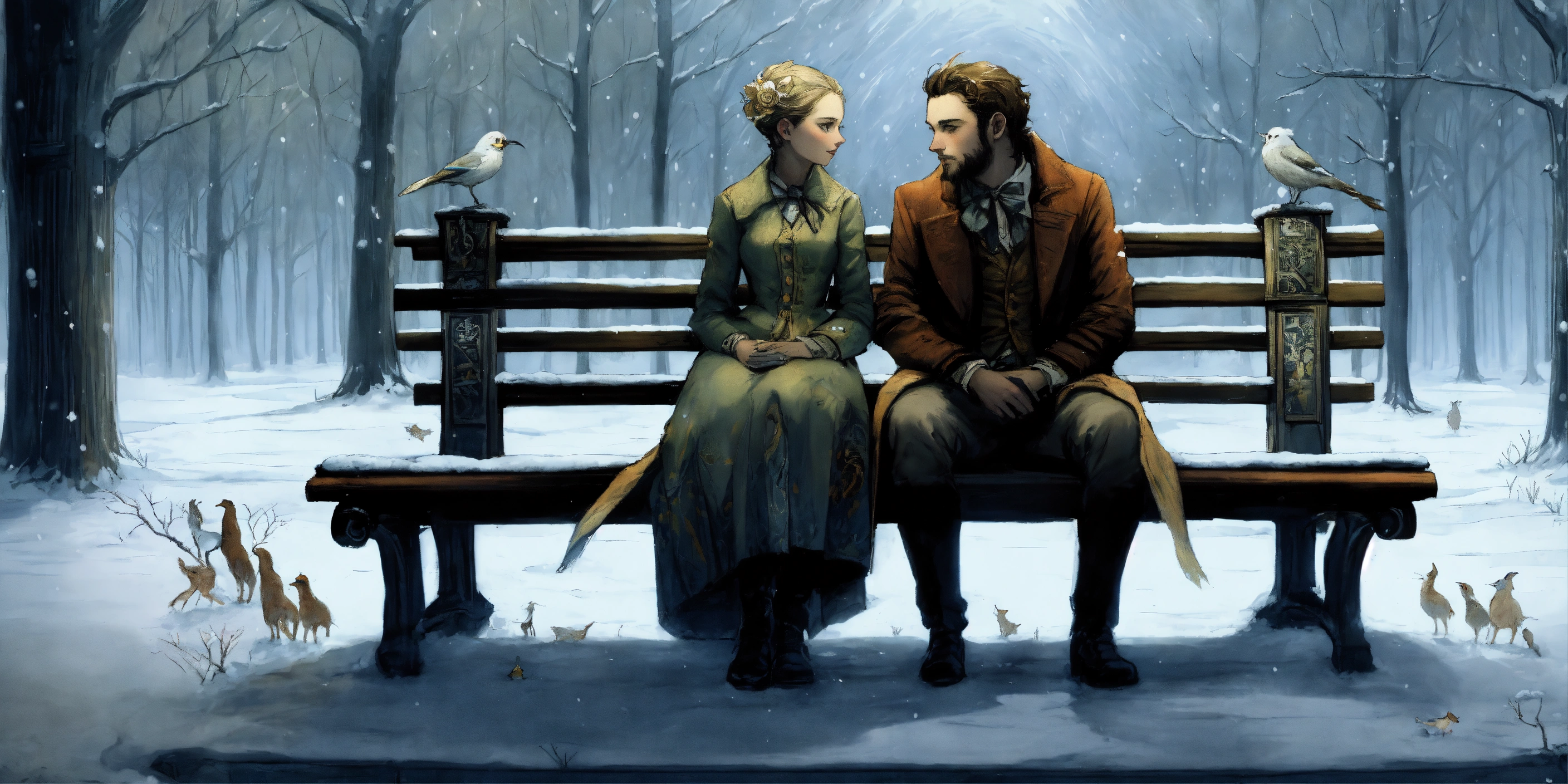 By gris grimly, maurice sendak, romeo and juliet cuddling on a park bench, cuddling, snow, ice, snowing, puddles, in the style of jean-baptiste monge, tim burton, remedios varo, juni ito, giorgio de chirico 8k resolution concept art trending on artstation hyperdetailed medium shot, vignette 8k resolution hyperdetailed intricate liminal eerie precisionism dslr filmic, cinematic, sharp focus, brightly lit.