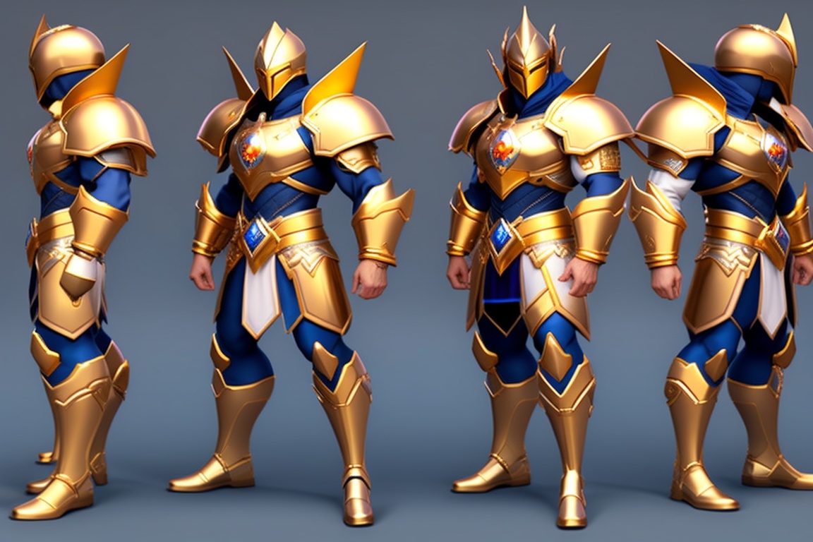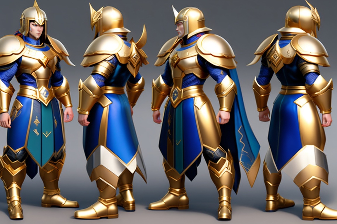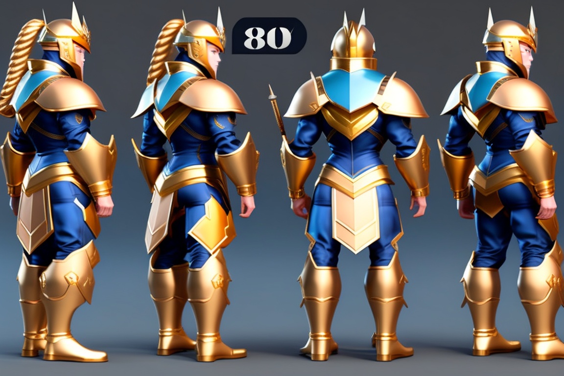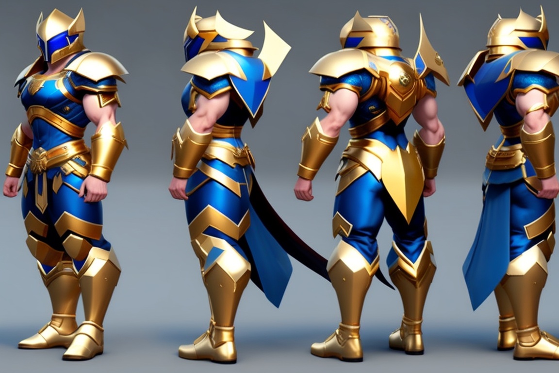 Warrior, gold and blue armor, anime style, reference sheet, full body, atack pose, character model, ultra detailed, 8k