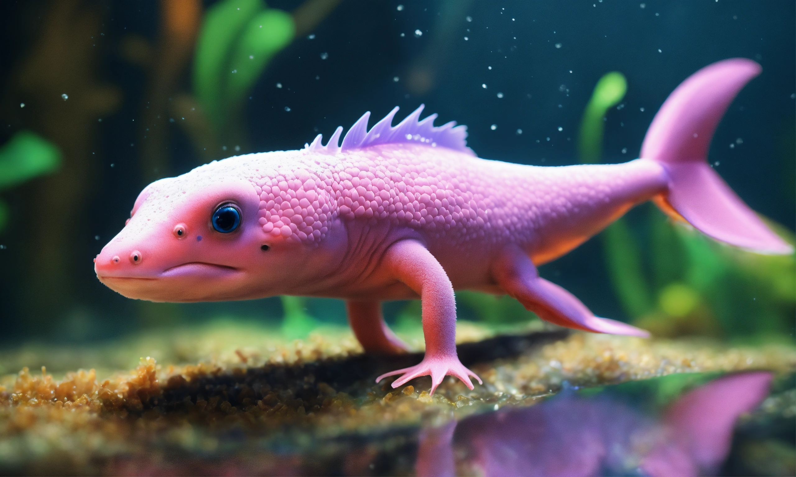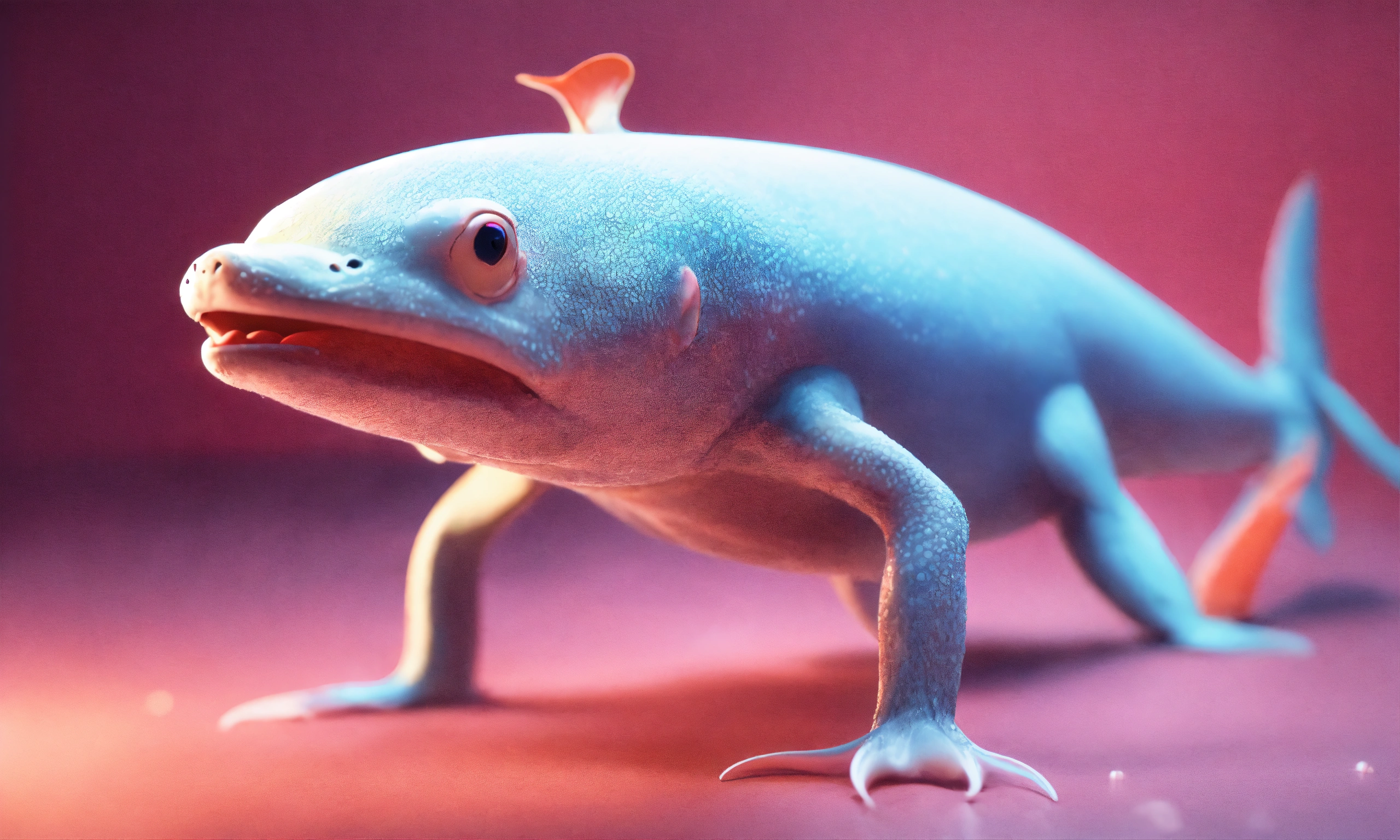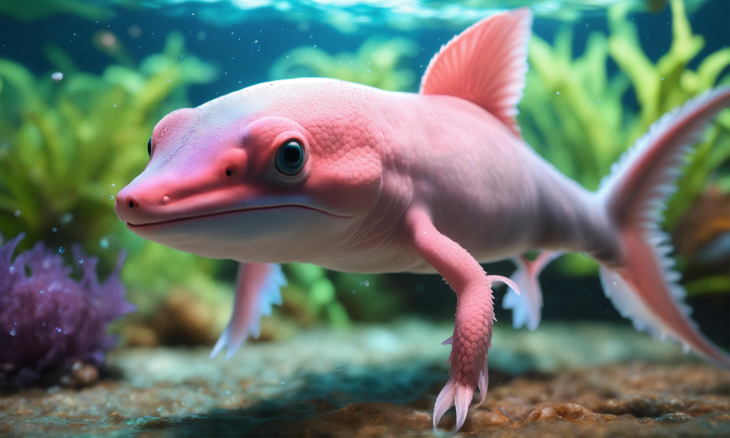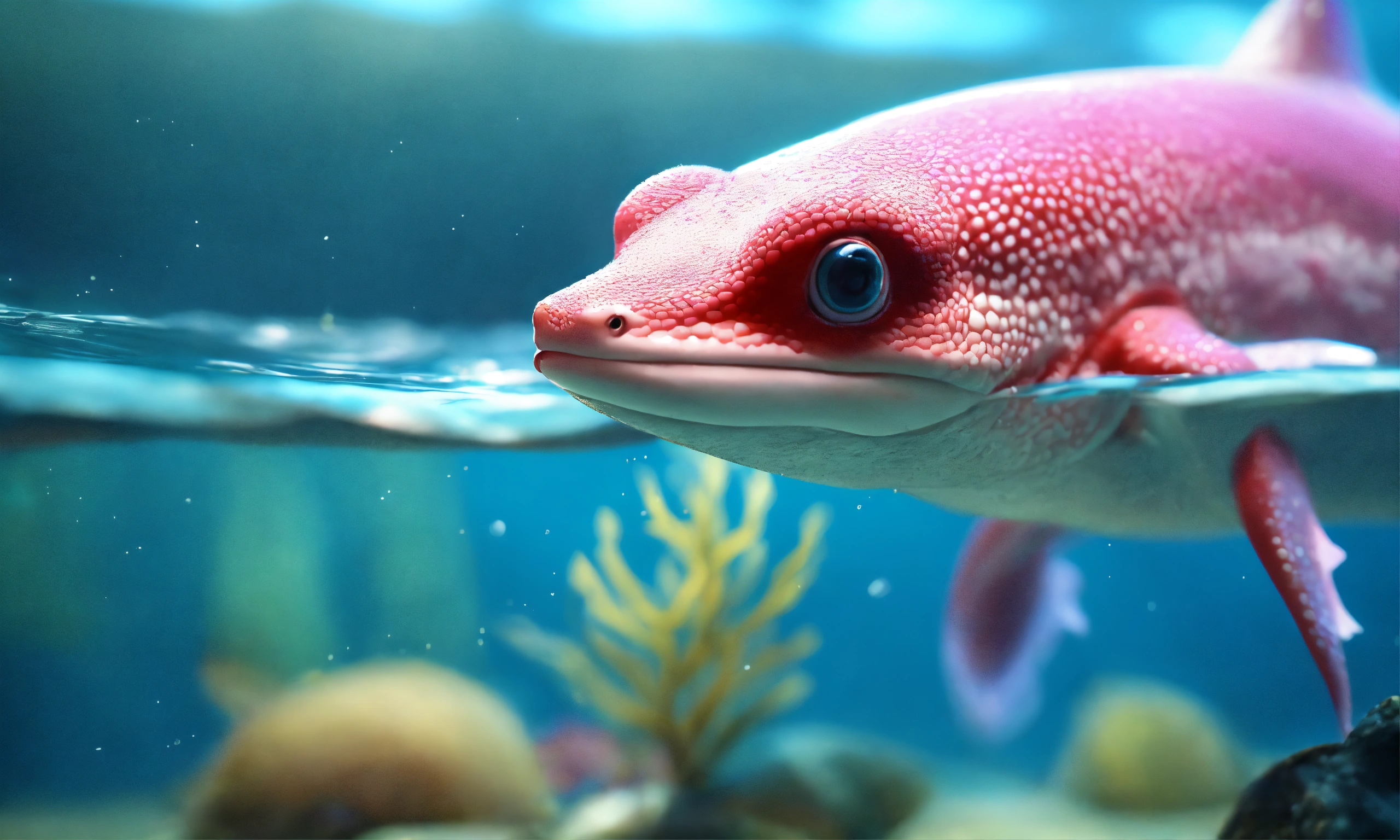 Very cute axolotl hybrid with a dolphin. 3d render, very smooth, very dramatic light, 8 k, shallow depth or field, full body, anatomically correct, professional art, beautiful eyes, high detailed.