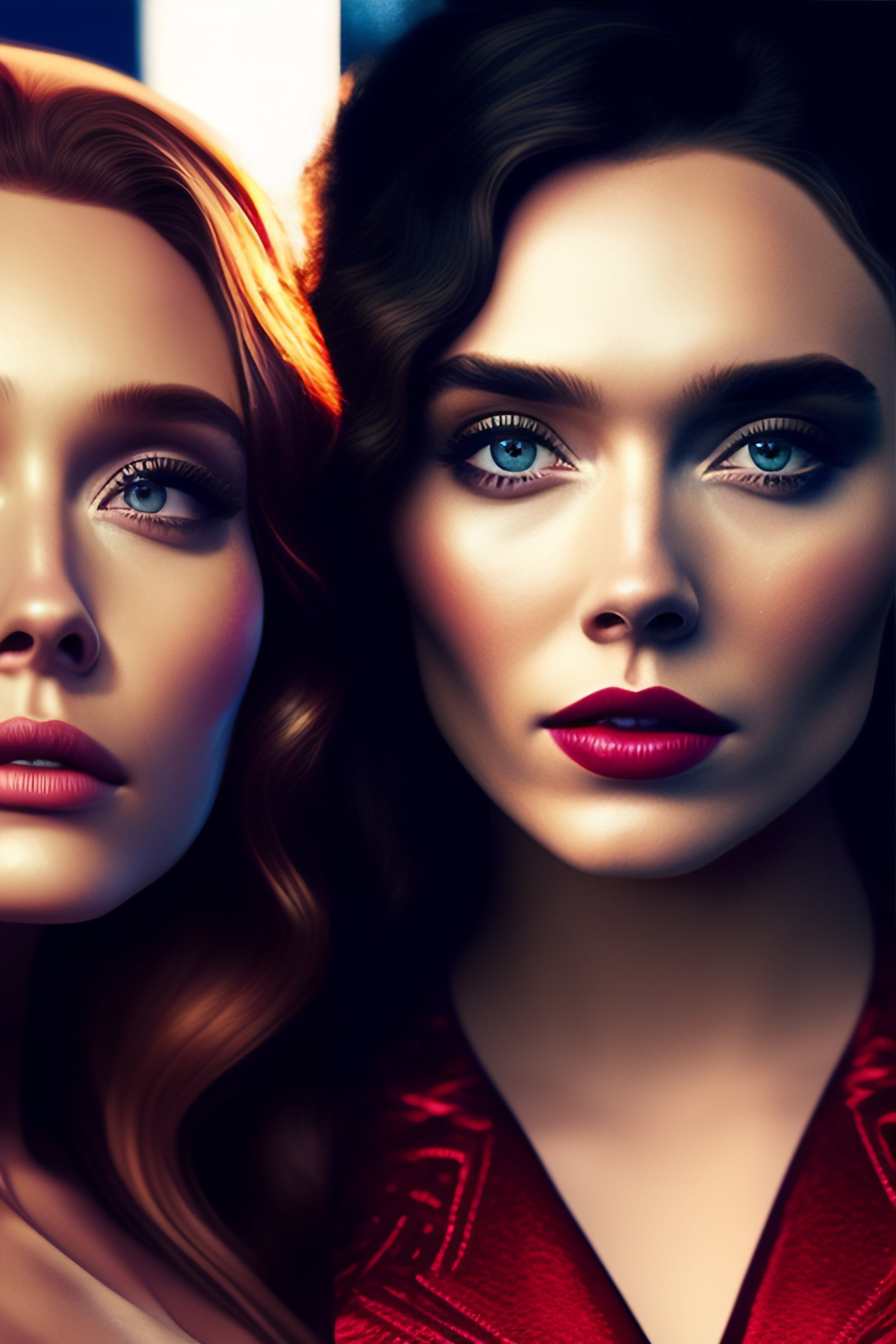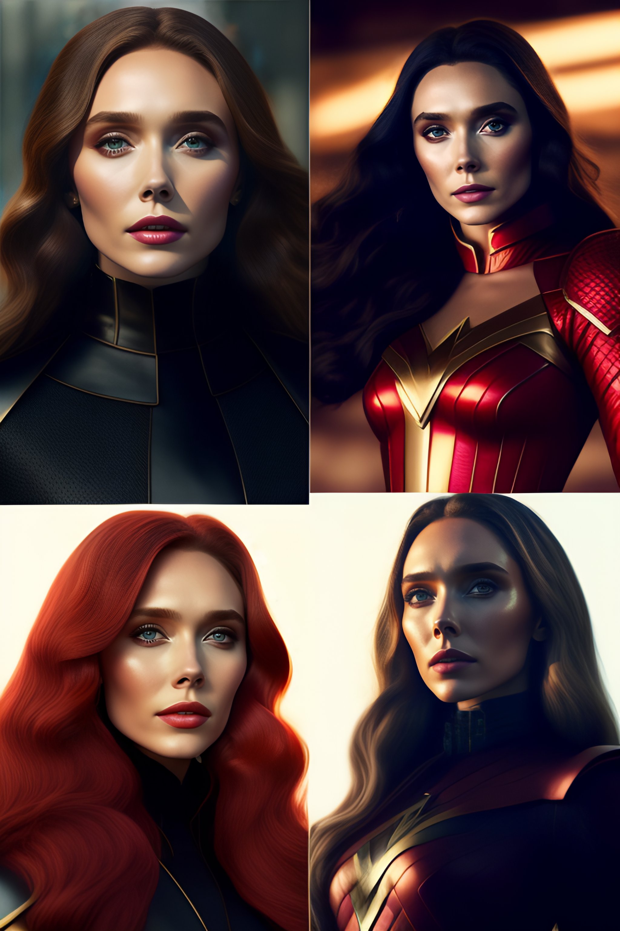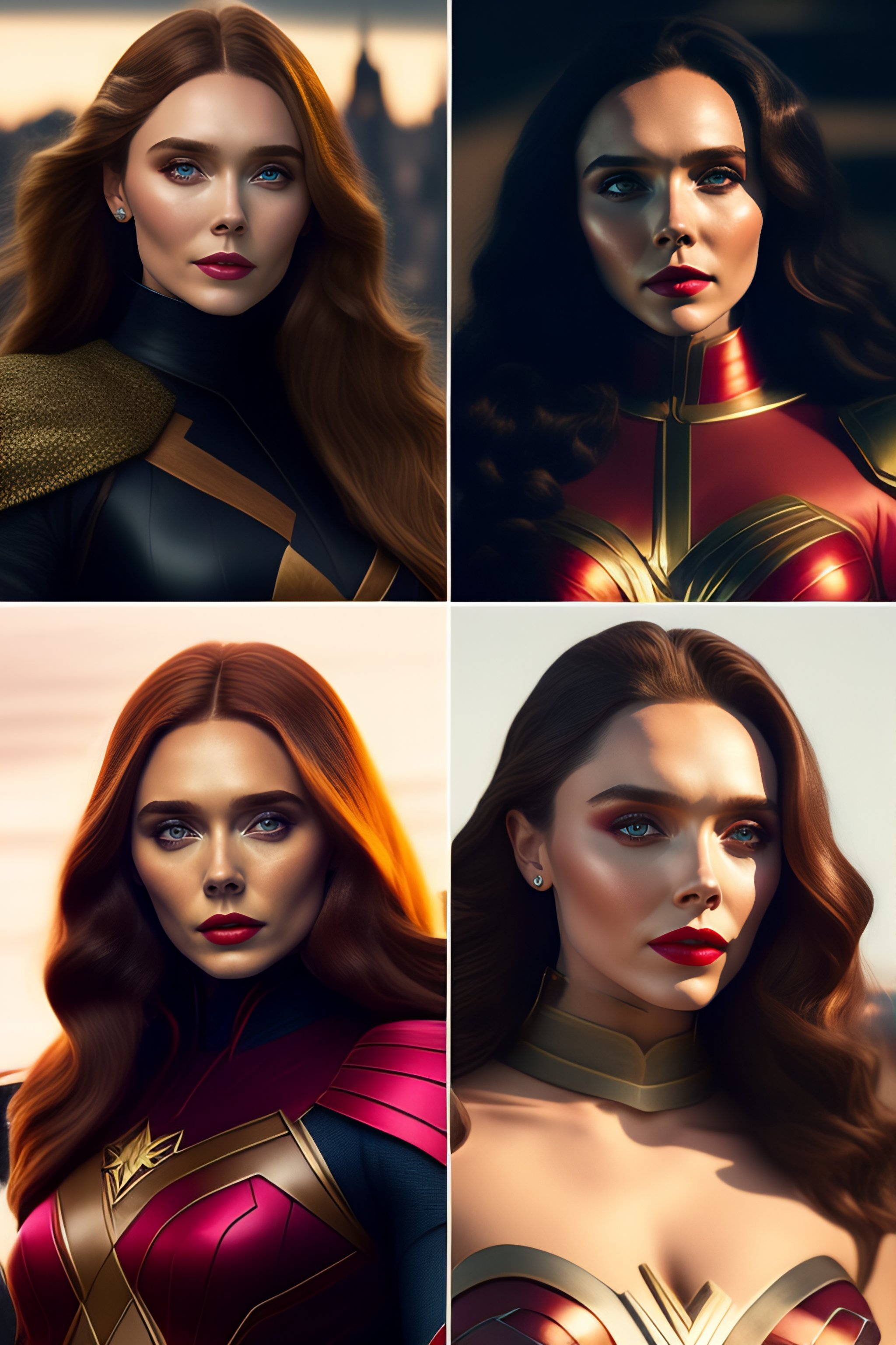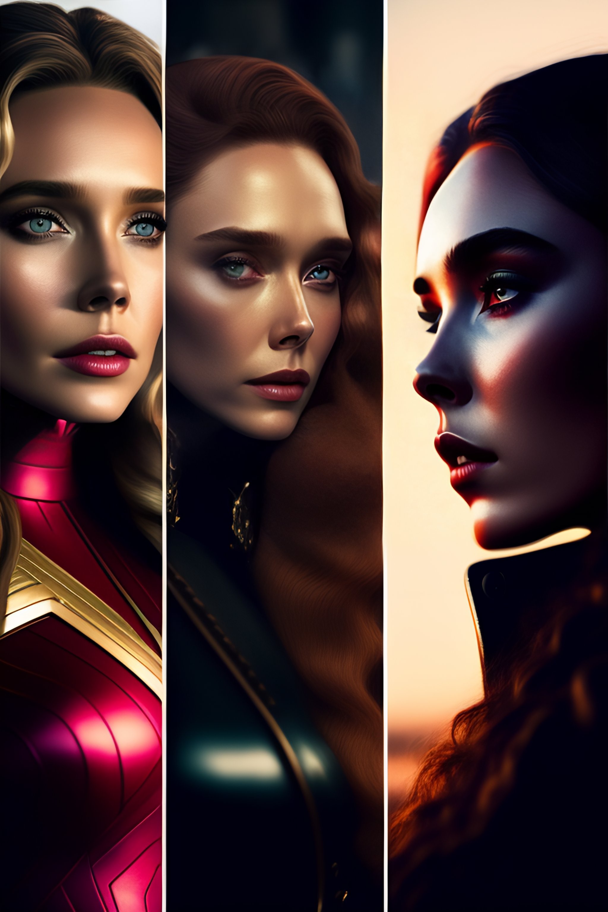 Elizabeth olsen as wanda maximoff side by side with scarlett johansson and florence pugh as black widow and gal gadot as wonder woman, not a portrait, intrincated details, street photo, high fashion, film, renoir, hobo style, vogue italia, future, casual, jewelry, long hair, blond hair, low light, night, party, romance