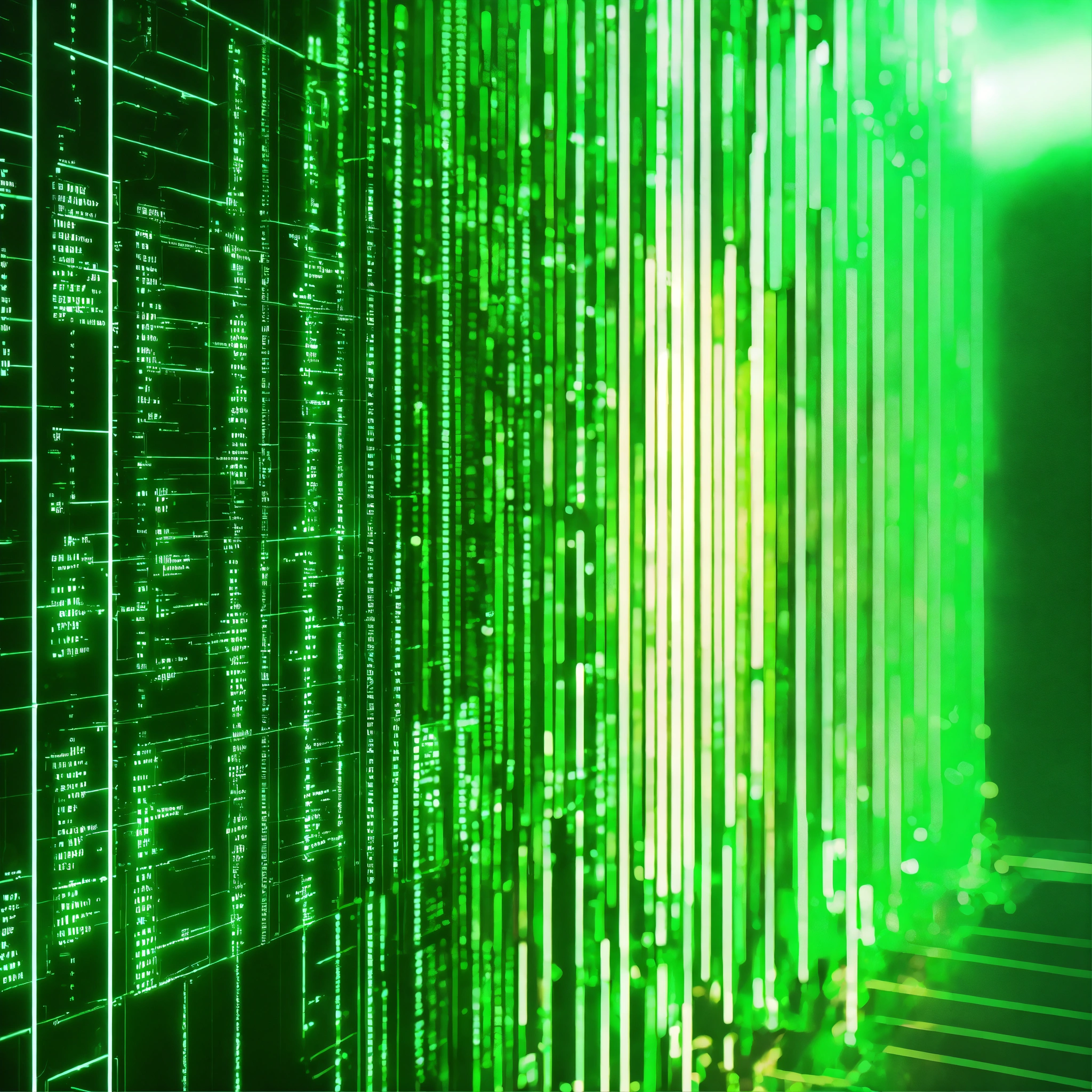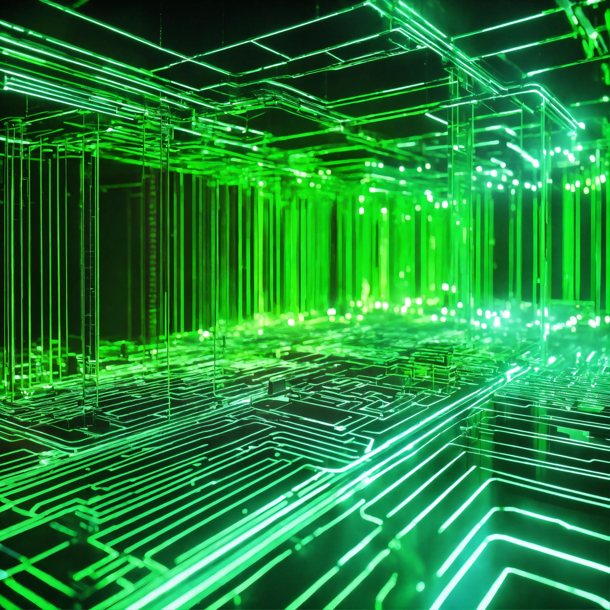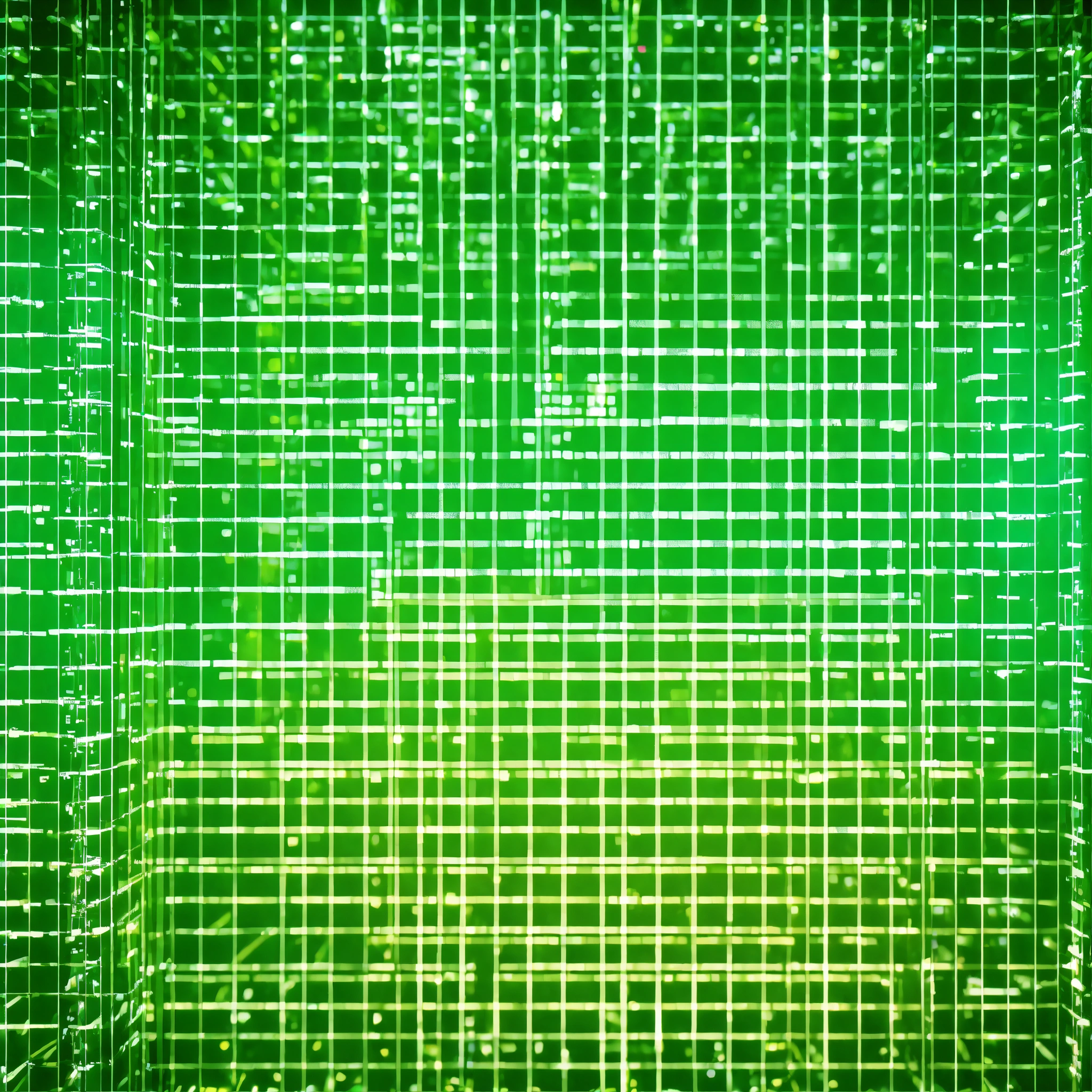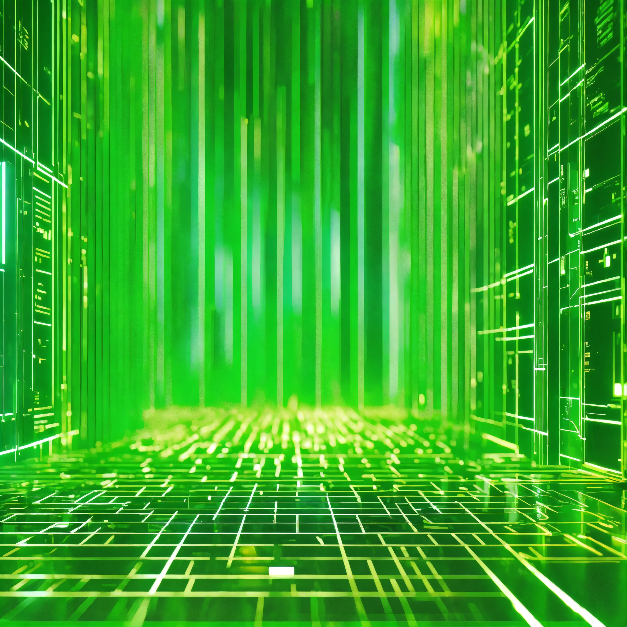 Ultra realistic bright photo of a very high tech 3d software code structure lit with bright green and white light
