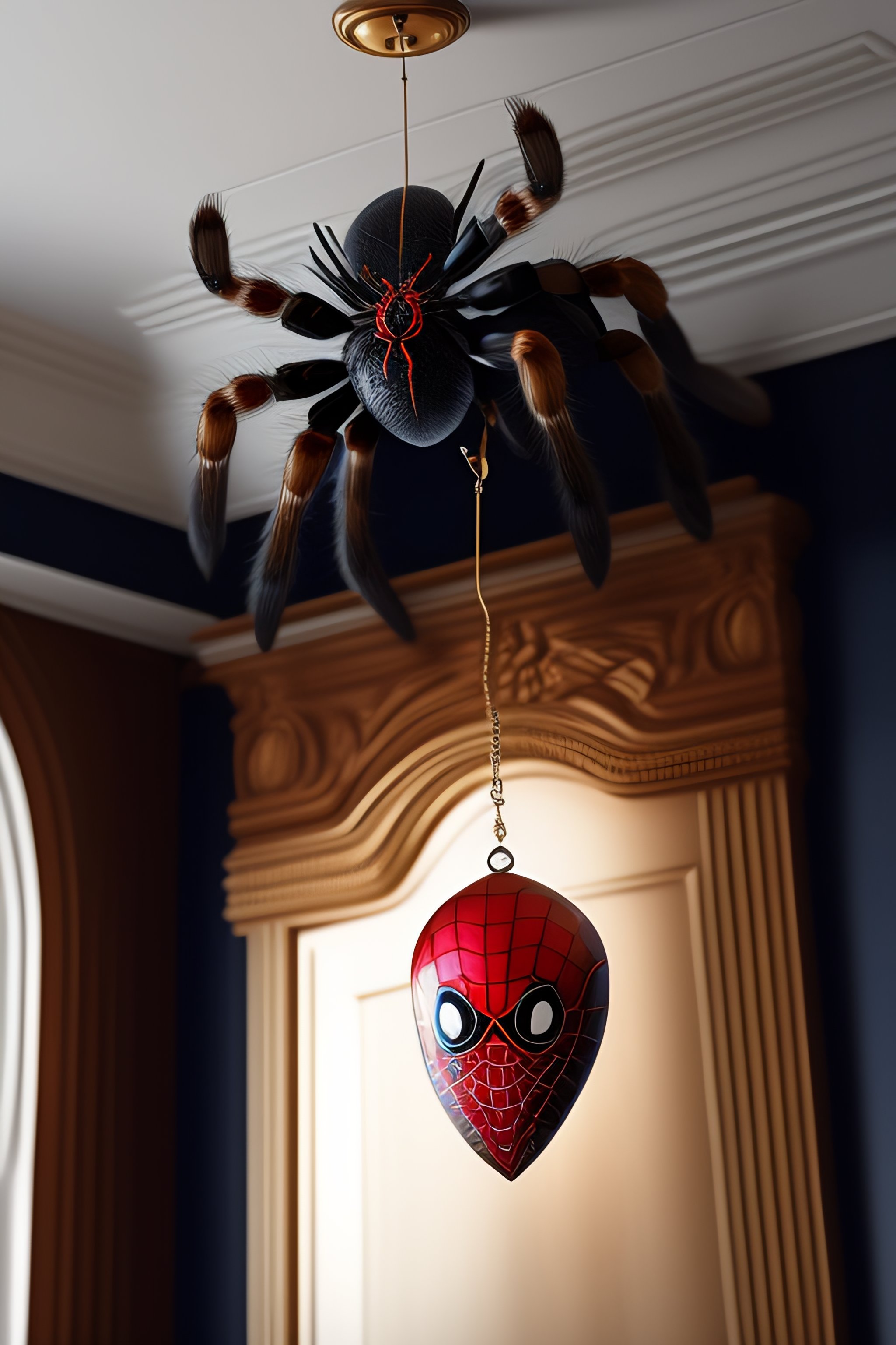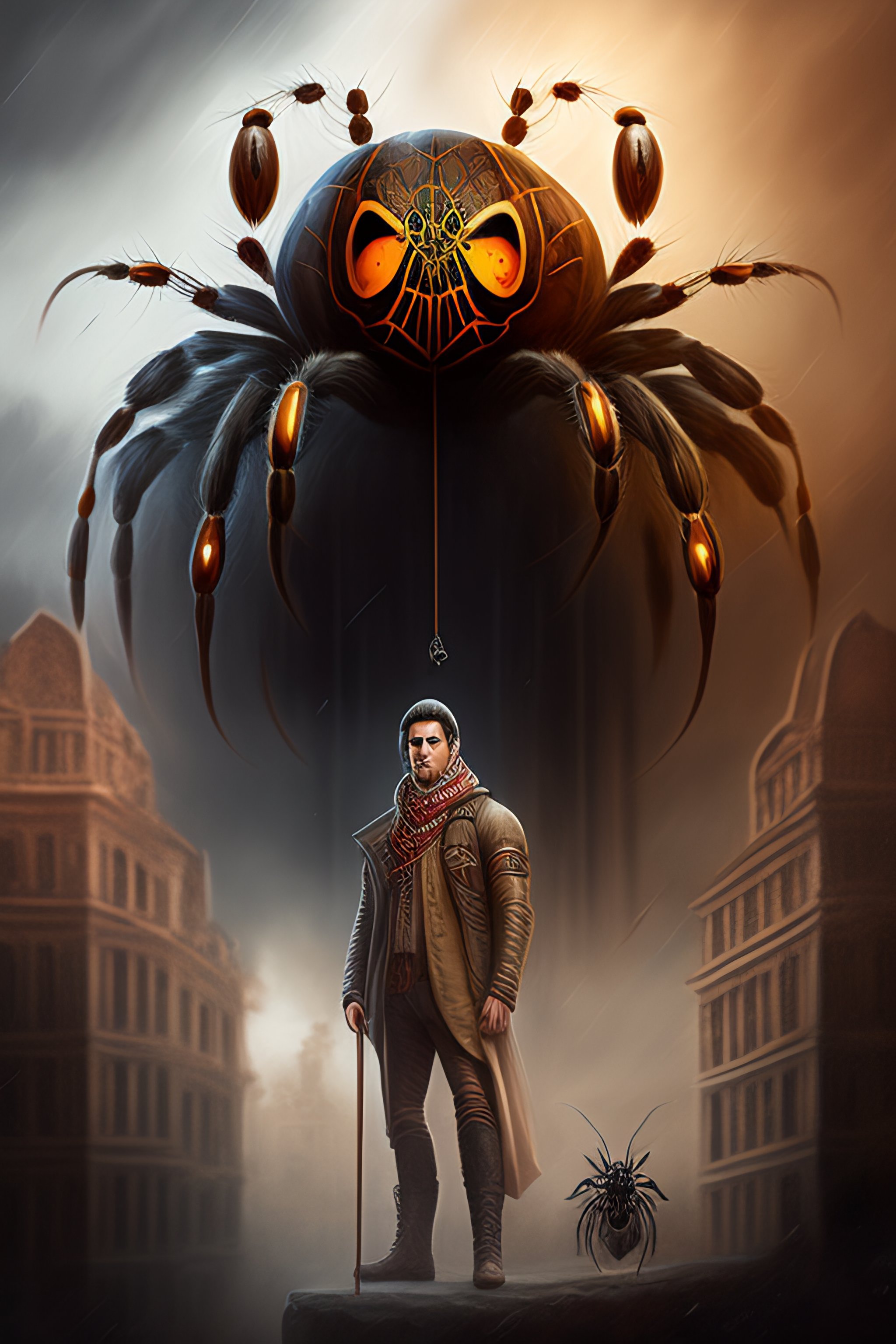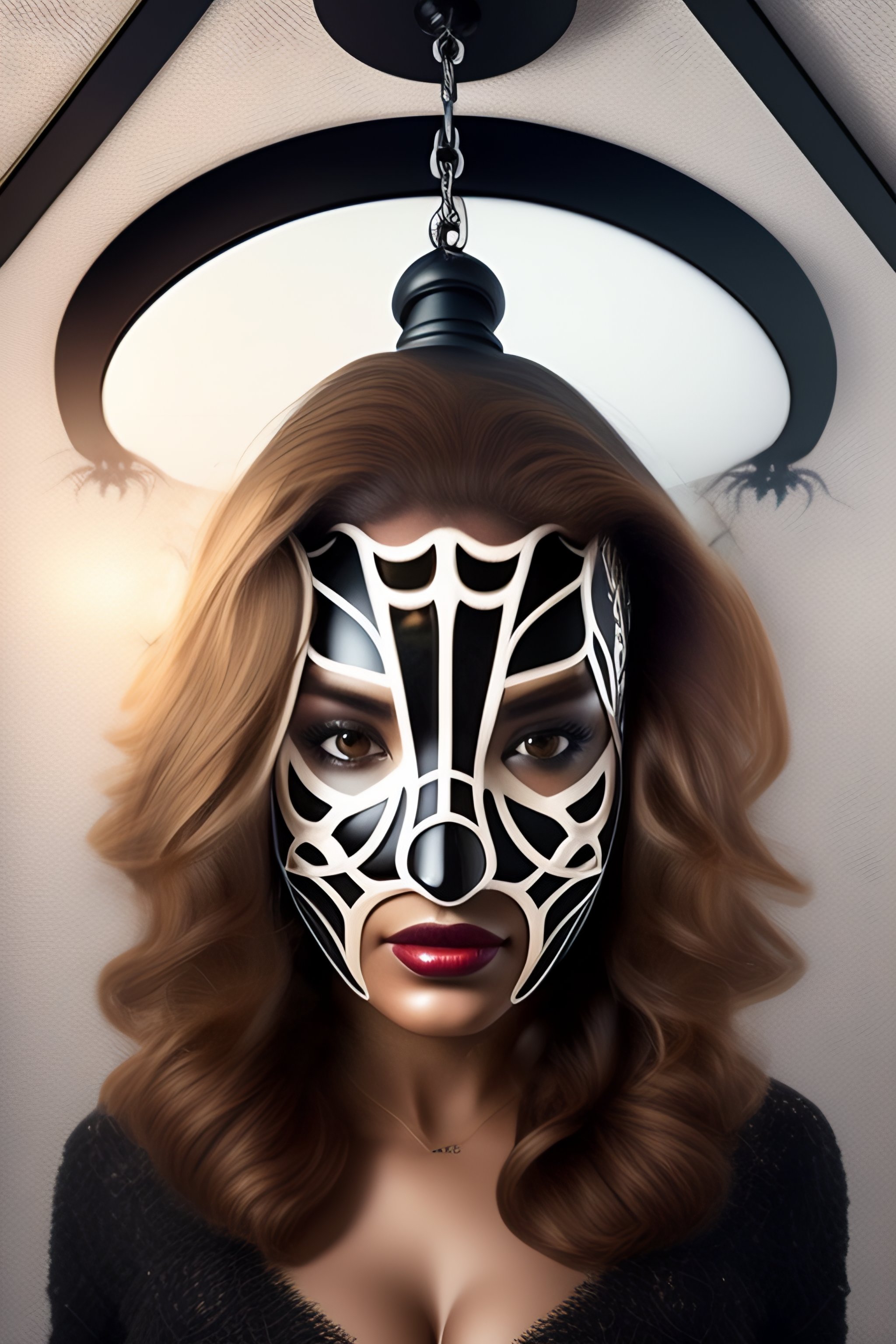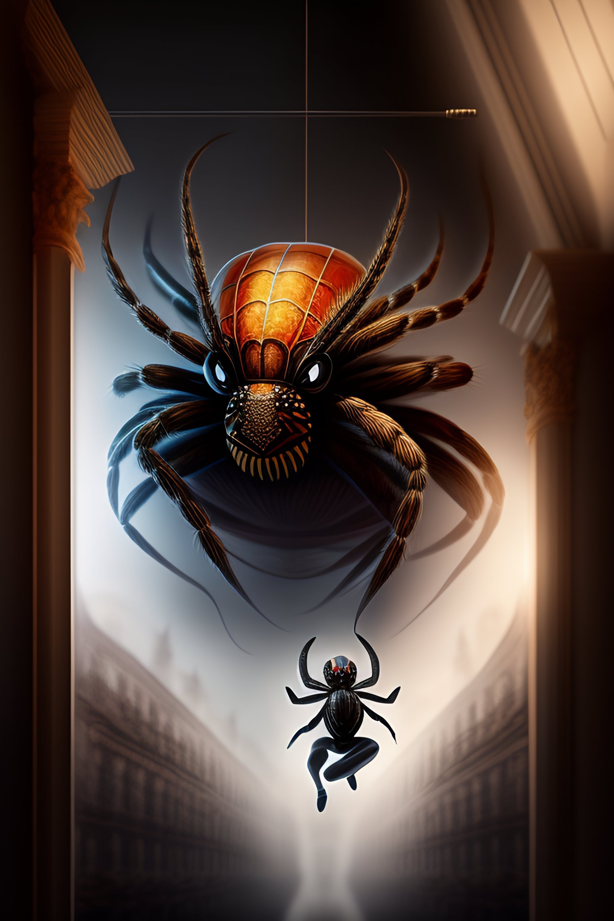 Giant anthropomorphic spider with human face hanging from ceiling, sketch, portrait, horror, hyperdetailed