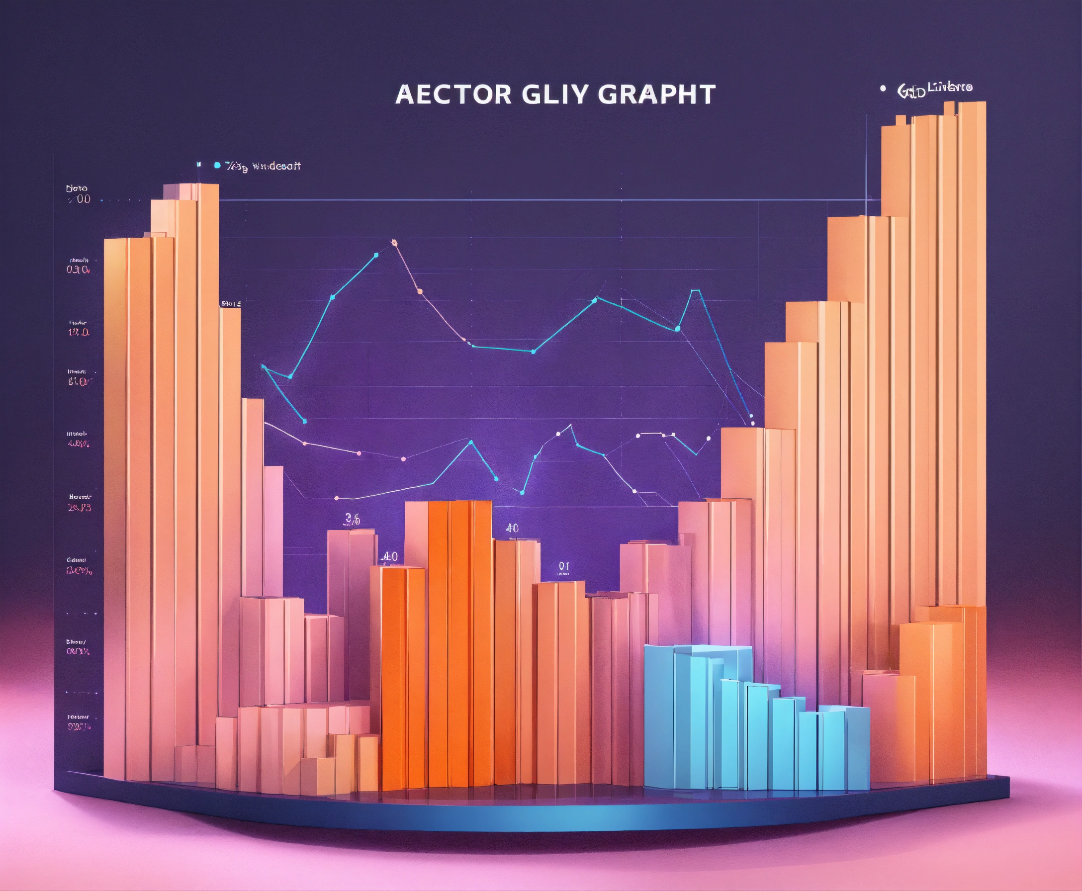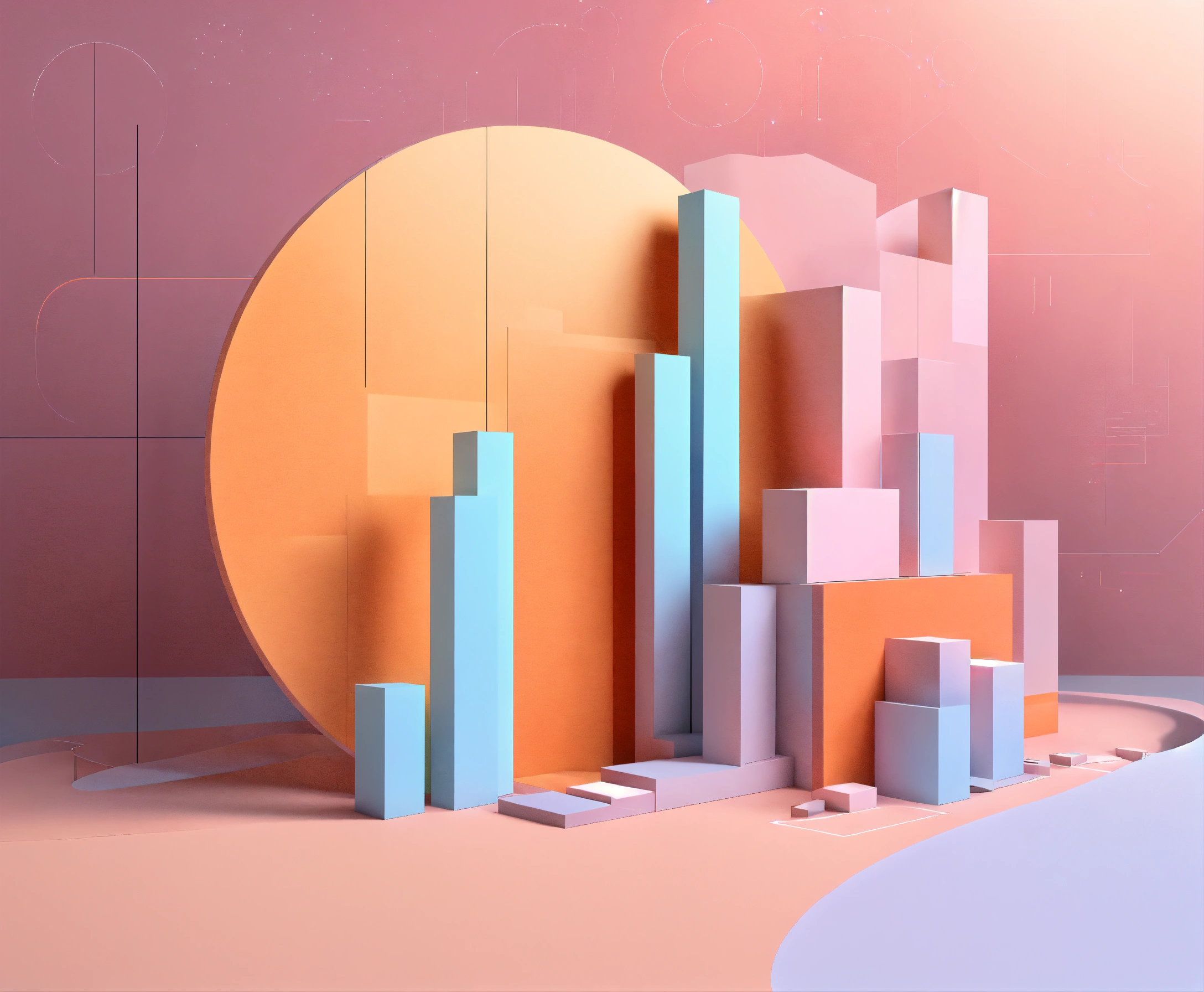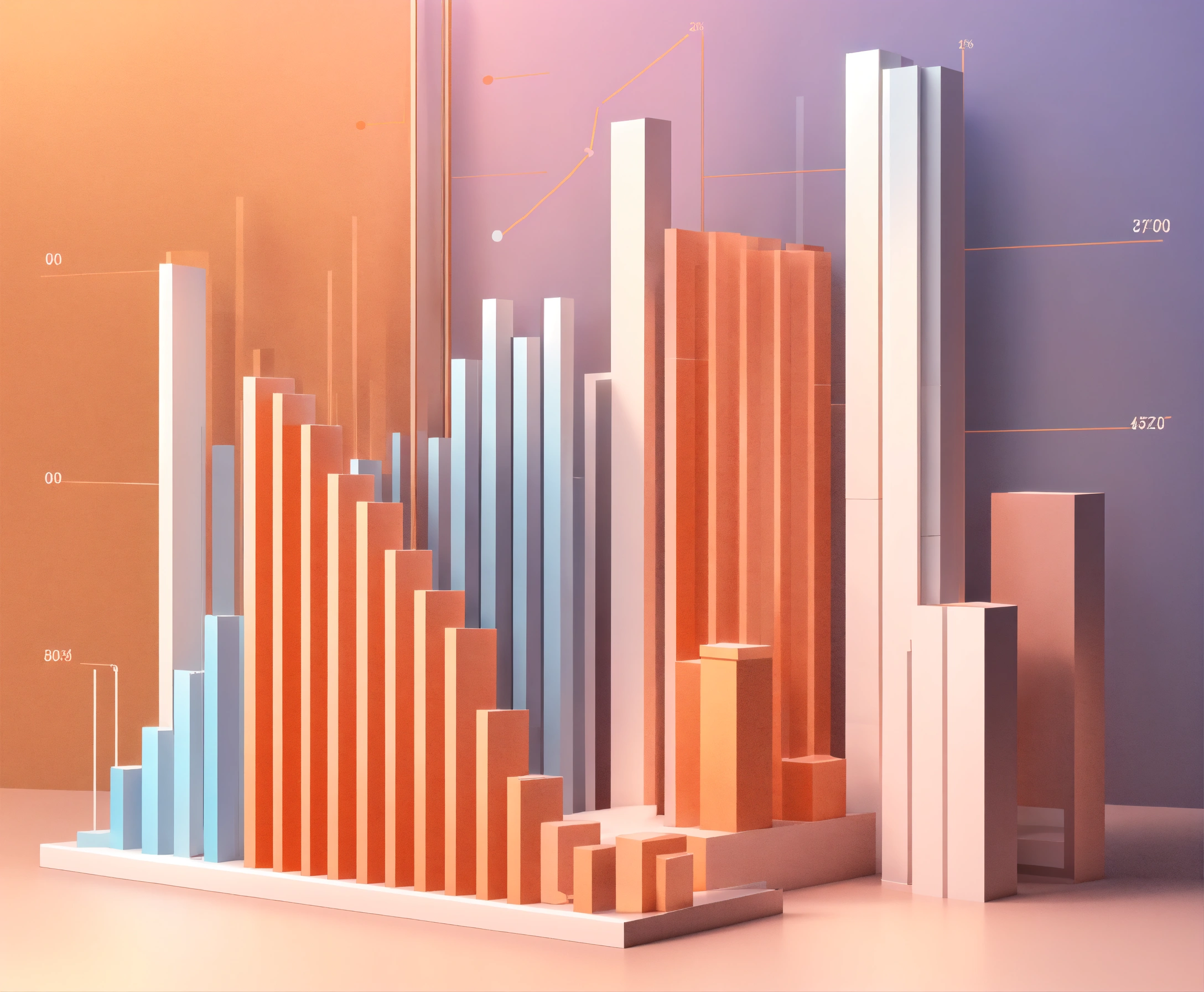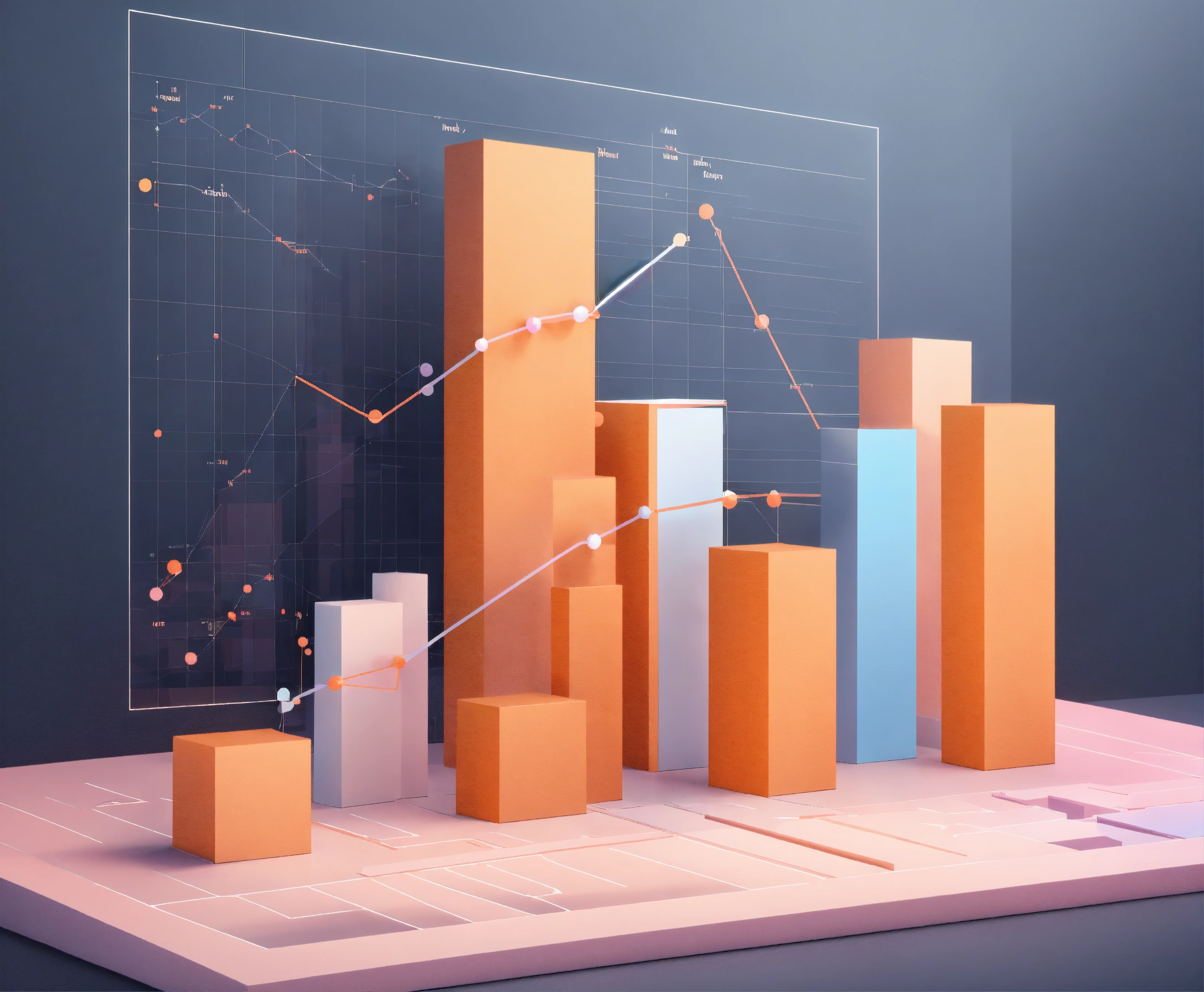 A vector style graph concept in 3d, light colours, light orange colour, soft, pastel, bar charts, pie charts, visualization, line graph