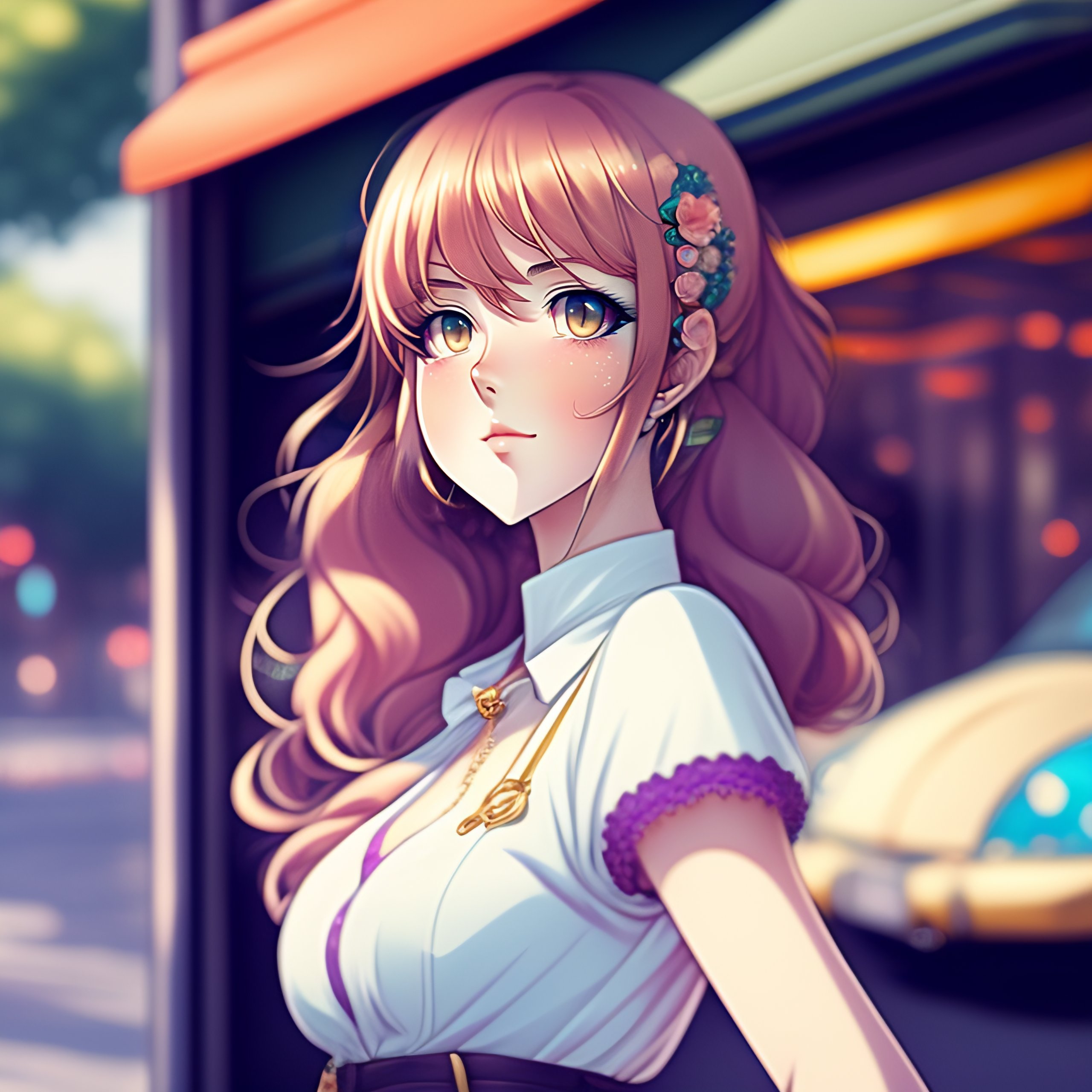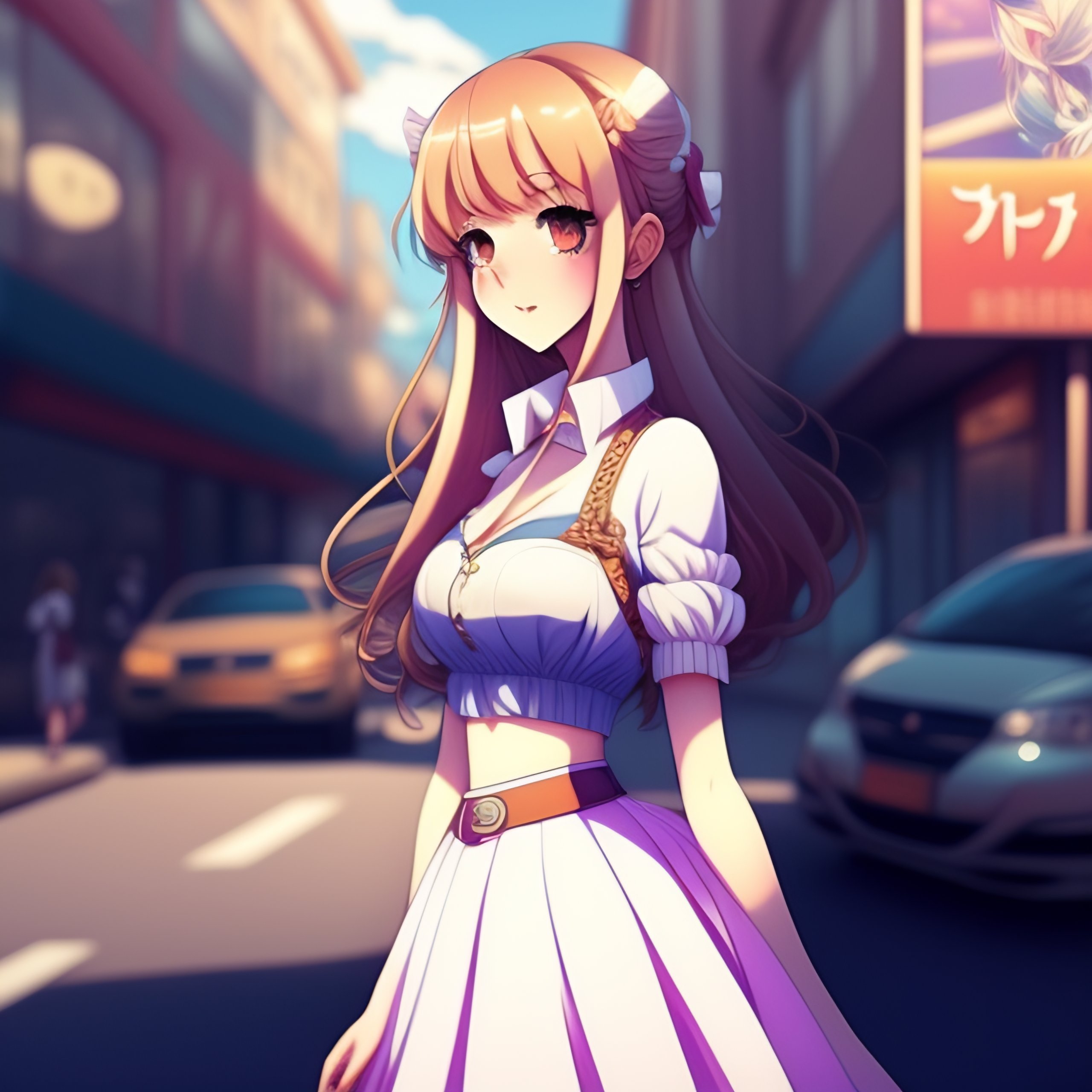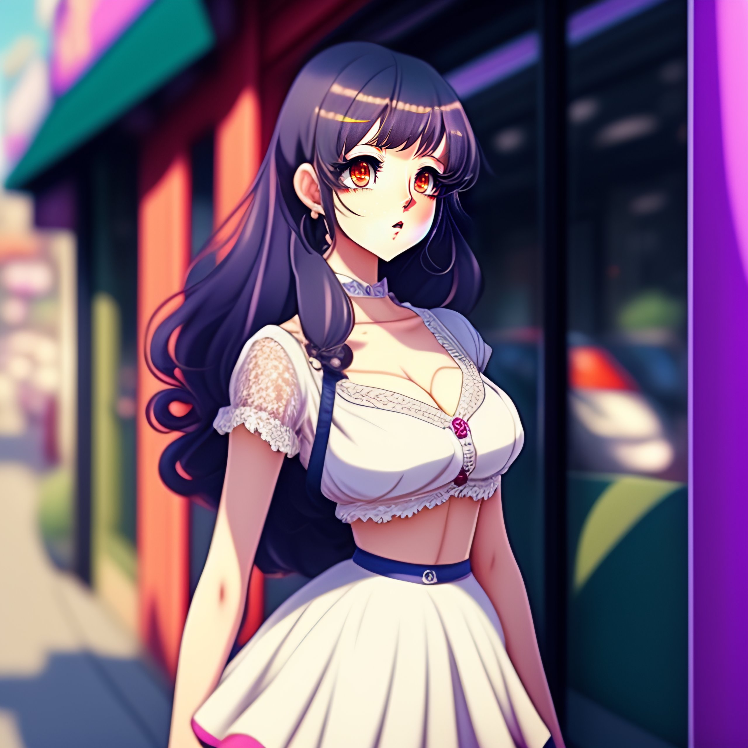 Cute young woman beautifuly drawn in manga style anime pin-up manga pen strokes finished cel-shaded art. lacey white top, flared skirt, happily looking forwards, standing, arms behind back. realisticly drawn eyes, realisticly drawn face, realisticly drawn pose. urban anime scene, outdoors, storefront, wall, colourful digital art by anna dittmann, intent gaze, hyperrealistic eyes