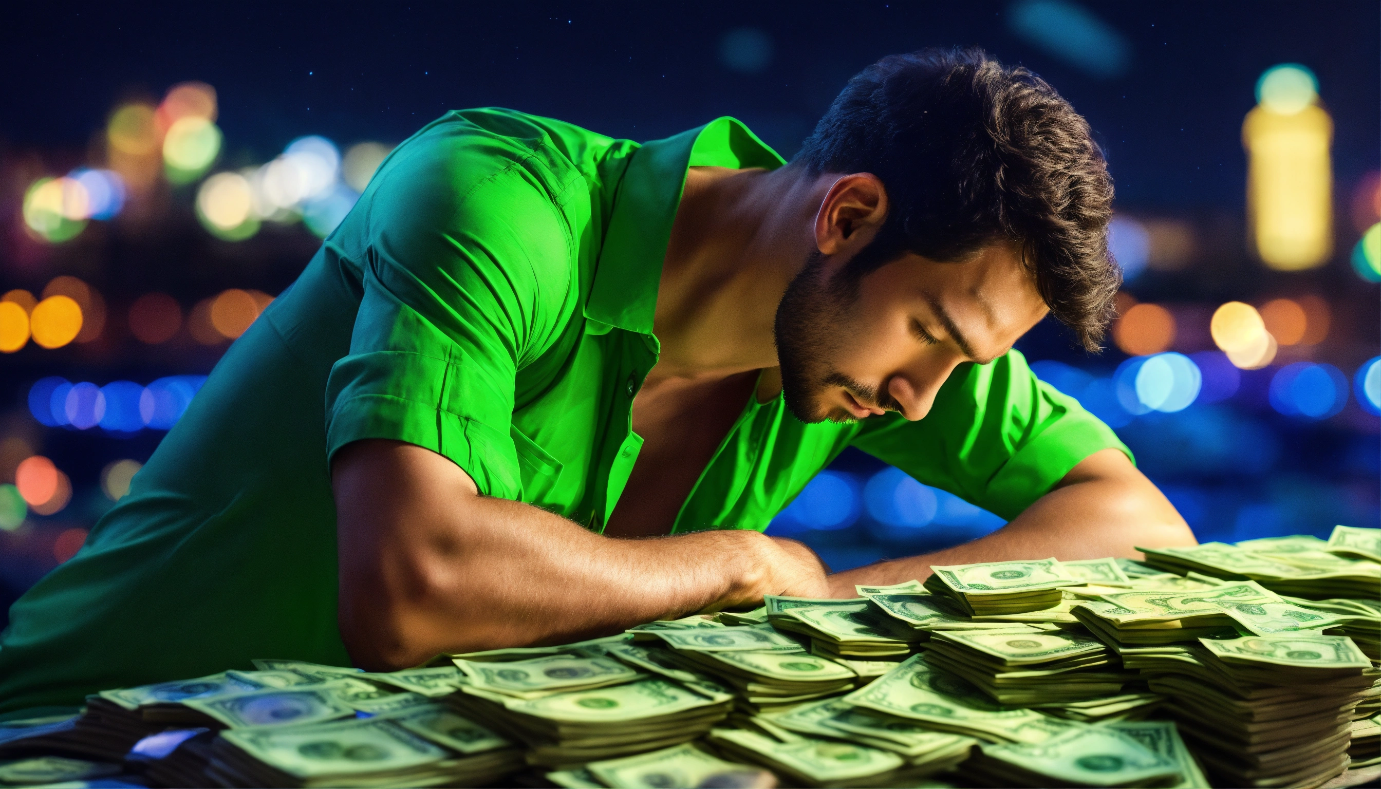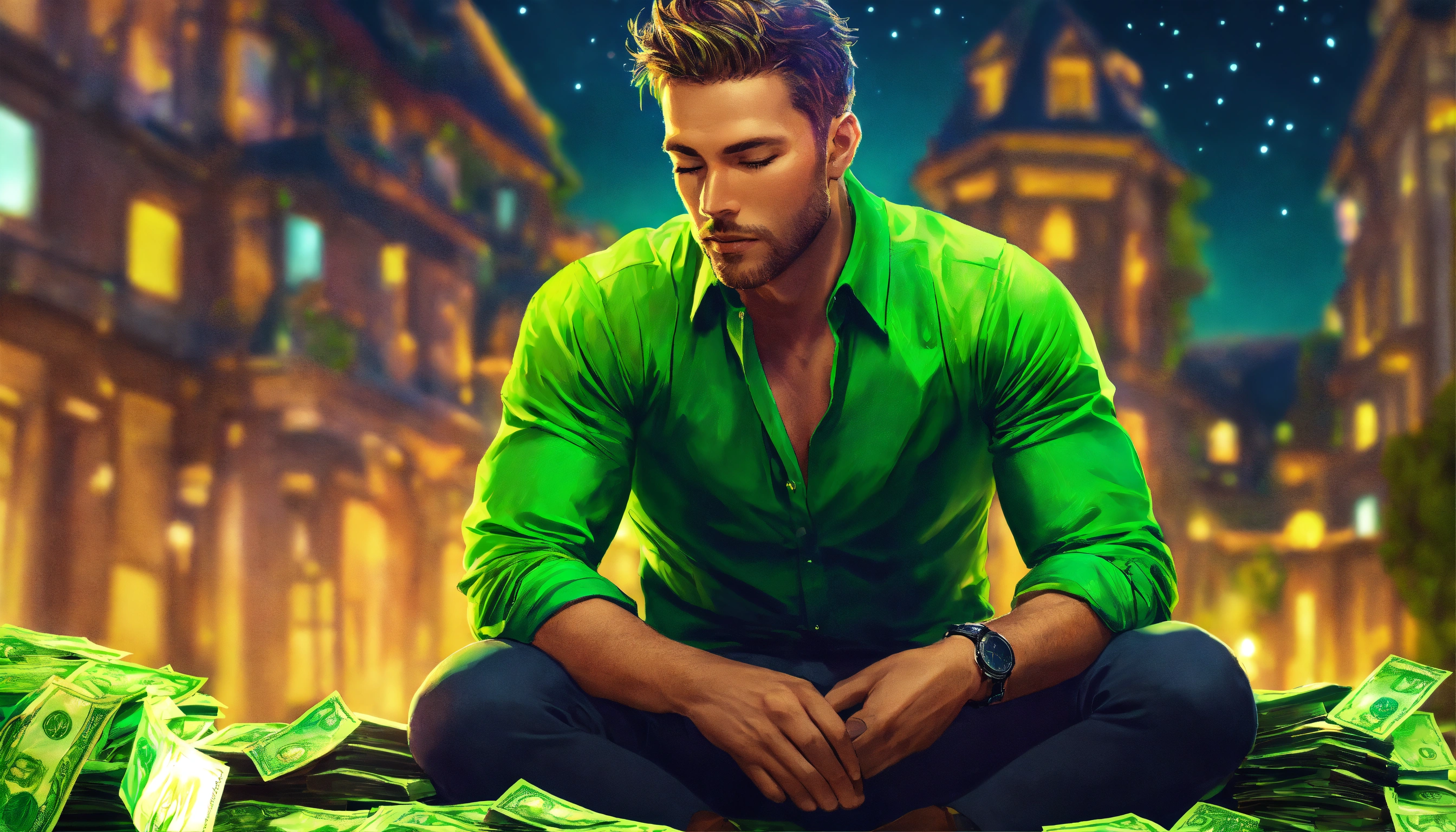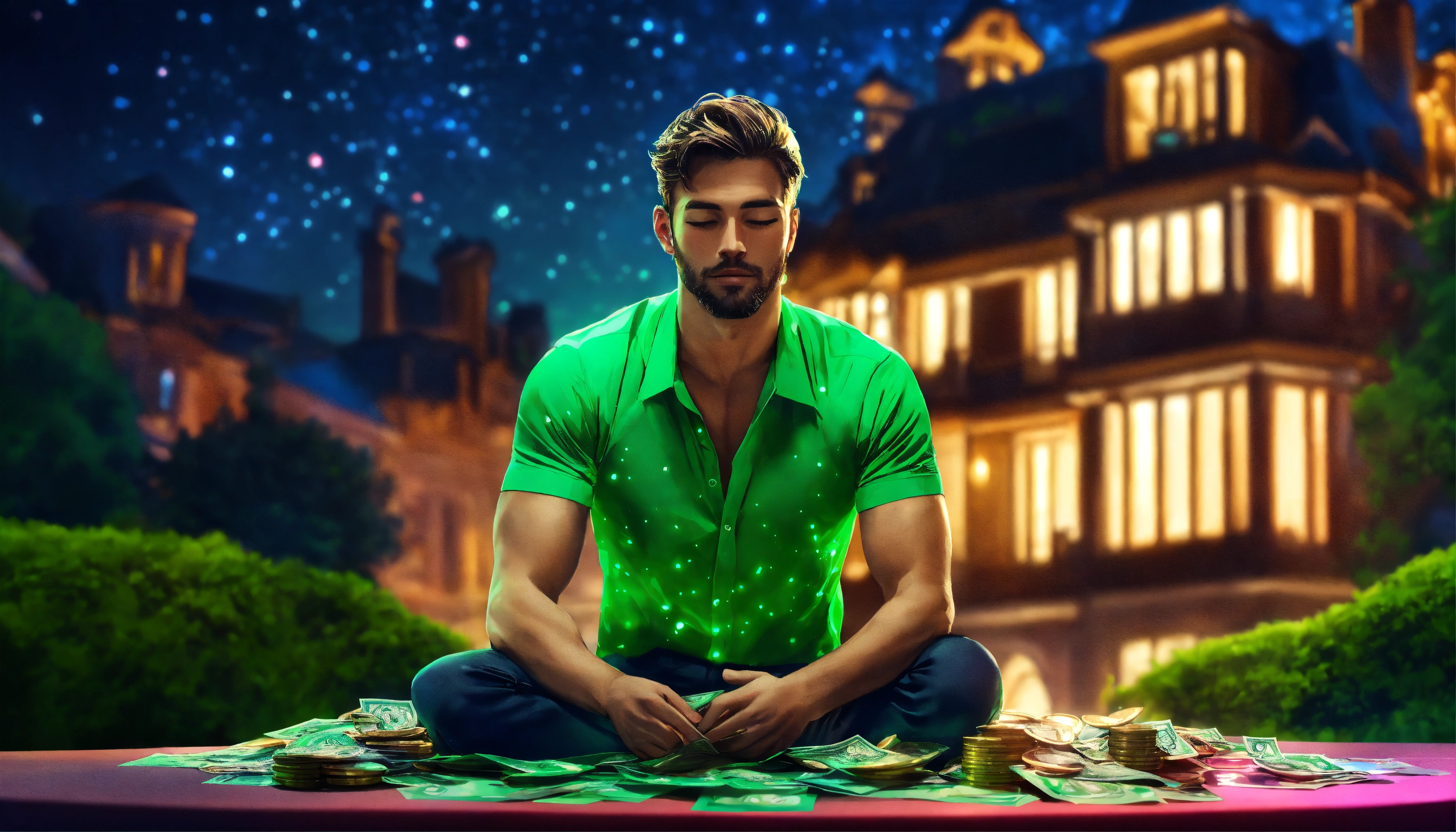 A well built handsome man, close up, bright green shirt, eyes closed, mansion in the background, bright cityscape lights, stars at night, sharp contrast psychedelic colours, sitting on a pile of bank notes and small coins, 4k resolution, photo realistic
