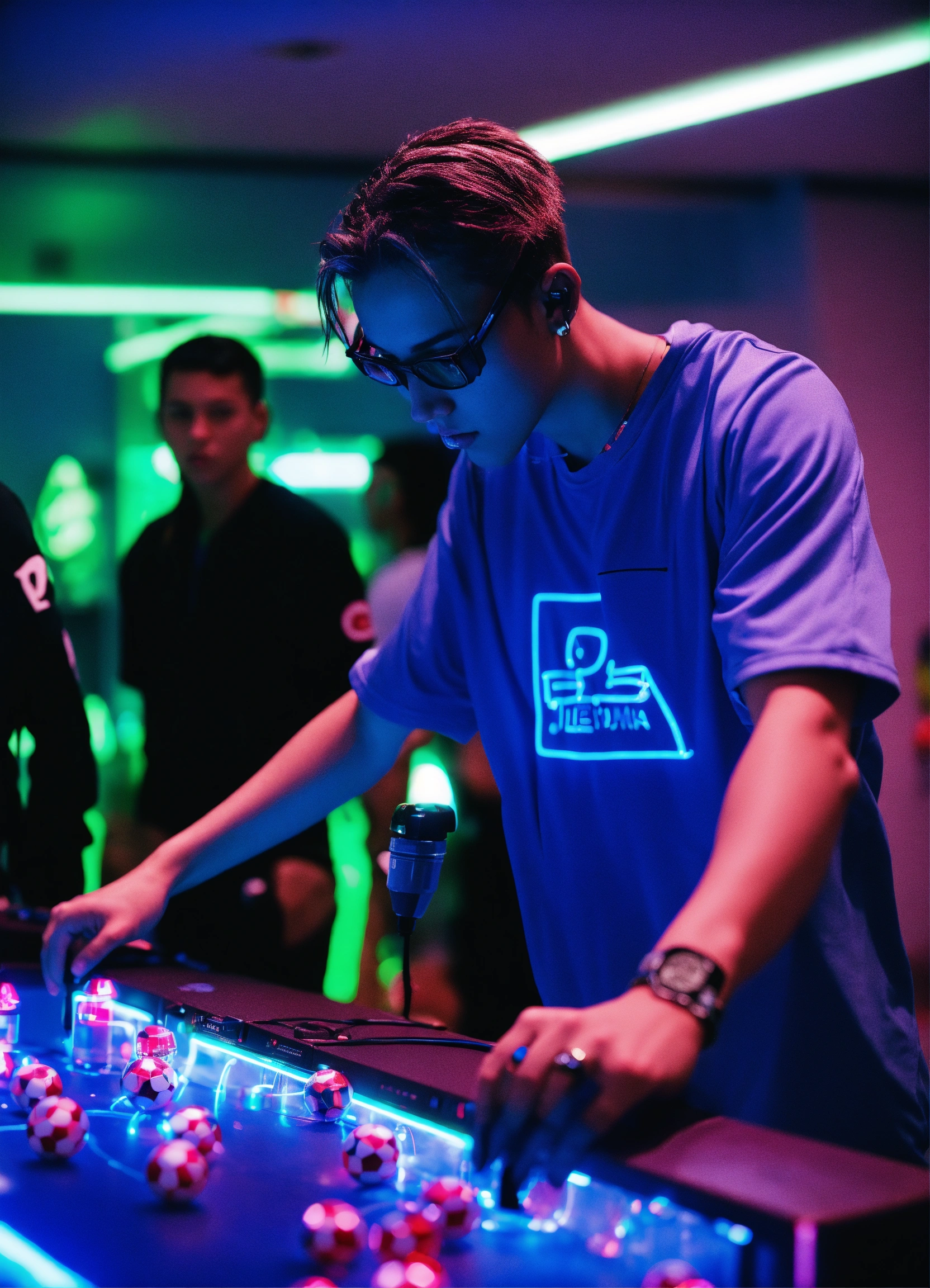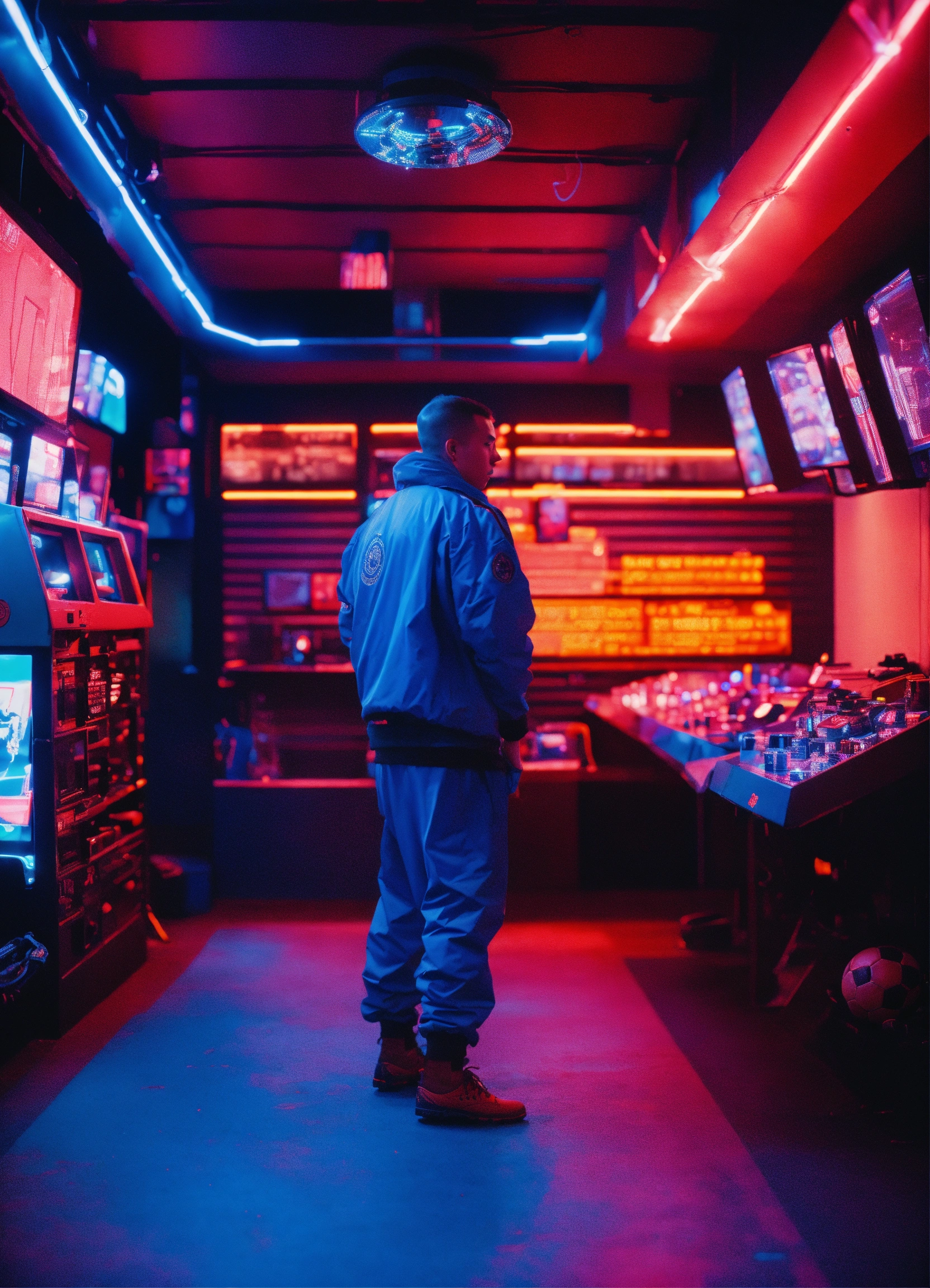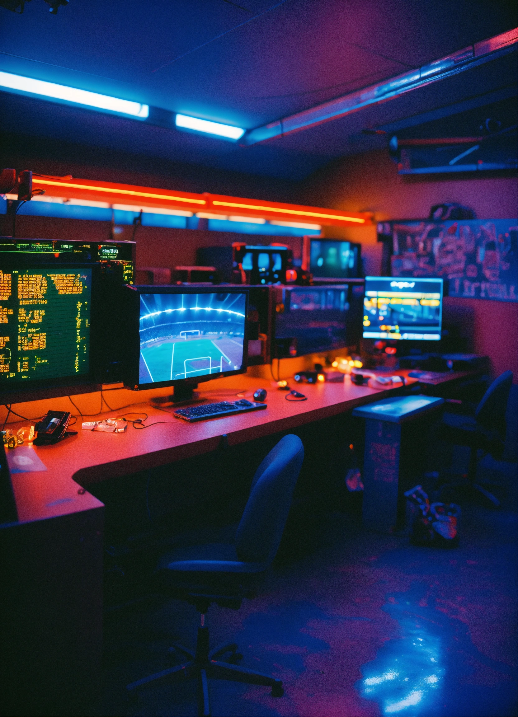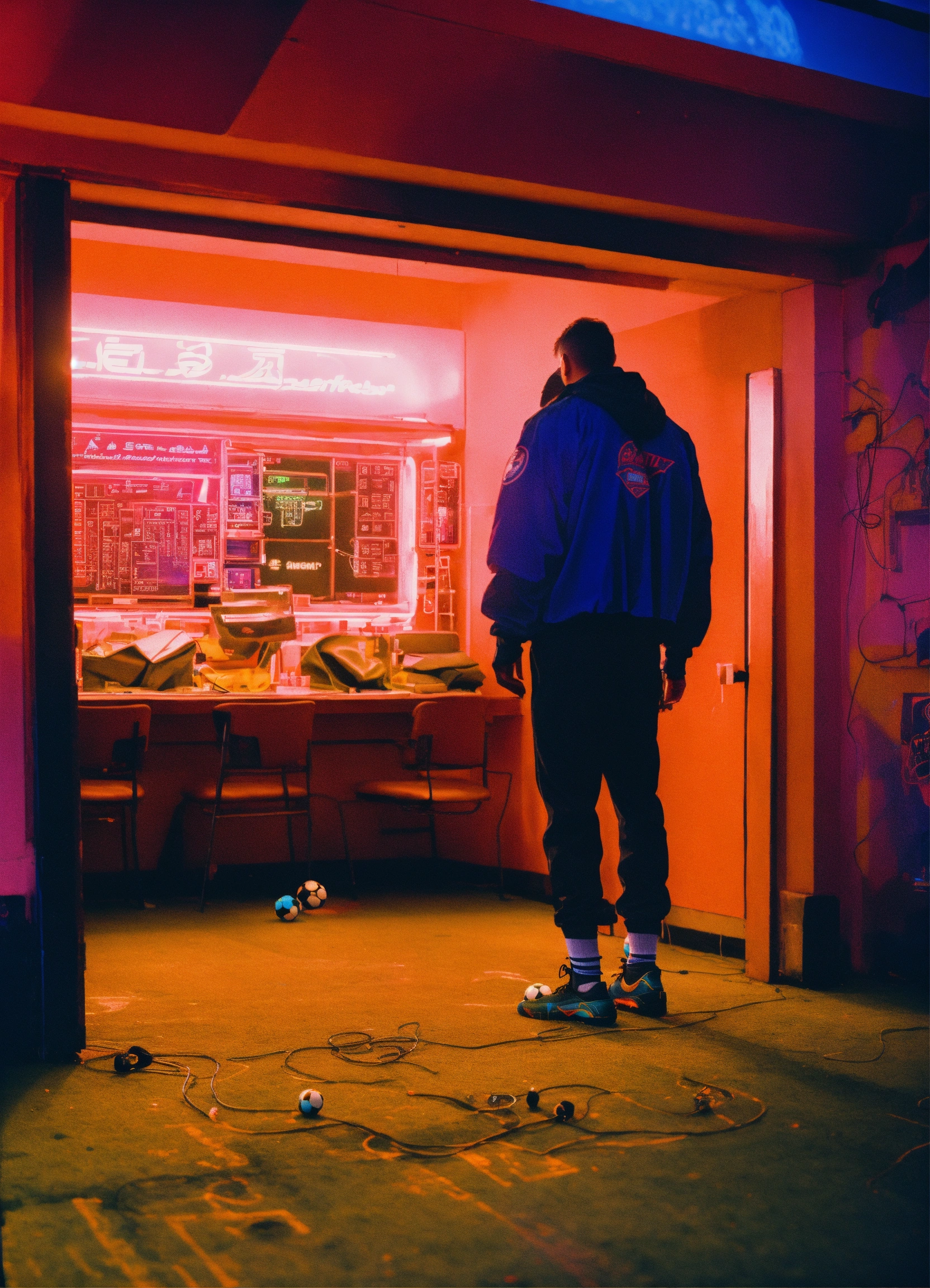 Cyberpunk soccer trading room, blue neon lights, perfect lighting, leica summicron 35mm f2.0, kodak portra 400, film grain