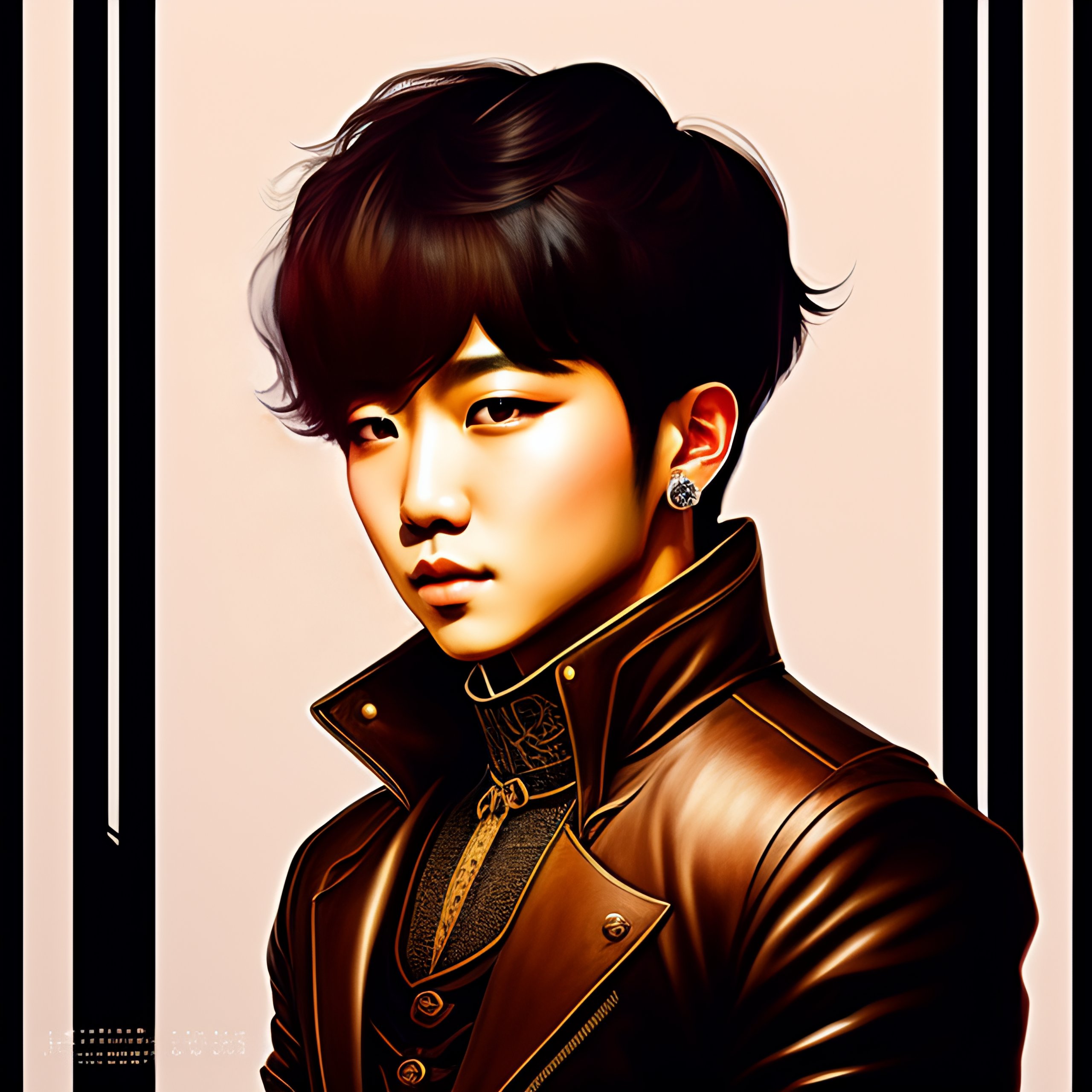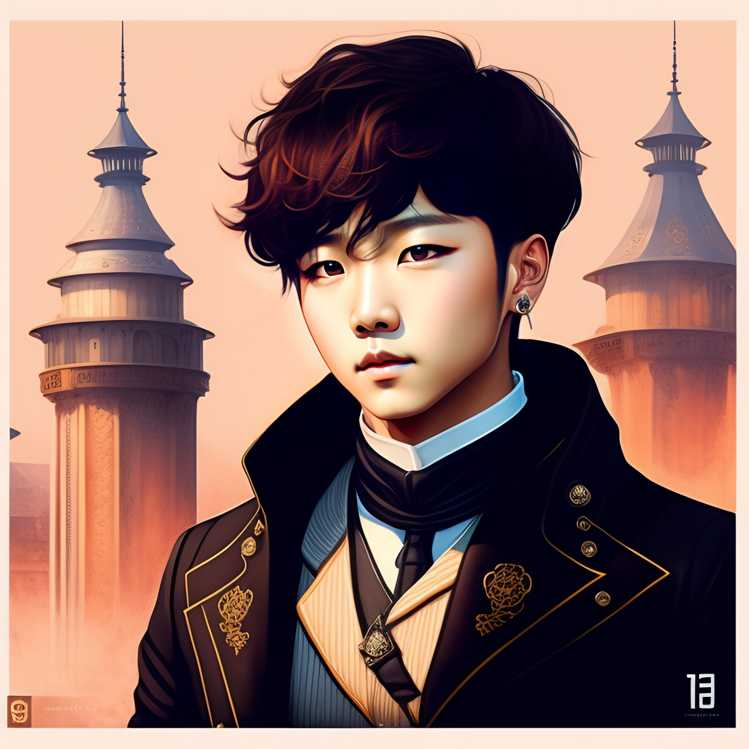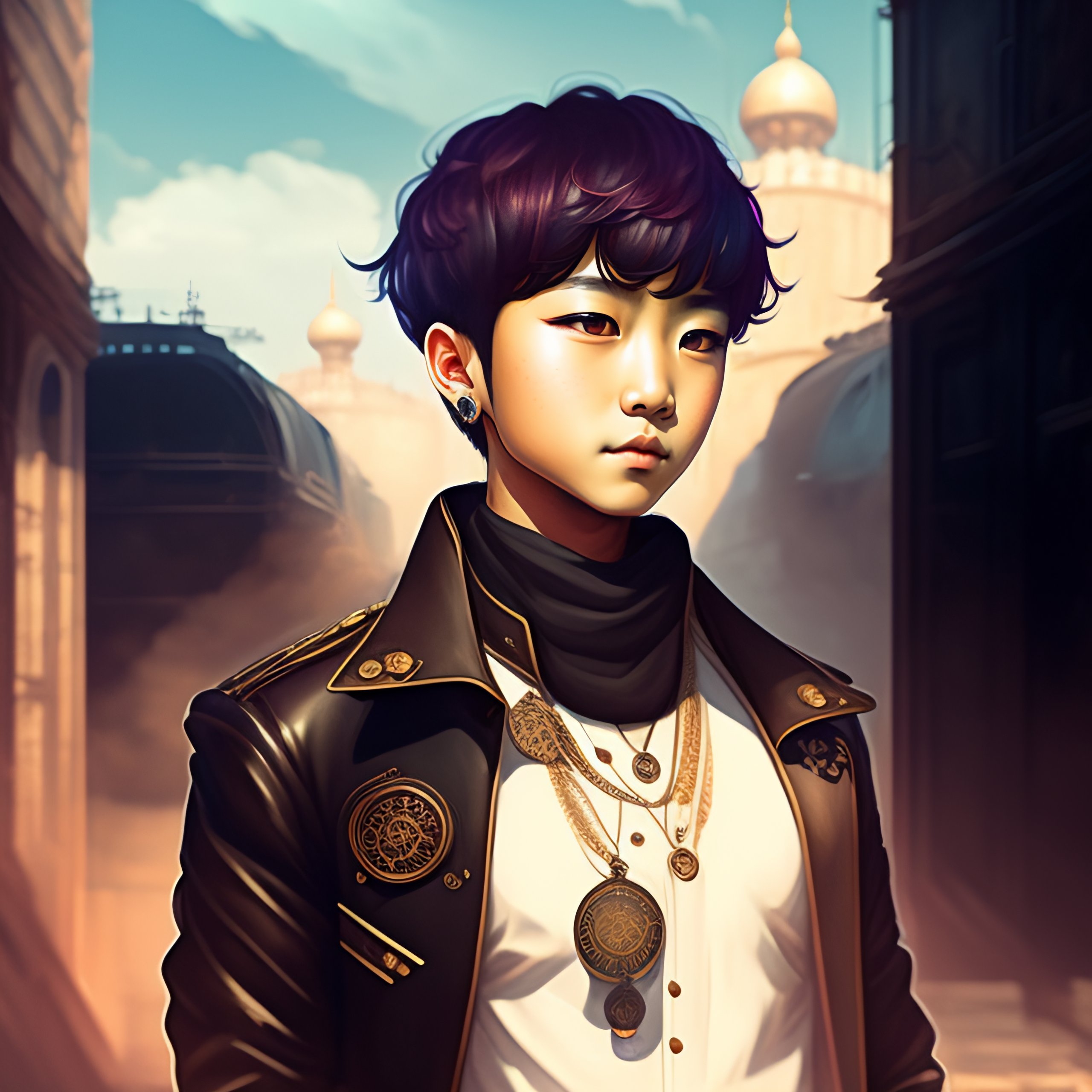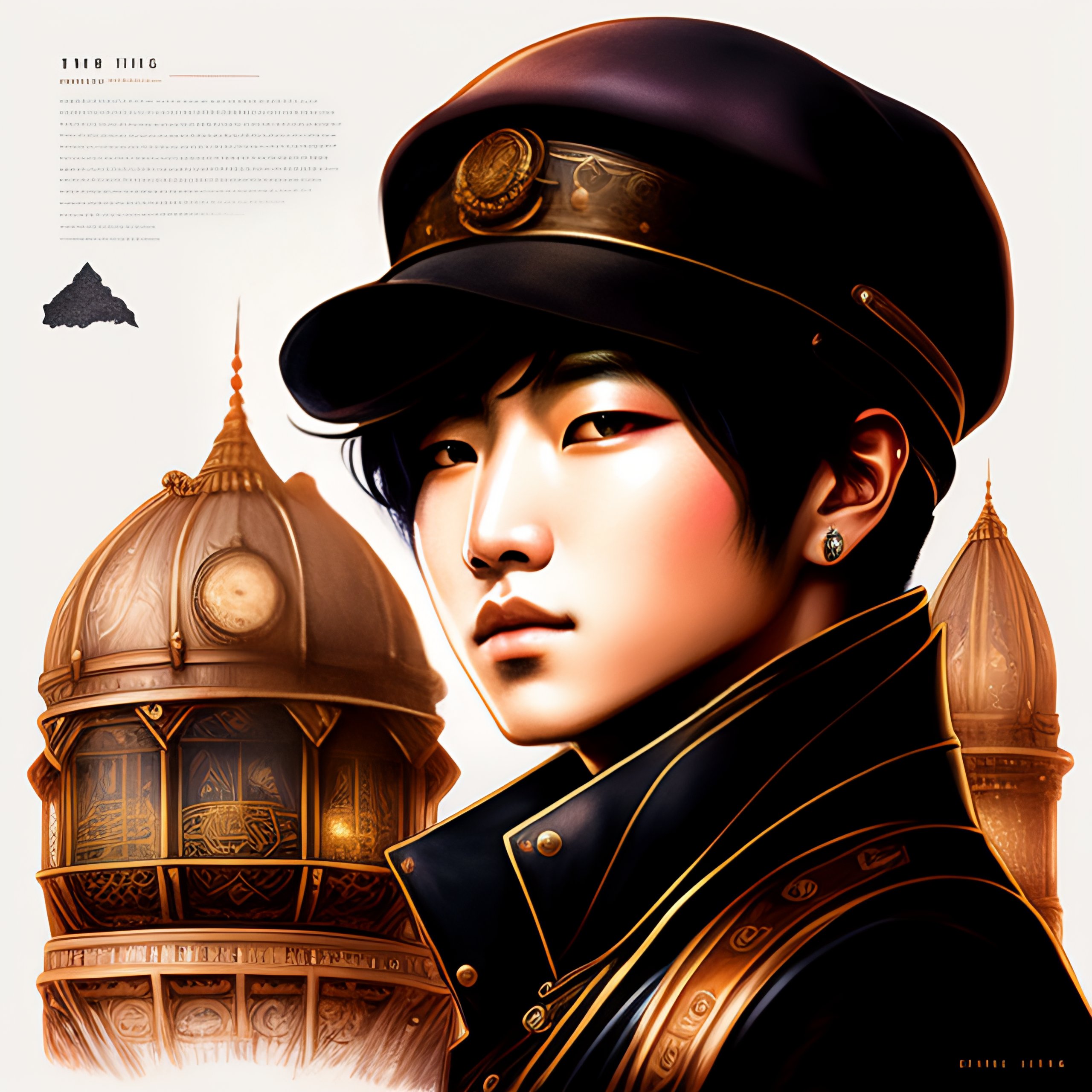 Chibi jung kook, bts, steampunk, atmospheric perspective, rule of thirds, traditional ink, line sketch, sharp focus, geometrical shapes, intricately detailed, illustration, 8k, inked, deep colors