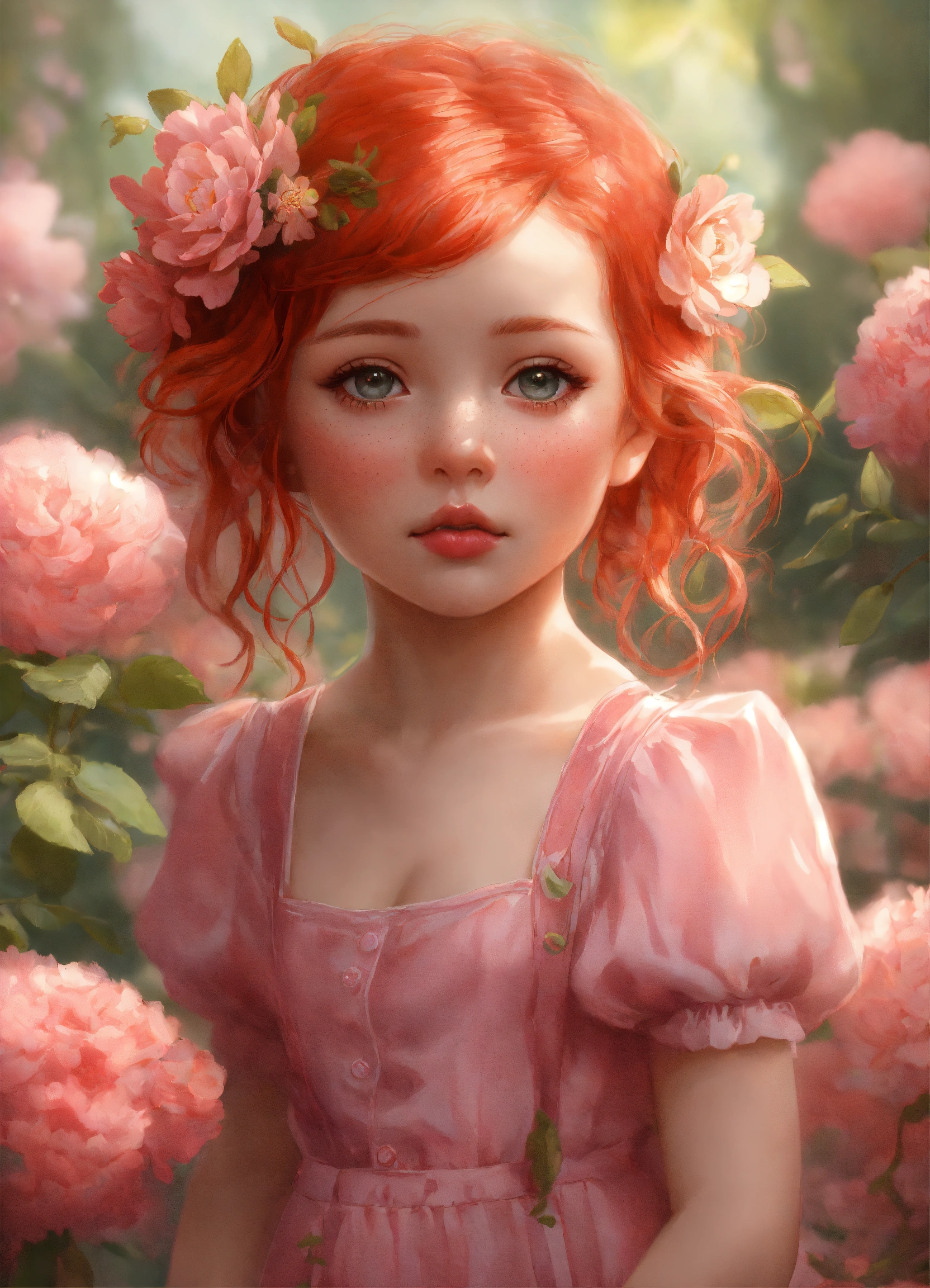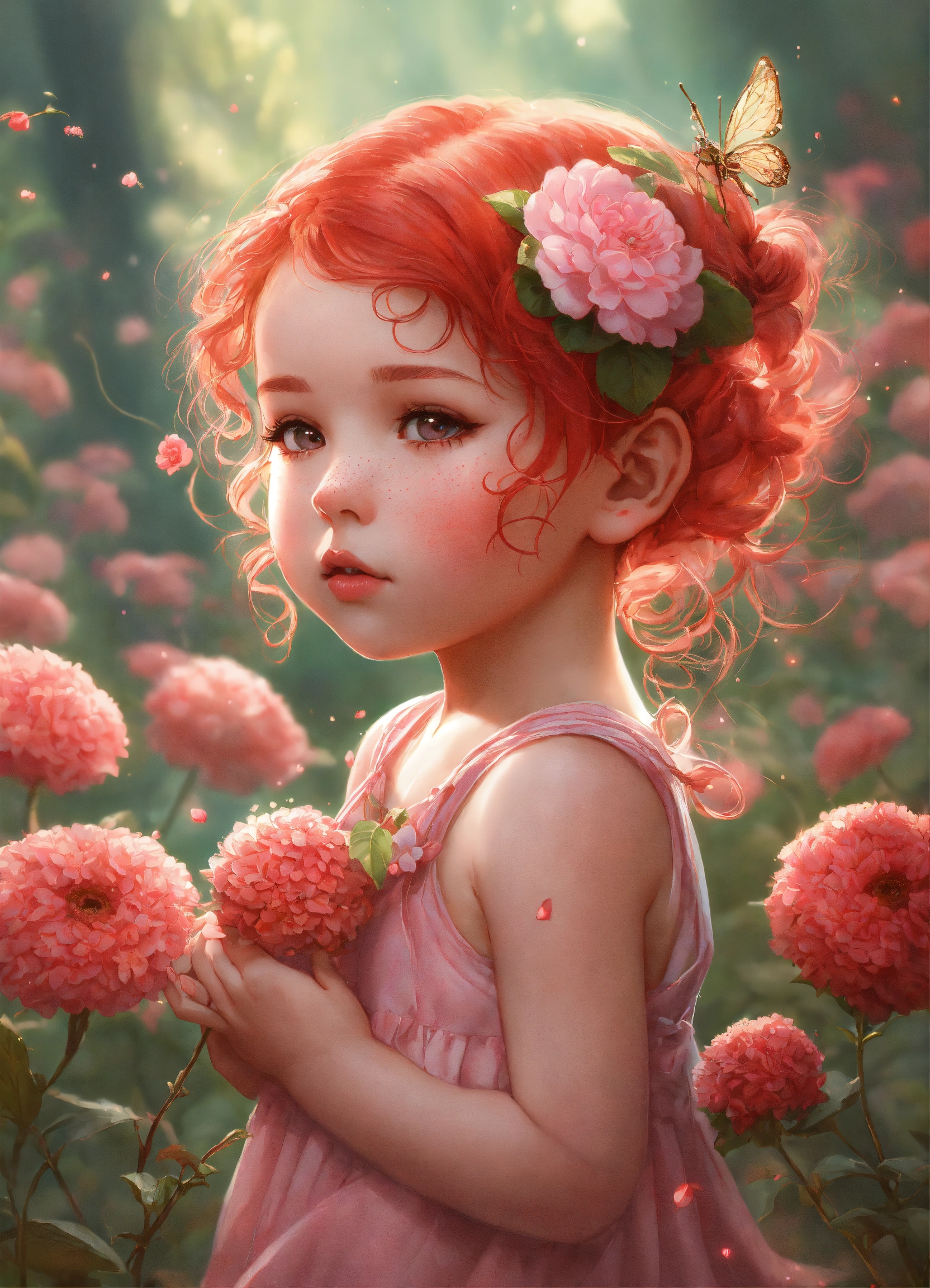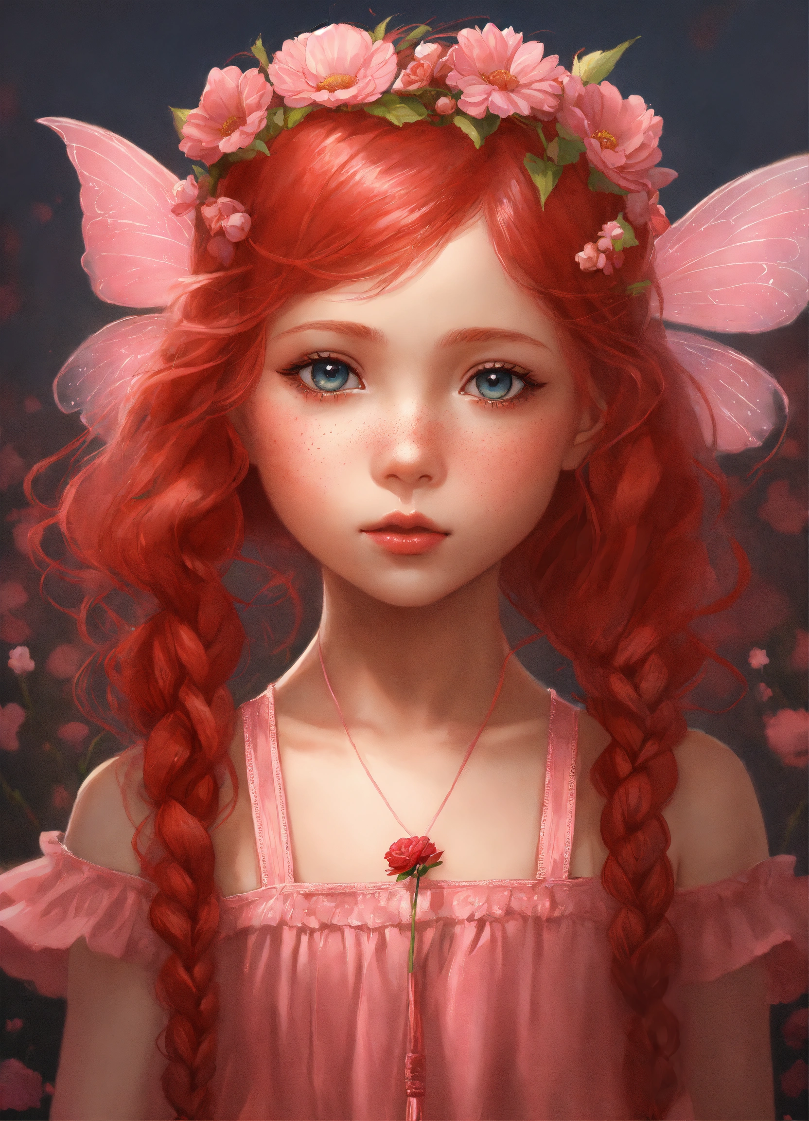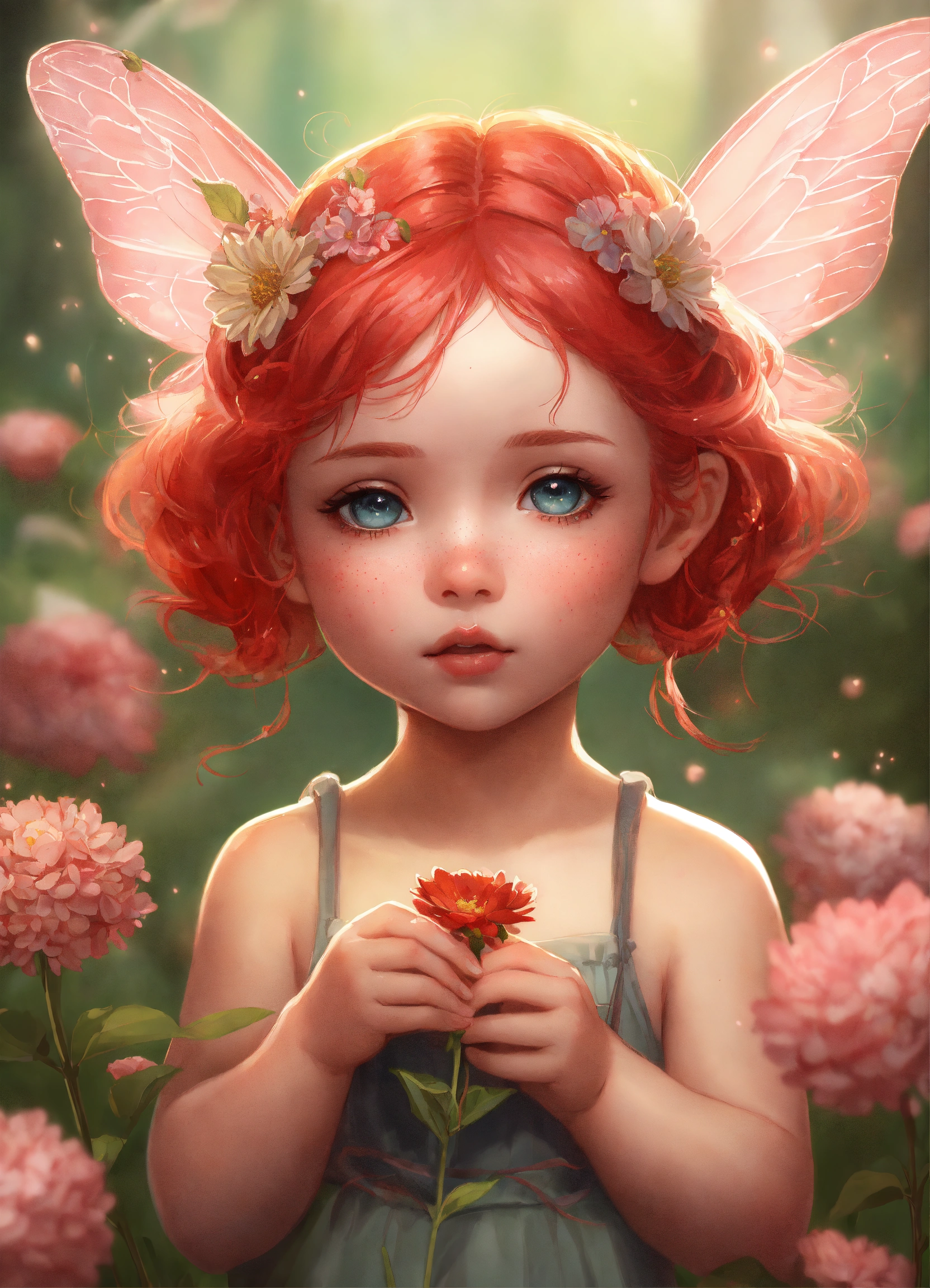 Portrait and shot full body of a sweetness pink baby fairy chibi girl freckled, two braids in red hair she puts her nose close to a flower to smell it, she is smelling a flower, clipart digital art style, very detailed, by stanley artgerm and tom bagshaw, 2k