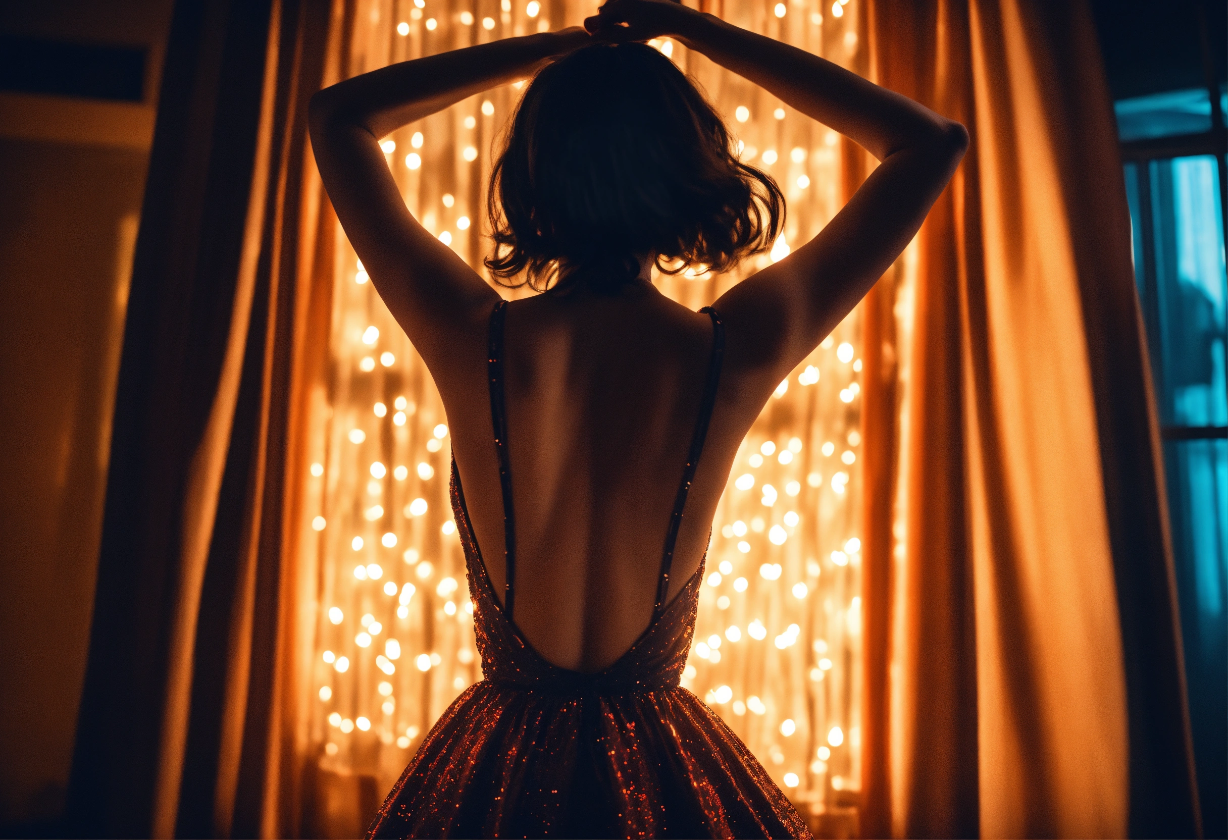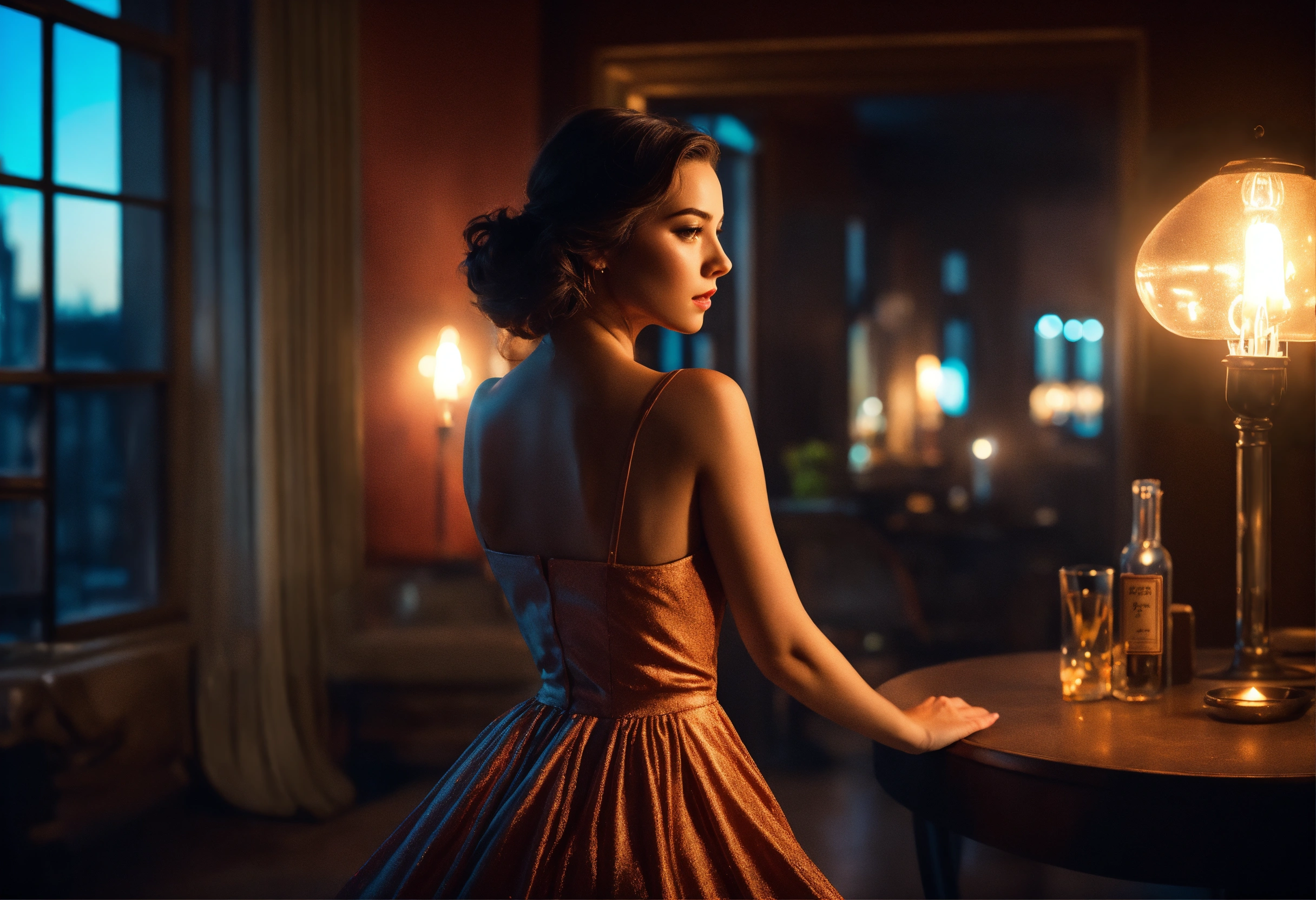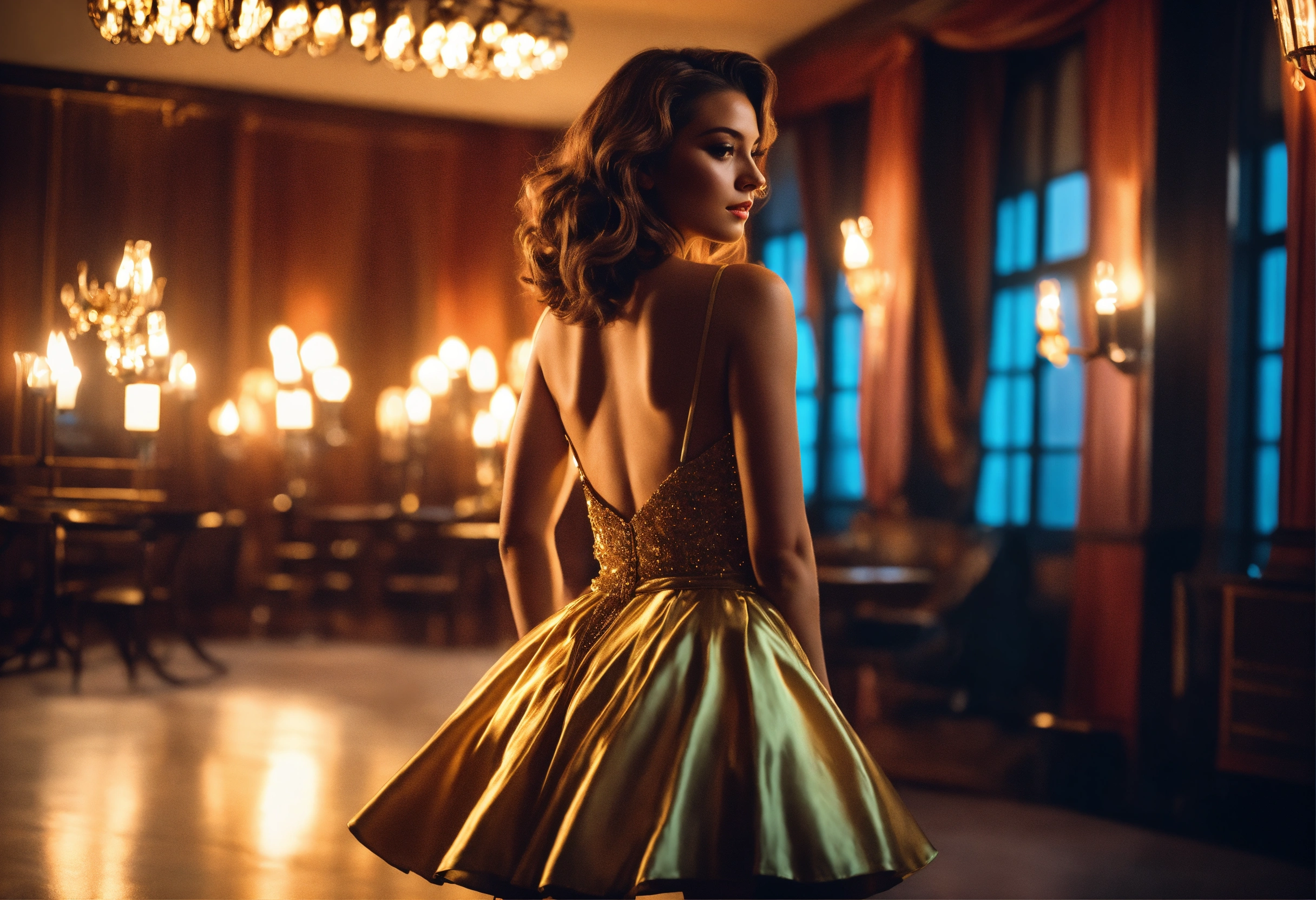 16k portrait, rear view, candlelight, photo-realistic variant brunette hair woman moving while dancing 22 year old pin-up girl in 2023, with little dress, vintage hotel room background with neon light visible through a window, photo -realism, summer dynamism, cinematic, portrait by artgerm, realistic photo studio, black background, photo fusion. photo effects, cinema lighting