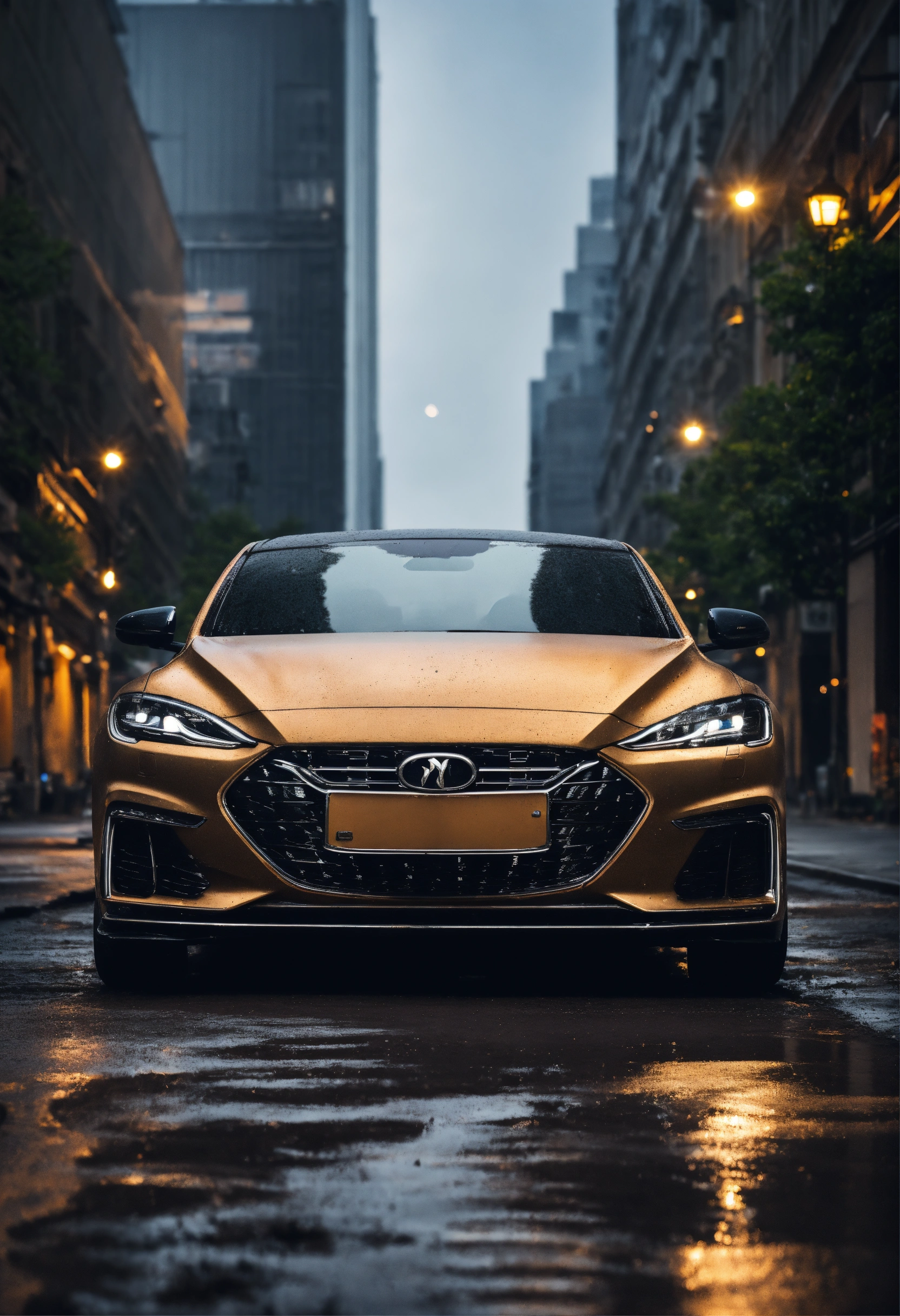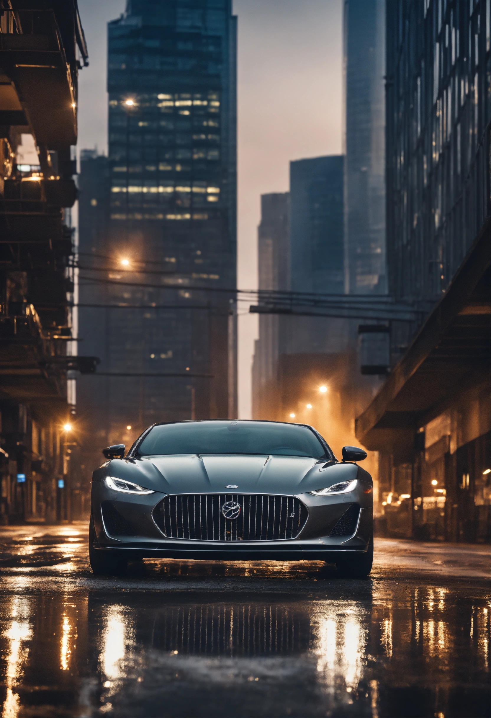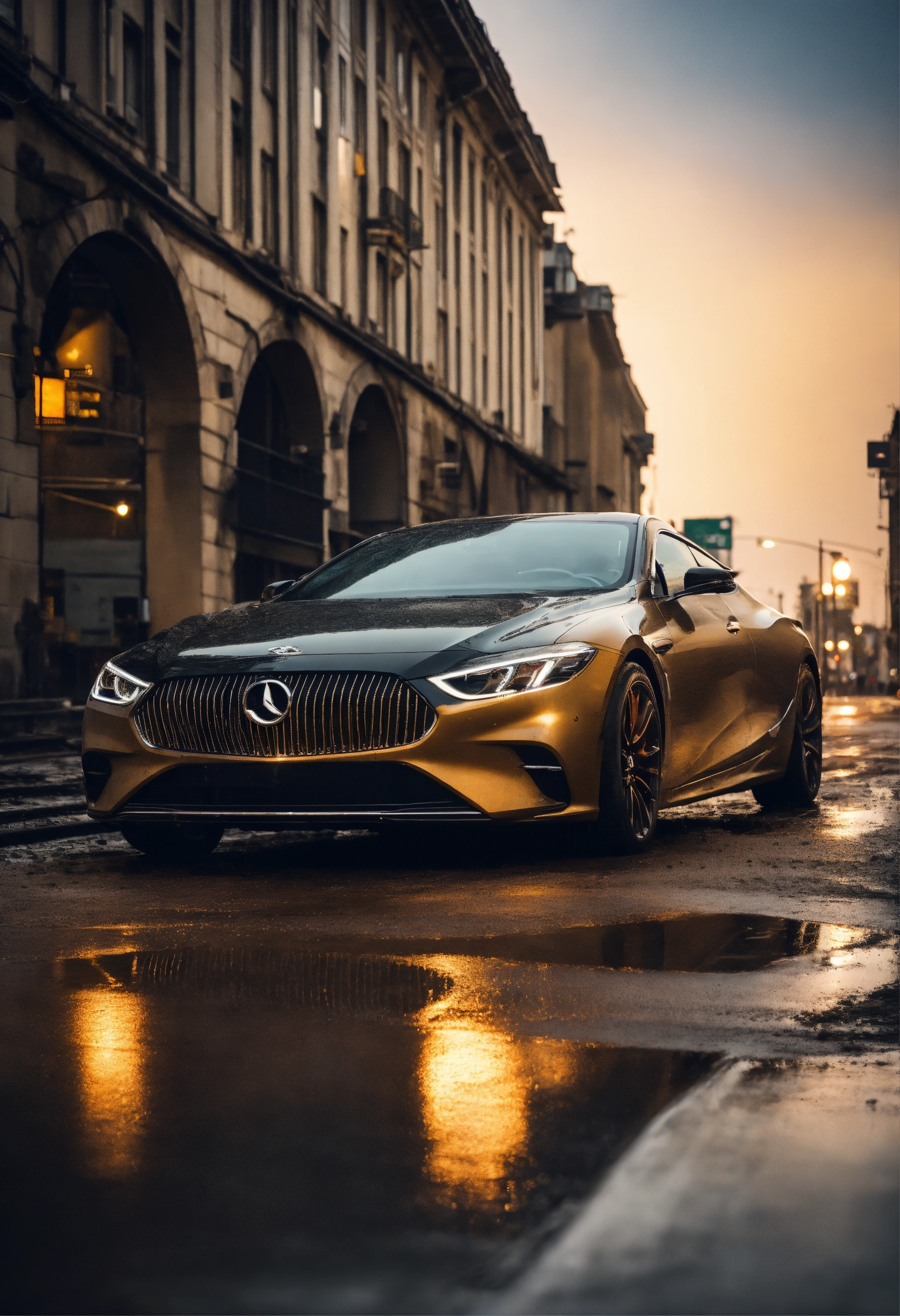 Picture a modern and elegant luxury car with a sleek and aerodynamic design. the image focuses on the front of the vehicle, prominently featuring the hood and the headlights. however, what immediately catches your eye is the car's extremely dirty condition. mud covers the surface of the car, the headlights, and part of the front grille. the background must be a busy city street.