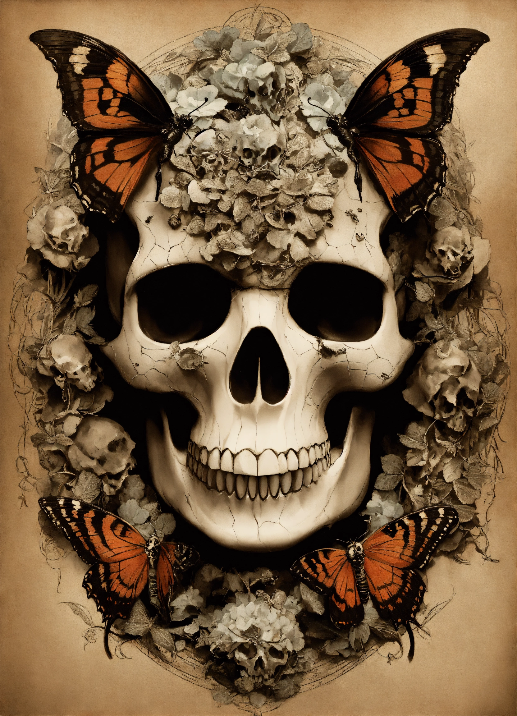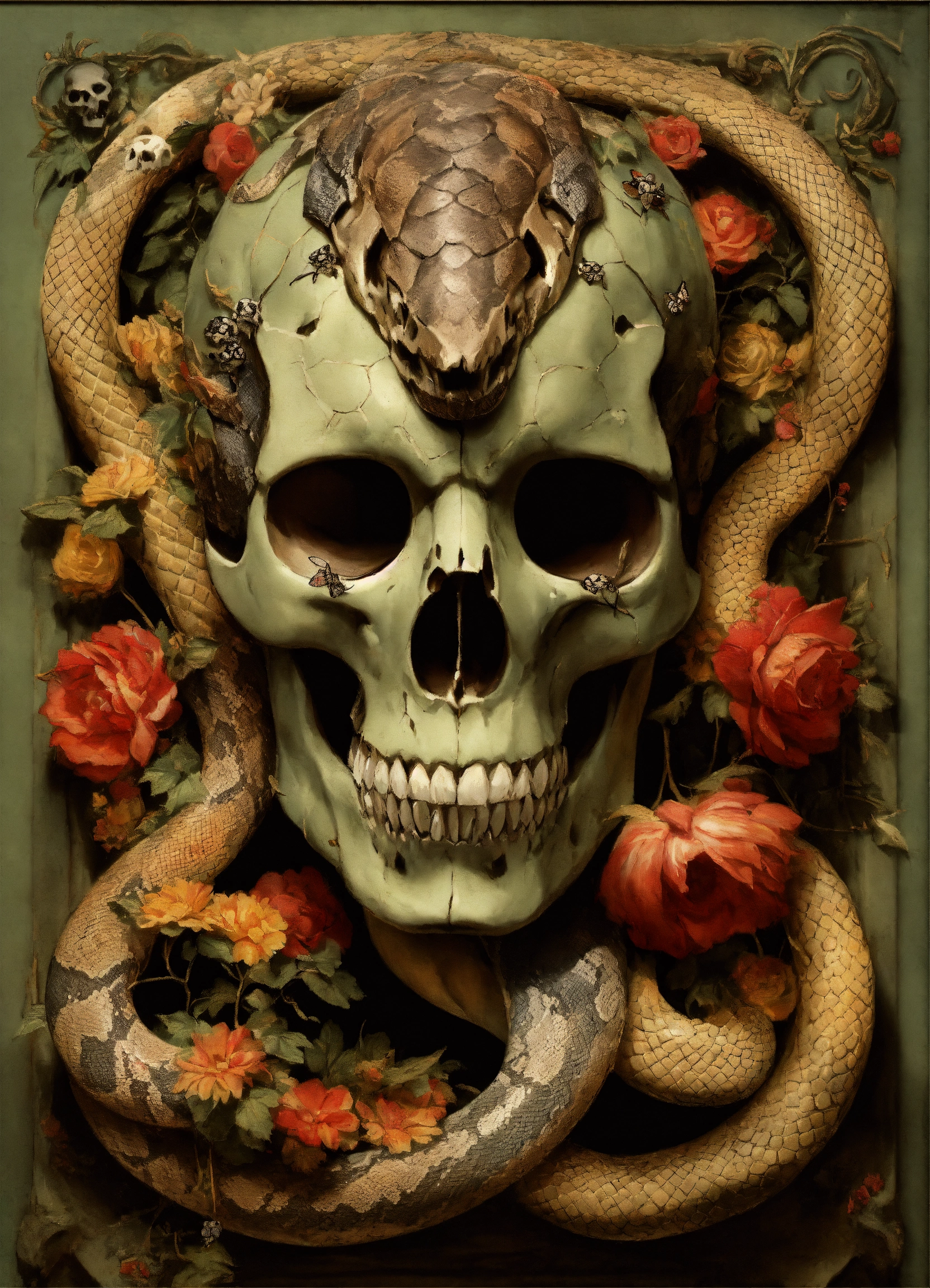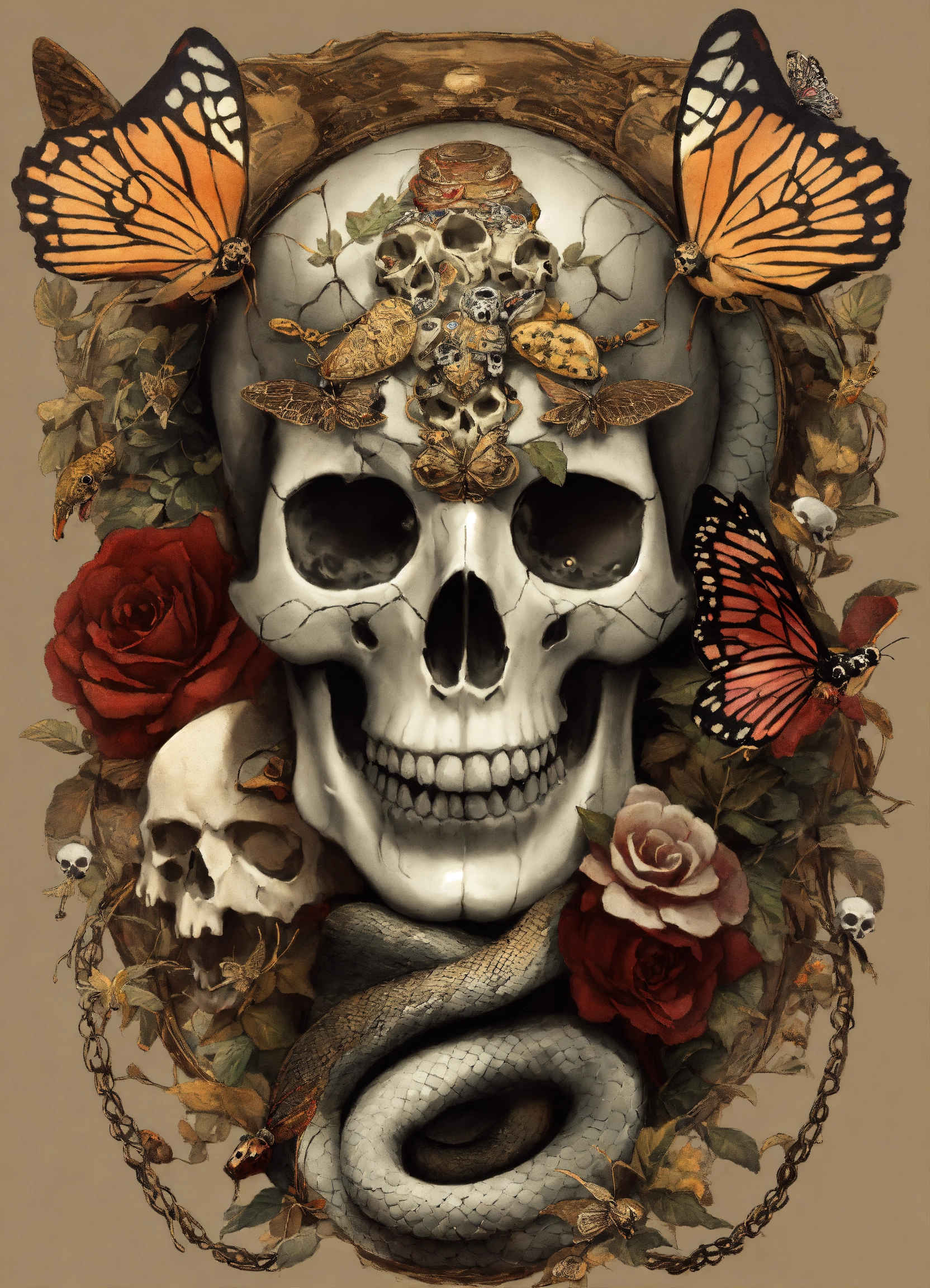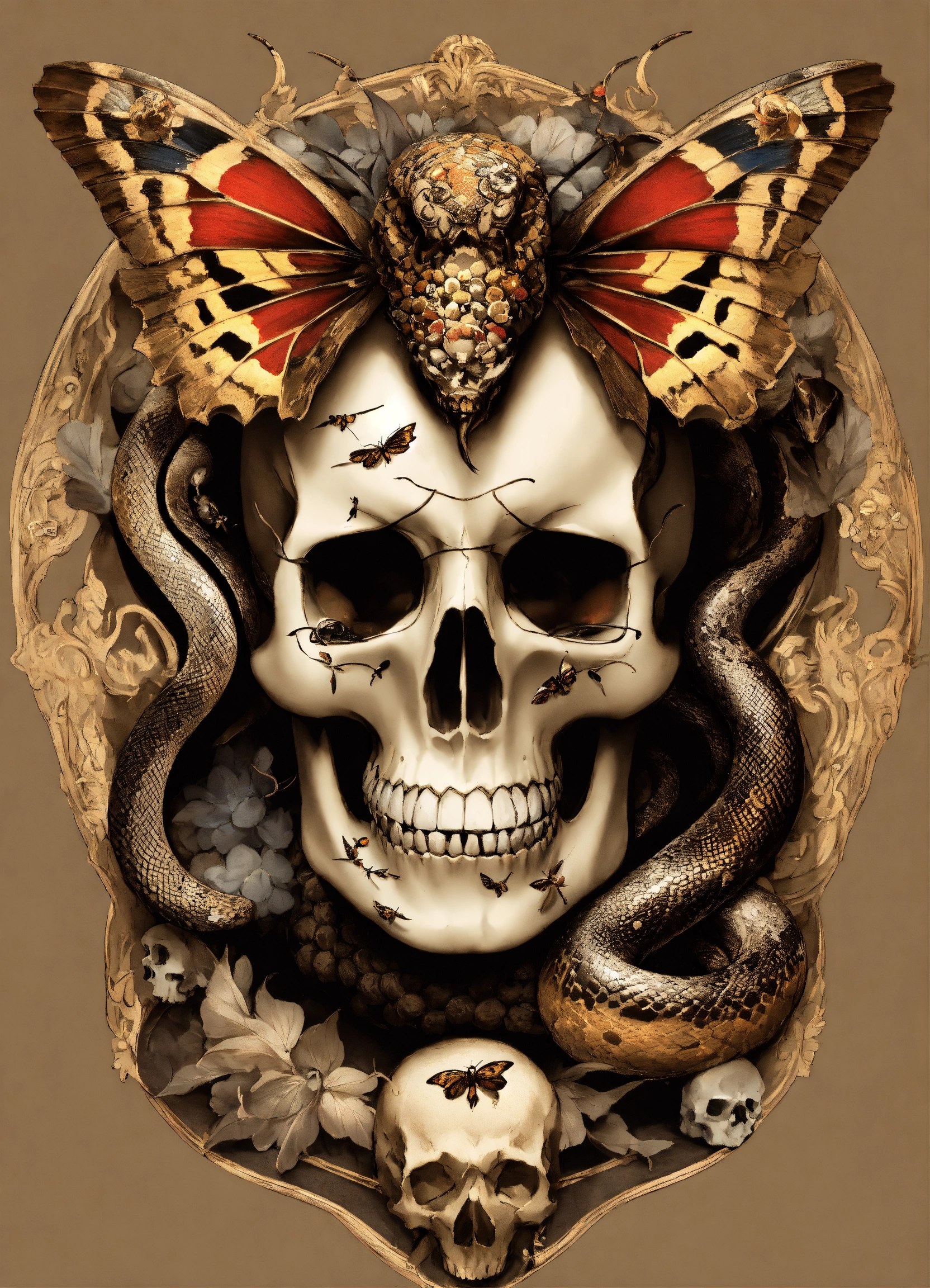 Snake head in the style of david paul seymour with skulls and moths