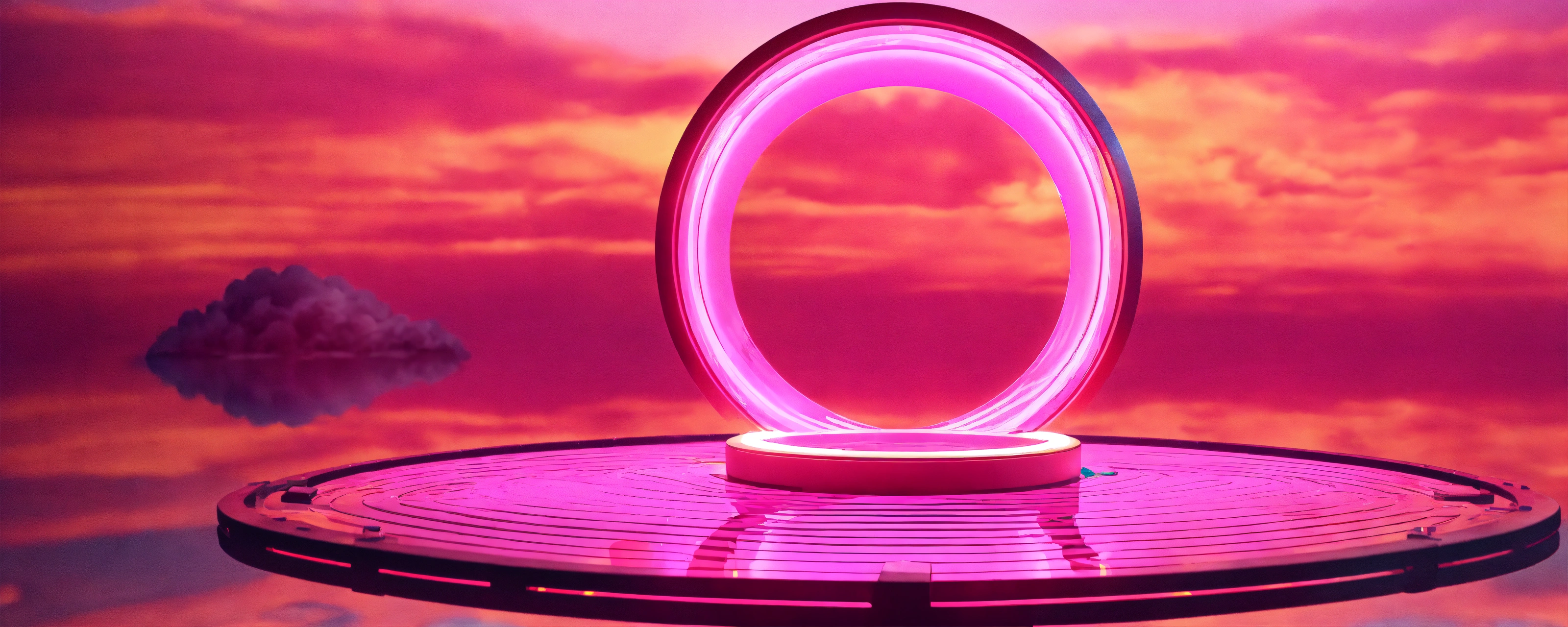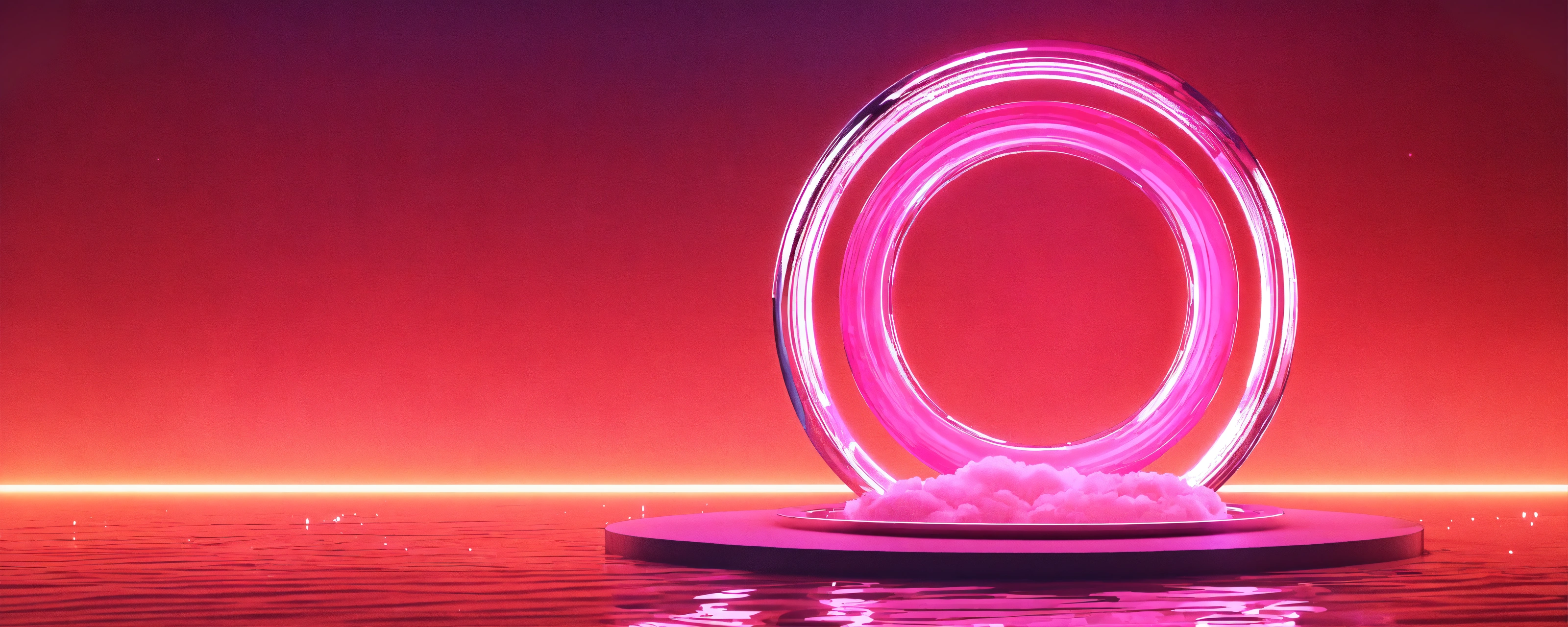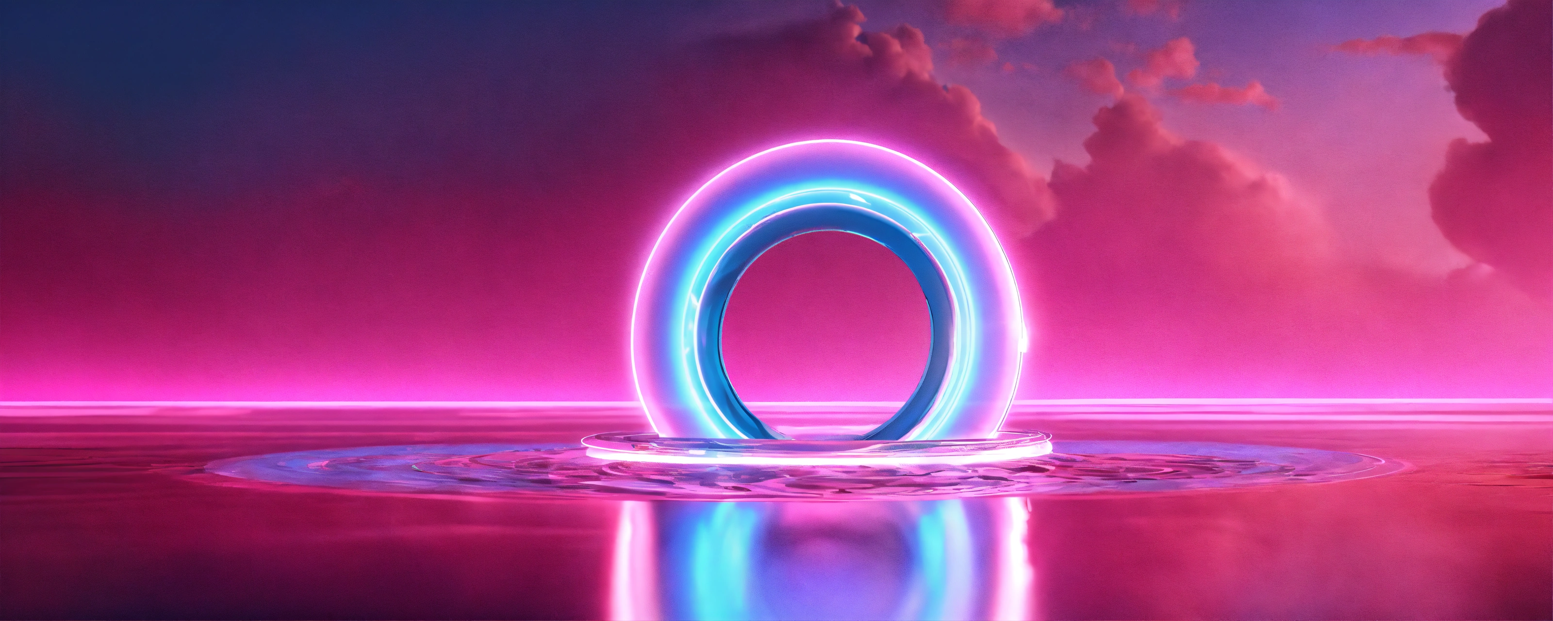 3d render, abstract background with pink cloud levitating inside bright glowing ring, round neon frame, with reflection in the water. minimal futuristic
