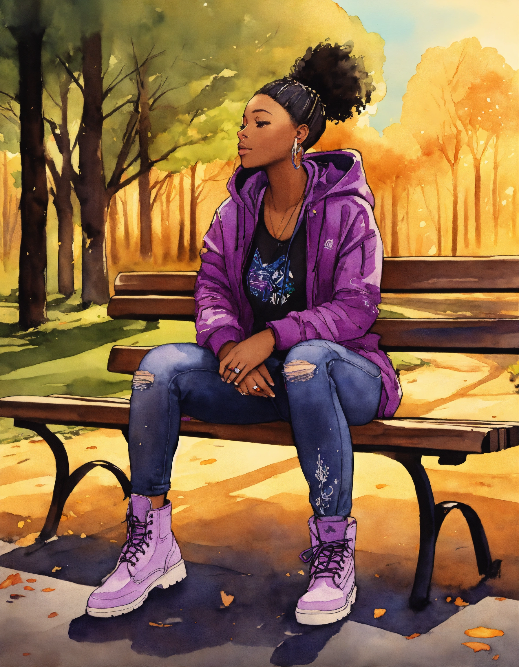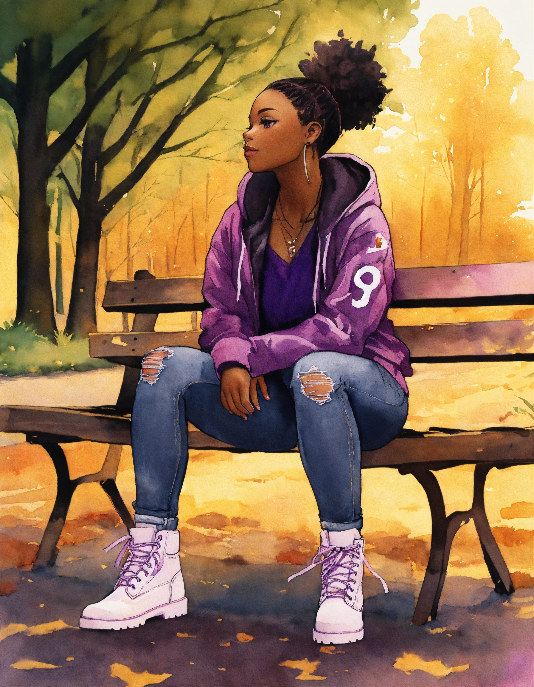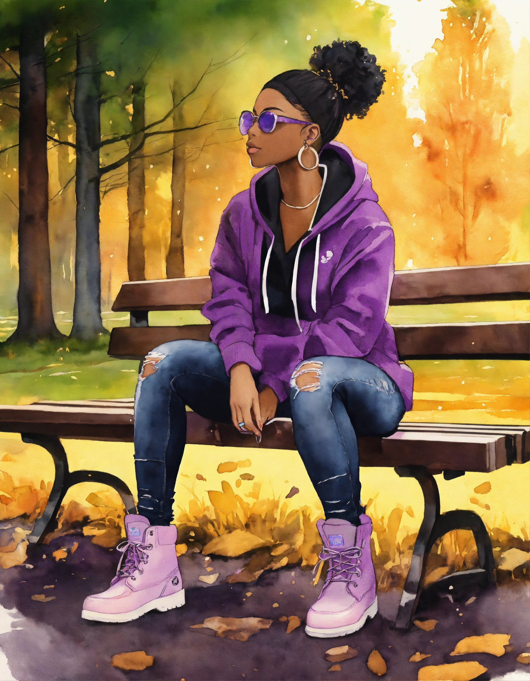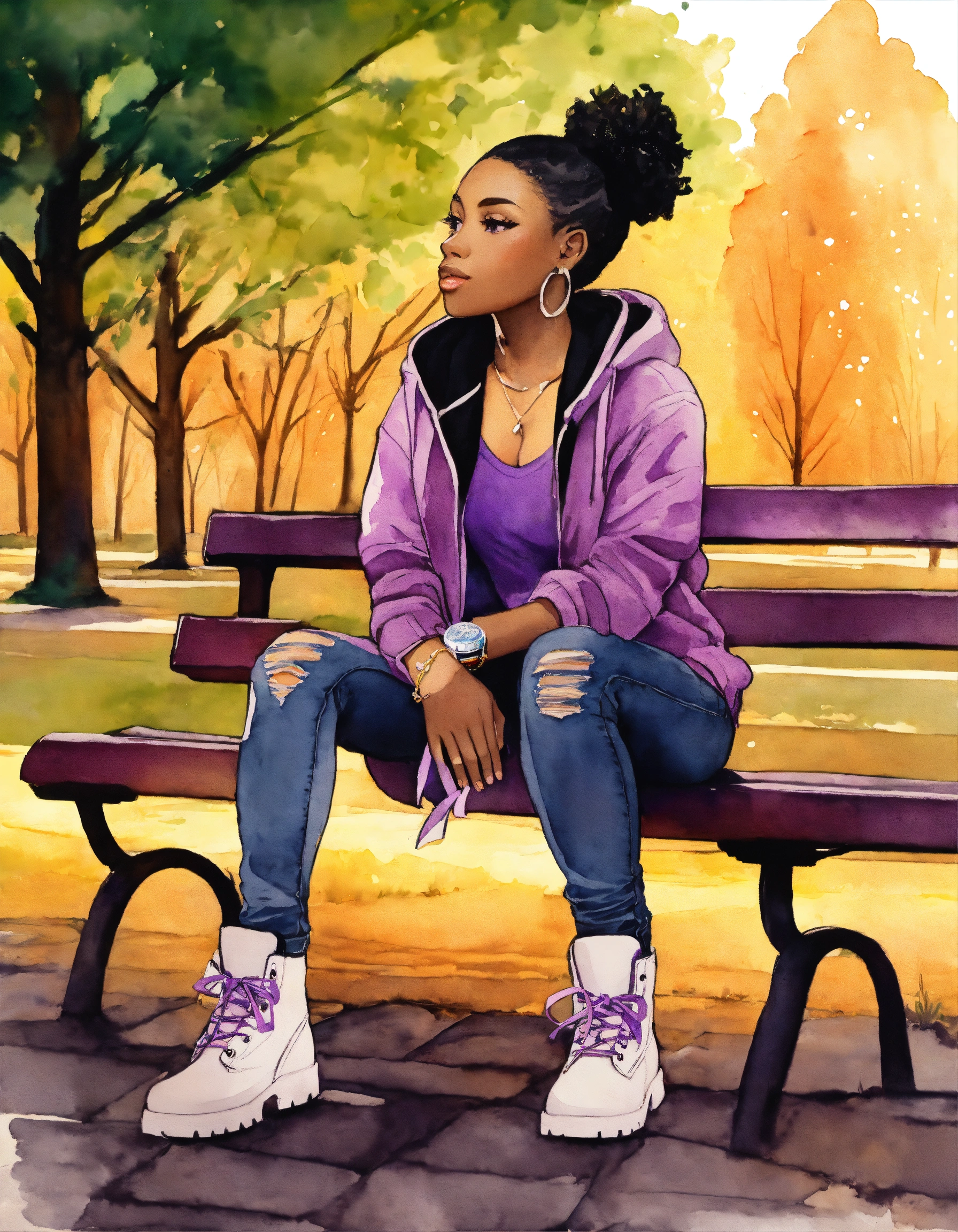 Stylized watercolor, african american woman, dressed in black ripped jeans, purple hoodie, and matching timberland boots. sitting on a bench on a park pathway. a lupus ribbon (similar to beast cancer ribbon) shimmering with blings, is behind her, signifying alliance with the cause. the artwork is marked by clean, detailed lines, ensuring the sharpness and precision of a 300 dpi illustration, vector, contour, white background. rule of thirds placement