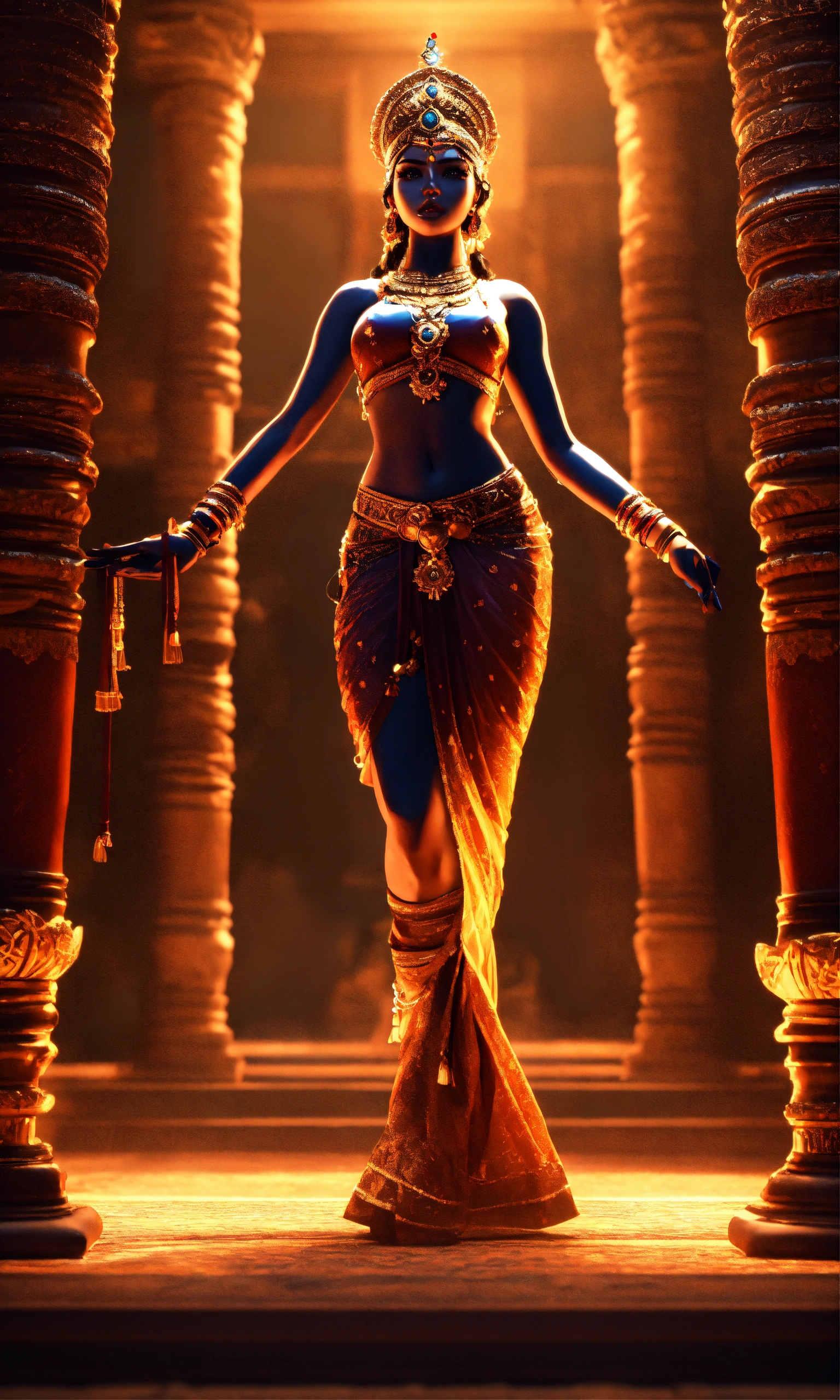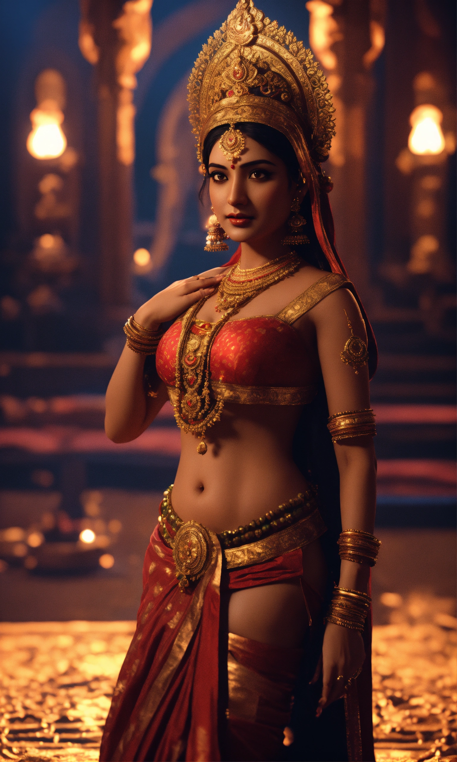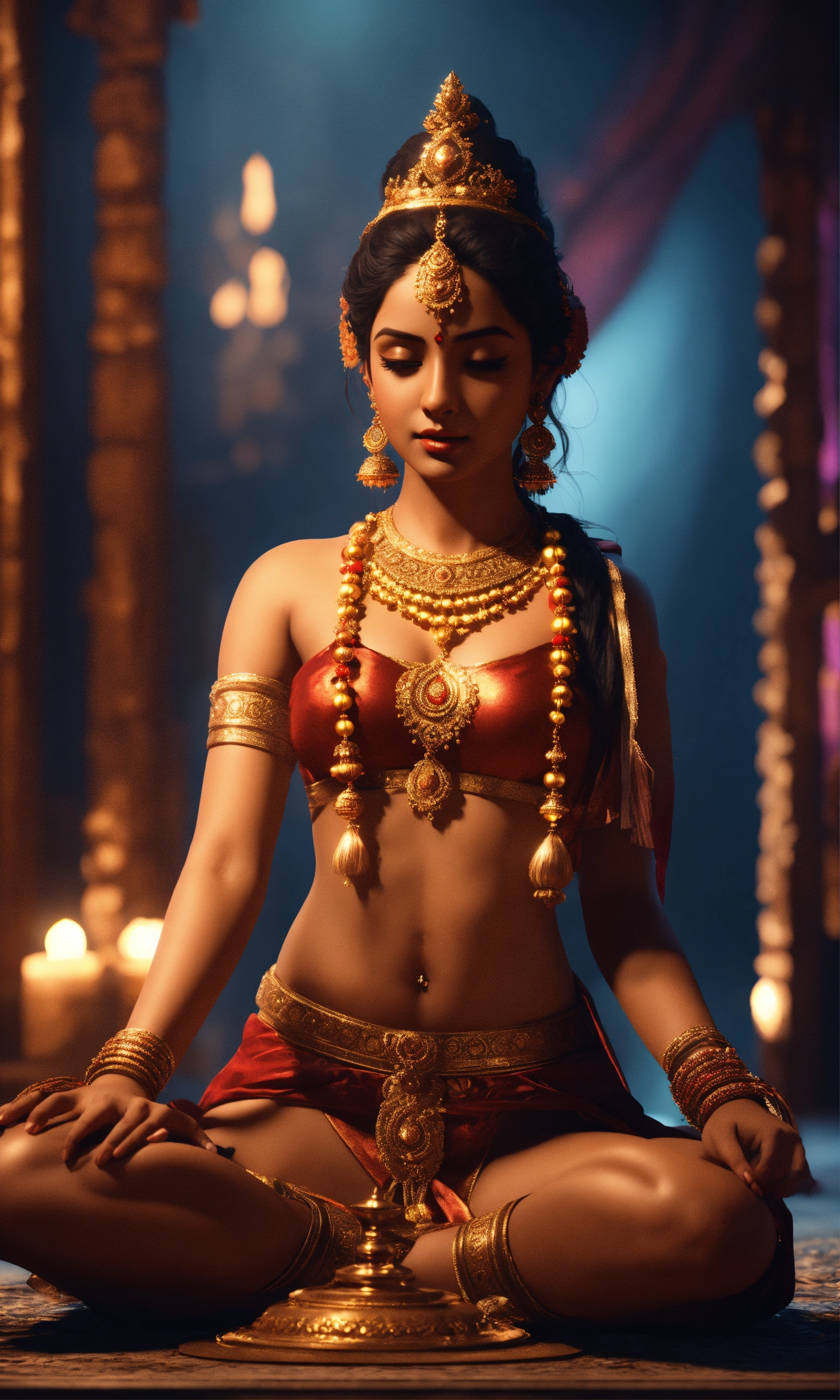 Indian actress kamasutra character art in blender 3d using cycles renderer in a volumetric light in a dark environment godly environment, 4k, crisp, vray, relatable background, wlop style