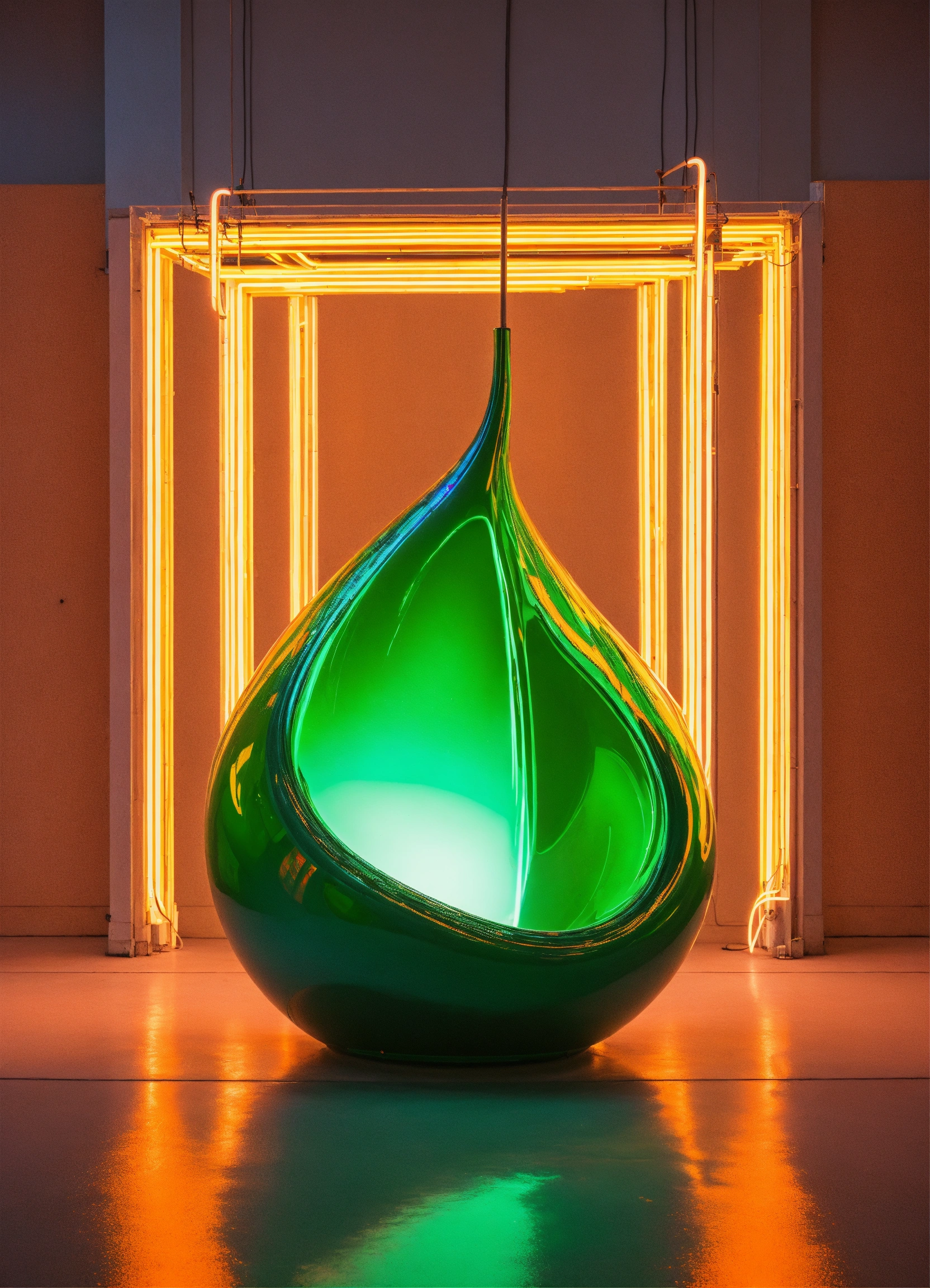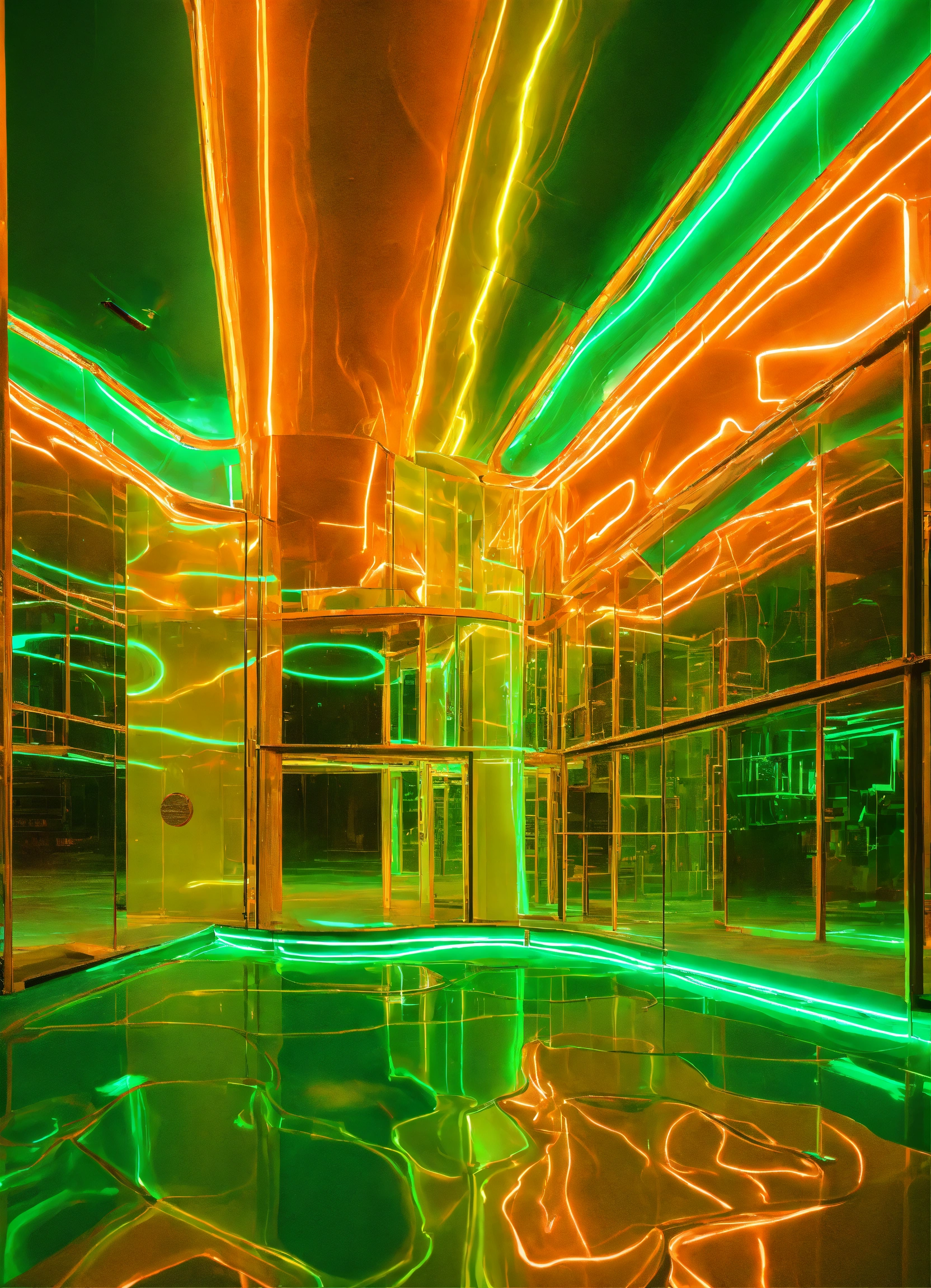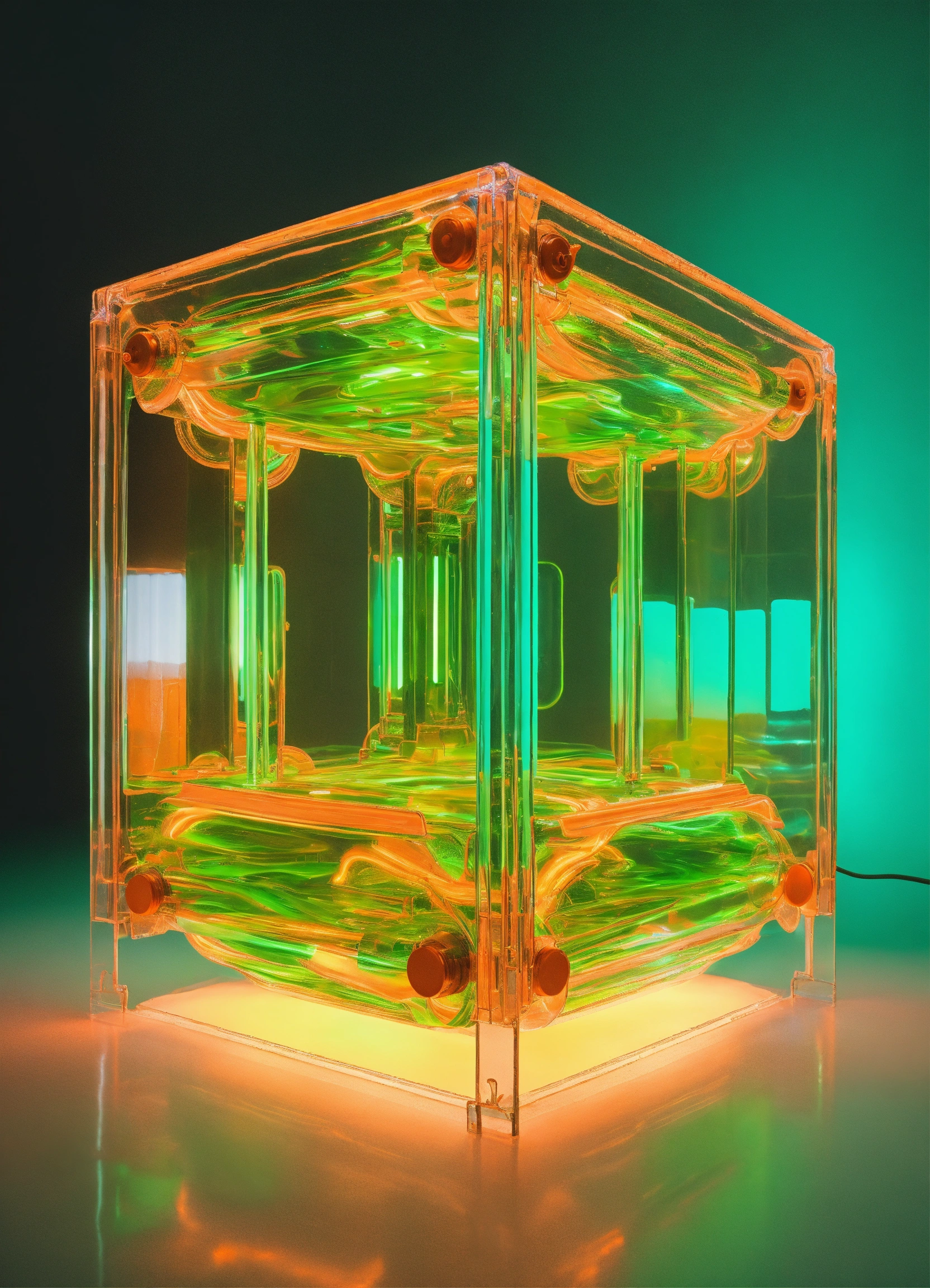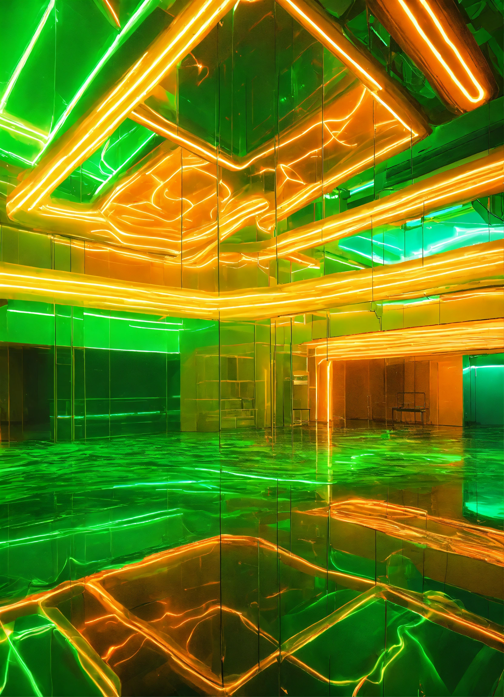 Glassy surface, green and orange color theme, surreal magnificent object, energy radiates and fluorescent neon light, an enormous mass that defies perception.