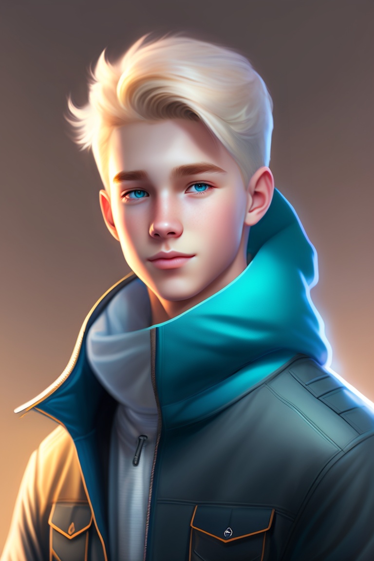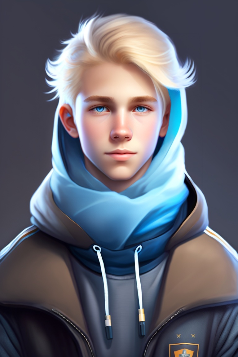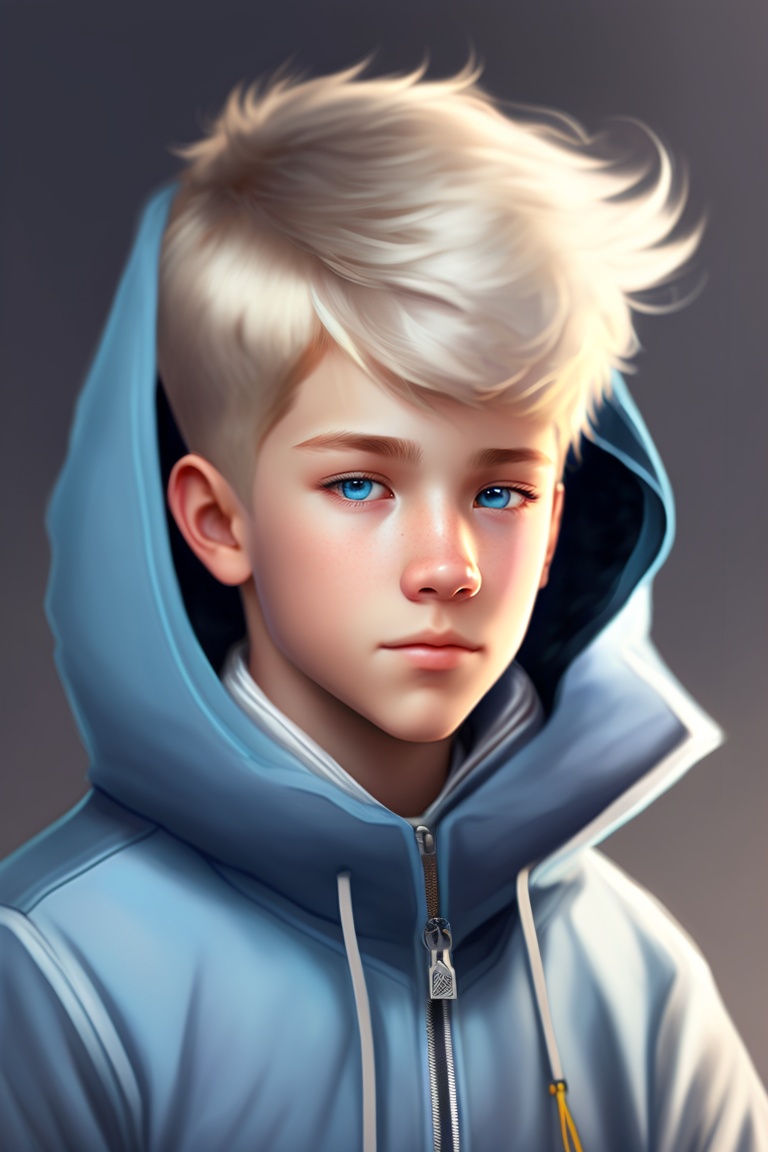 Fourteen year old male, light blonde hair, light blue eyes, dark background, hoodie, relaxing, path traced, highly detailed, high quality, digital painting, beautiful details, soft and cosy