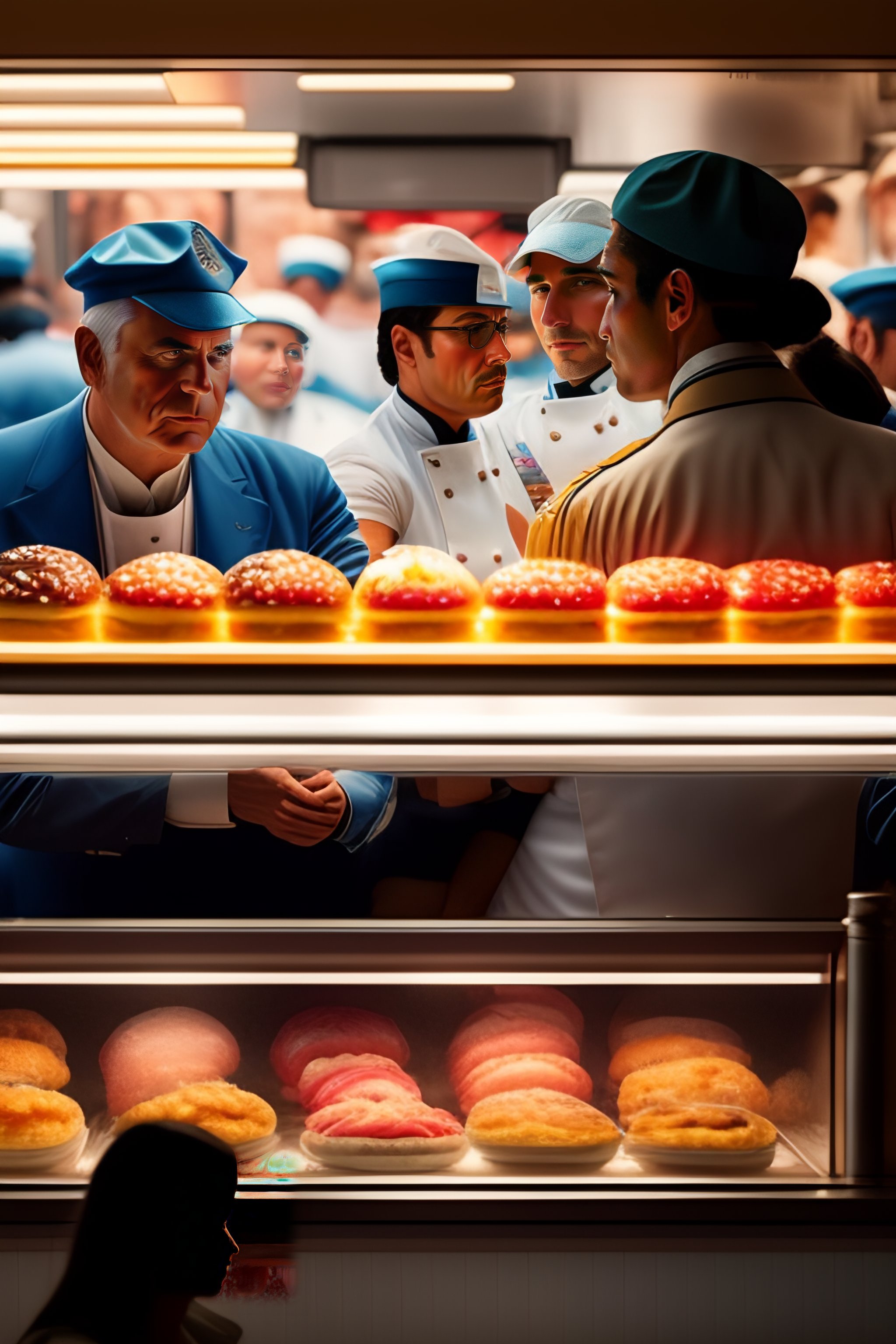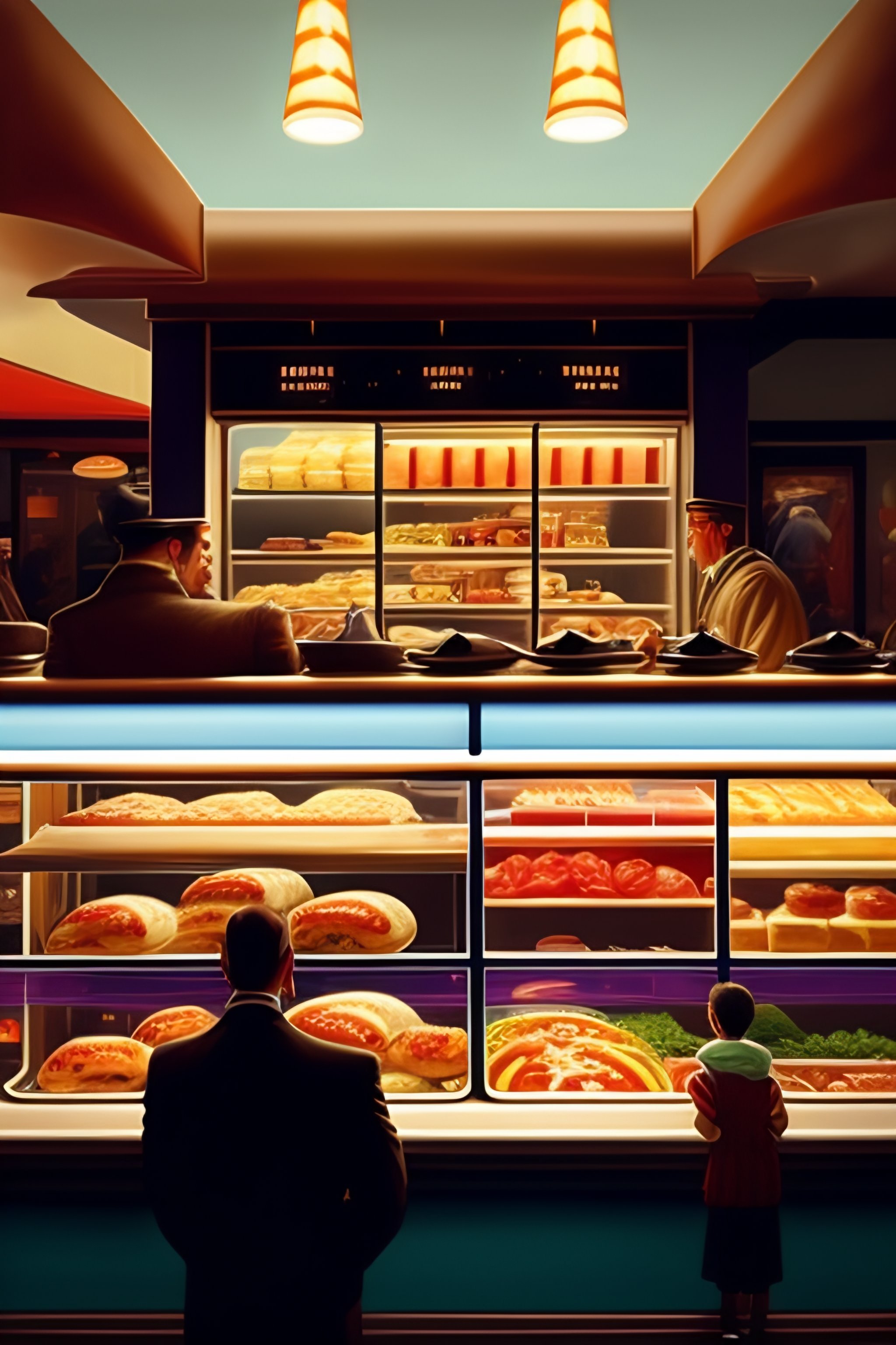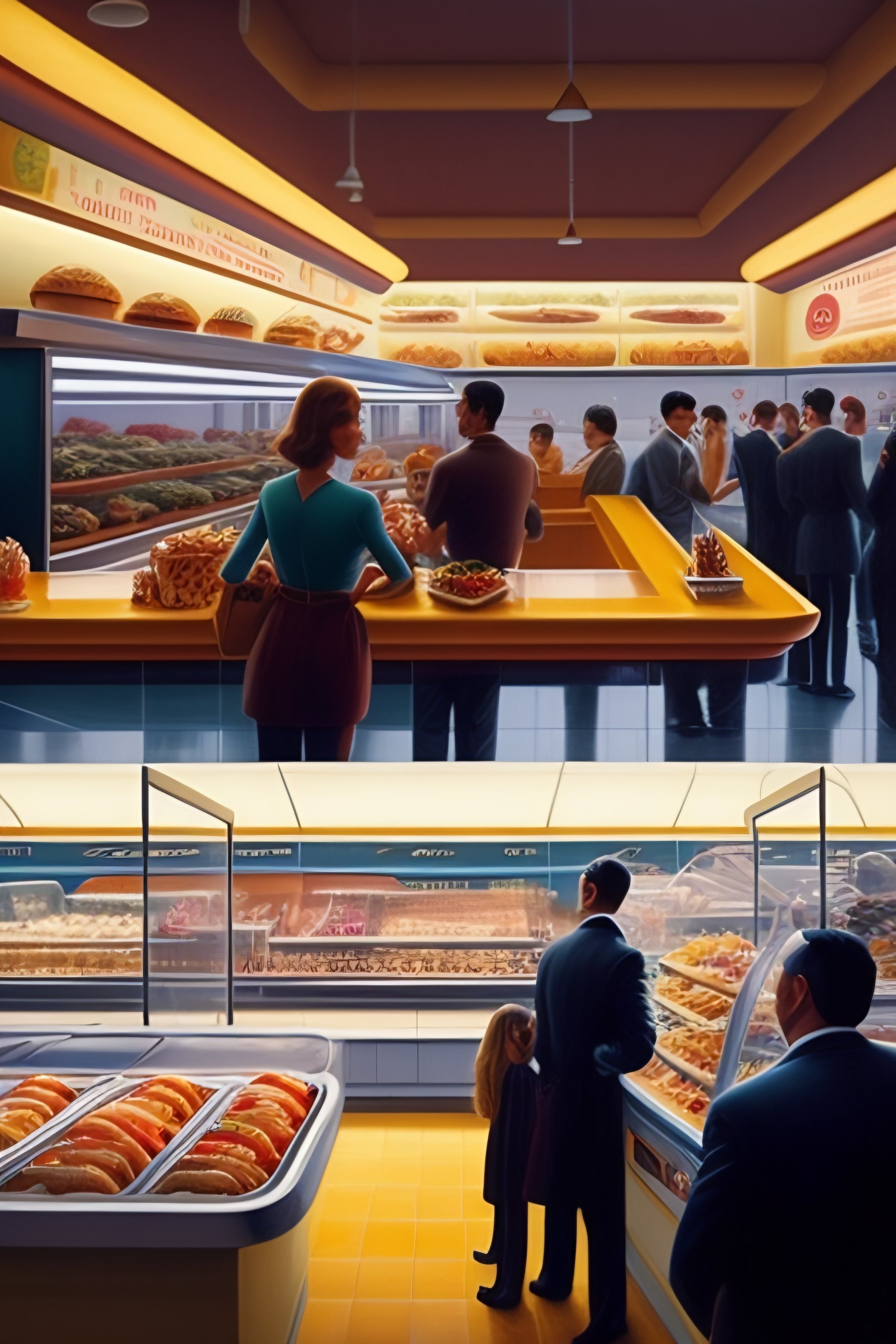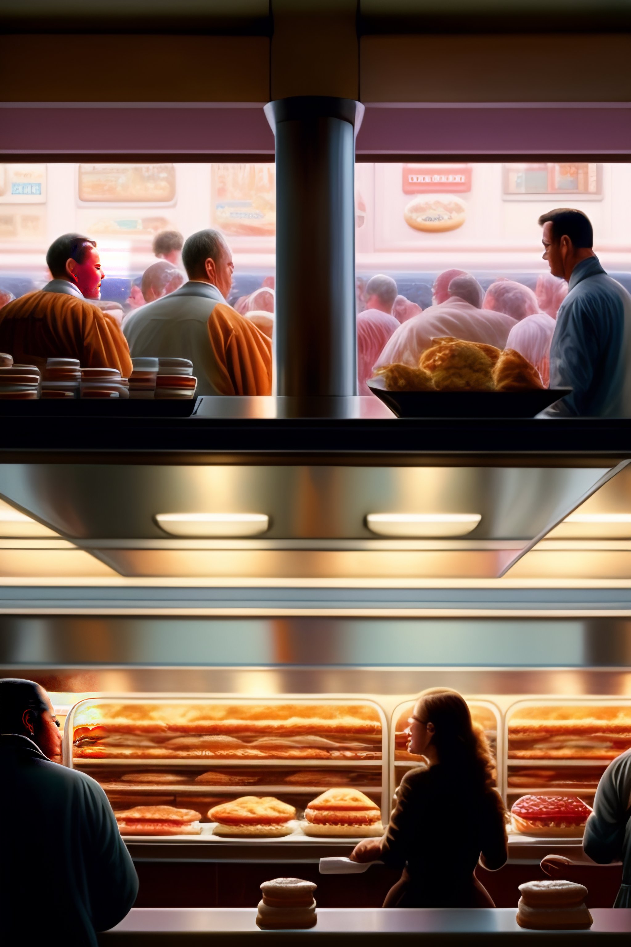A realistic view inside of a fastfood restaurant, with customers placing order, and cashiers and cooks running around in style of wayne thiebaud and bosch