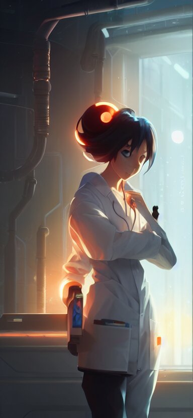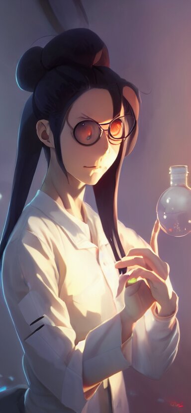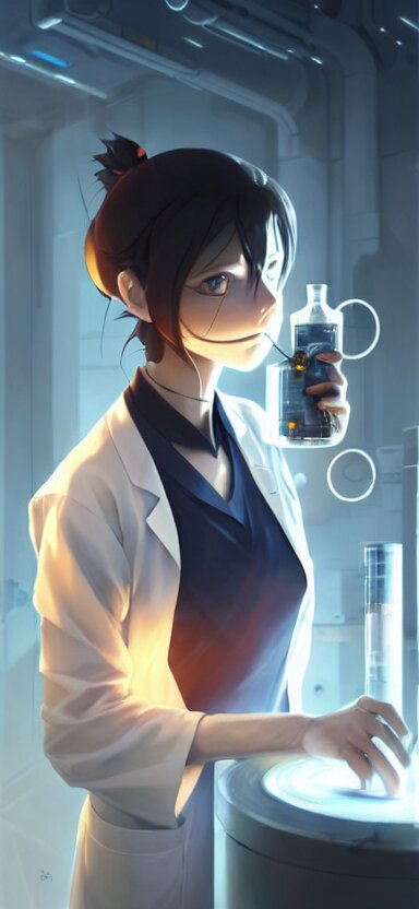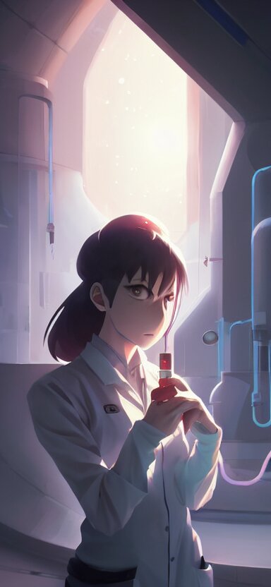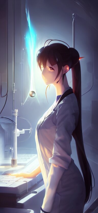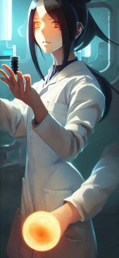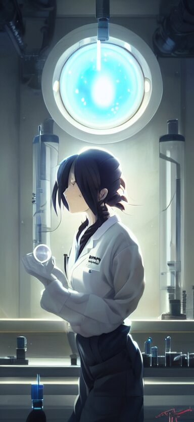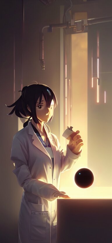 An anime concept art of a beautiful young female scientist in a laboratory holding a small black hole in her hands, style by jordan grimmer and greg rutkowski, ponytail, elegant, sharp focus, morandi color scheme, illustration, high quality, highly detailed, digital art, hyperrealism