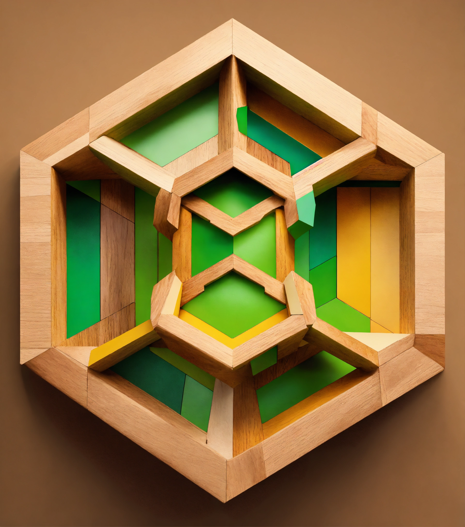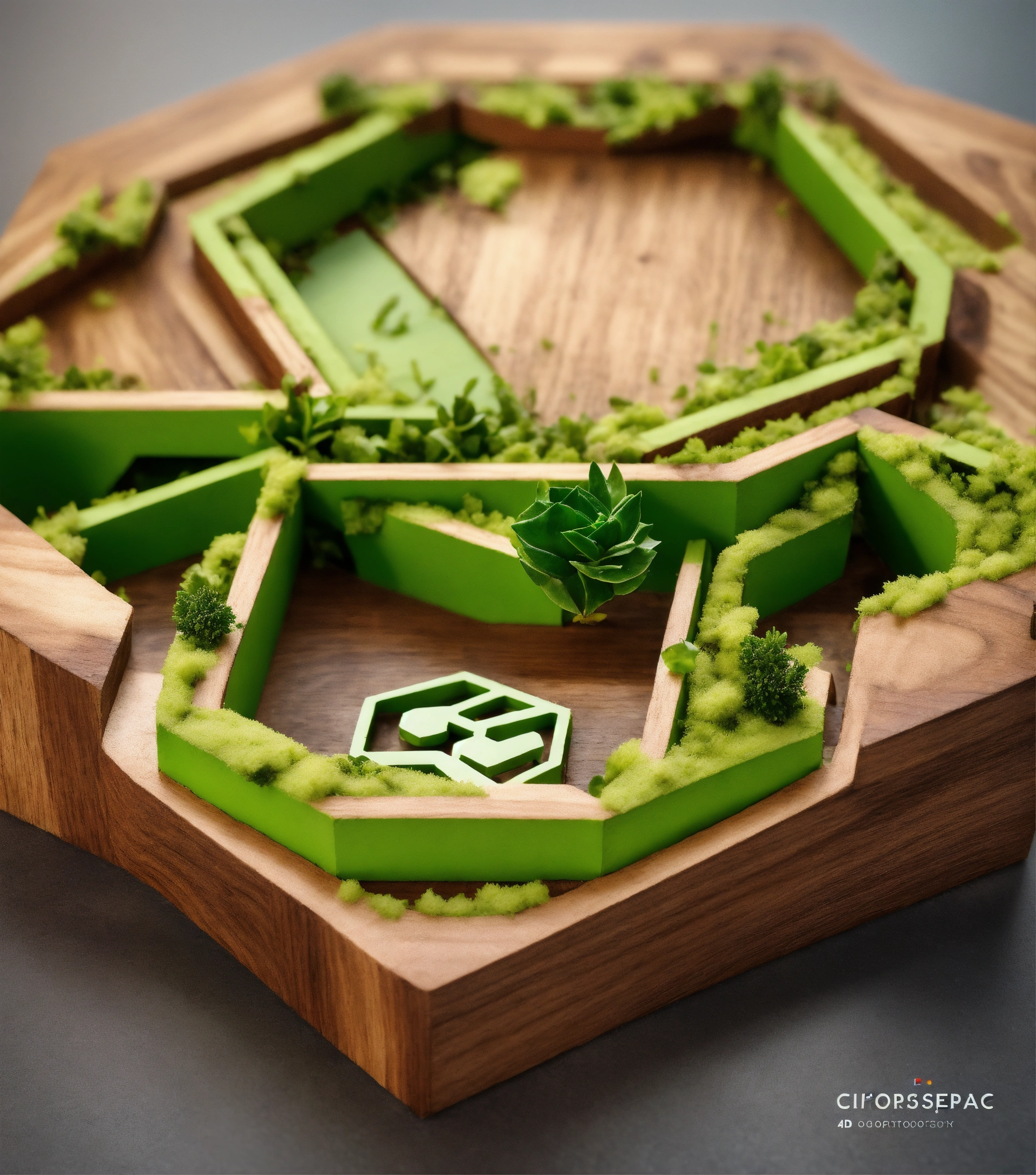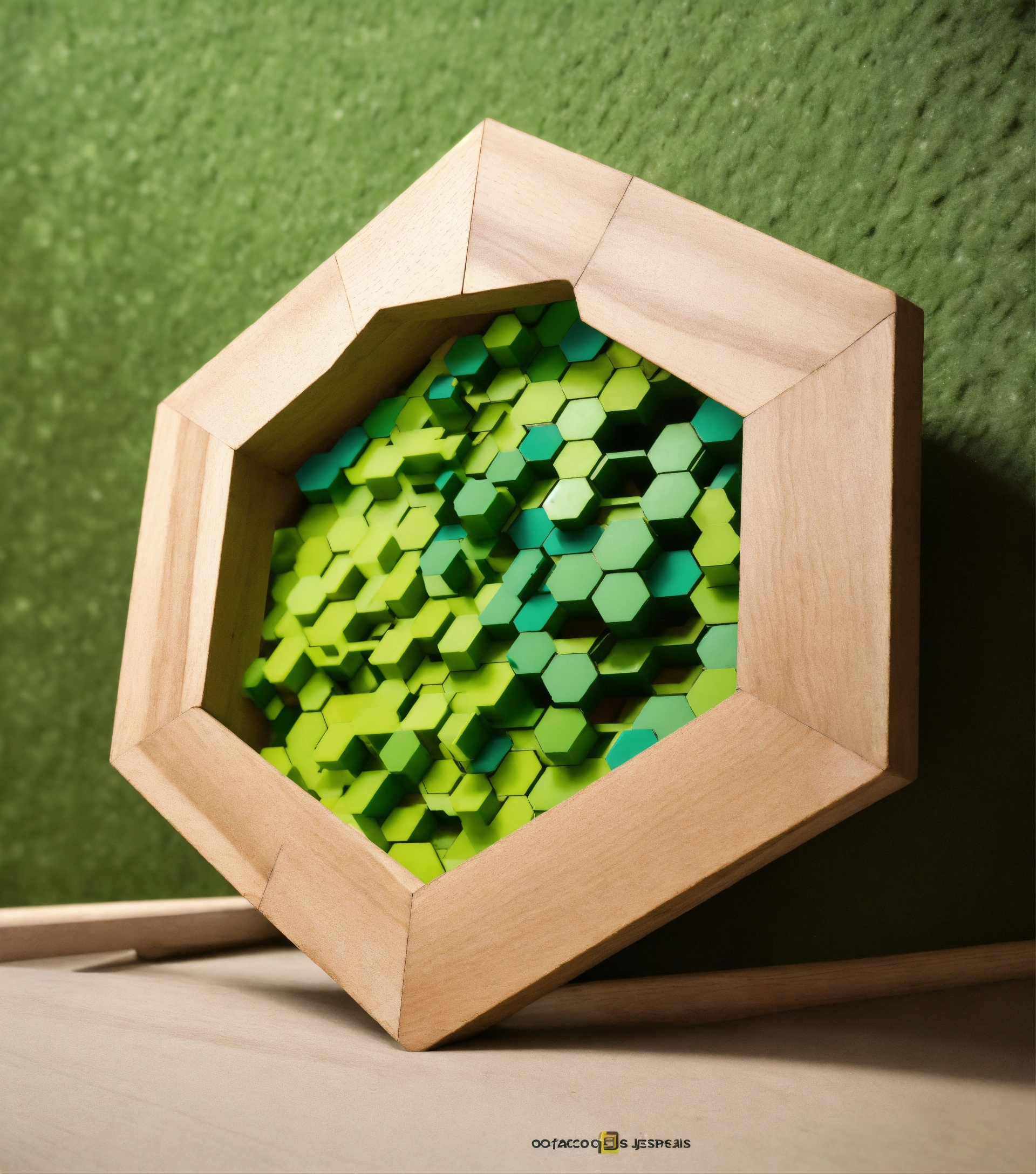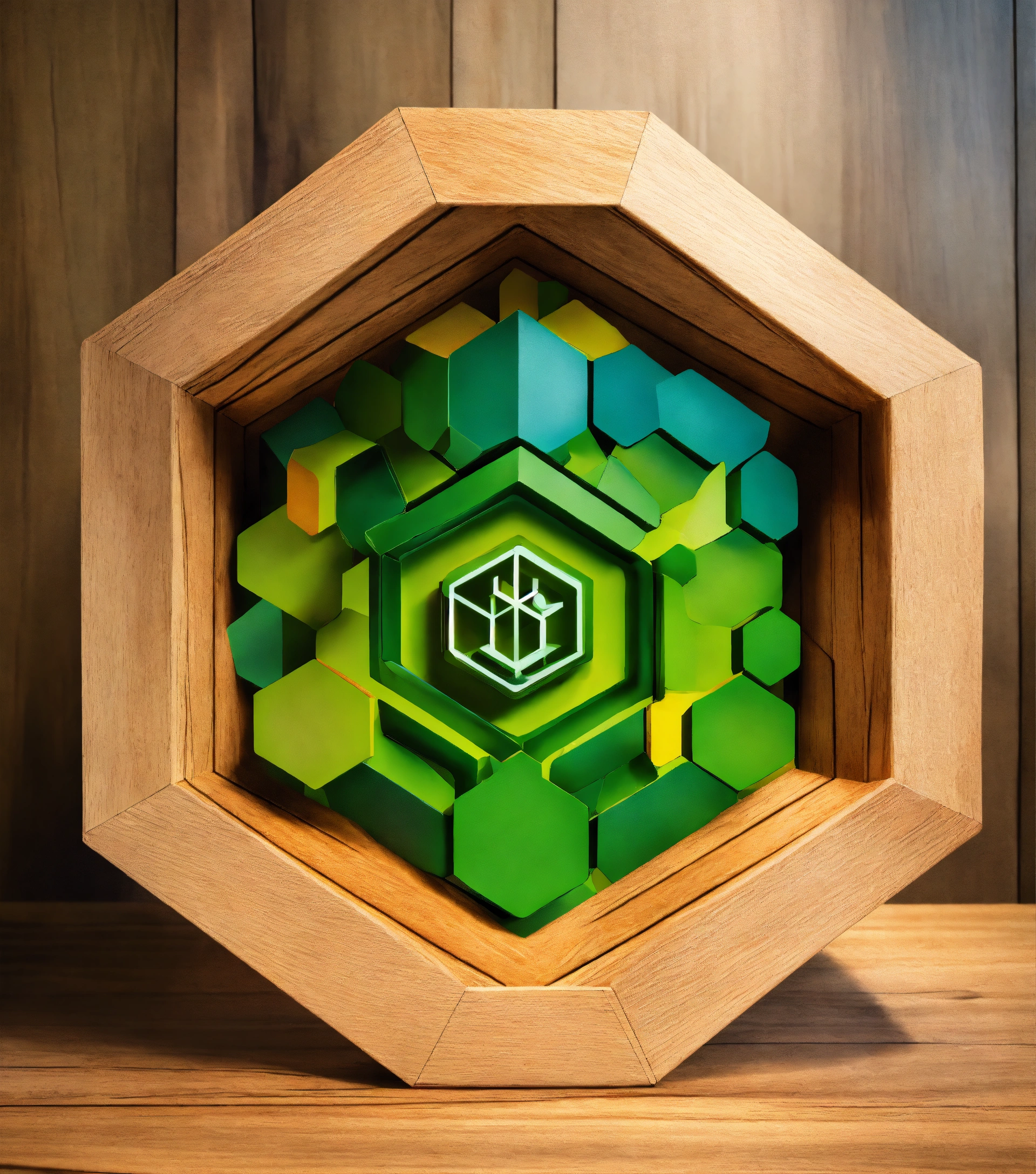 Logotipo enmarcado en un hexagono 3d de madera, de estructuras sostenibles, con muchas ojas verdes, orgánicos, marca, sofisticación, corporativo moderno, sin texto, moderno, arte vectorial, logo, ciberspace, google, seo.