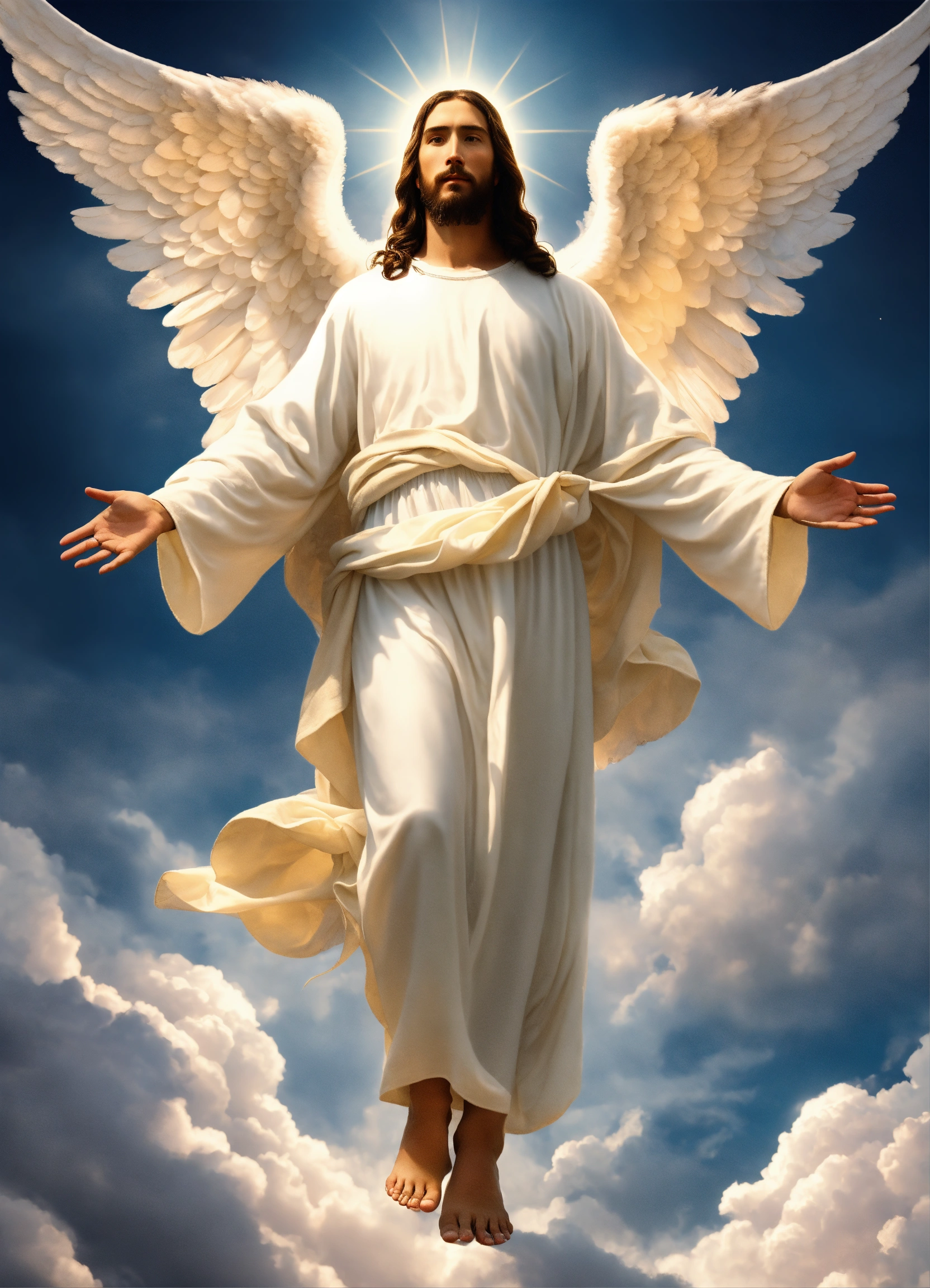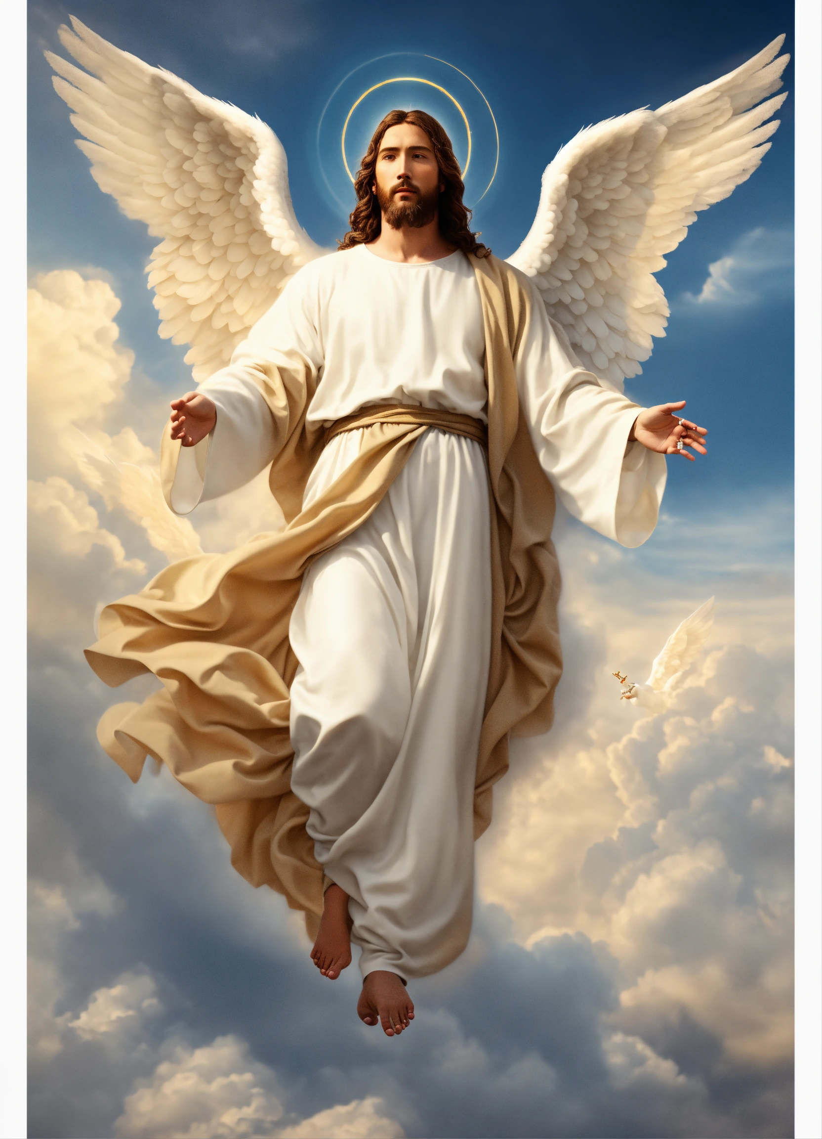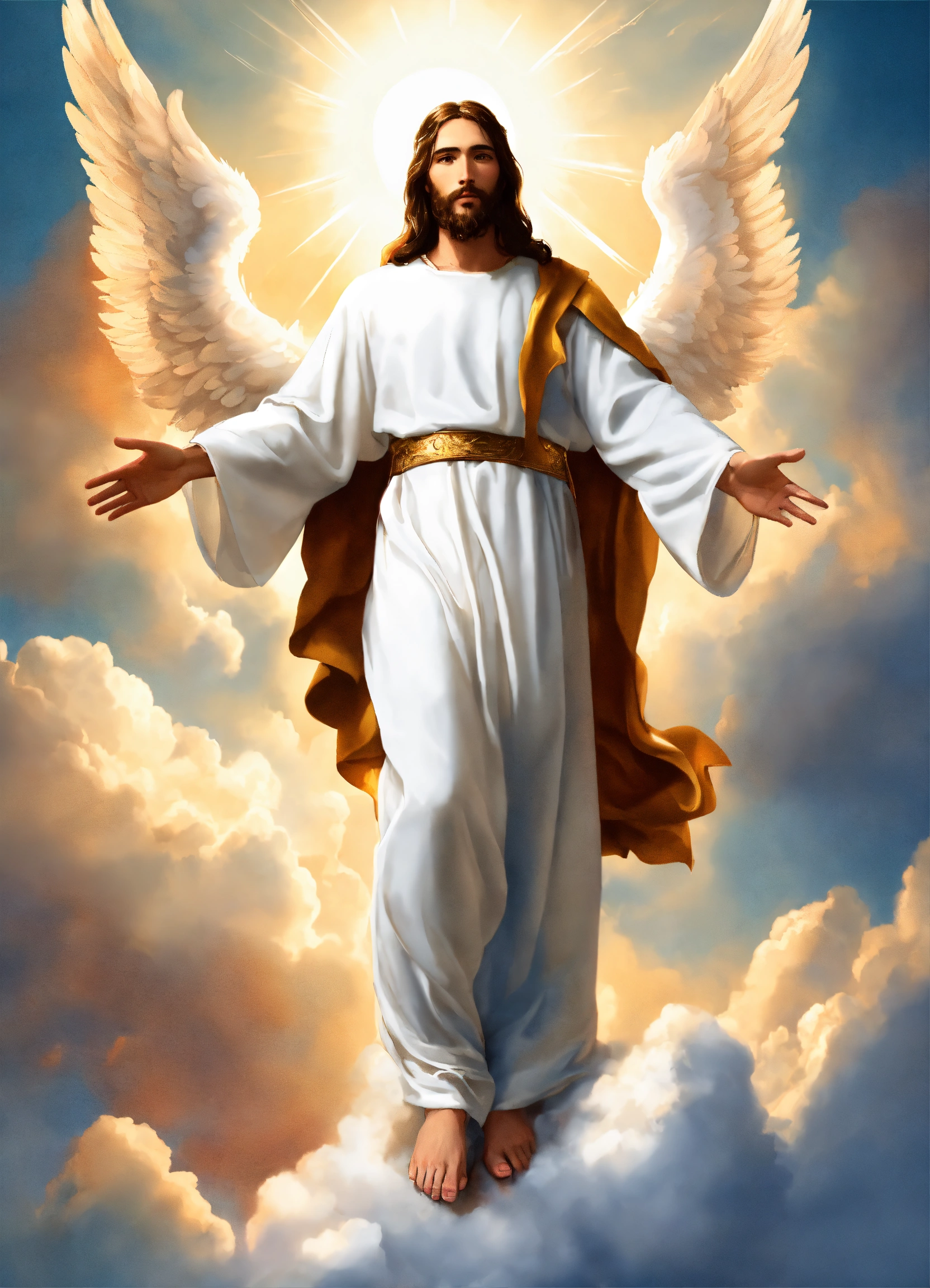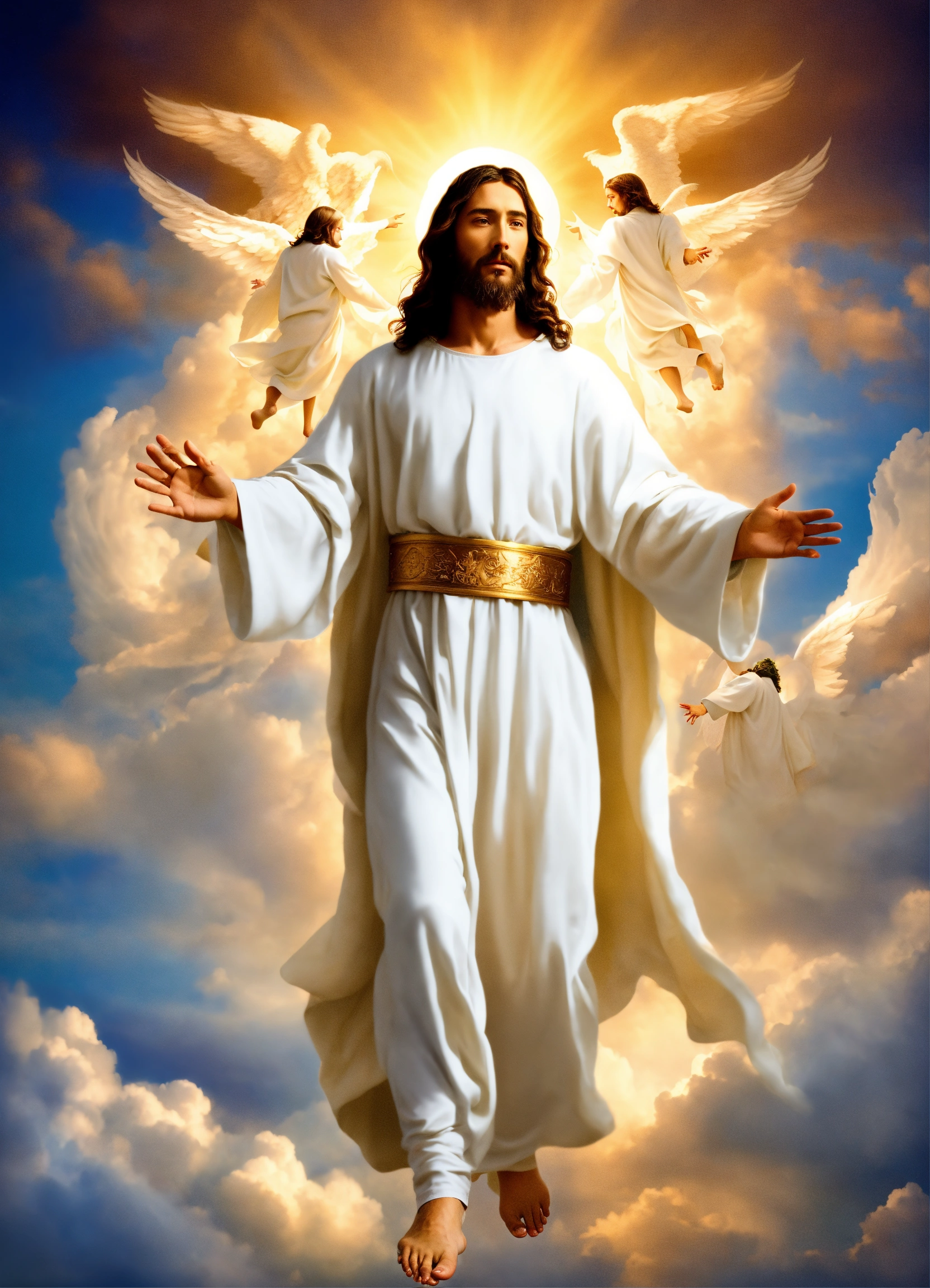 Jesus christ on the clouds wearing white garment with angels on his feet