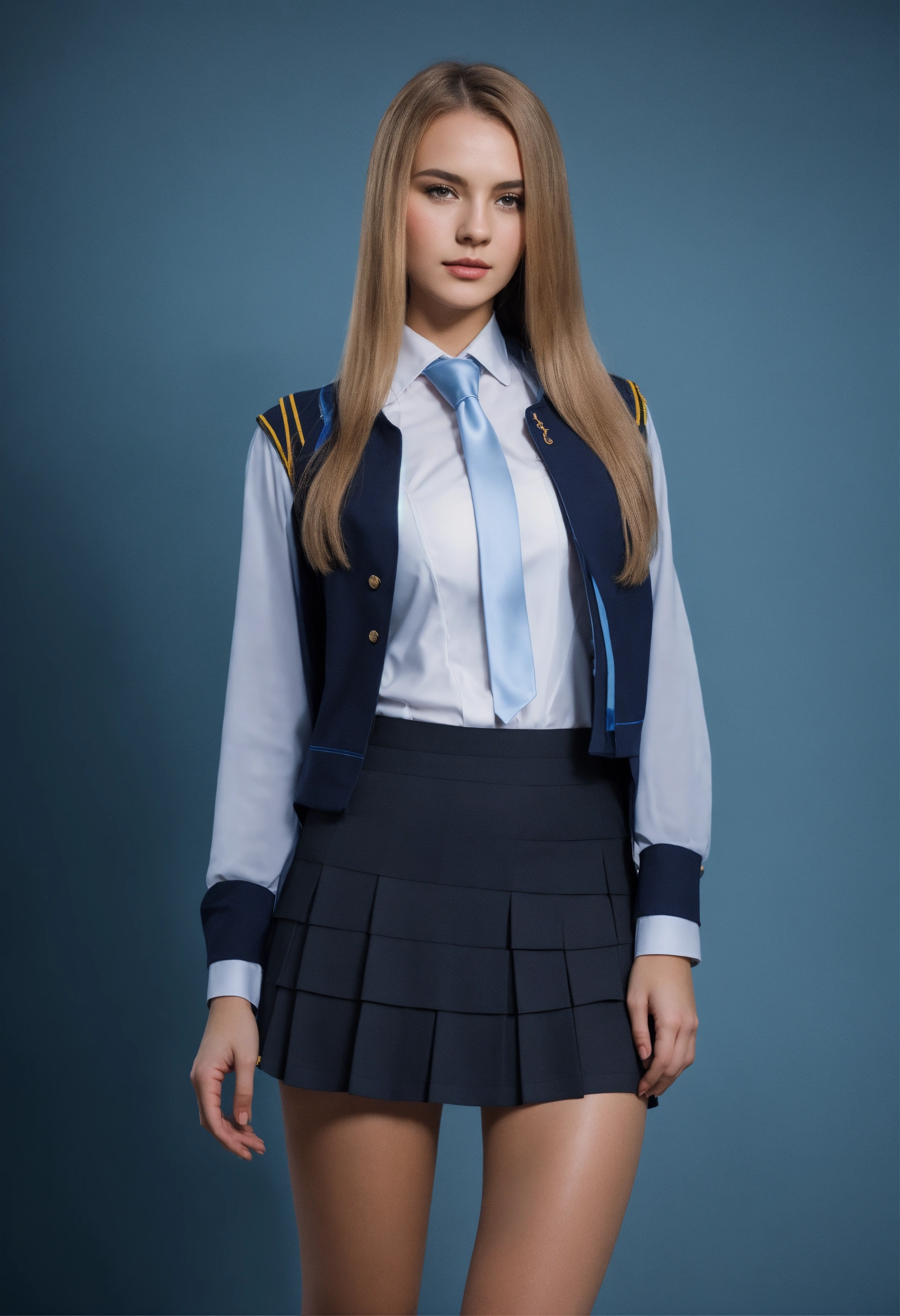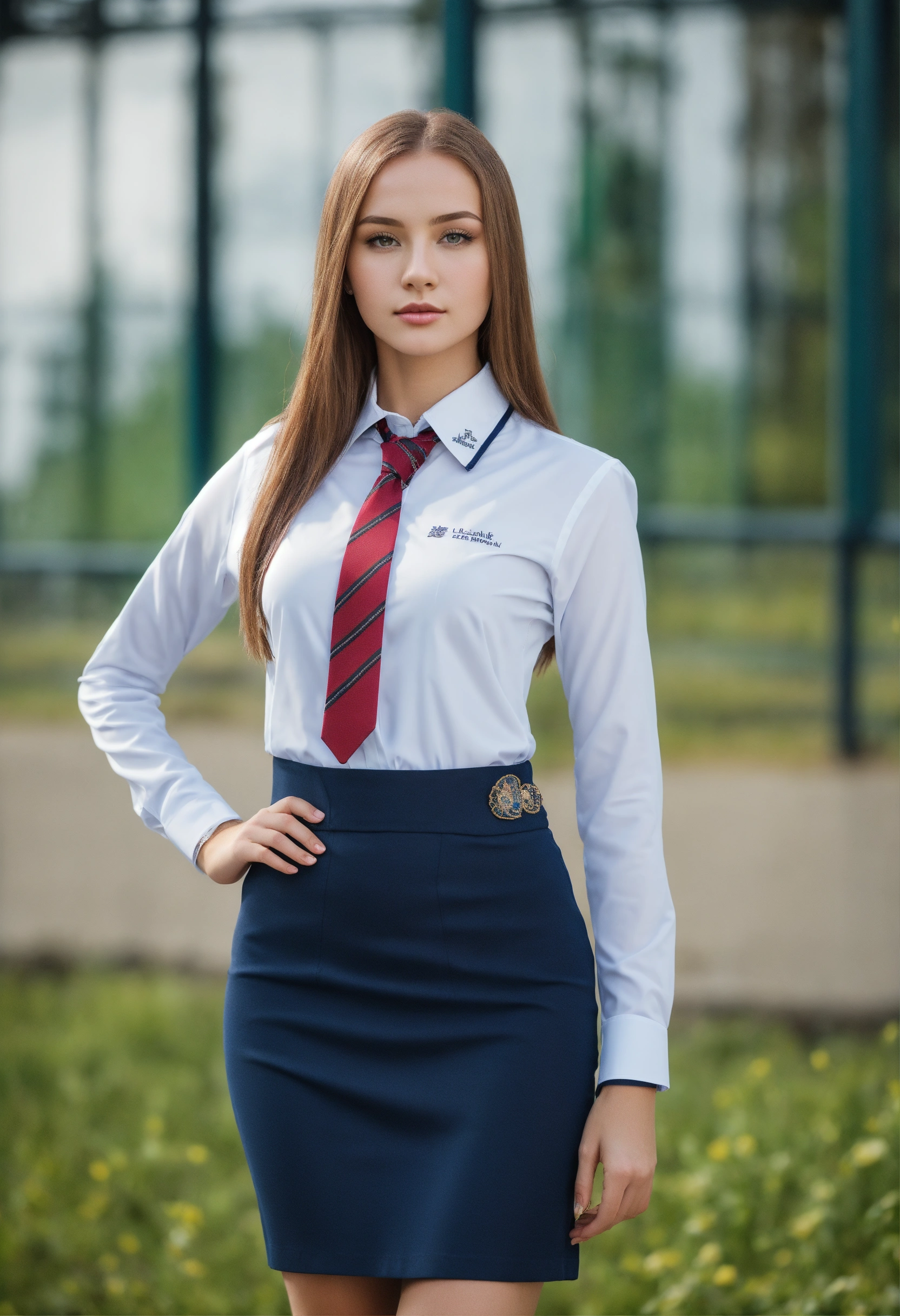 Hot adult woman, slavic attractive schoolgirls in uniform, private school uniform, jacket, tight shirt, skirt, tights, feminine, school scenes, aura of beauty, relaxation, released tie, wide bust, belarussian girl, in belarus, sharp focus, 8k high definition, clothes too small and thin, undersized shirt and prominent body, studio photography, xf iq 4, 1 5 0 mp, 5 0 mm, iso 2 0 0, 1 / 1 6 0 s, realistic, post-processing in capture one, rule of thirds, symmetrical balance, depth layering, polarizing filter, sense of depth, ai enhanced